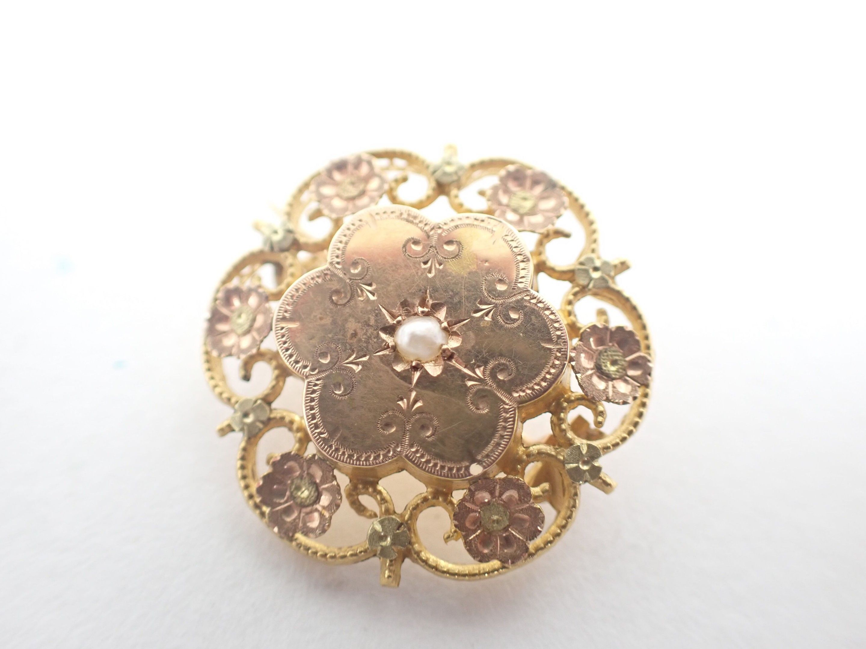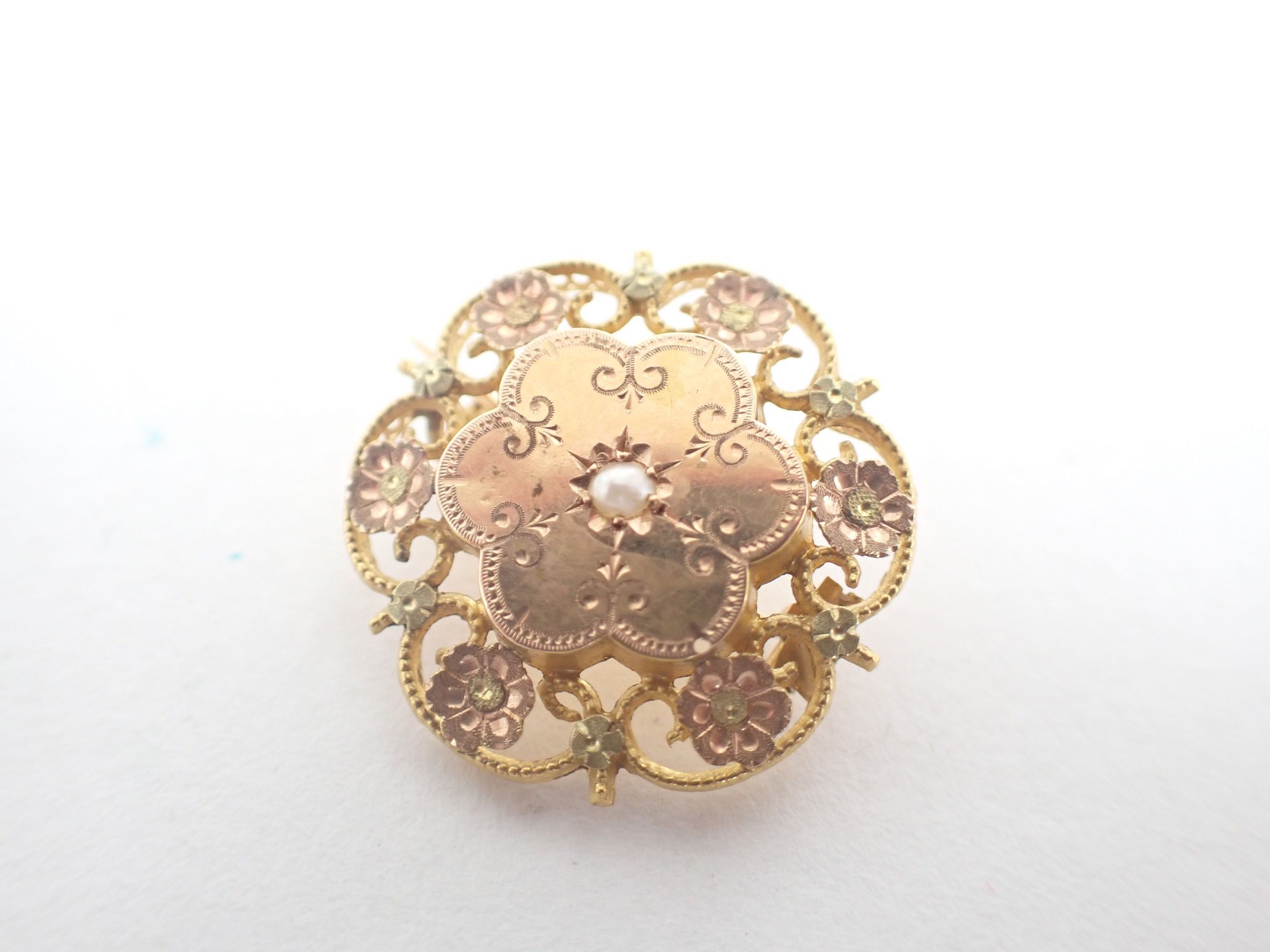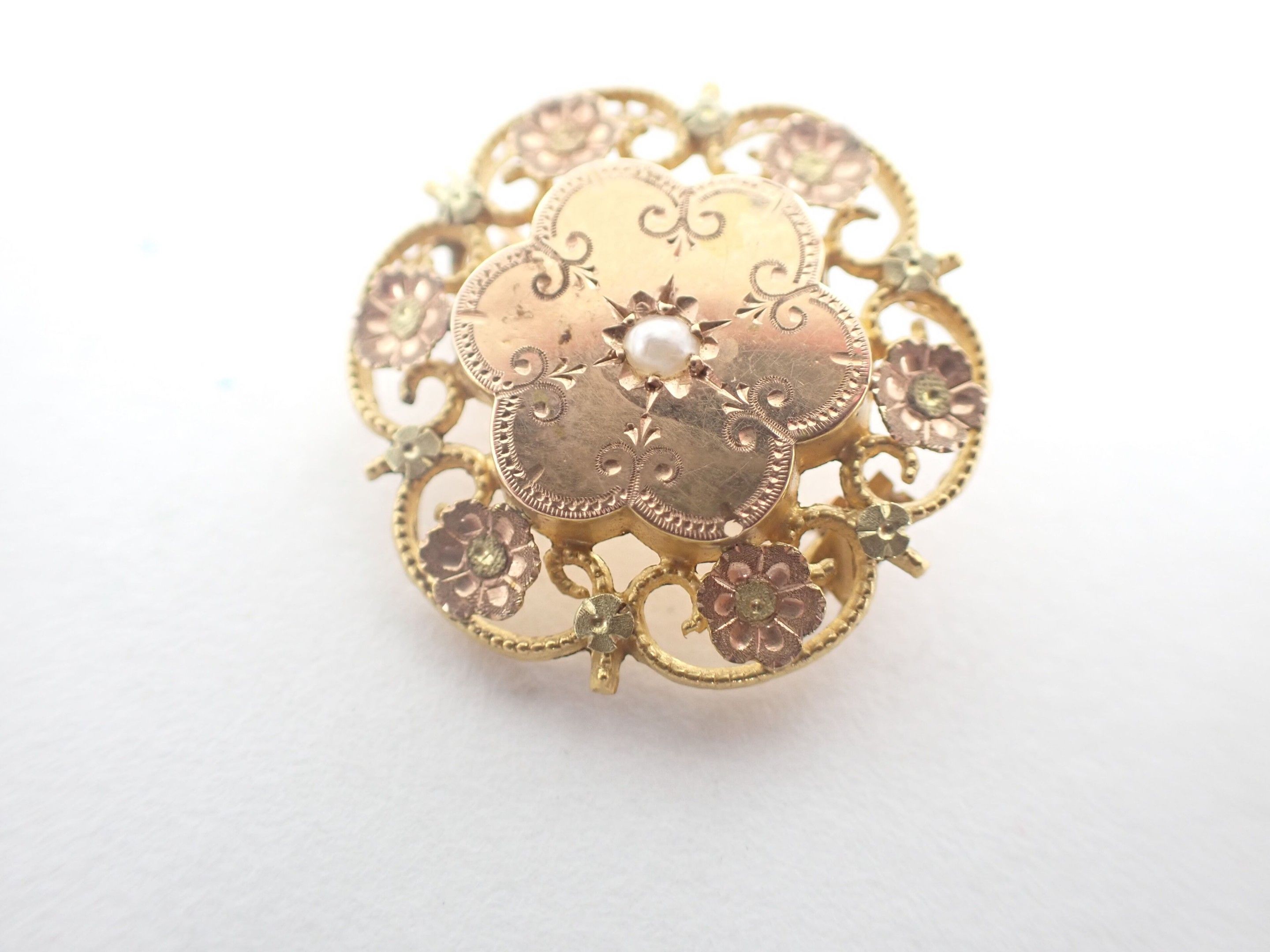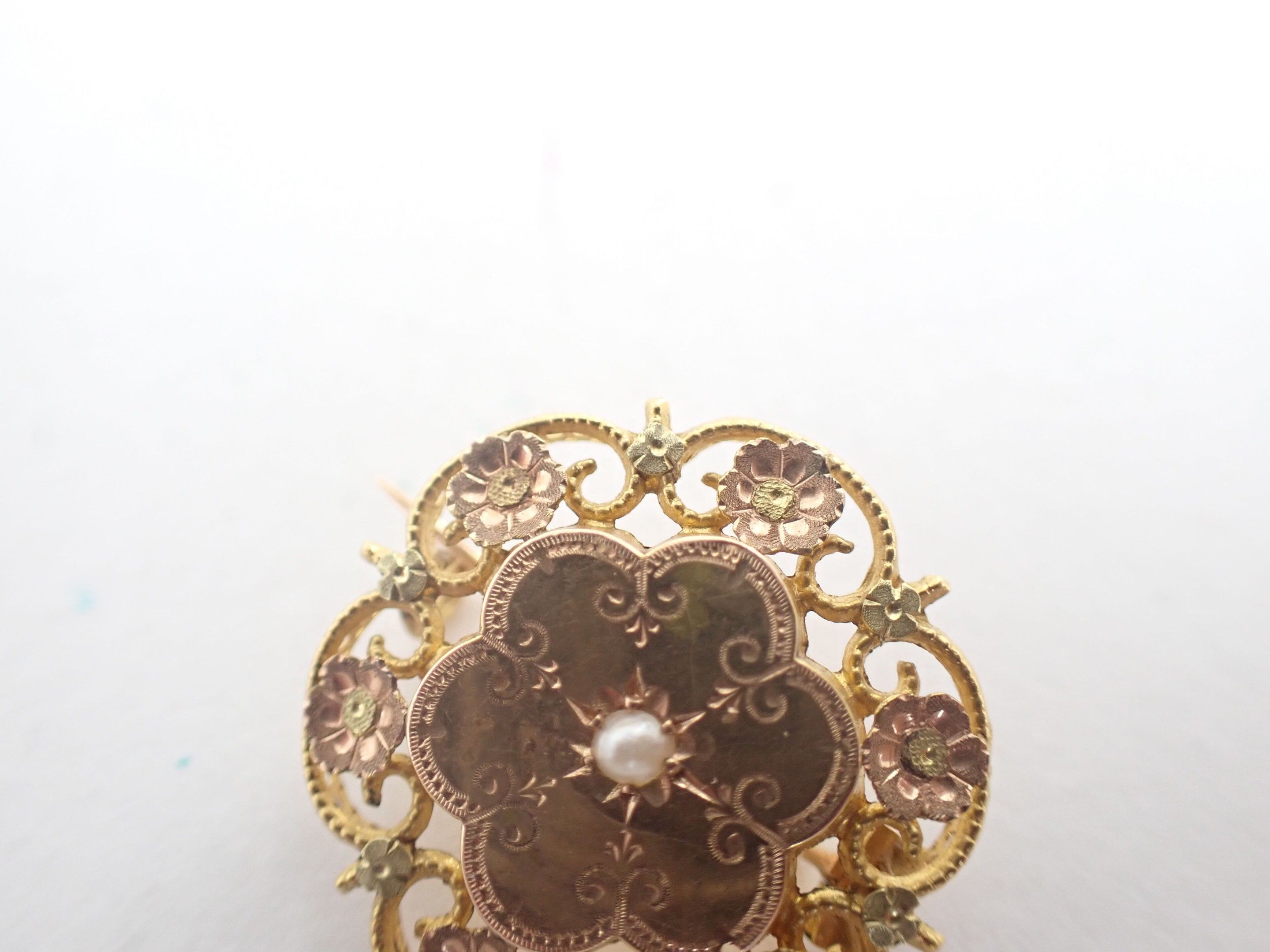 18 carat yellow gold brooch, late 19th century, decorated with an openwork rosette and petal motifs with a central cultured half-pearl.