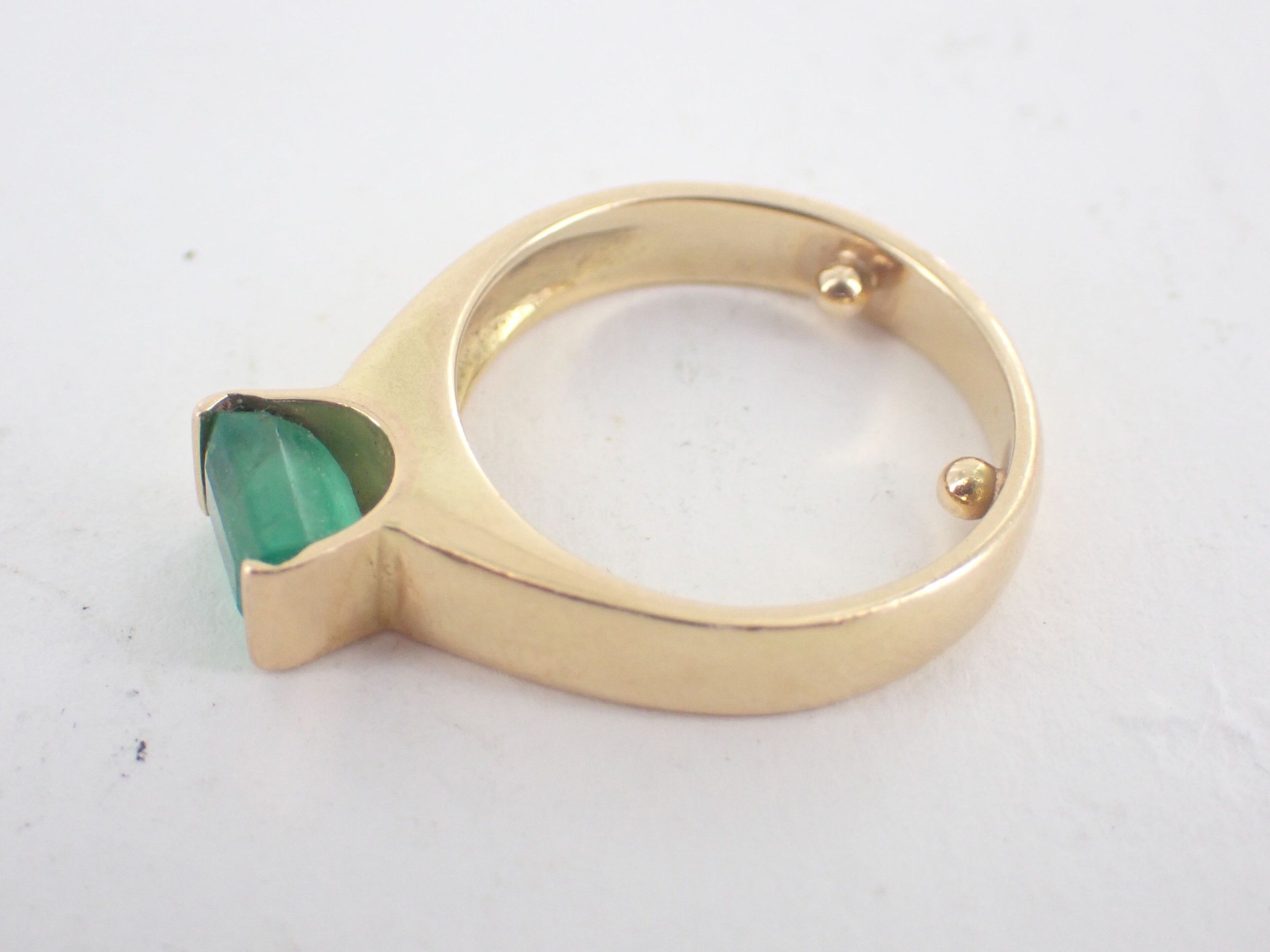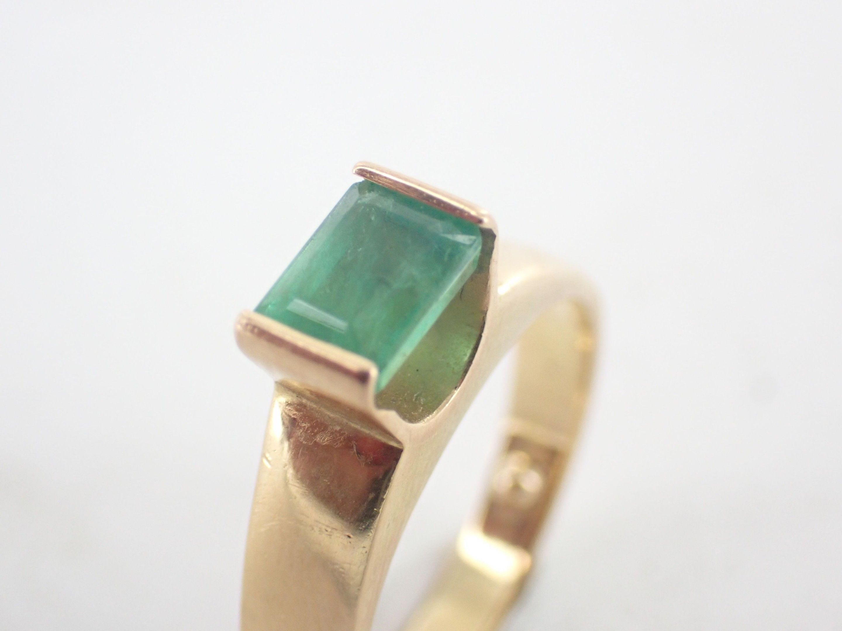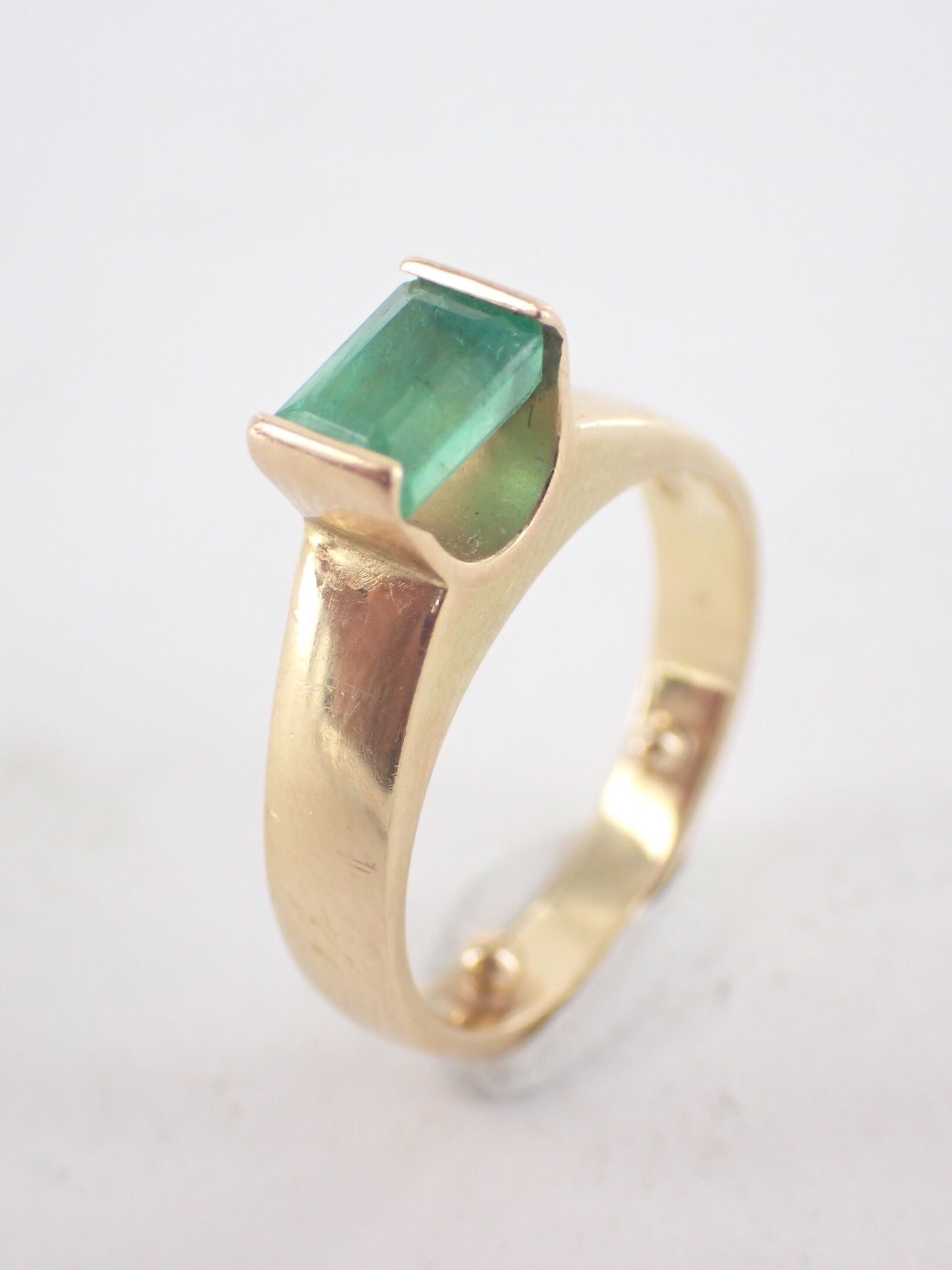 Ring in 750 thousandths yellow gold holding a rectangular-cut emerald