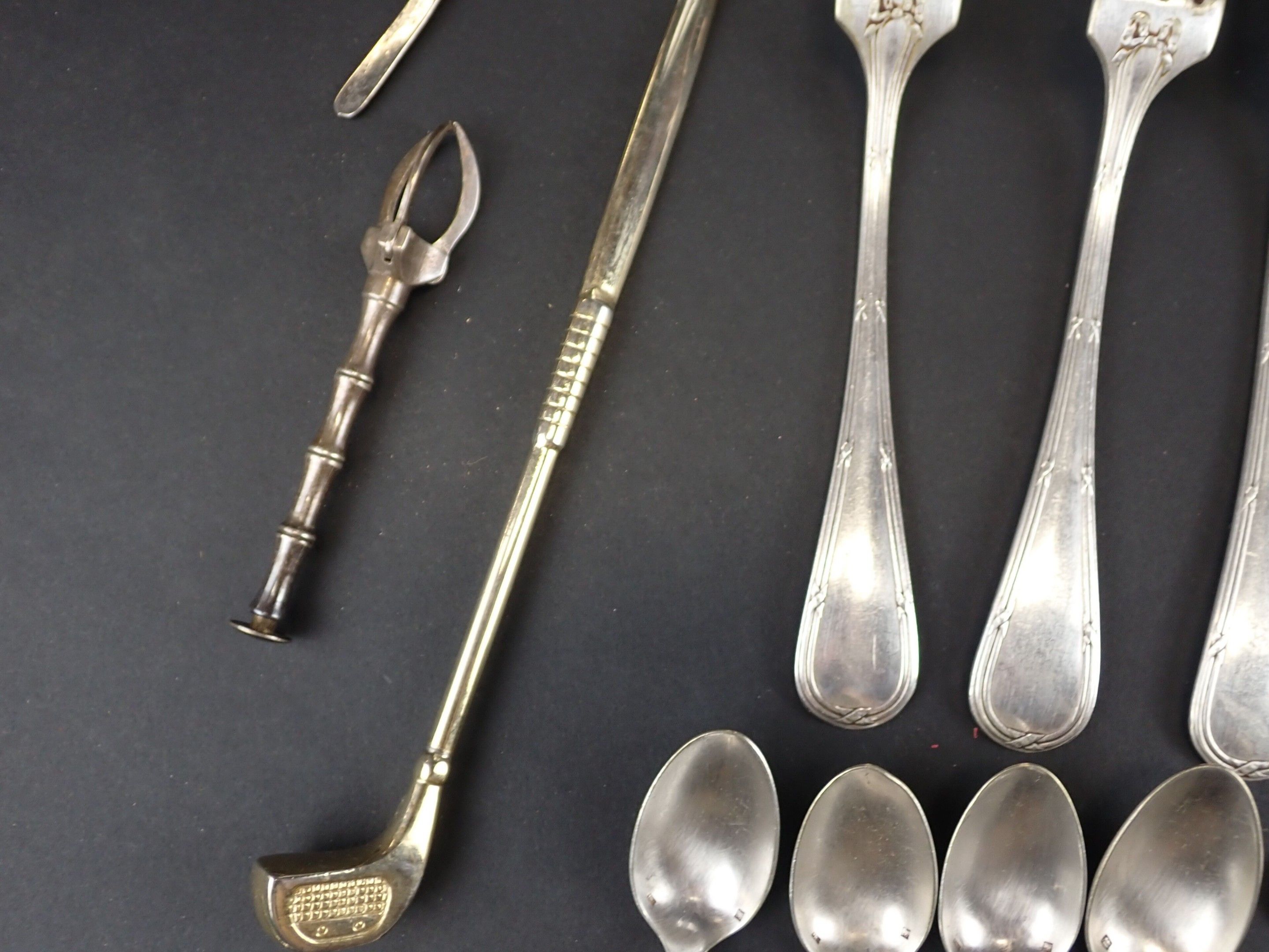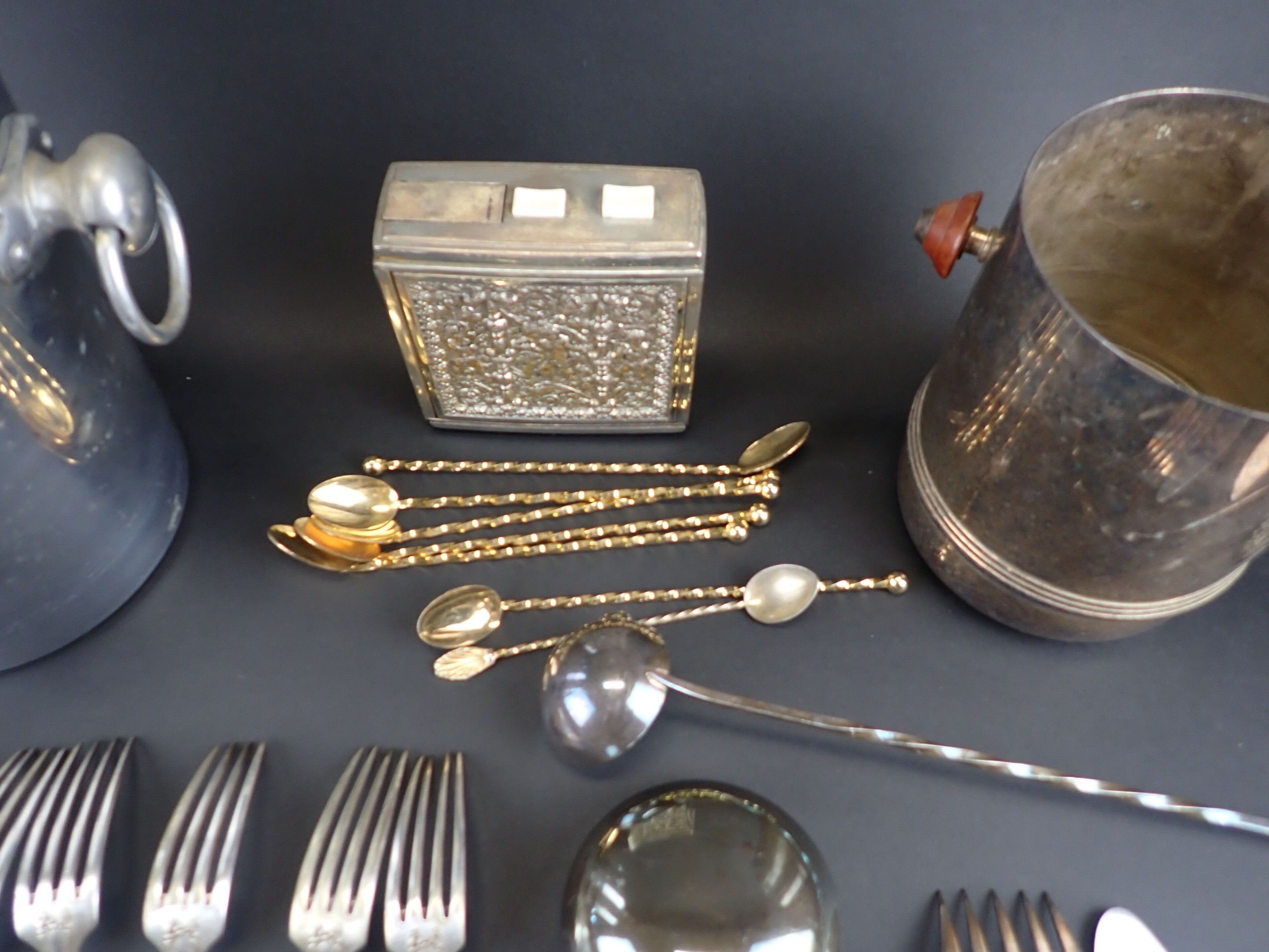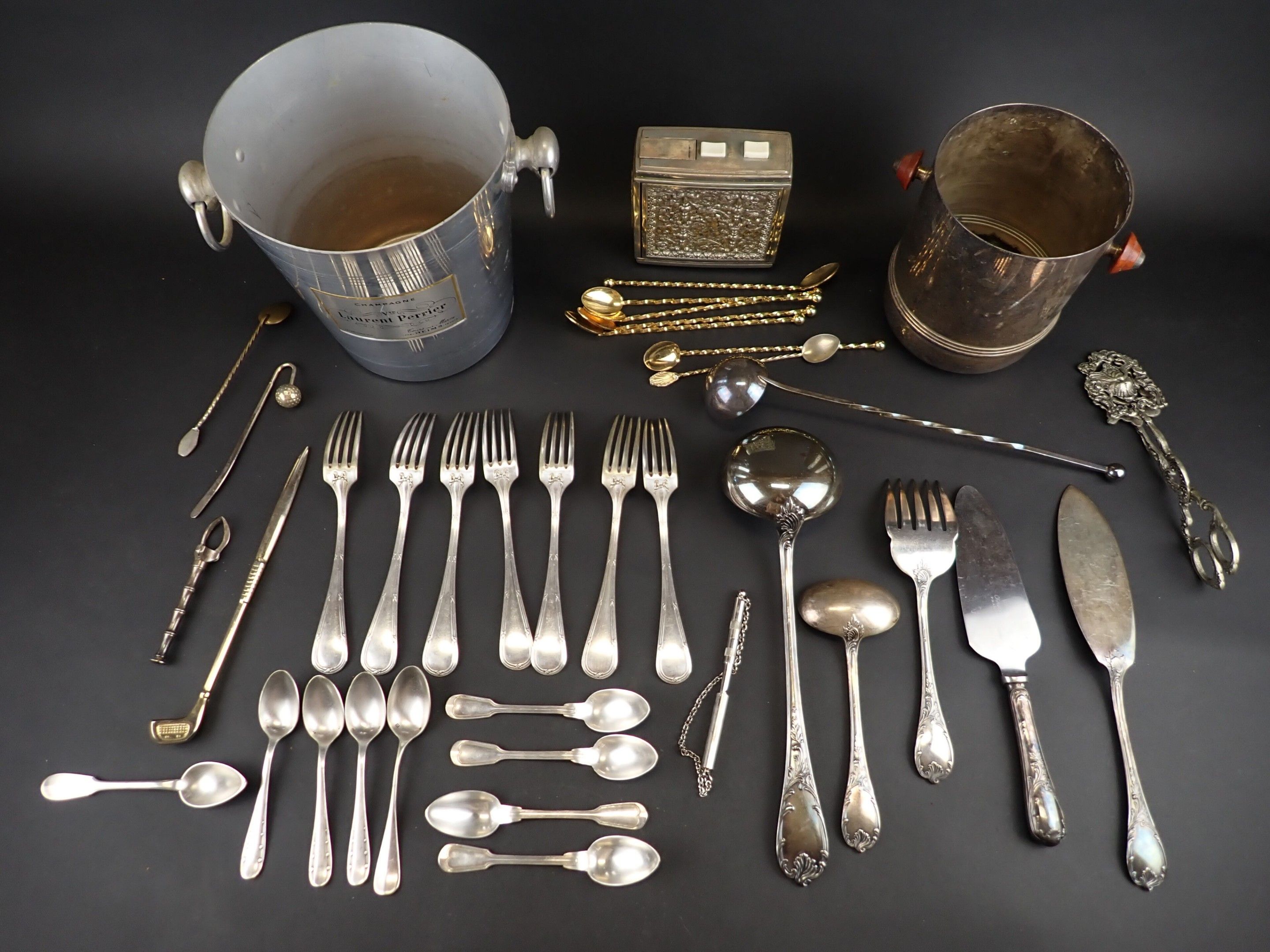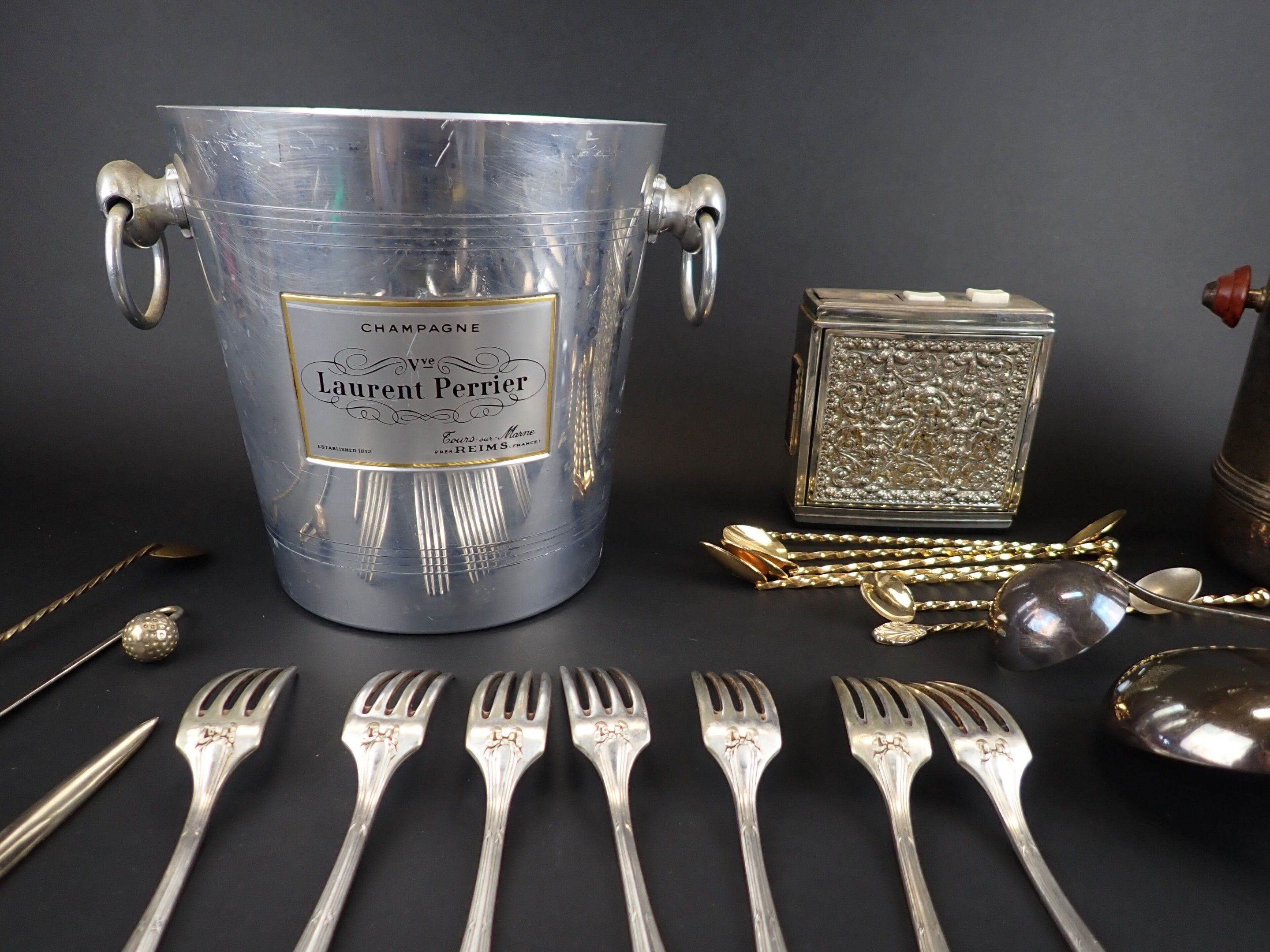 Comprising a Laurent Perrier aluminium champagne bucket, a small champagne bucket circa 1930 with bakelite handles, a stainless steel serving tray, a silver-plated matchbox, and a set of miscellaneous silver-plated flatware. Used condition.