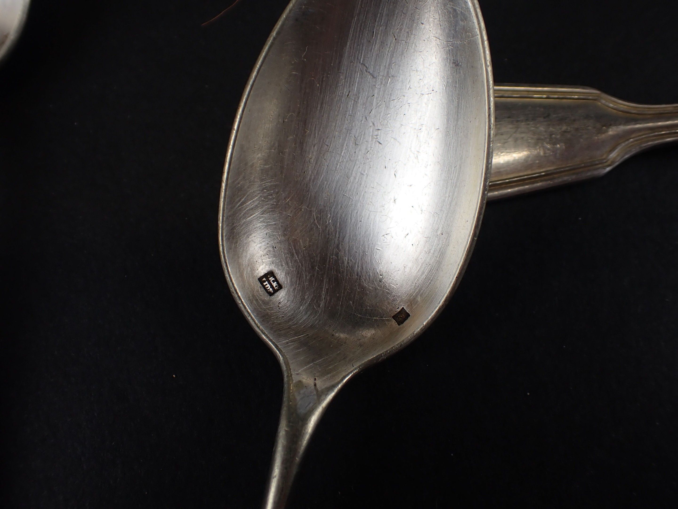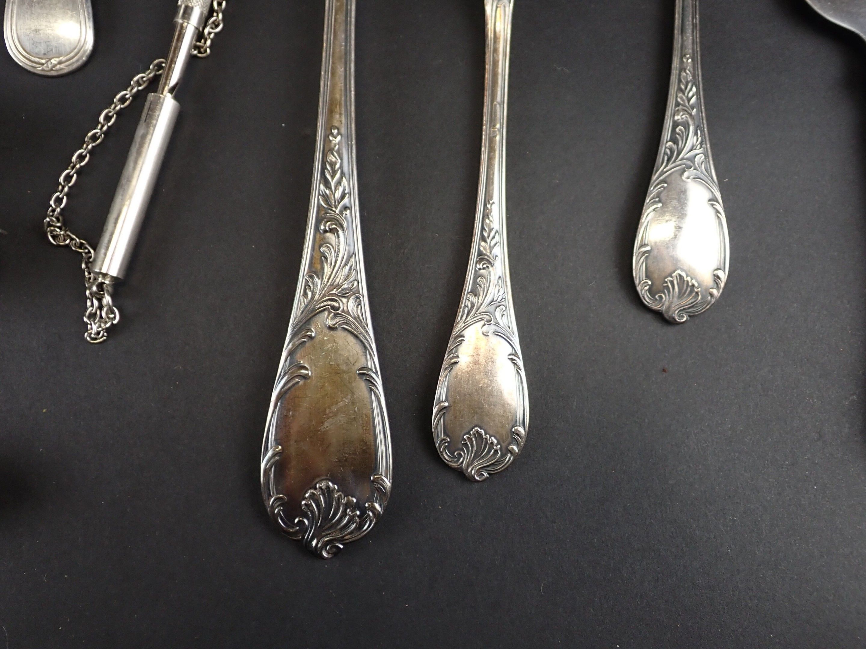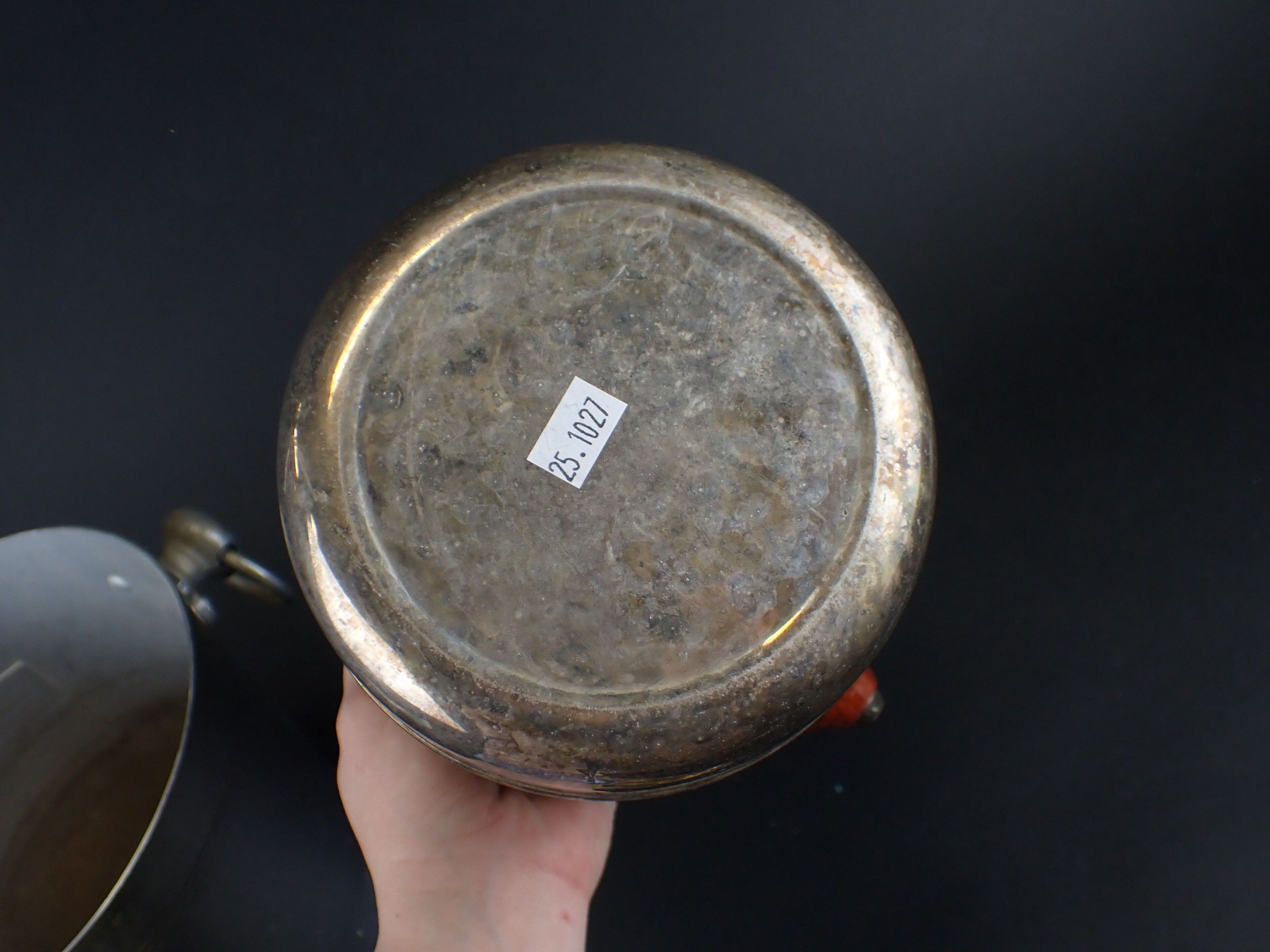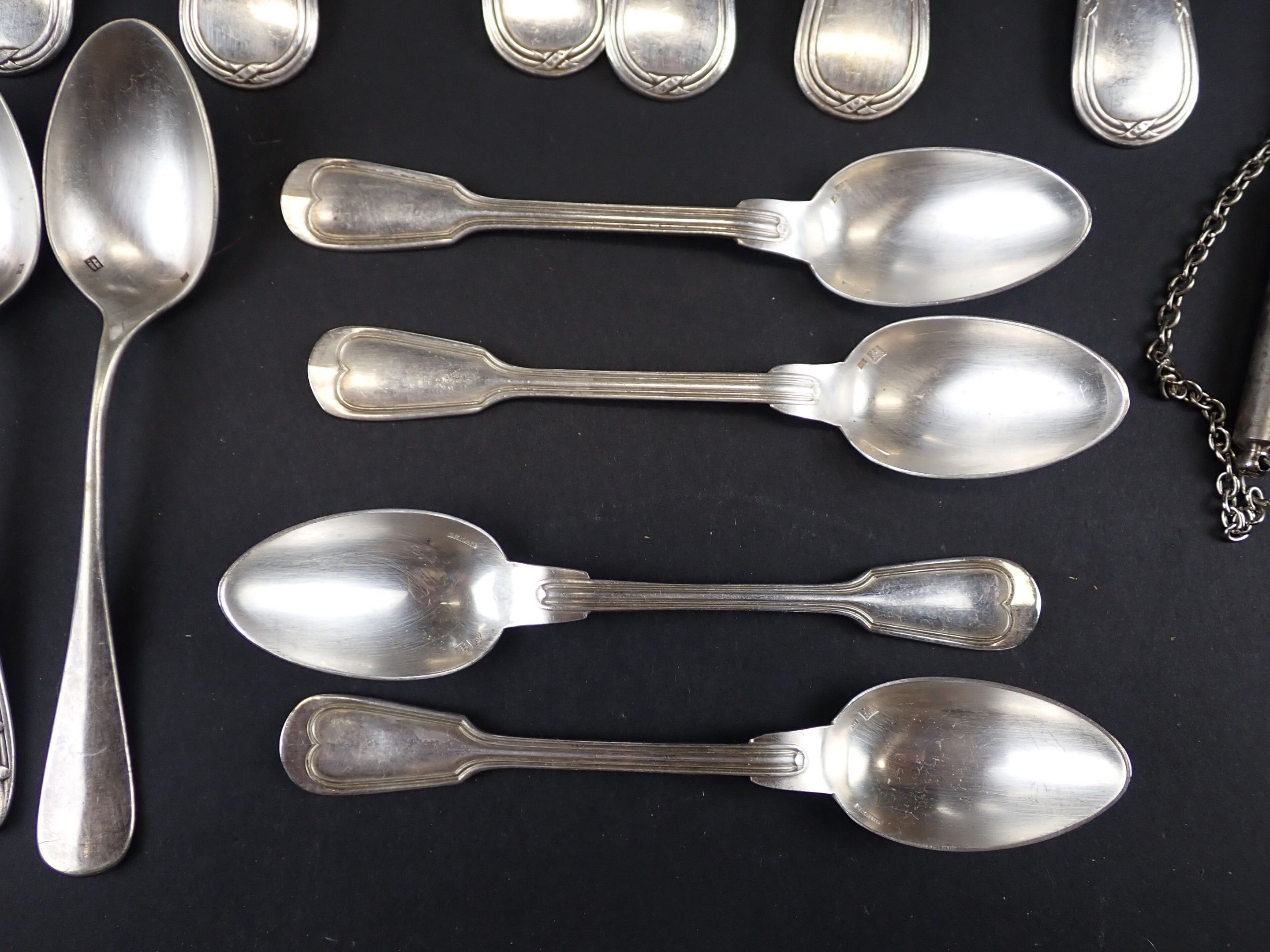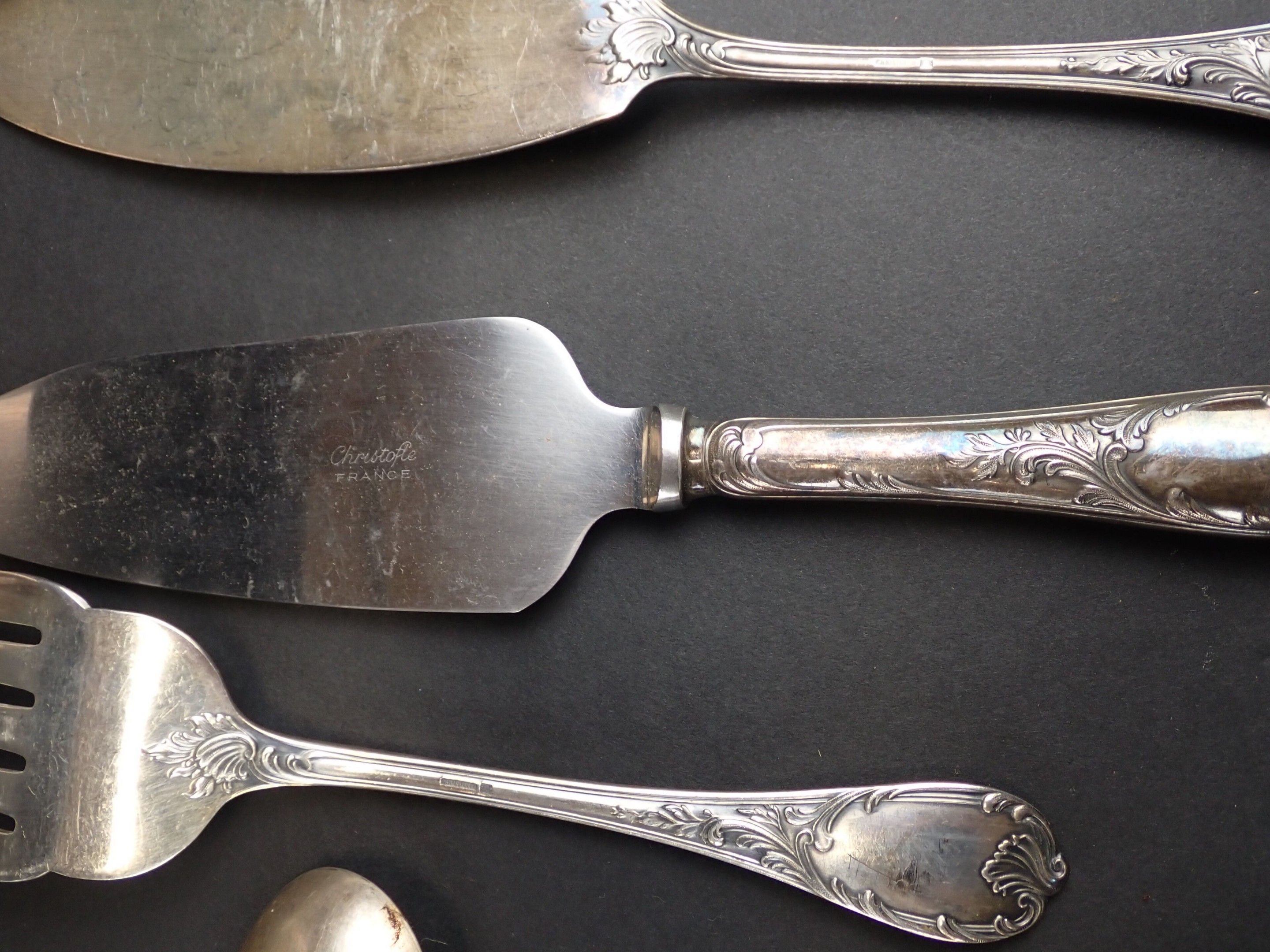 Comprising a Laurent Perrier aluminium champagne bucket, a small champagne bucket circa 1930 with bakelite handles, a stainless steel serving tray, a silver-plated matchbox, and a set of miscellaneous silver-plated flatware. Used condition.