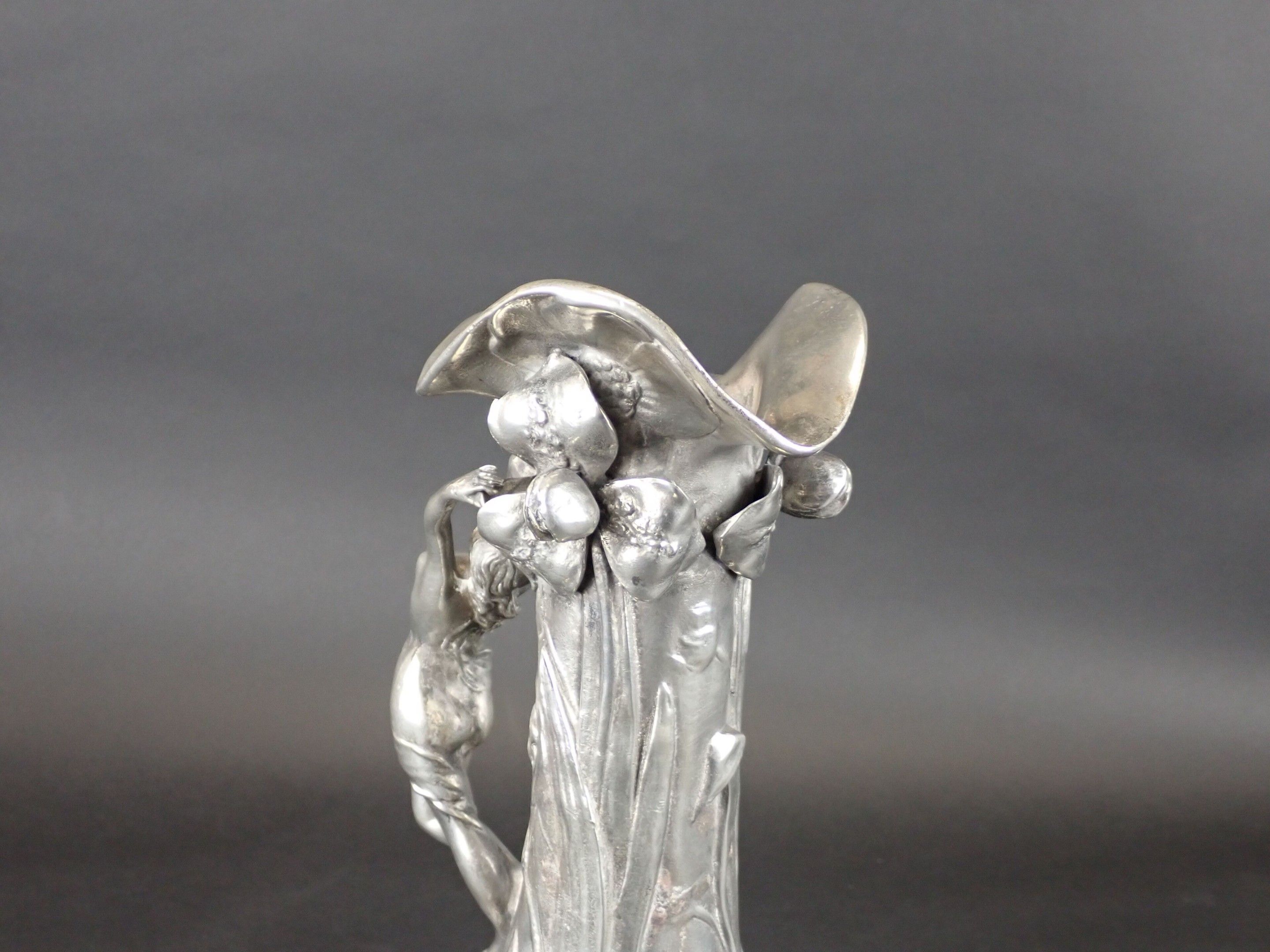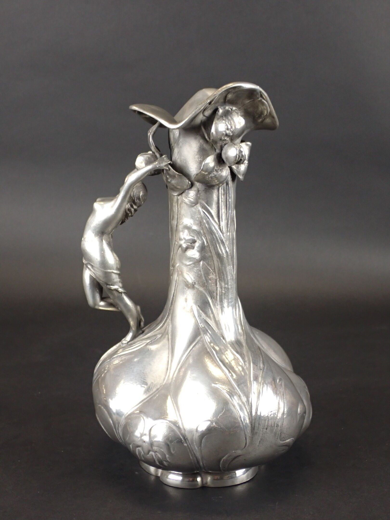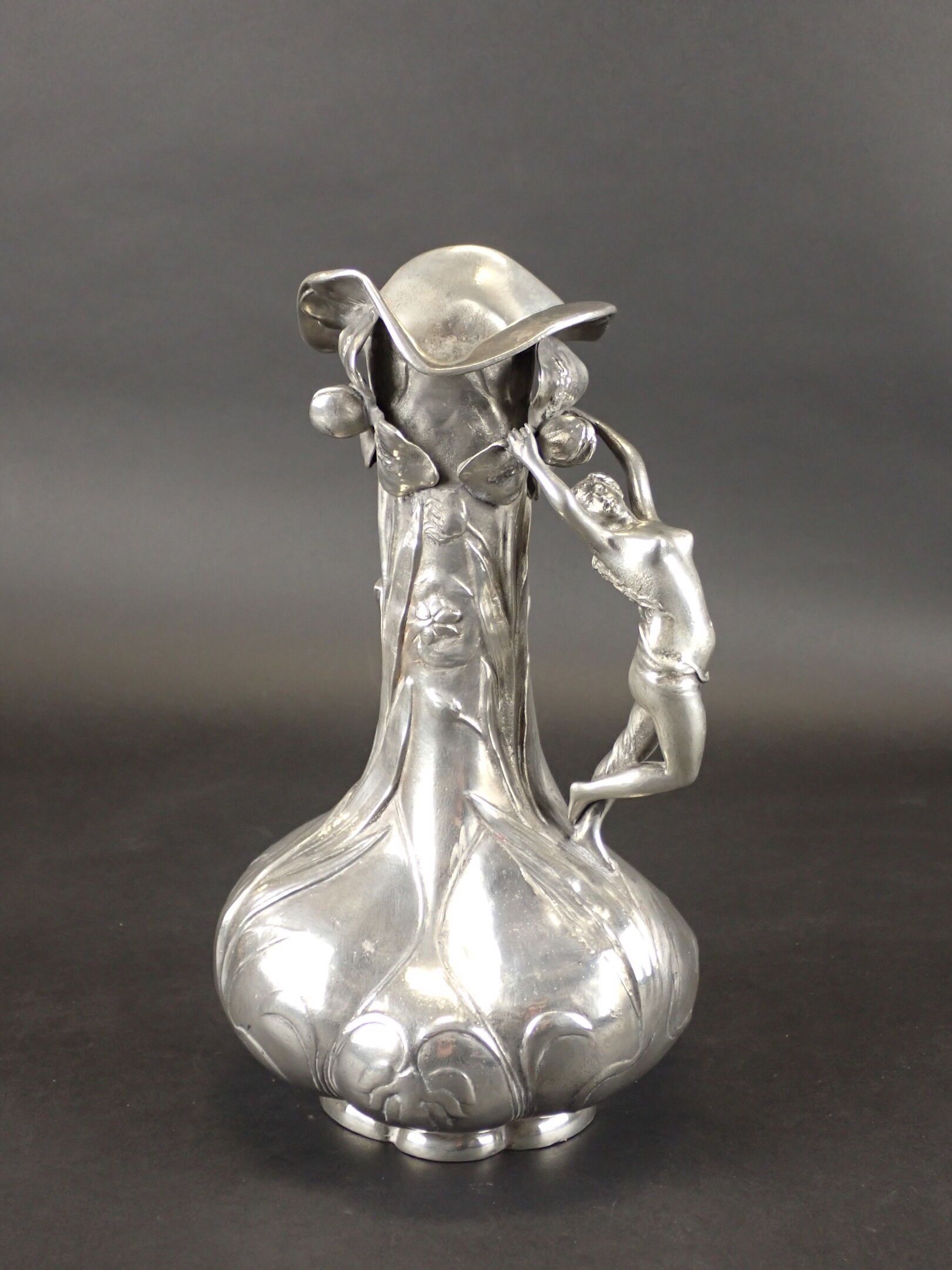 JEAN-MAURICE PETIZON (1855-1922) Large polished pewter "Iris" pitcher, decorated with iris flowers sculpted in the round under the neck and the stems in bas-relief on the poly-lobed body, handle modelled in the shape of a naked young woman. Foundry by Petizon. Signed "Petiz" in the decoration and stamped "Etain pur garanti" on the reverse of the base. Height 31.5 cm