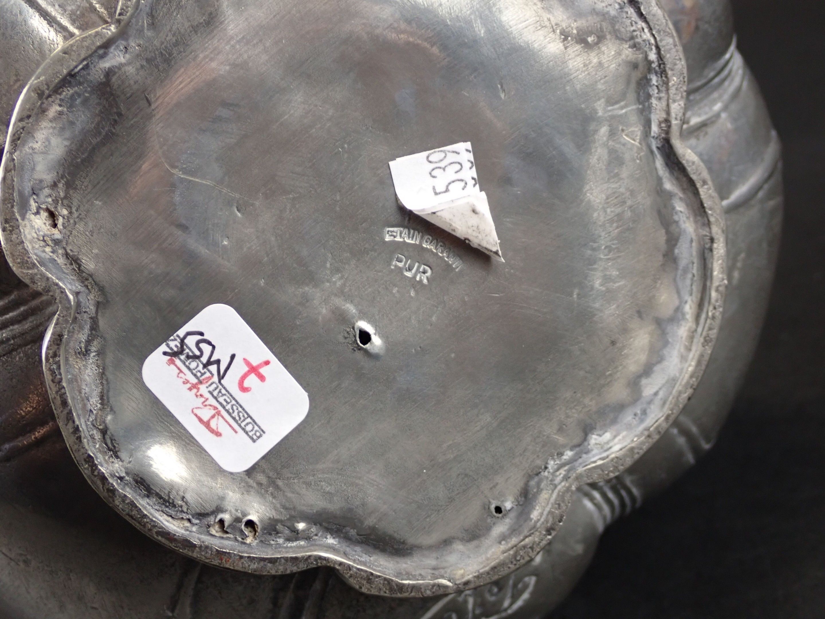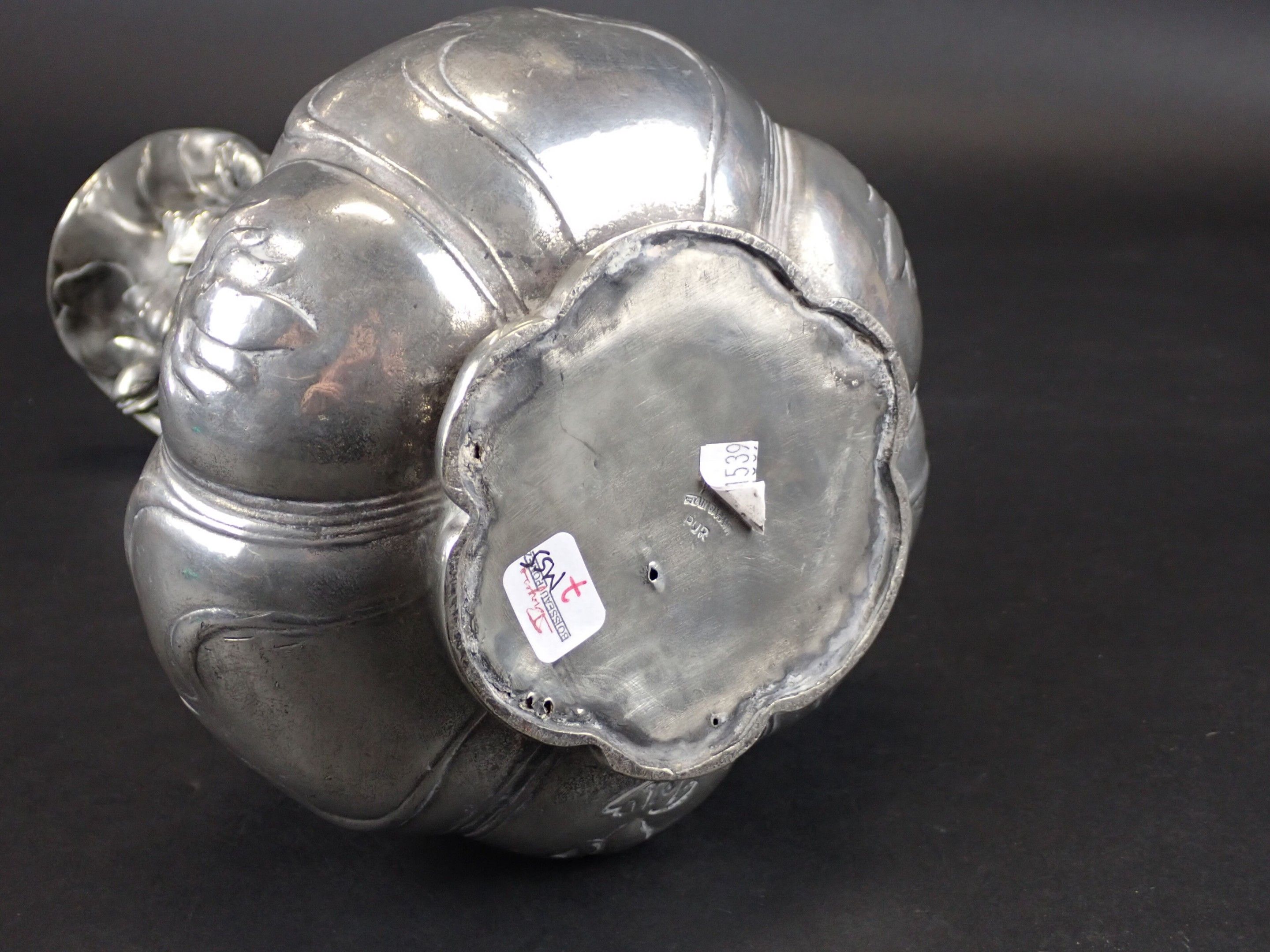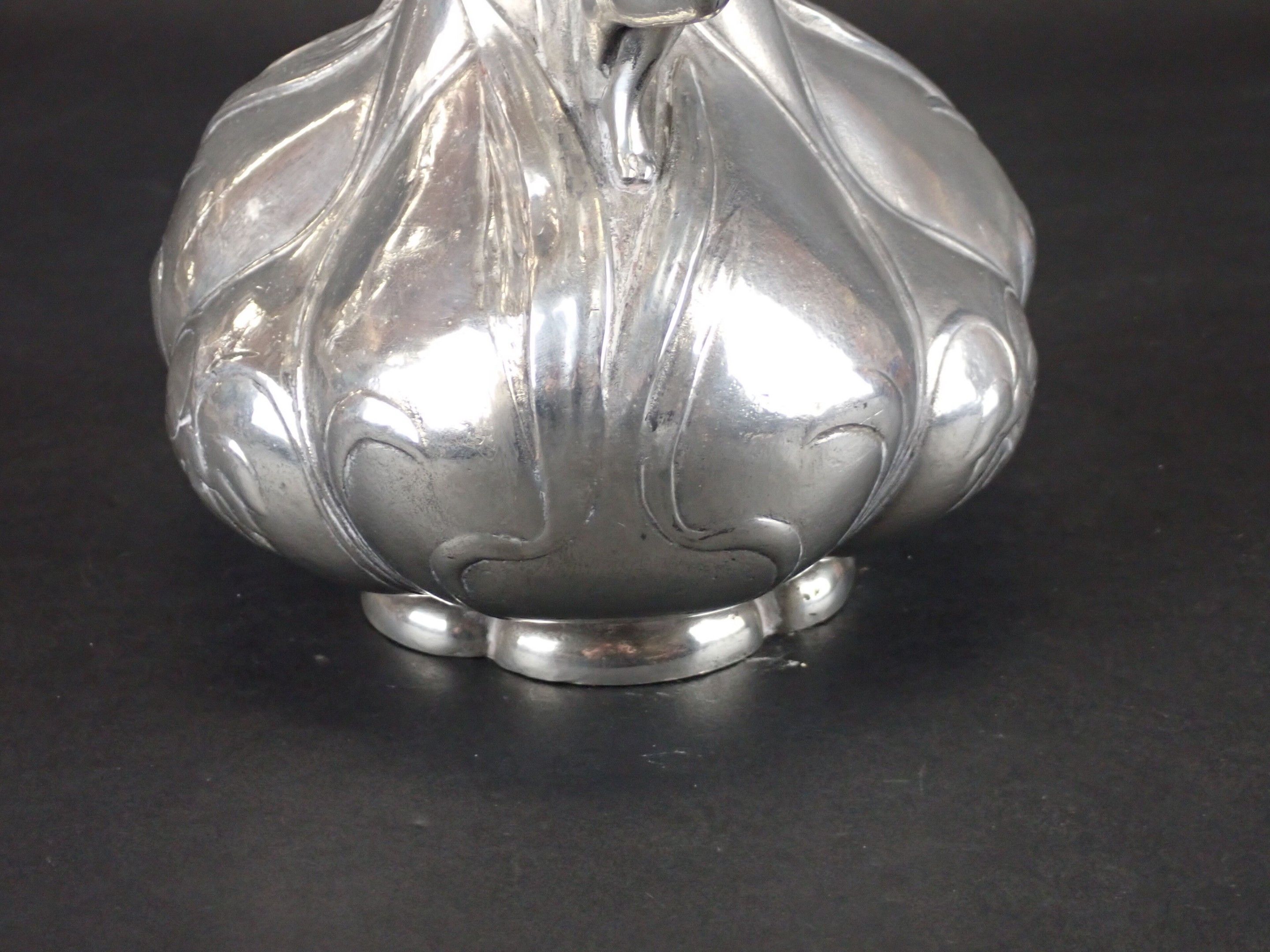 JEAN-MAURICE PETIZON (1855-1922) Large polished pewter "Iris" pitcher, decorated with iris flowers sculpted in the round under the neck and the stems in bas-relief on the poly-lobed body, handle modelled in the shape of a naked young woman. Foundry by Petizon. Signed "Petiz" in the decoration and stamped "Etain pur garanti" on the reverse of the base. Height 31.5 cm