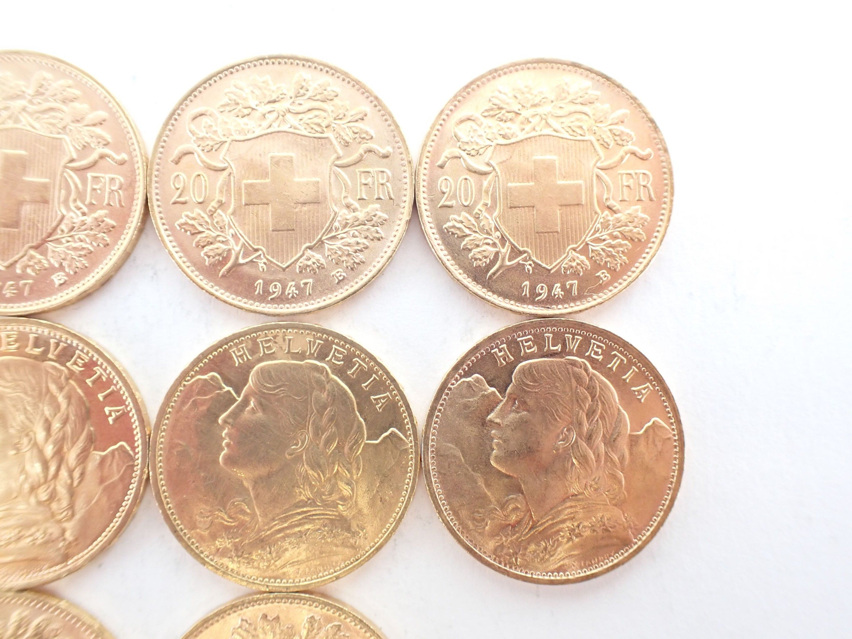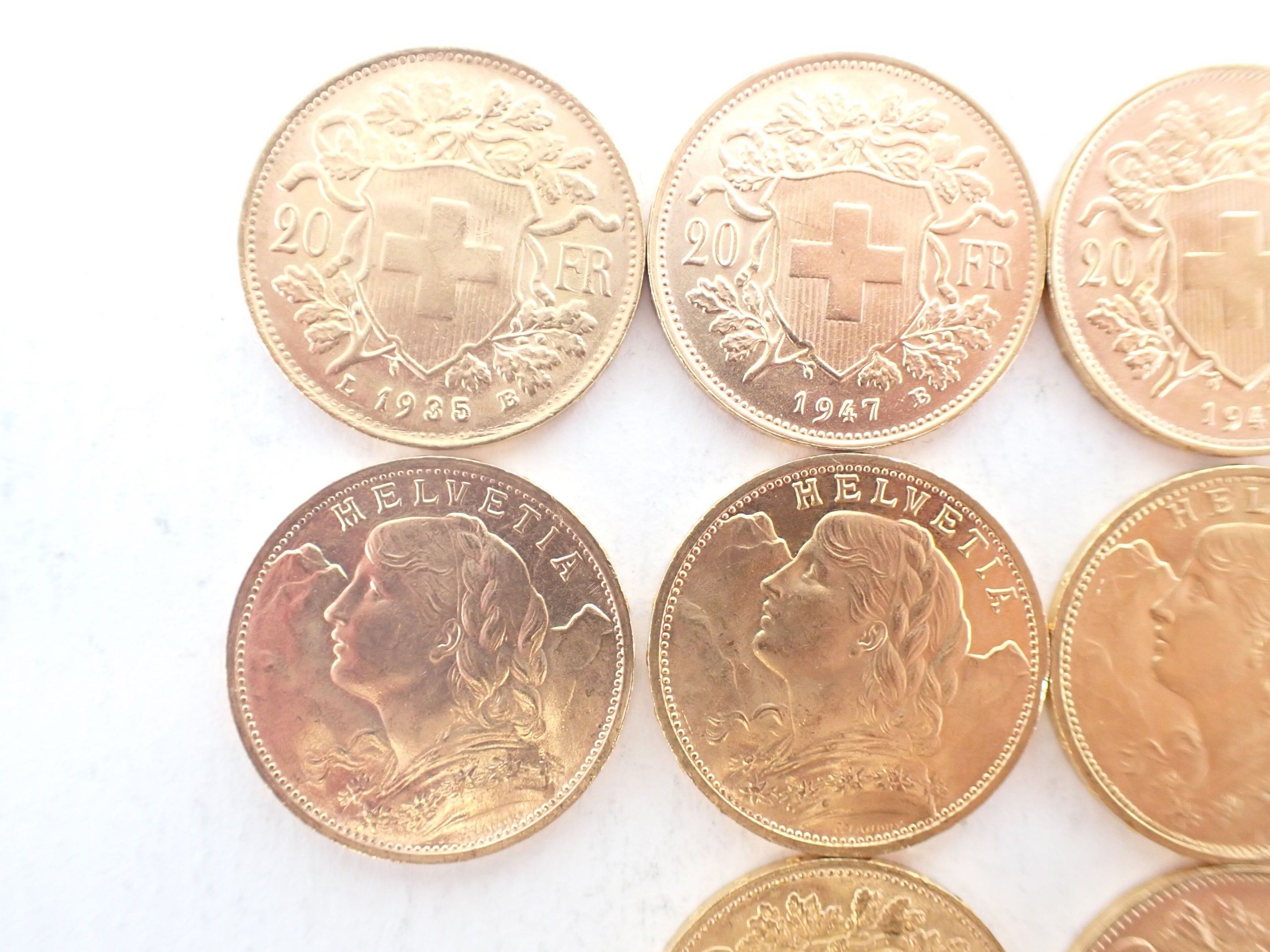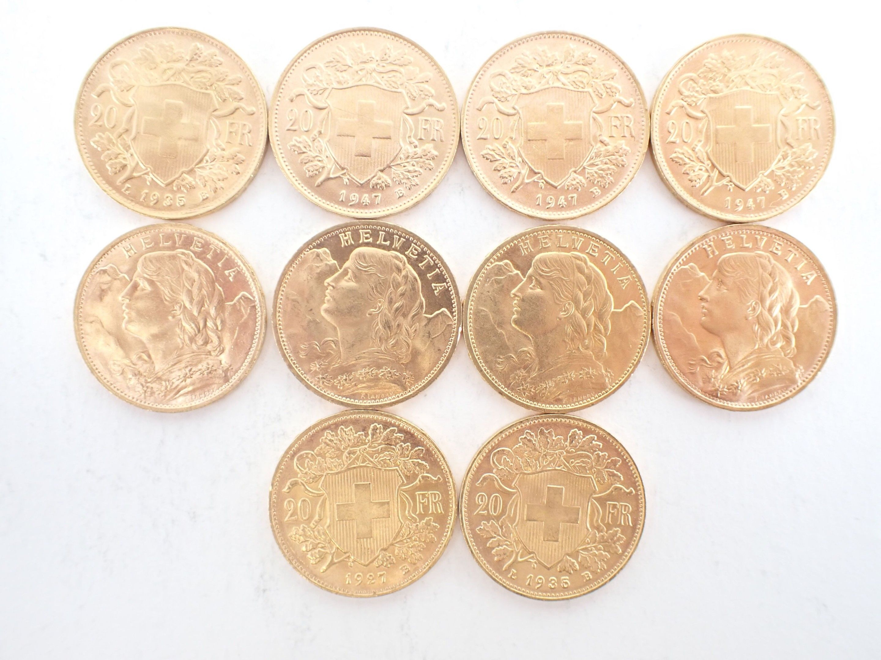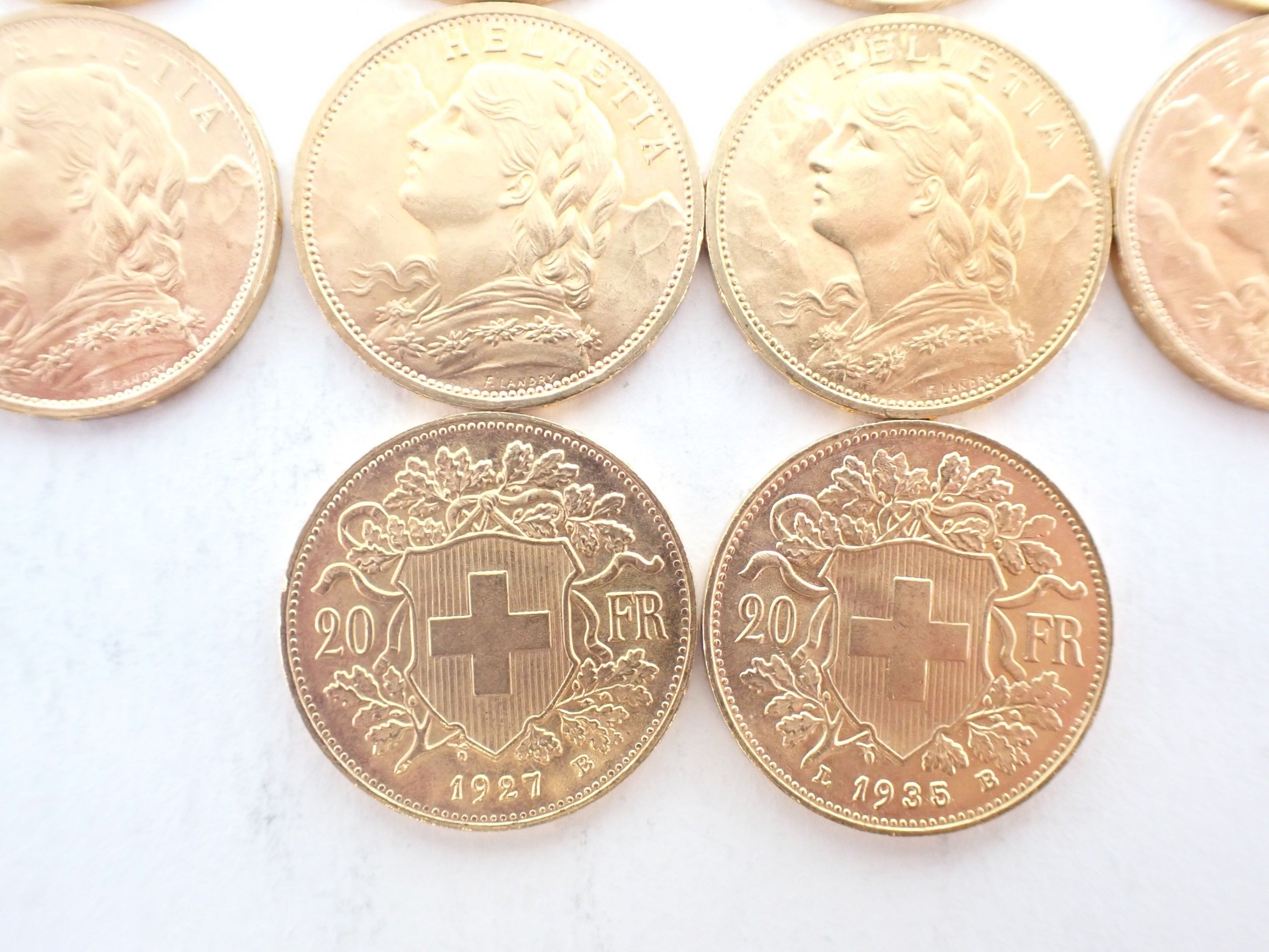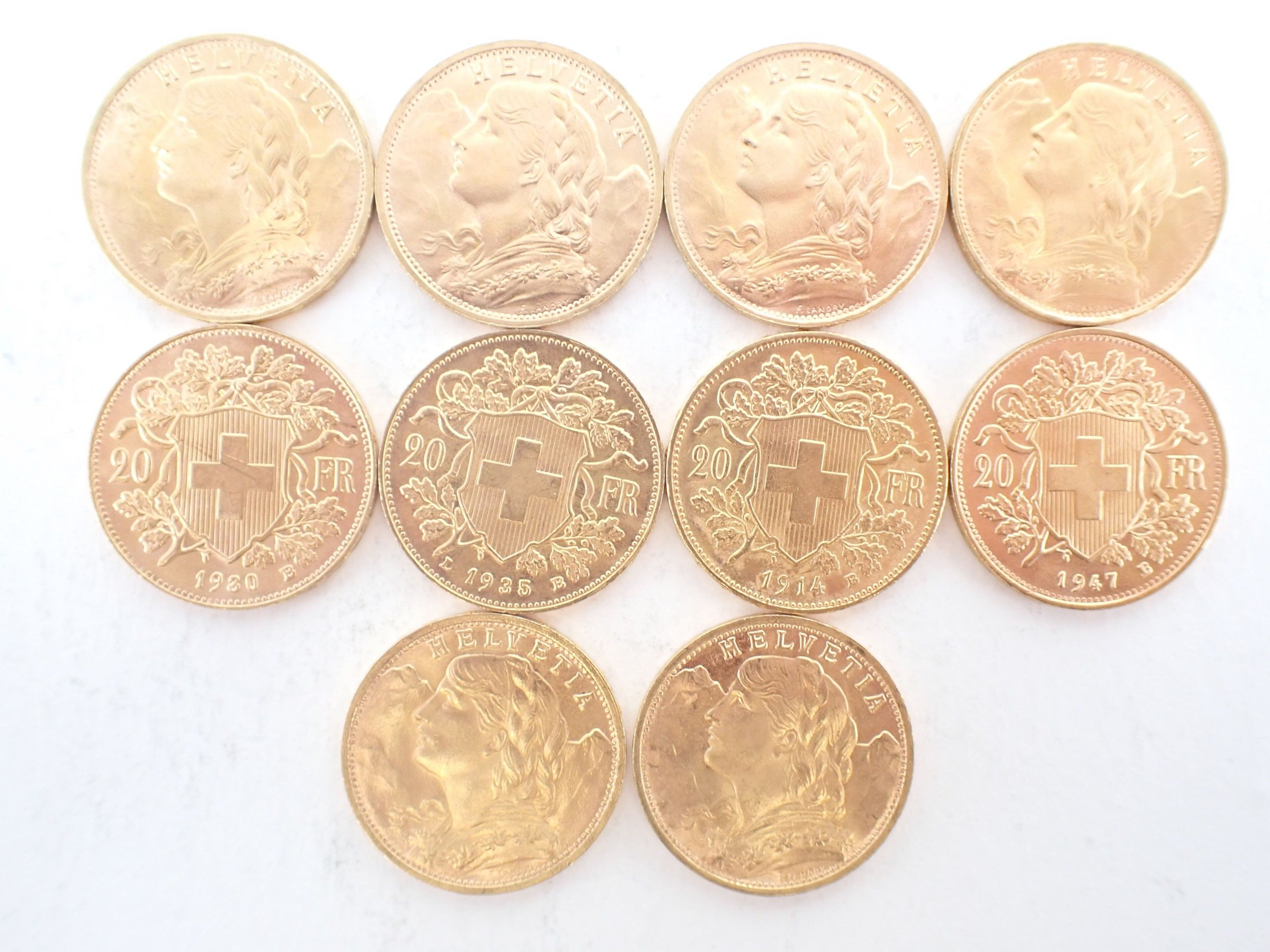 10 Swiss 20 franc gold coins Helvetia - Weight: 64.