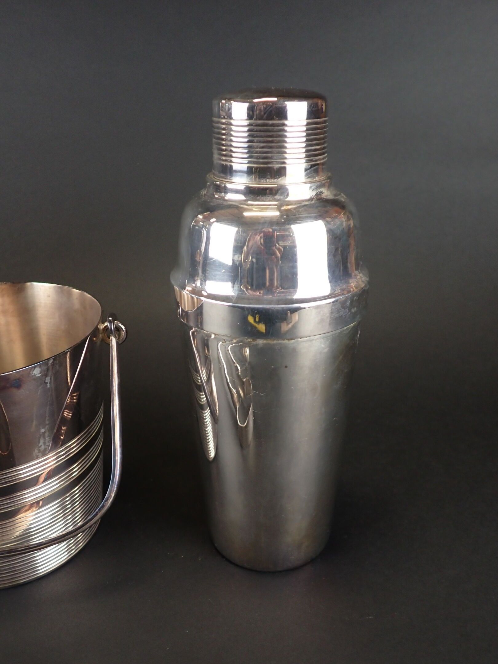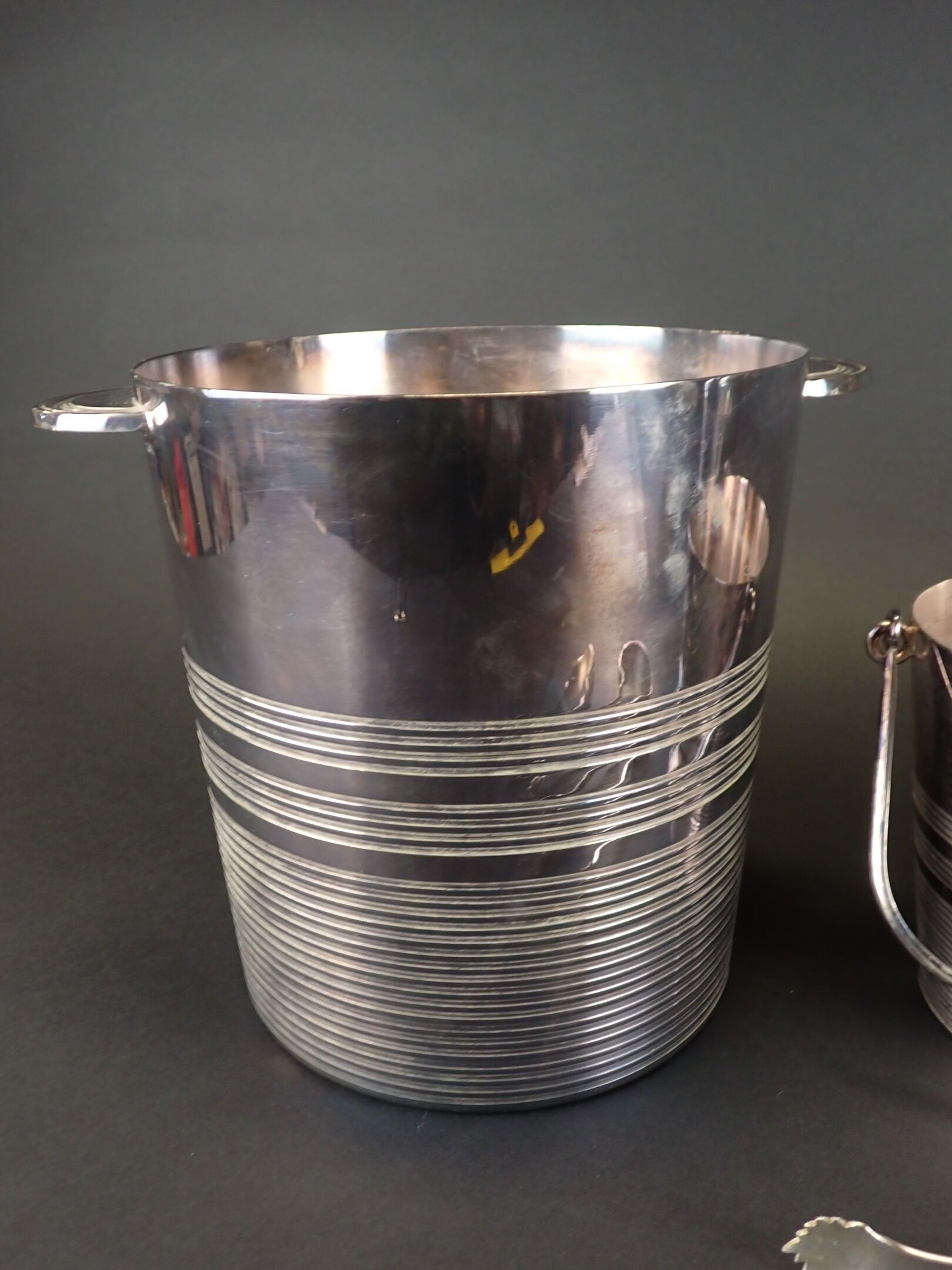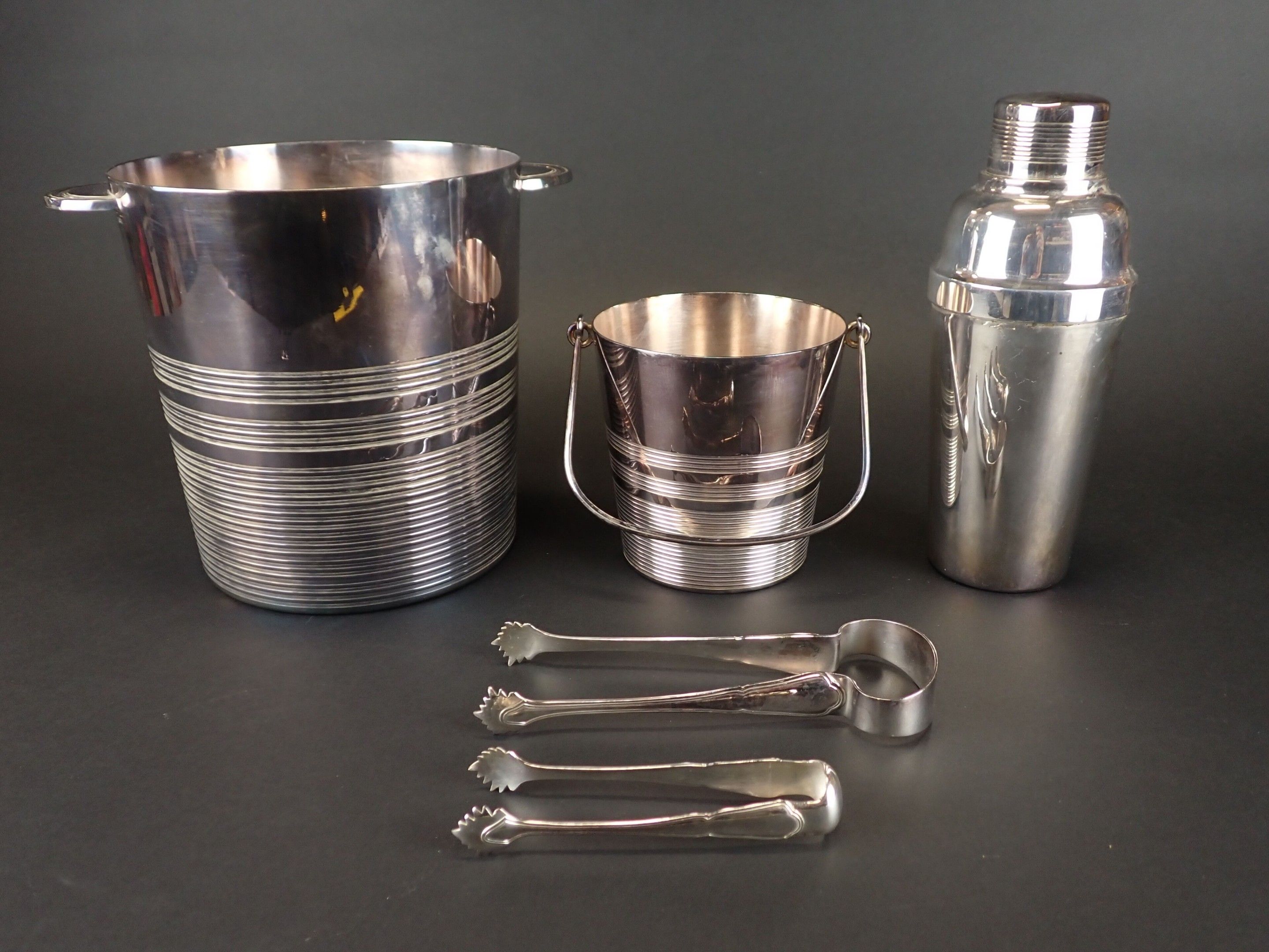 ERCUIS. Two ice and champagne buckets and their ice tongs, and a silver-plated shaker decorated with lines around the rim.