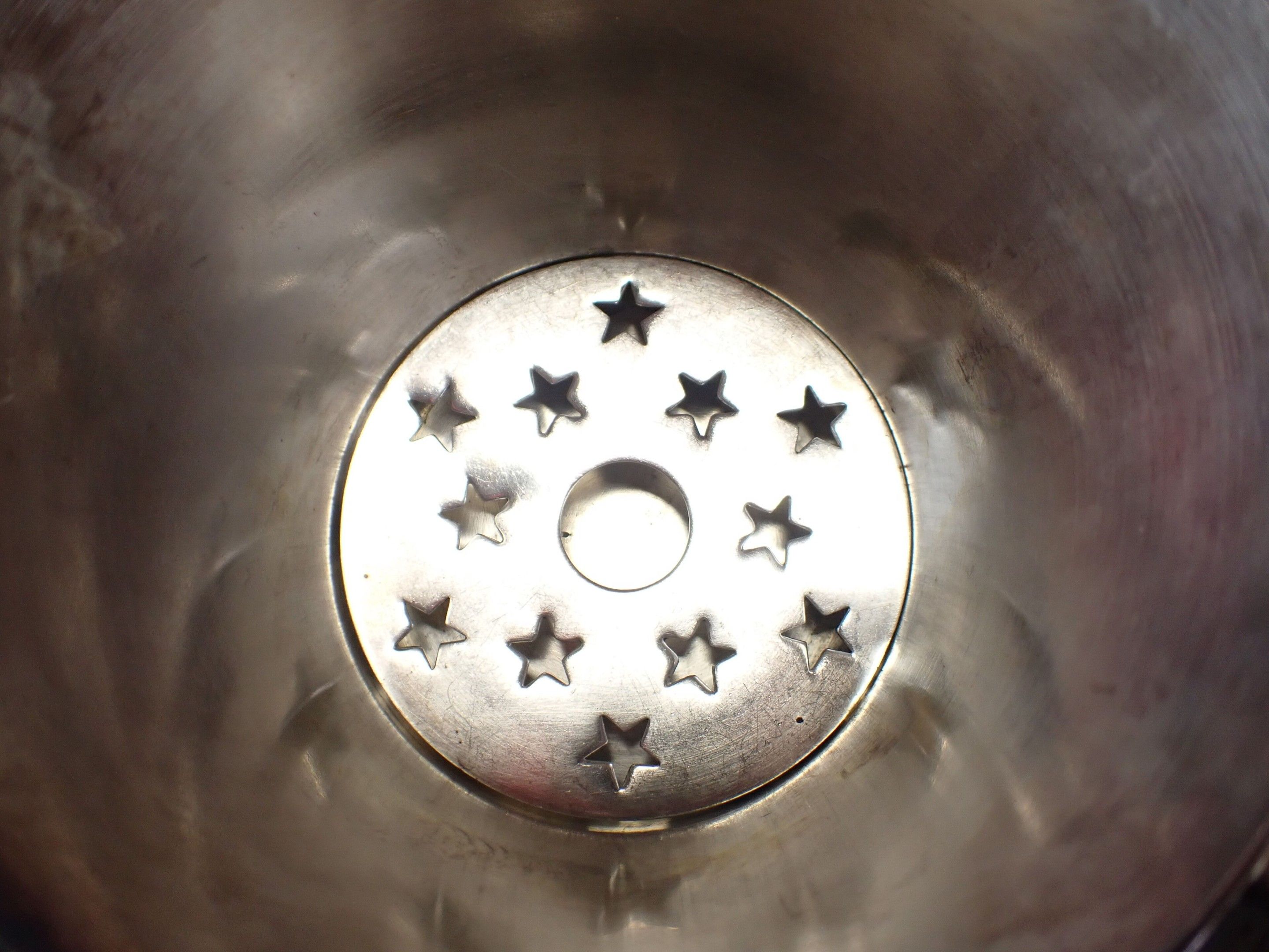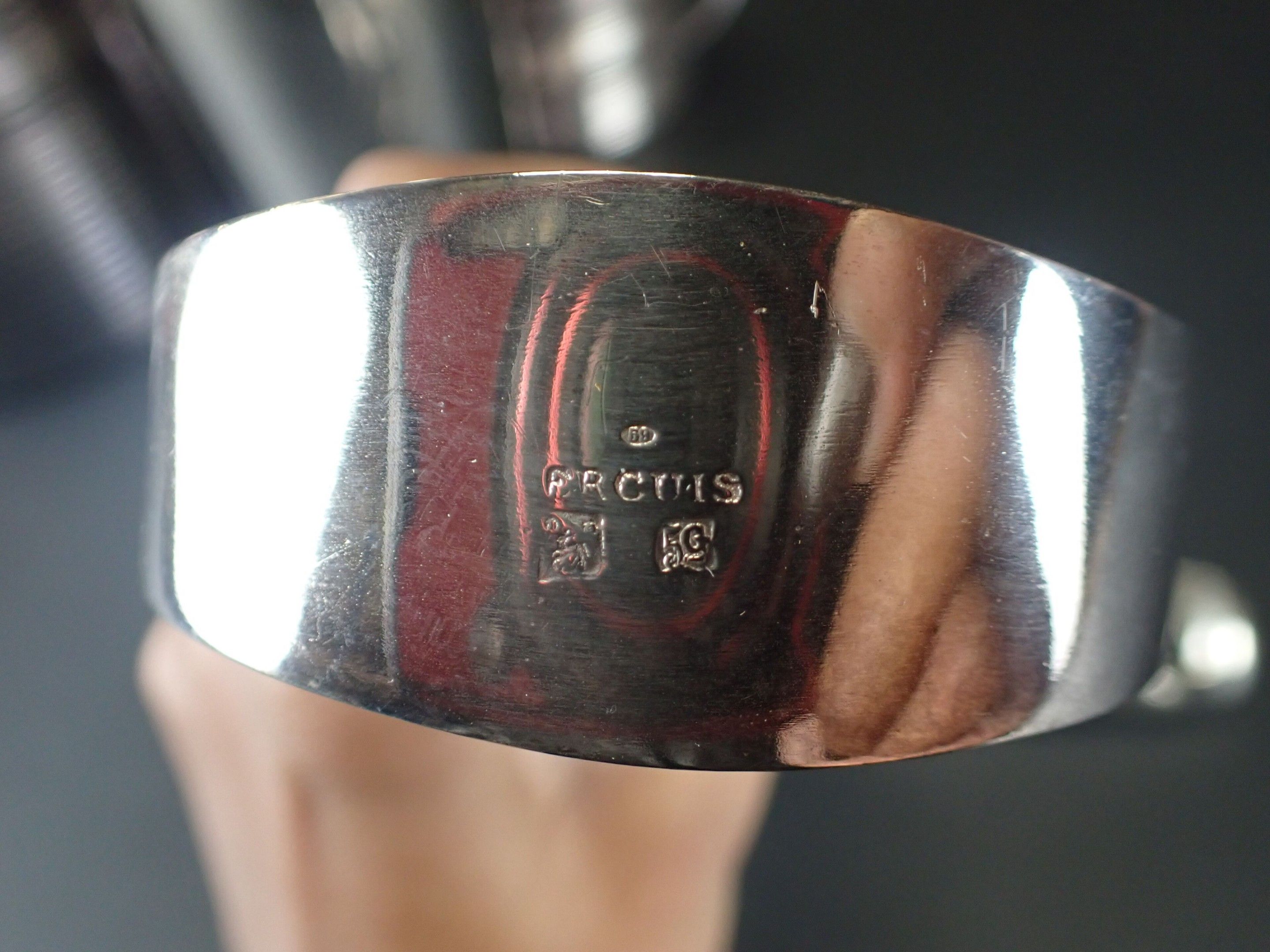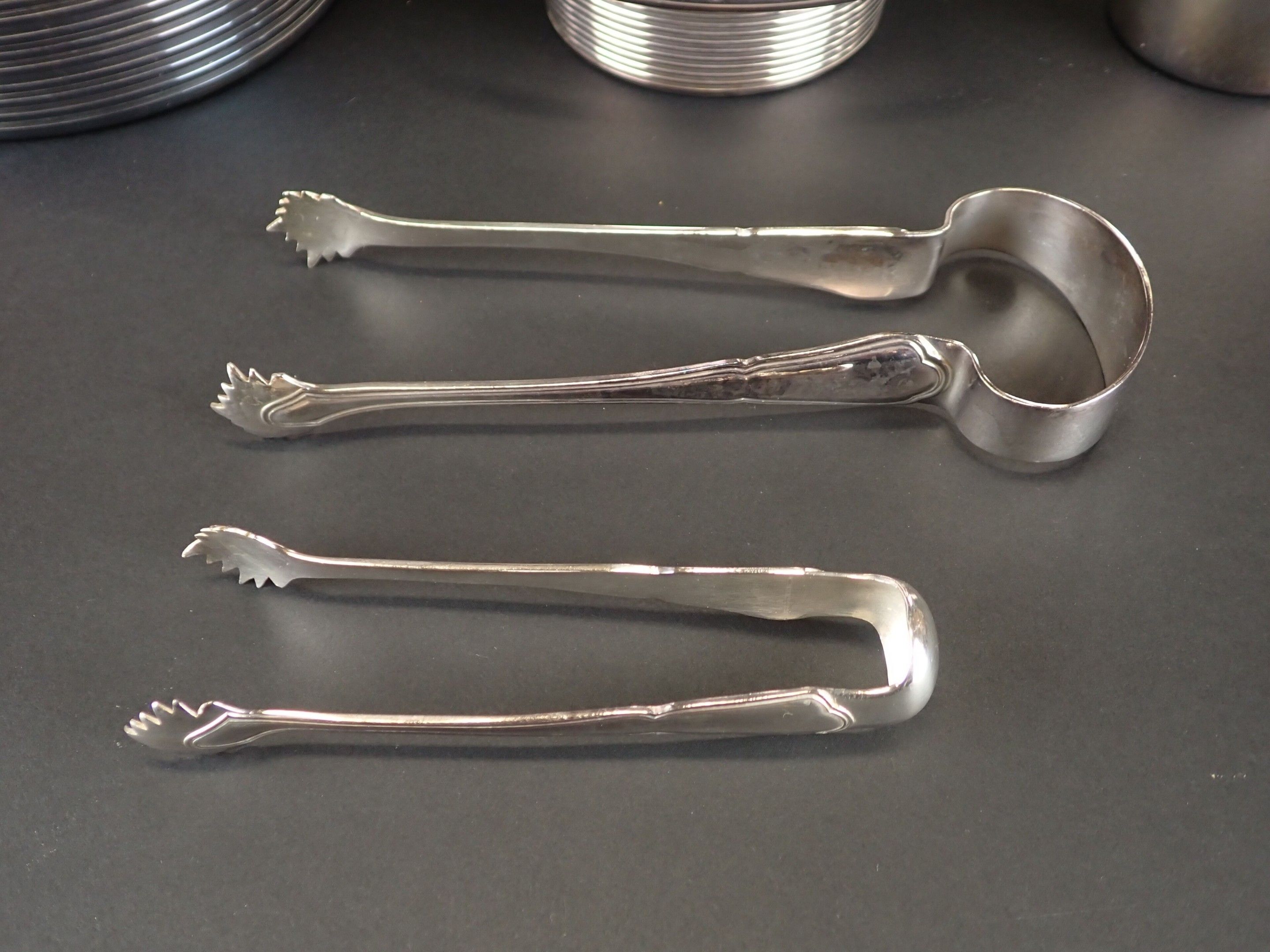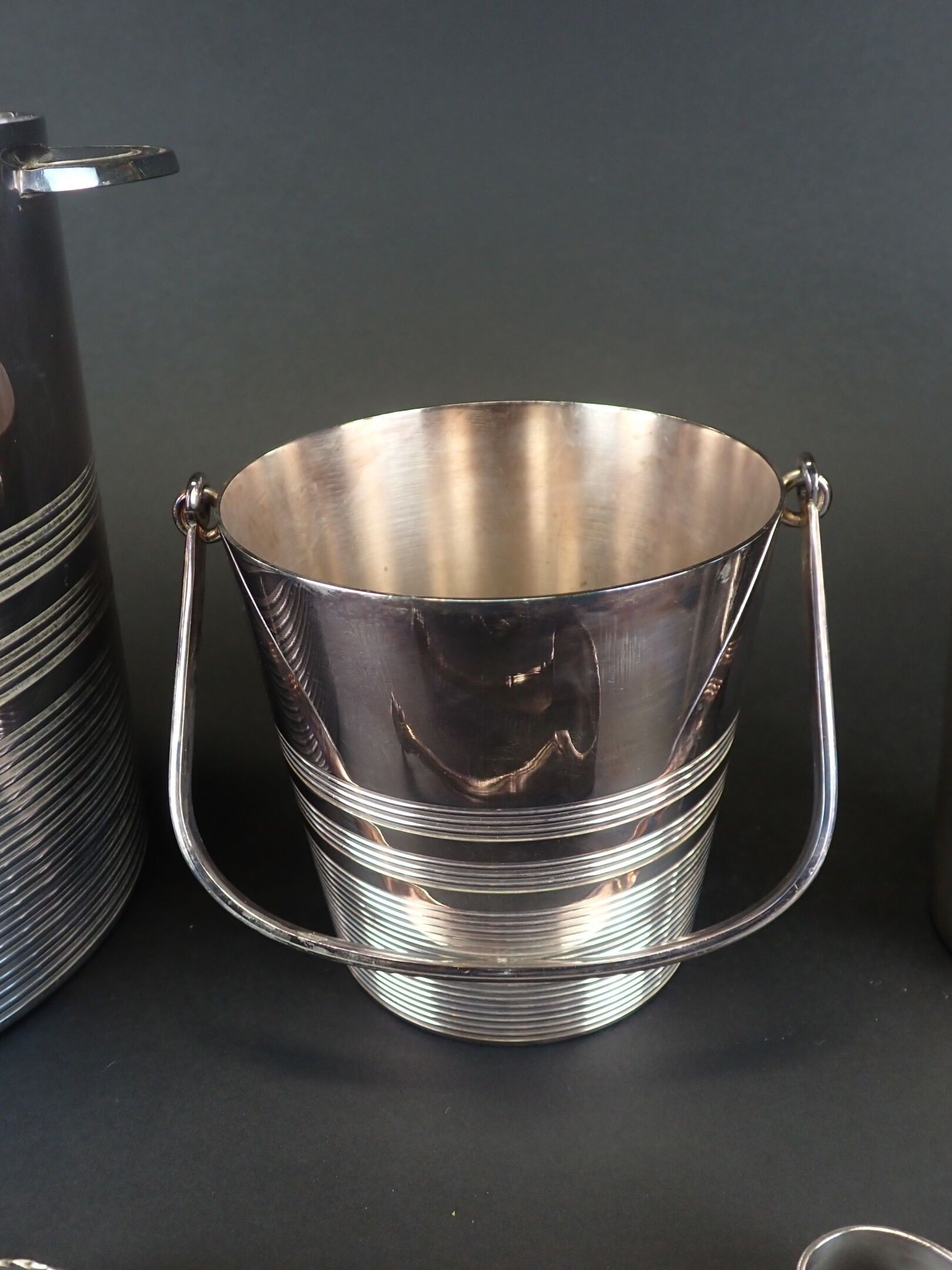 ERCUIS. Two ice and champagne buckets and their ice tongs, and a silver-plated shaker decorated with lines around the rim.
