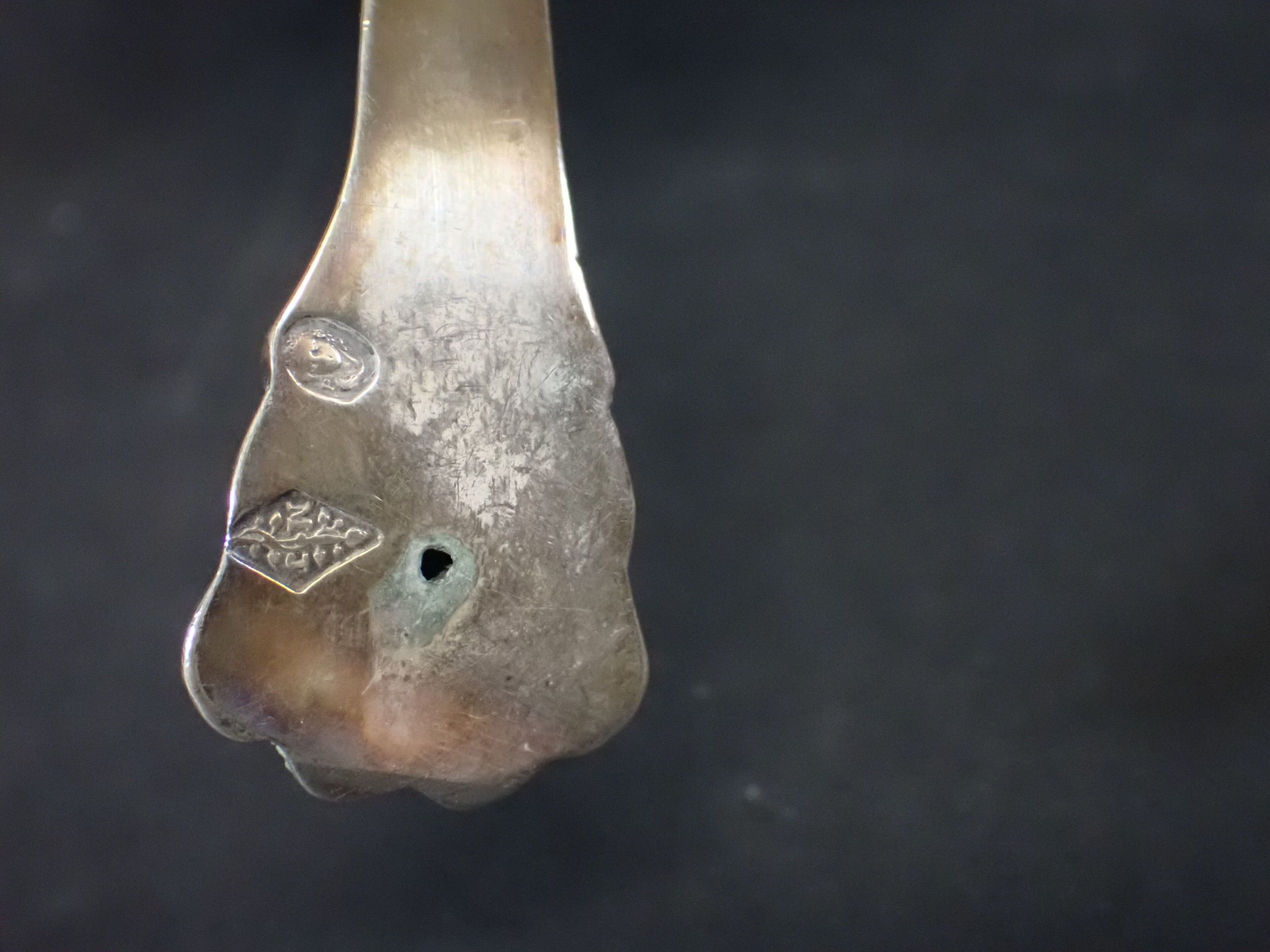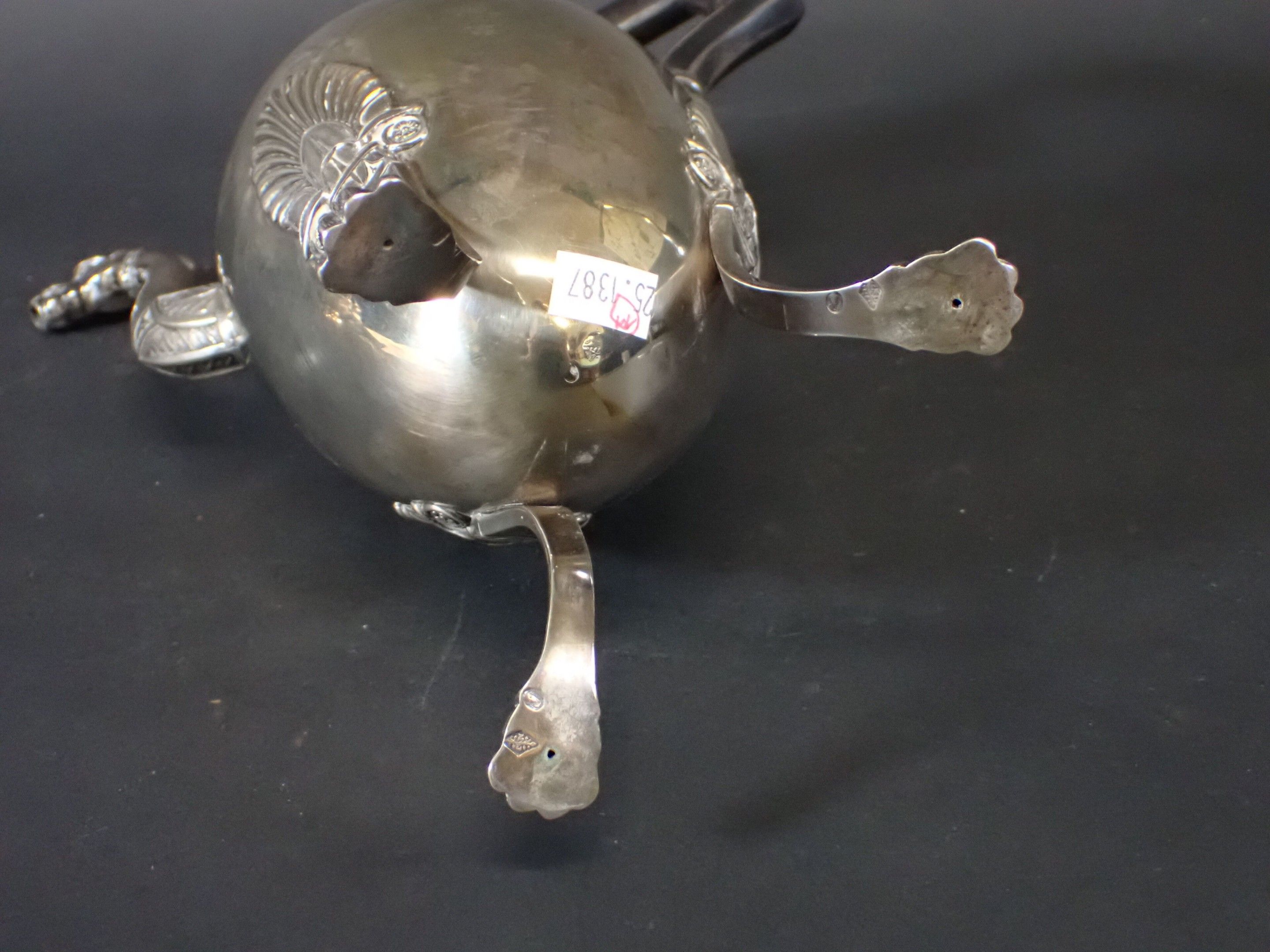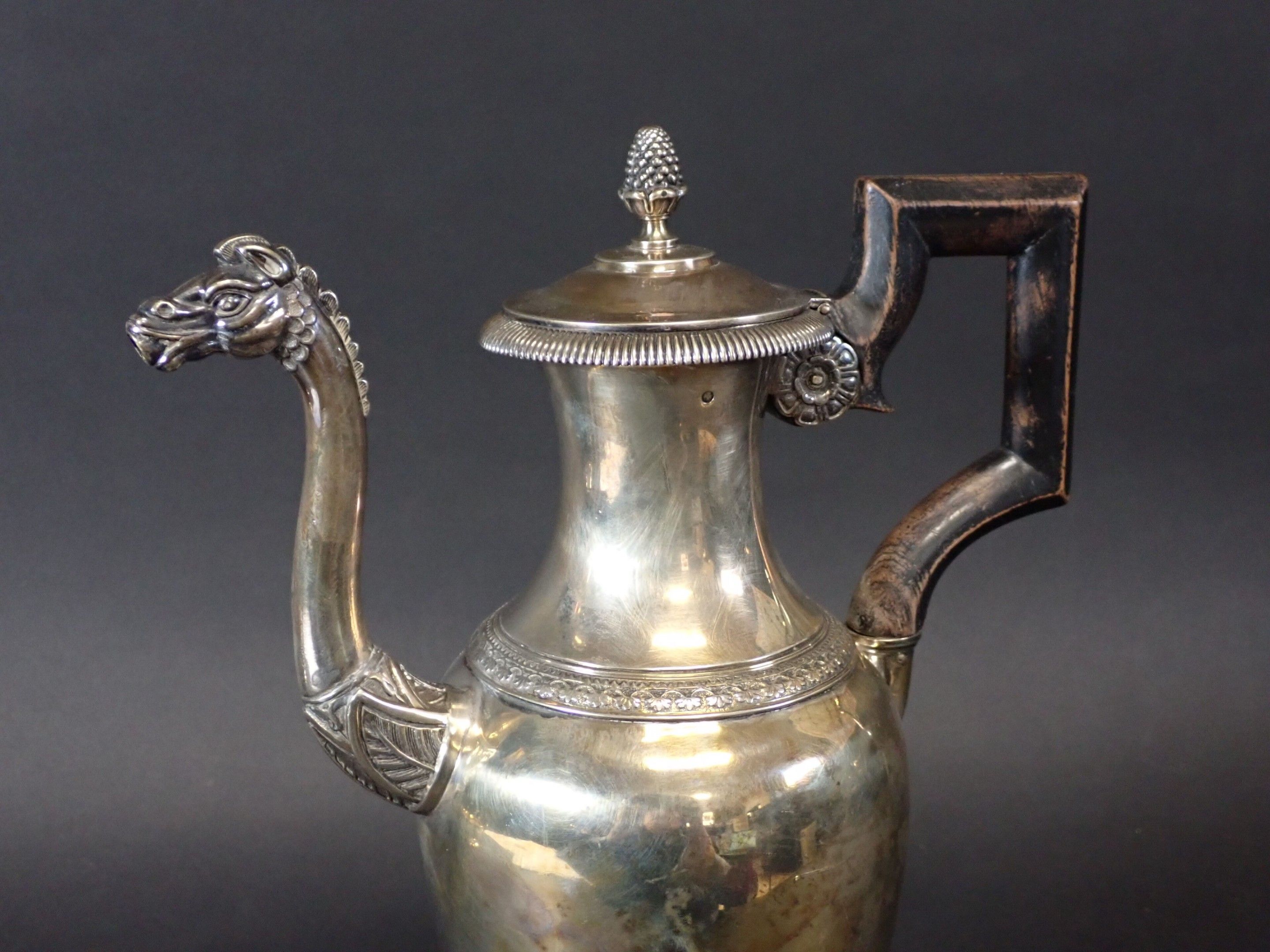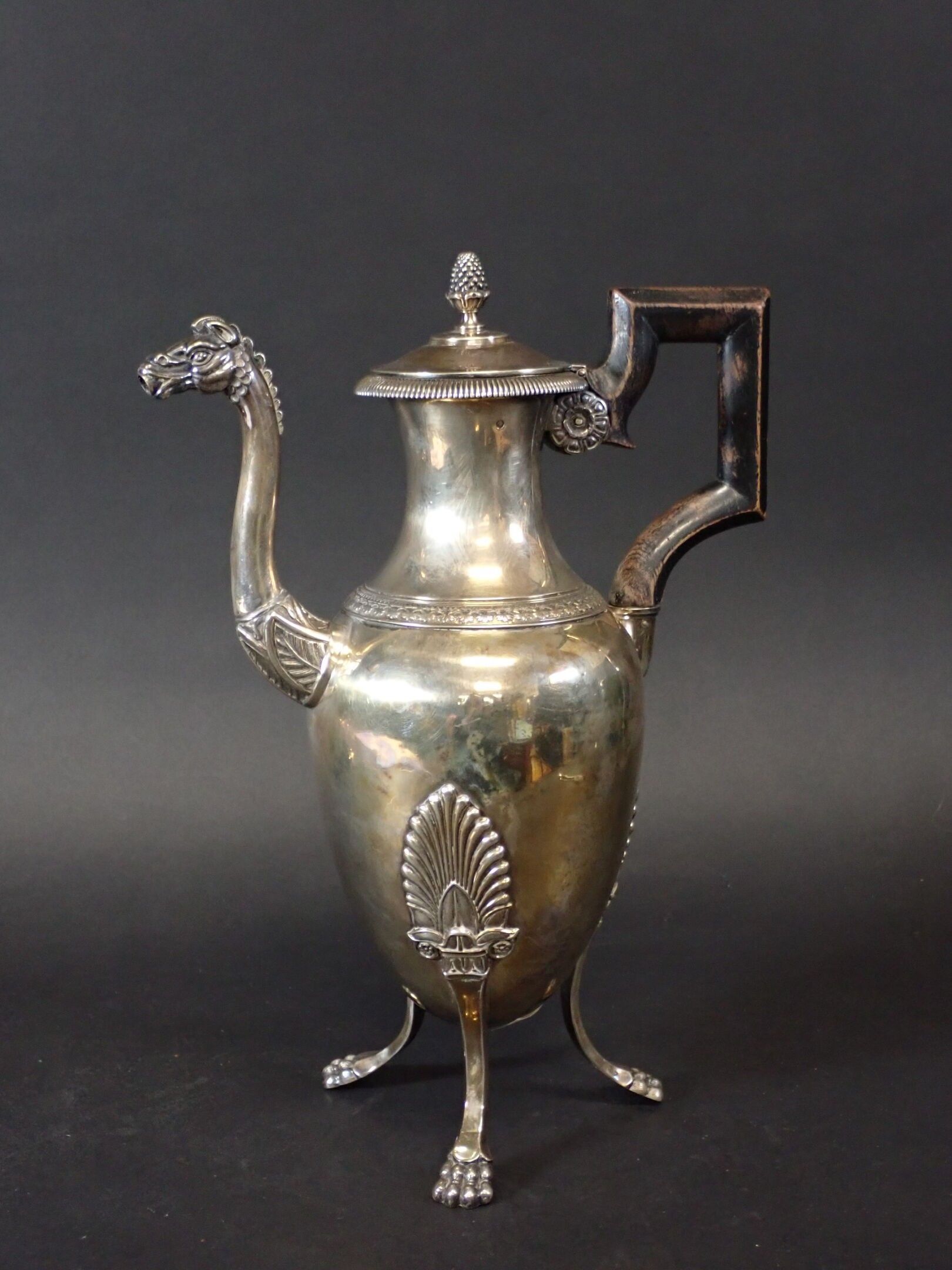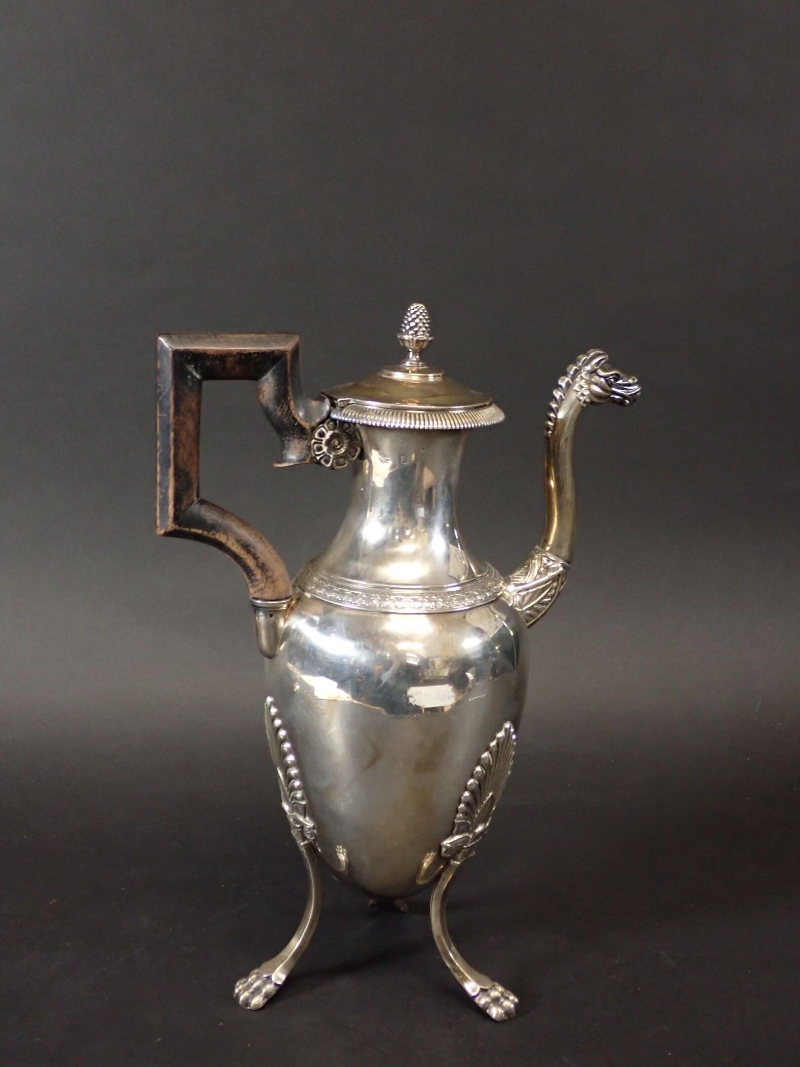 on a tripod base with claw feet, decorated with leafy palmettes, the pouring spout in the form of a horse's head, the lid in the form of a pomegranate, the geometric handle in exotic wood, goldsmith's hallmark with the letters M and J.