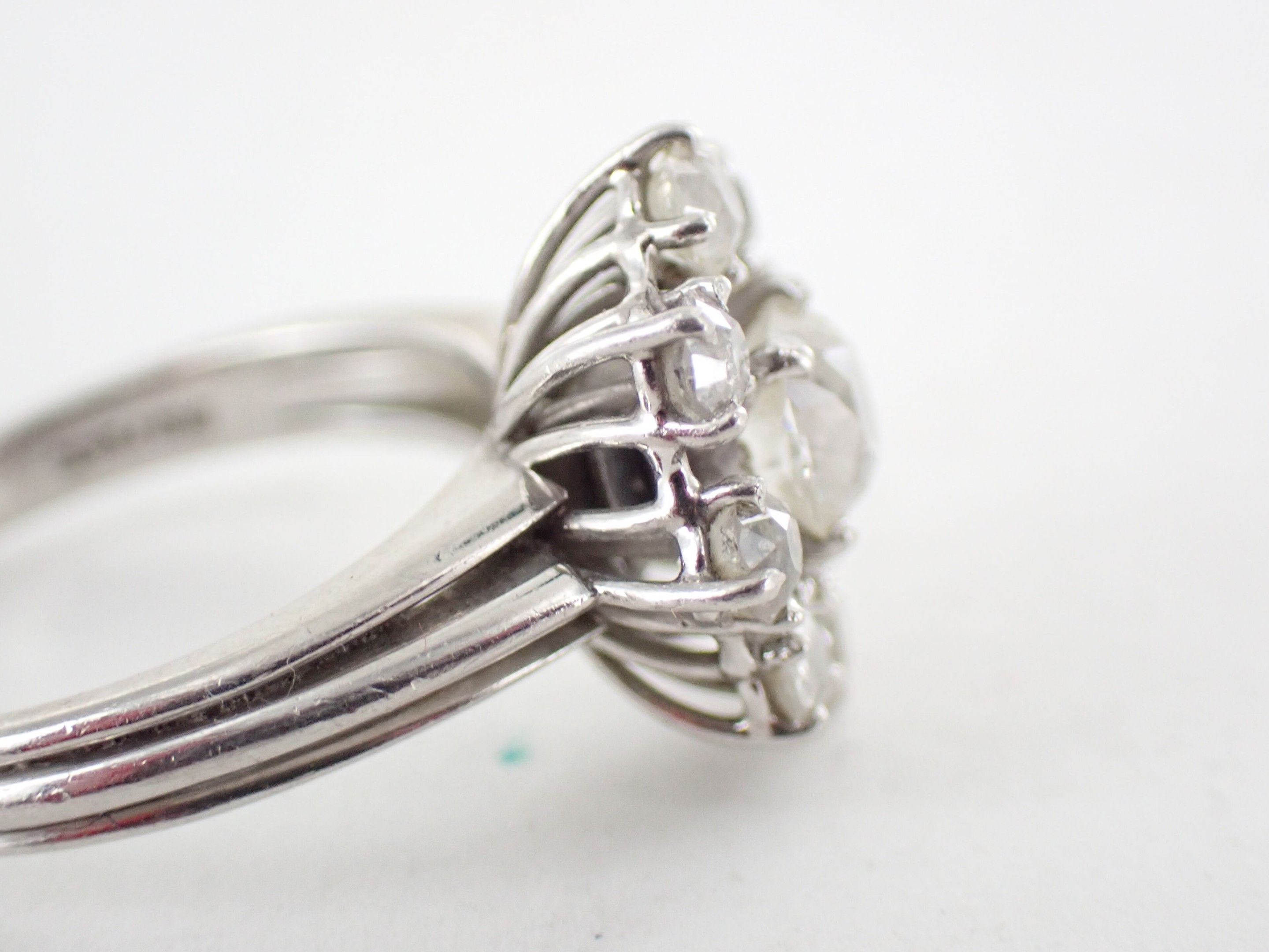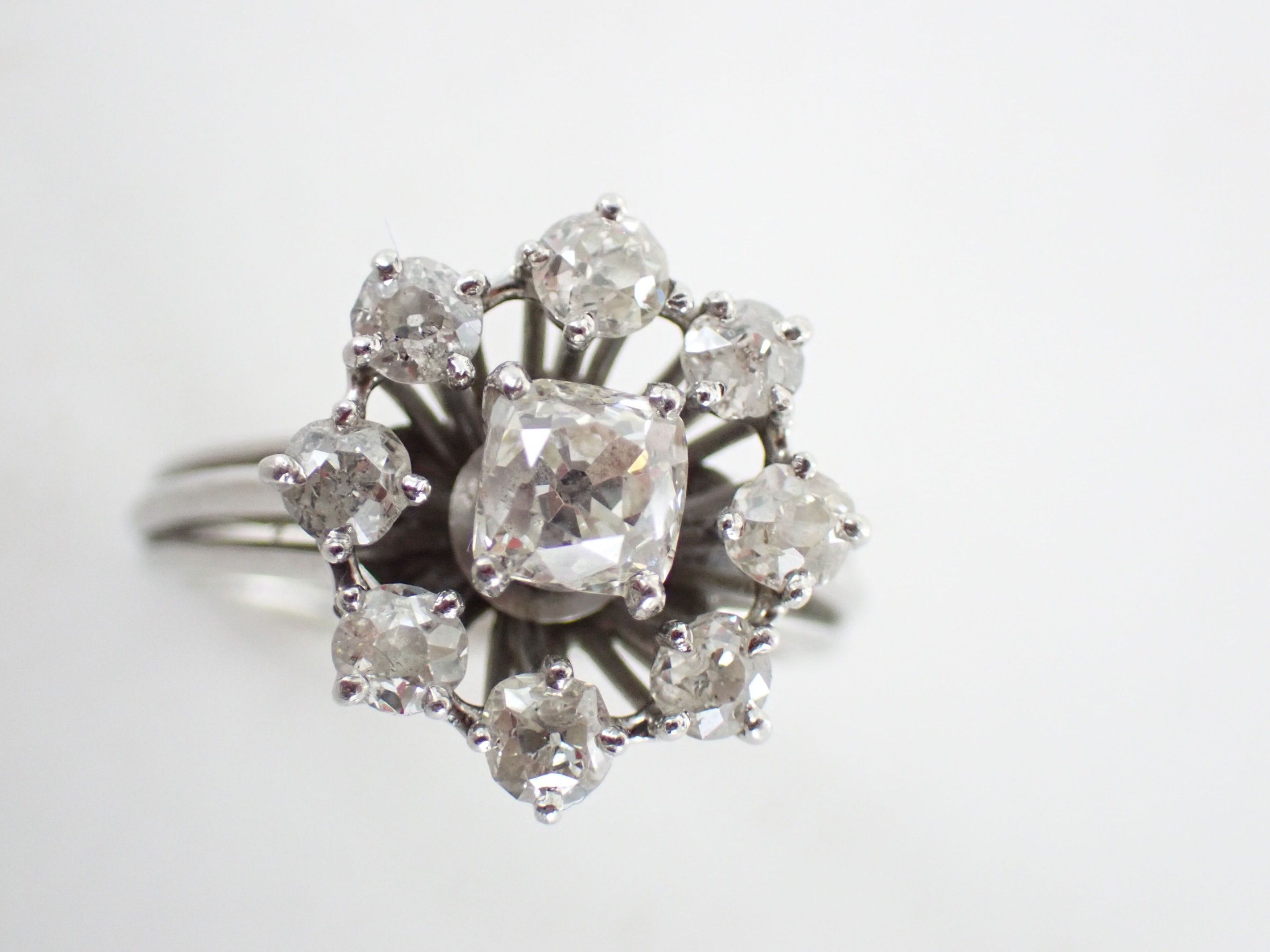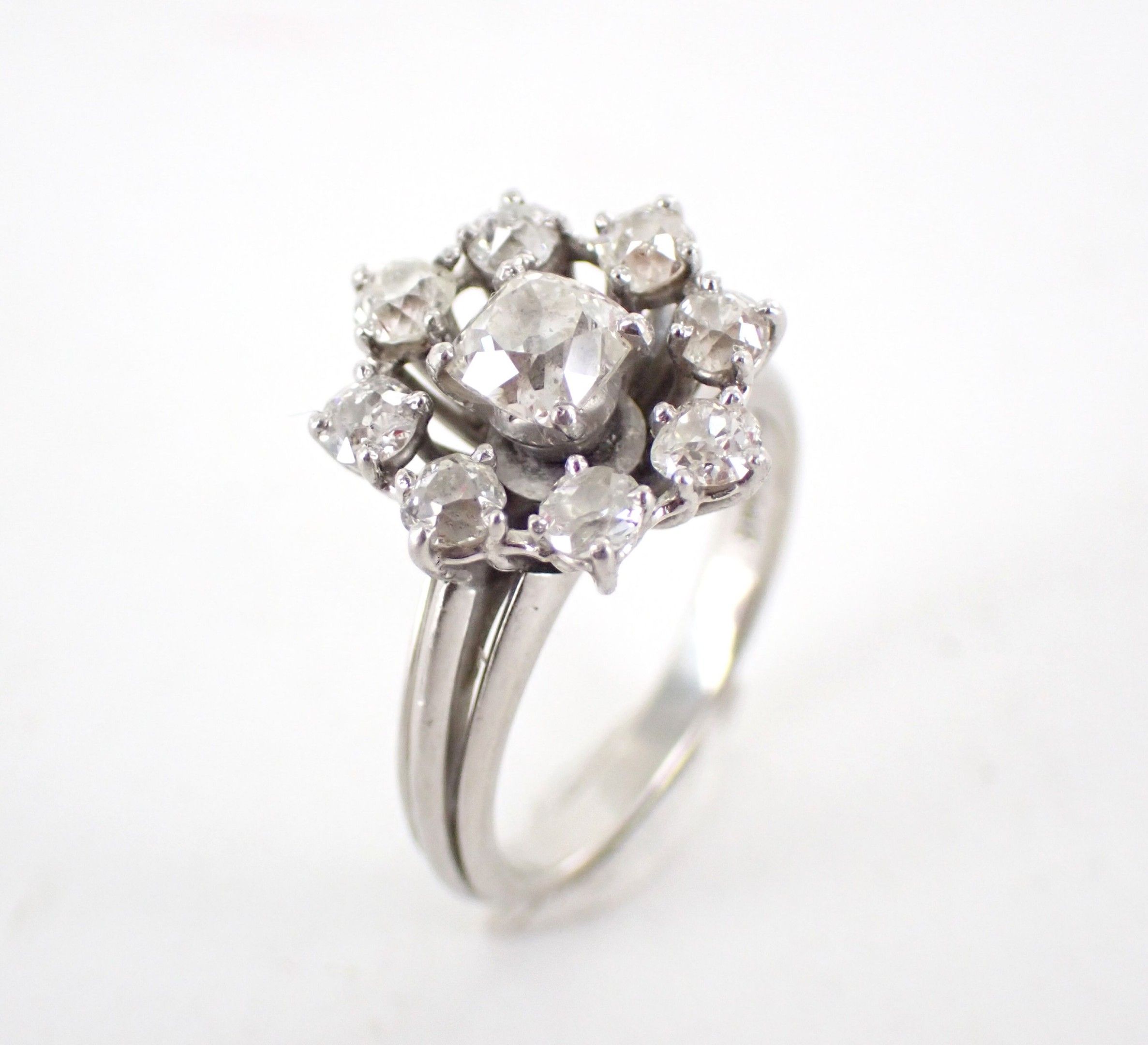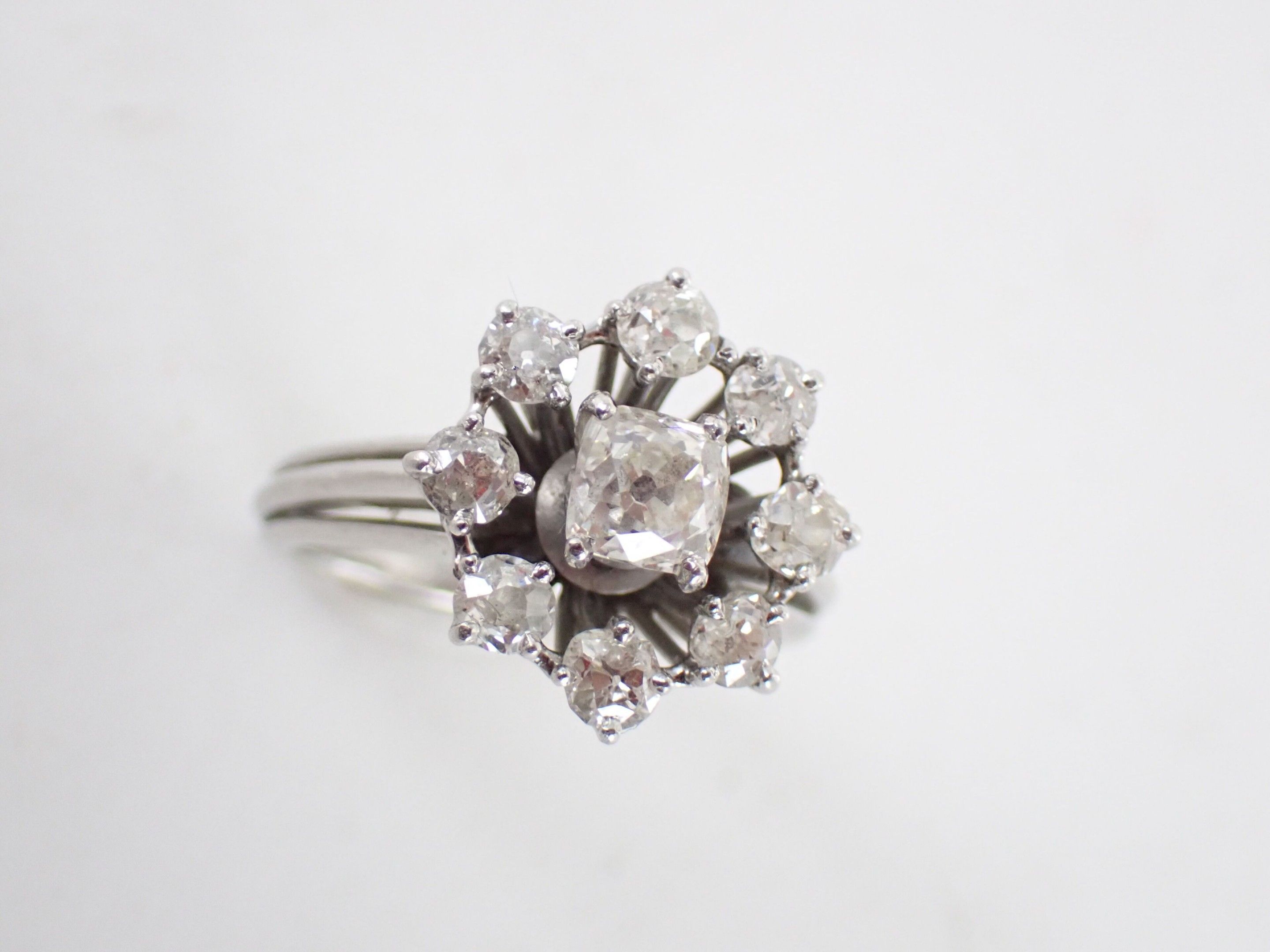 Ring in 850 thousandth platinum, the centre decorated with a flowerette set with an old-cut cushion diamond weighing approximately 0.30 carat in a setting of eight round old-cut diamonds. TDD: 52.5. Gross weight: 7.4 g (Traces of sizing and apocryphal "Cartier" signature).
