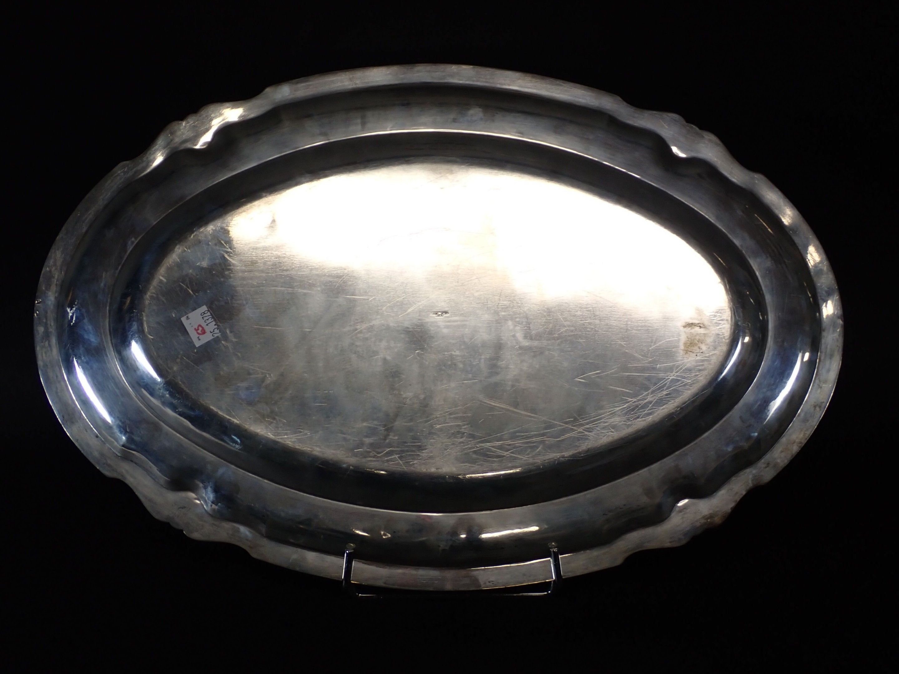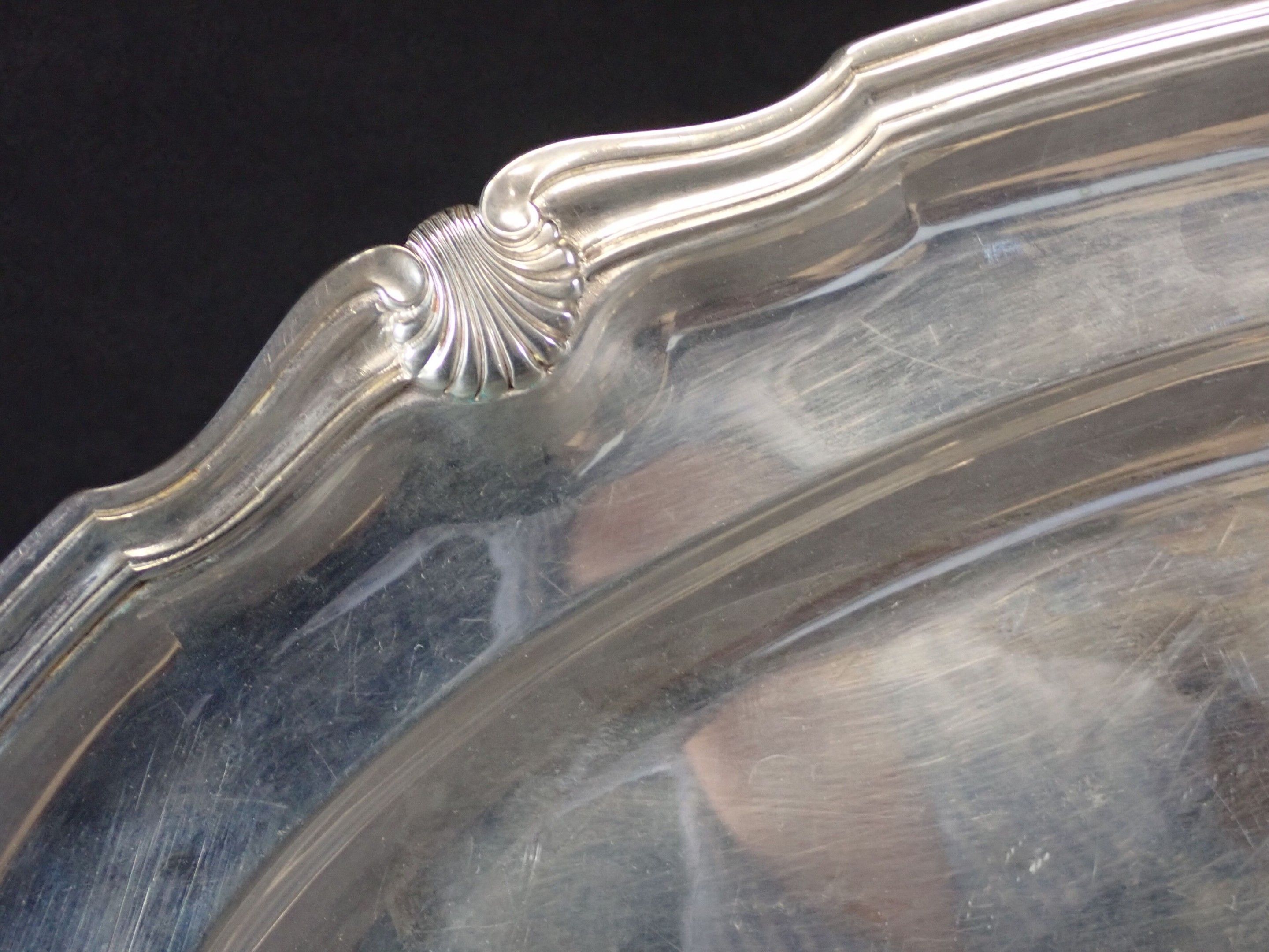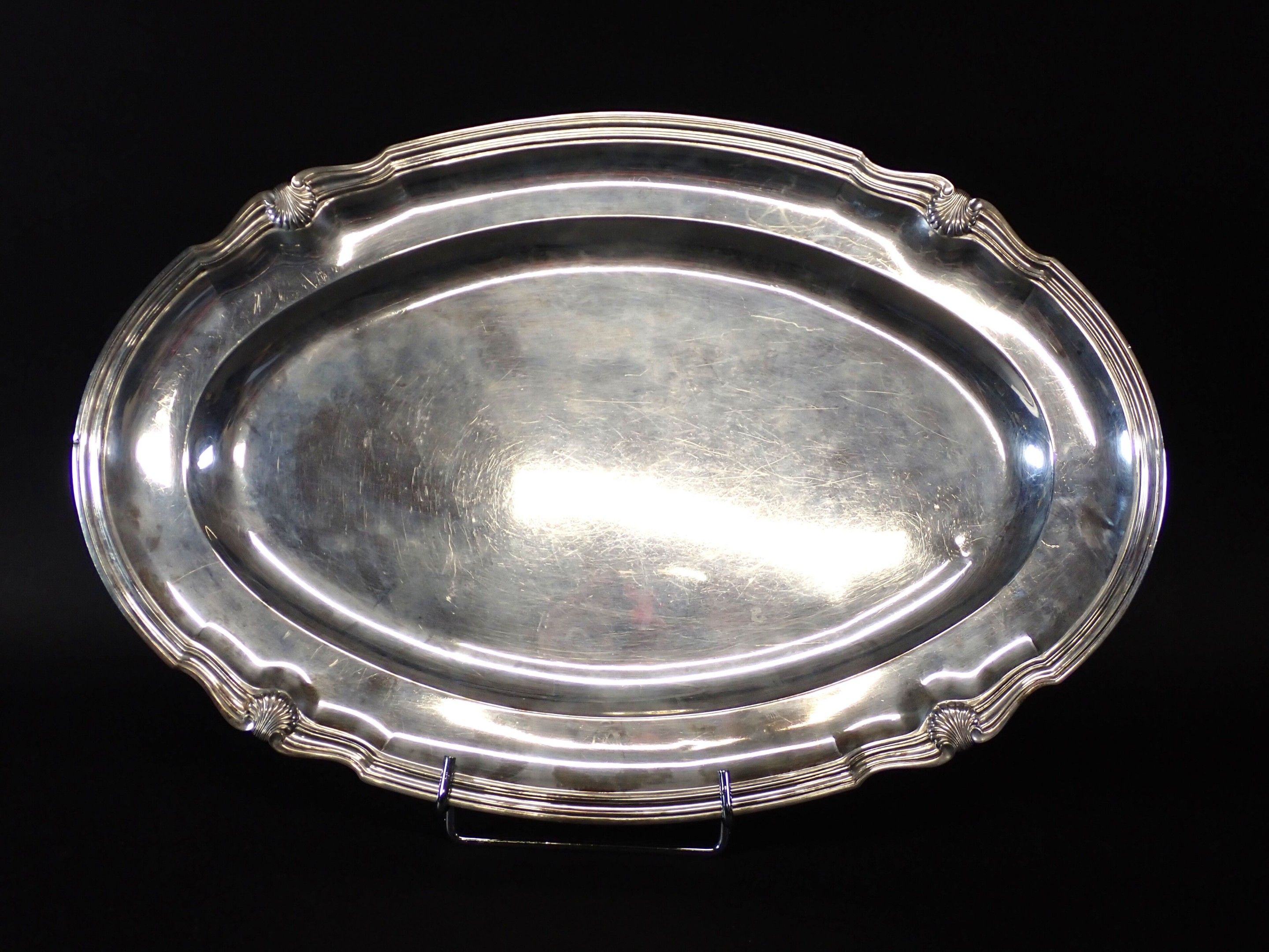 FOUQUET LAPAR - Large oval-shaped dish in solid silver 800/1000e decorated with shells and contoured fillets. Length: 49 cm - Net weight: 1446 g (wear)