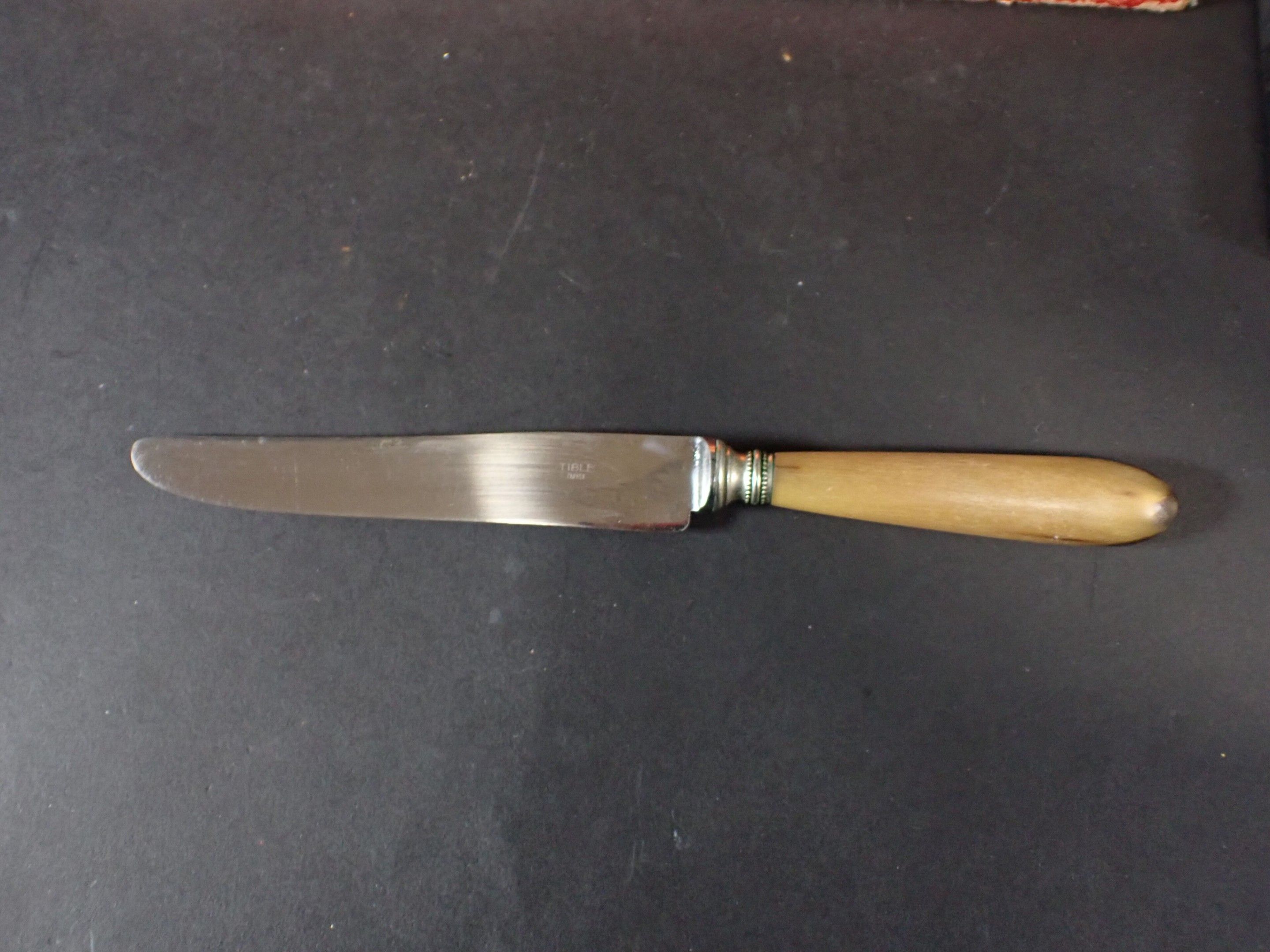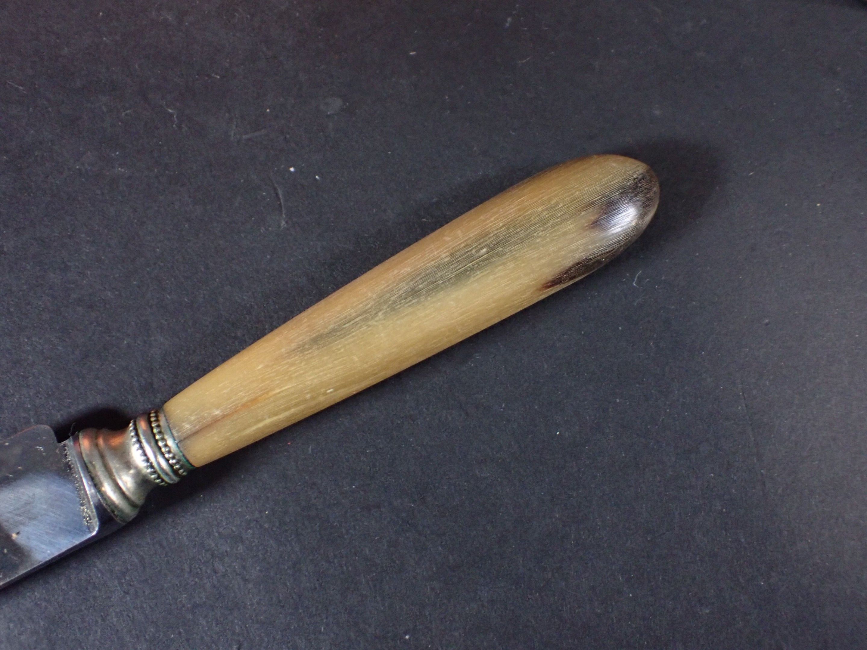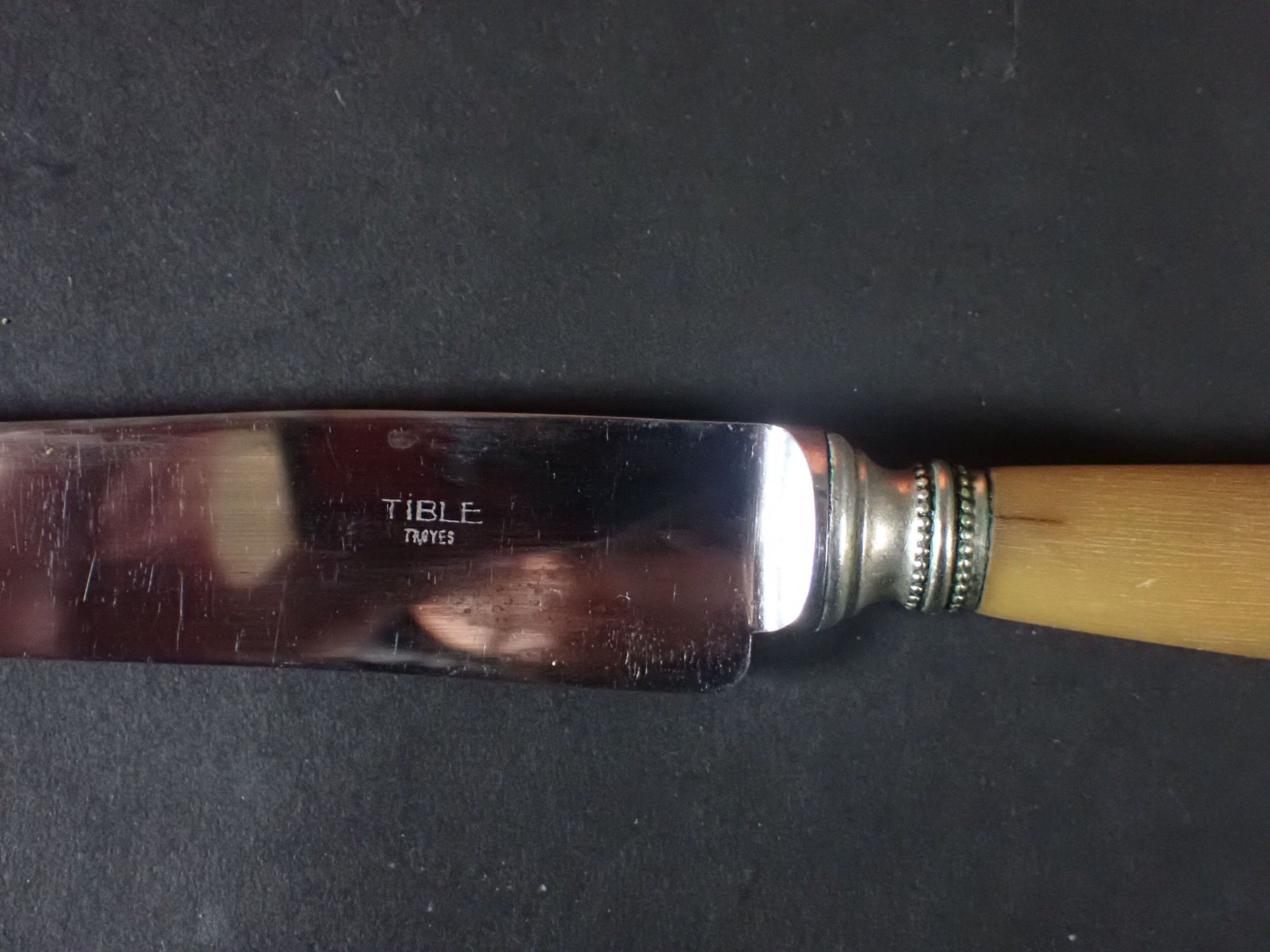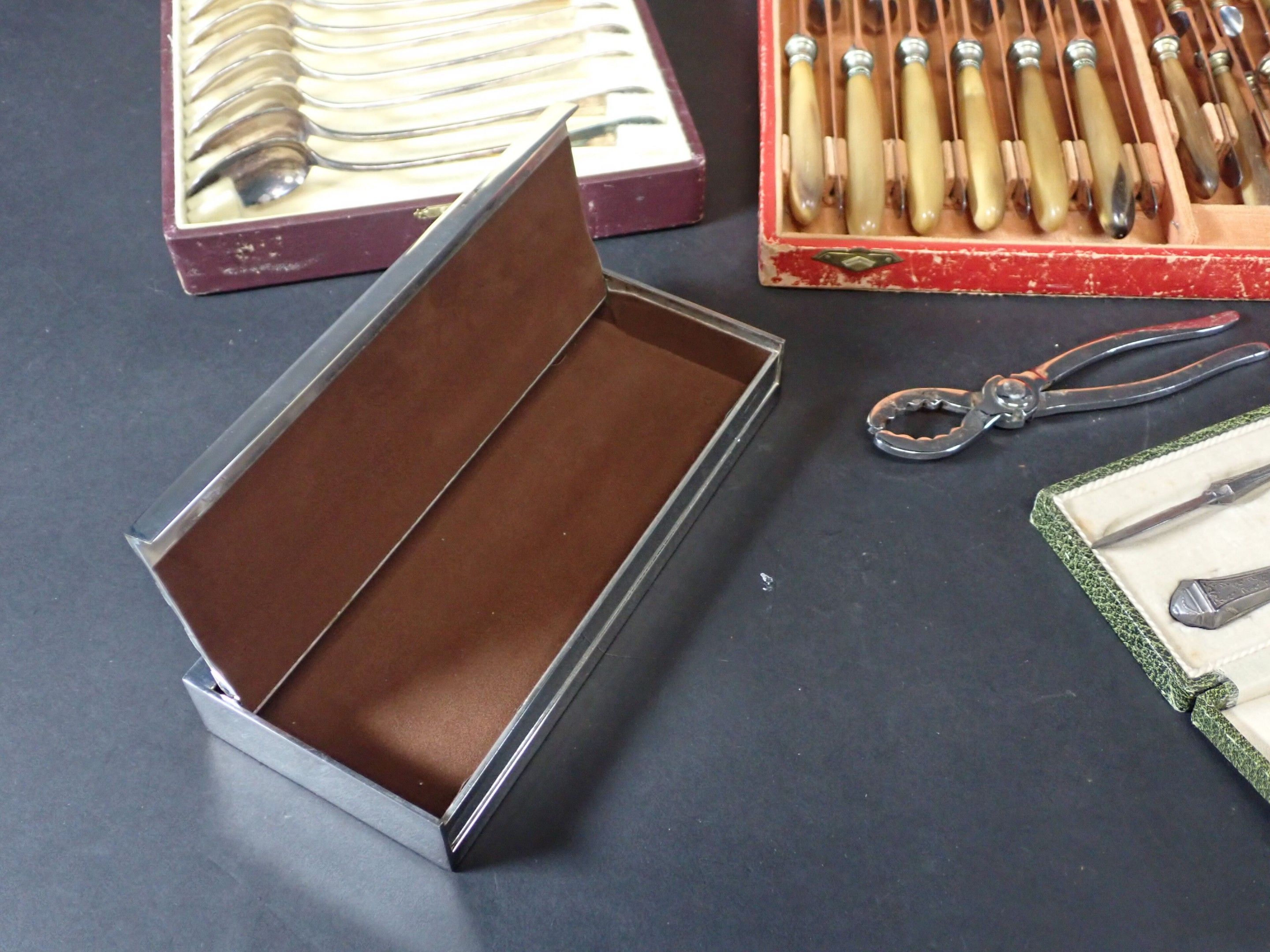 Set of miscellaneous cutlery comprising: 2 pieces of solid silver cutlery 800/1000e comprising: an Art Nouveau serving scoop and a small spoon with engraved decoration - net weight: 150 g - OCCUPIED in metal: a metal letter set - a silver-plated metal box - a metal walnut tong - 12 large silver-plated metal punch spoons - 24 knives with horn handles.