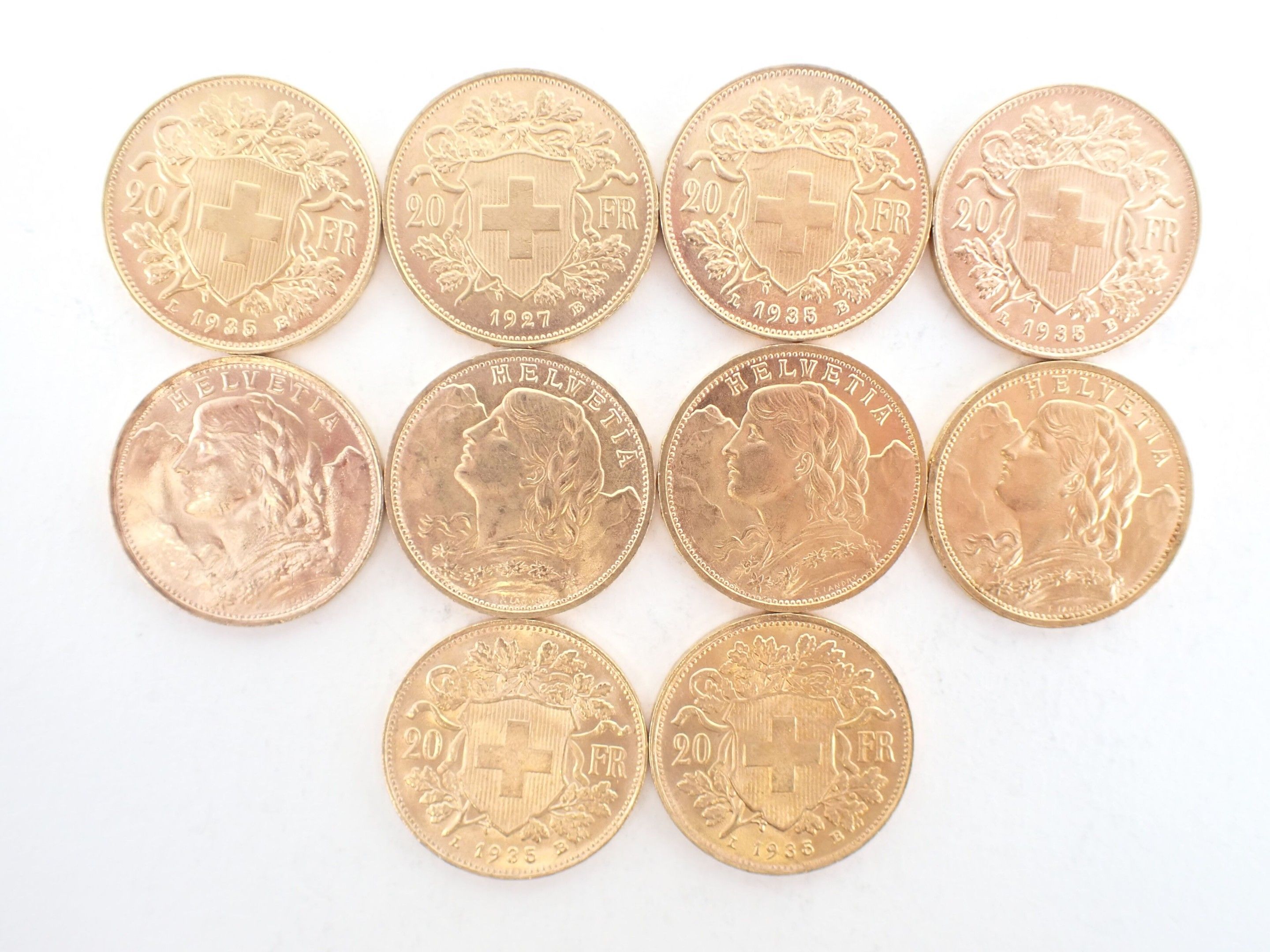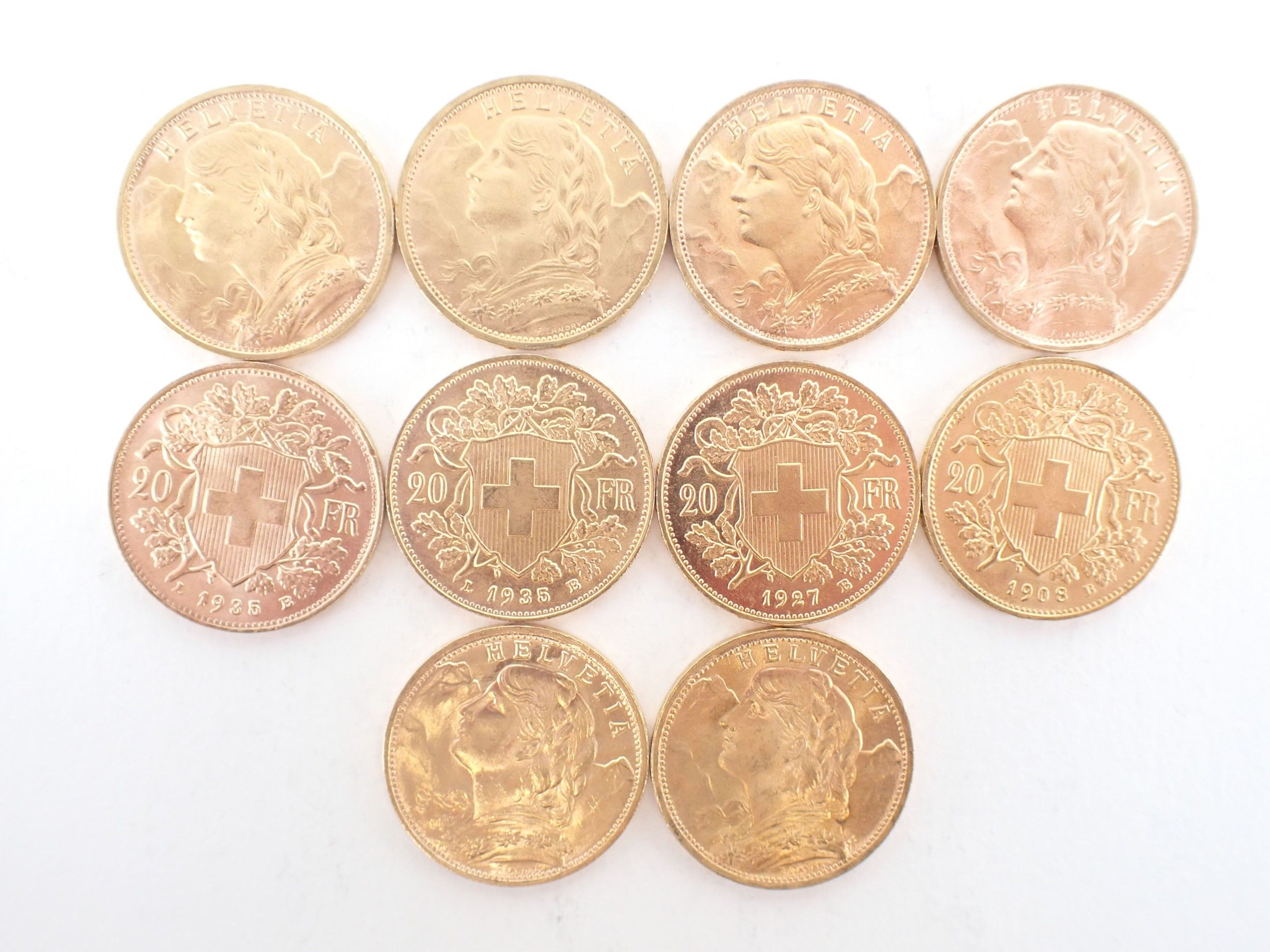10 Swiss 20 franc gold coins Helvetia - Weight: 64.