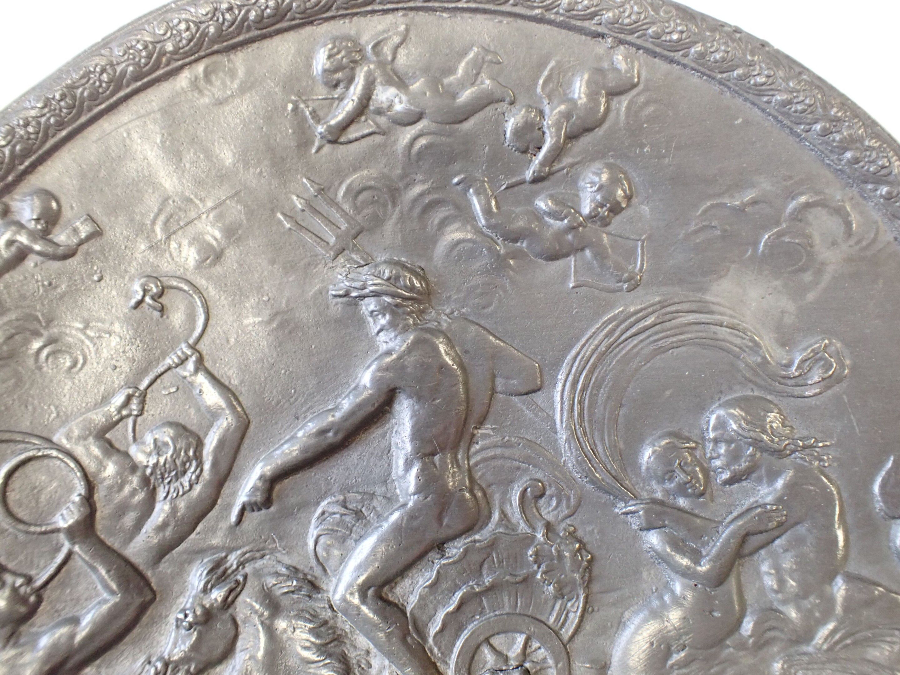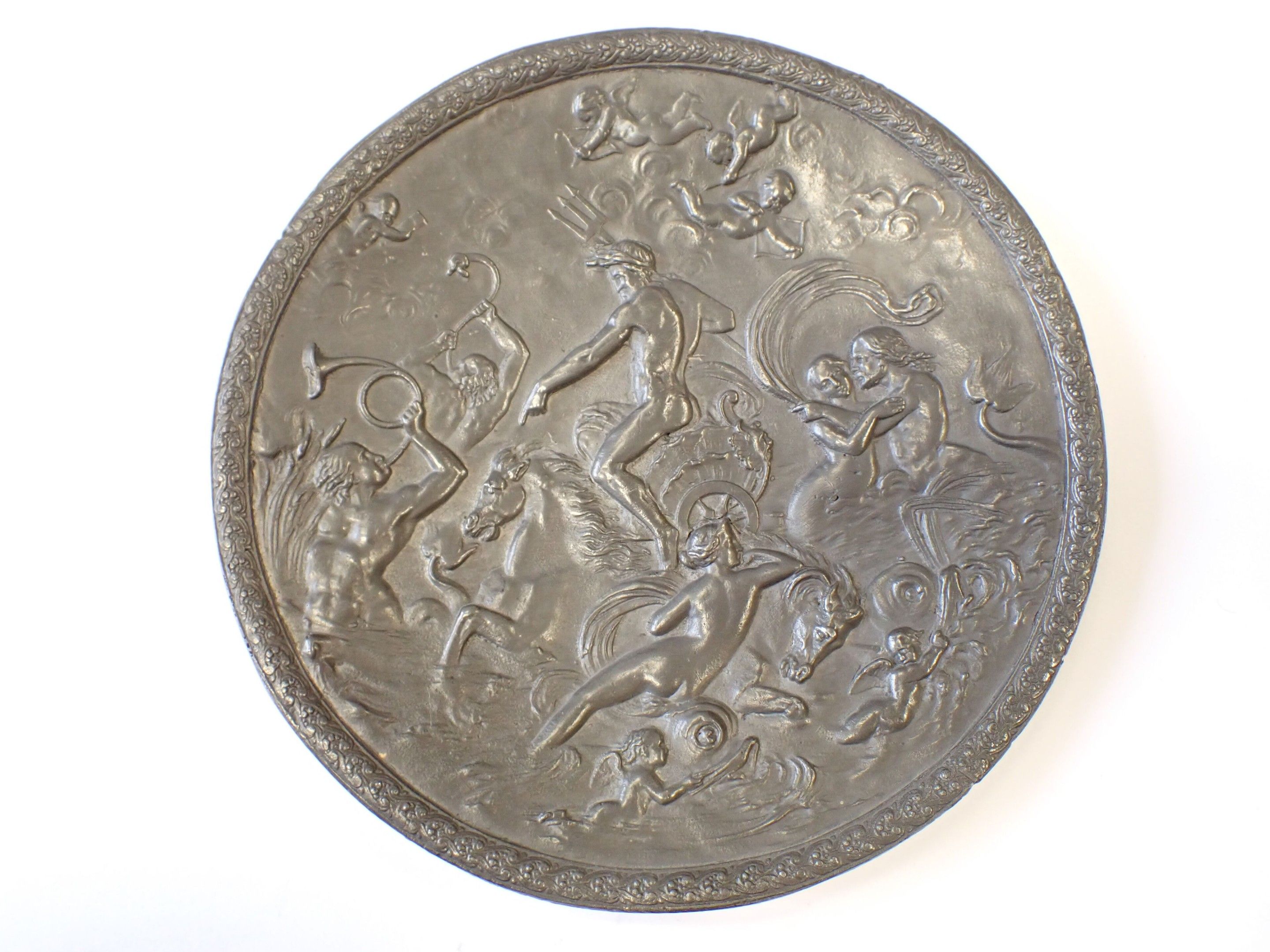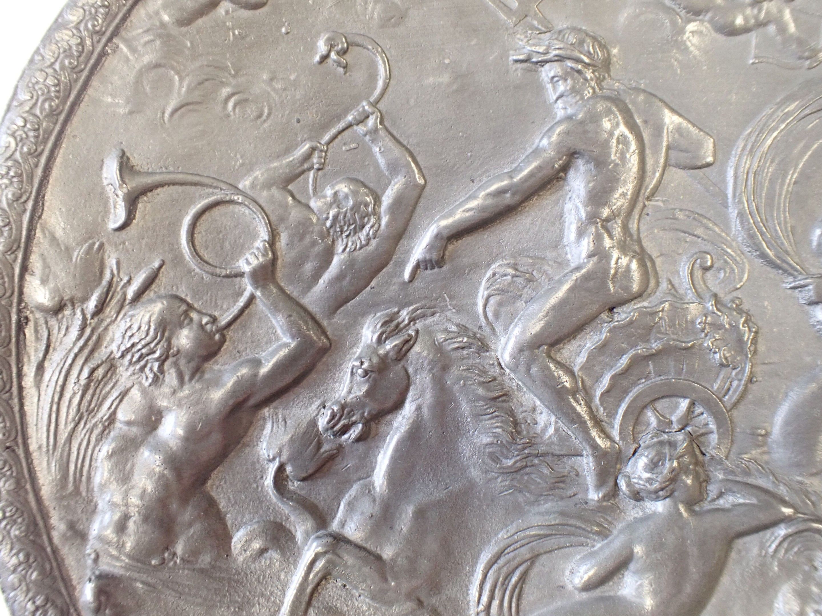 A slightly concave circular pewter plate with low relief decoration depicting the Triumph of Neptune with Amphitrite, 17th century. Diameter: 150 mm