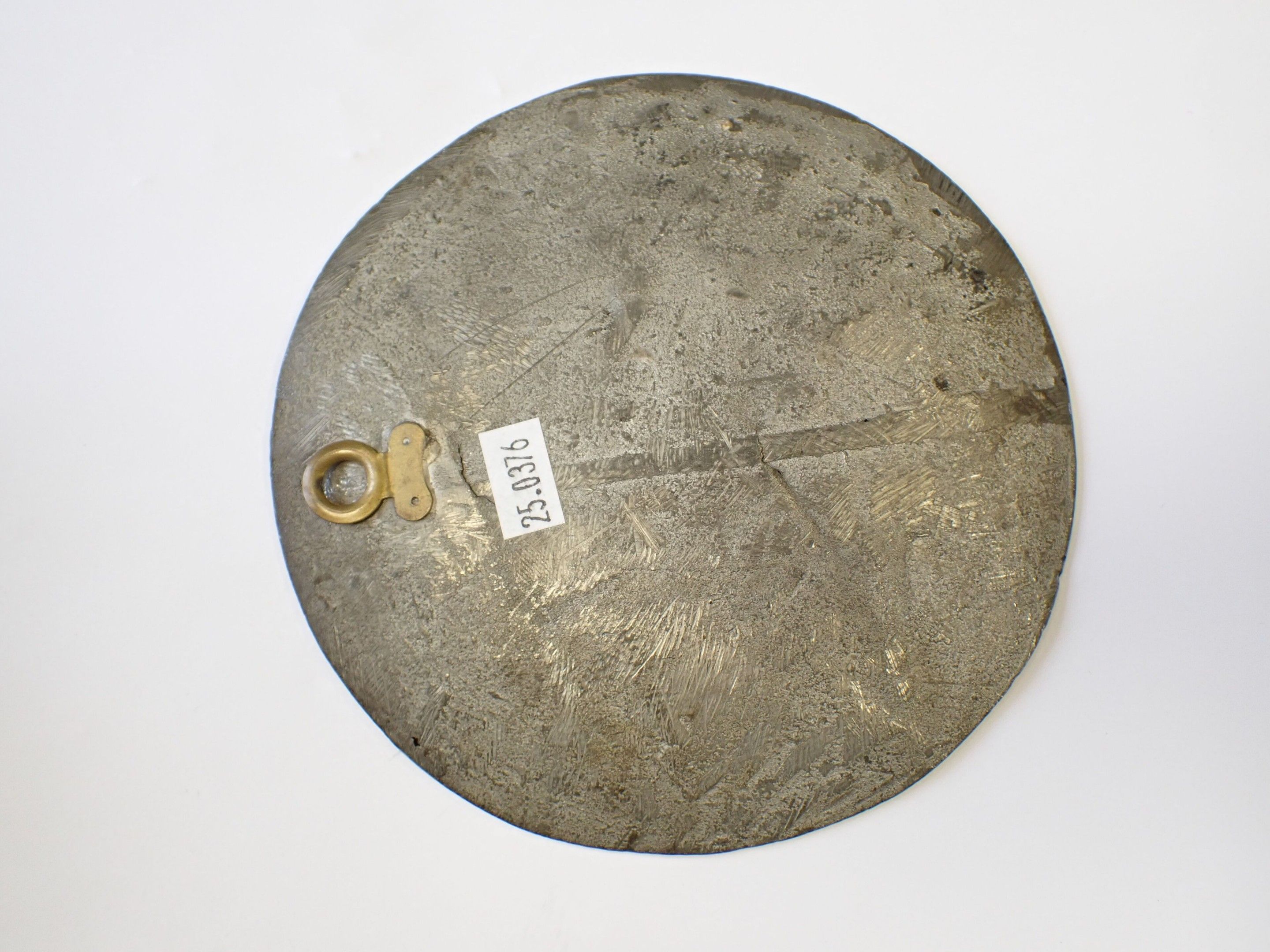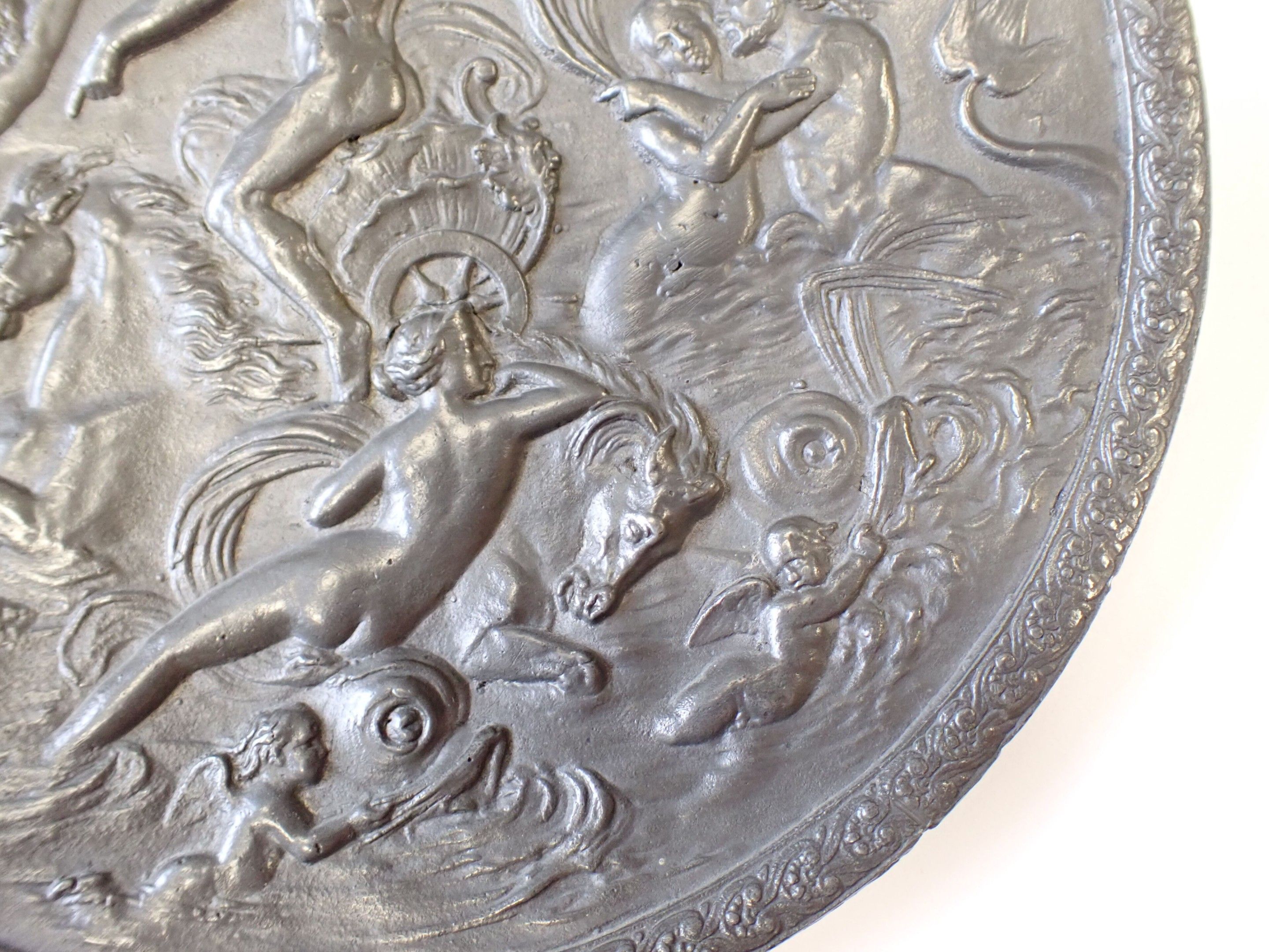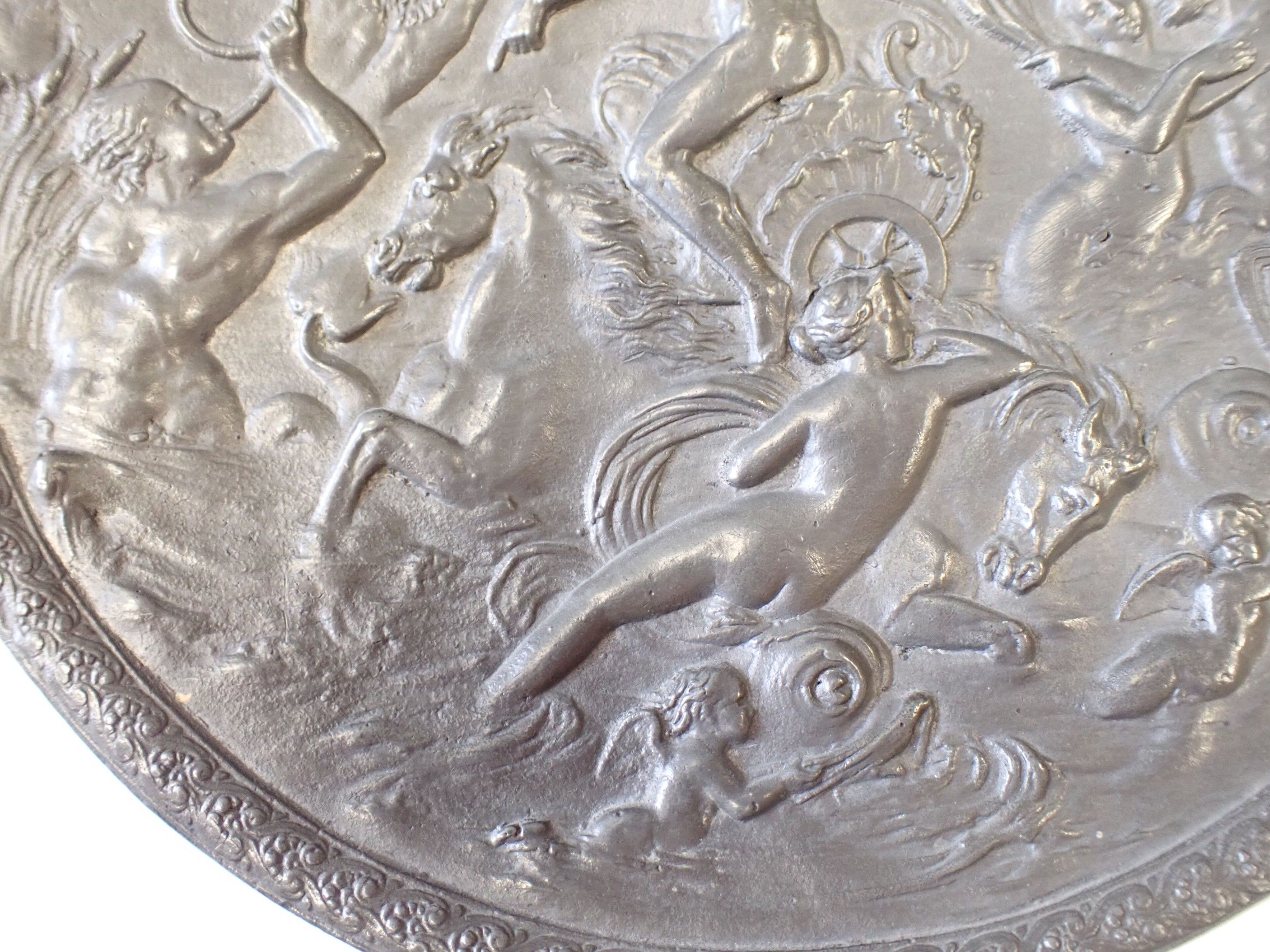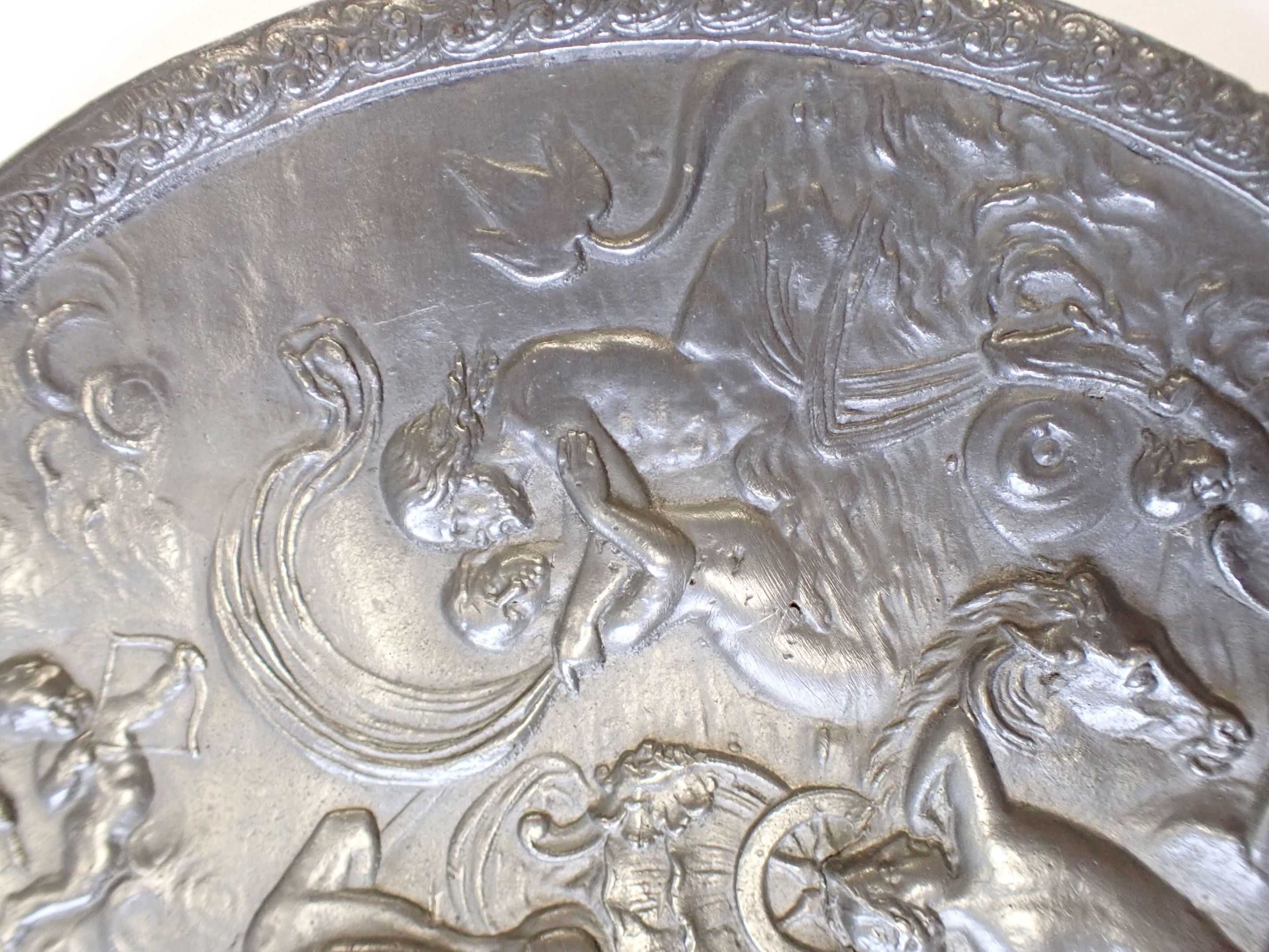 A slightly concave circular pewter plate with low relief decoration depicting the Triumph of Neptune with Amphitrite, 17th century. Diameter: 150 mm