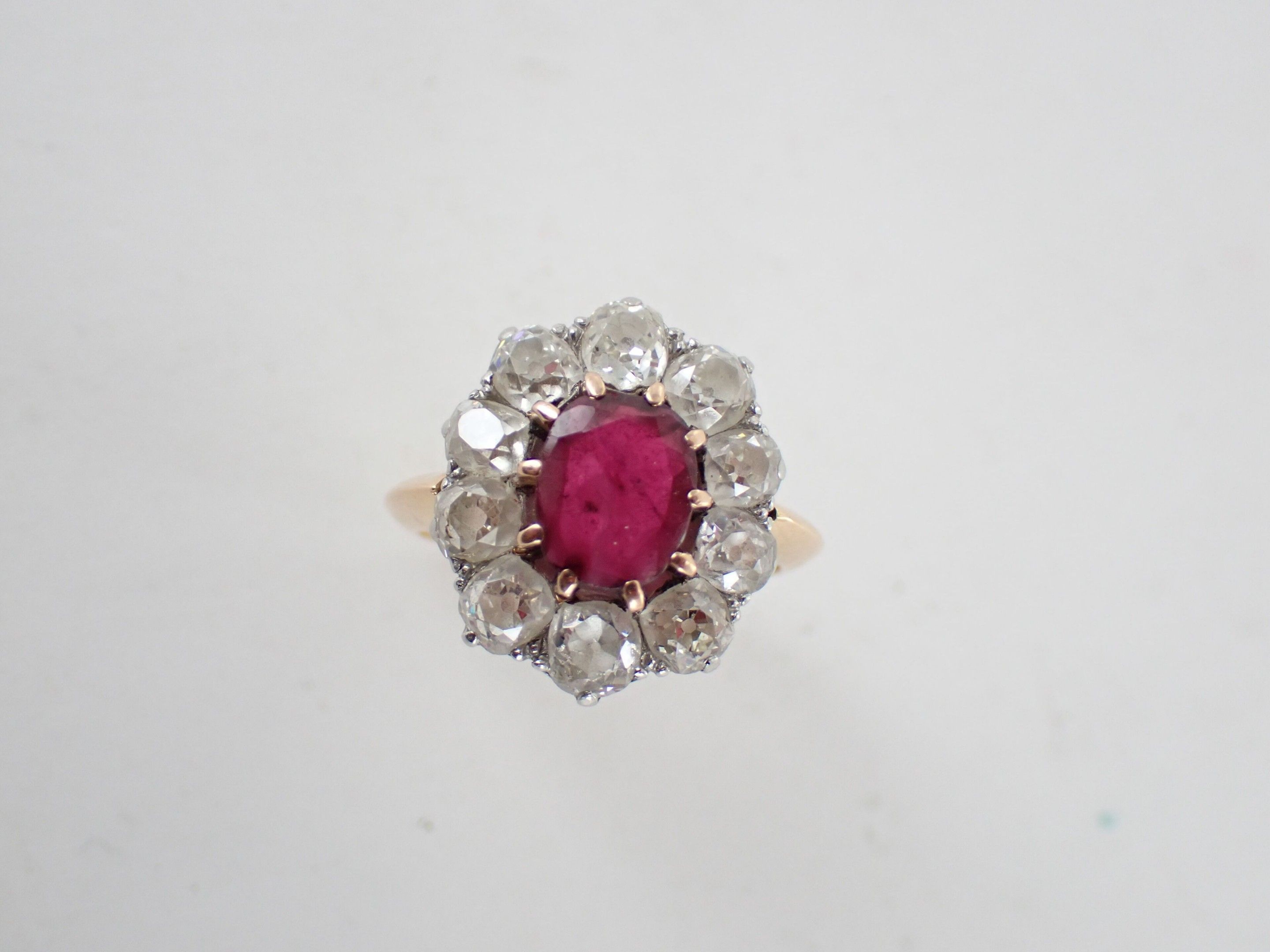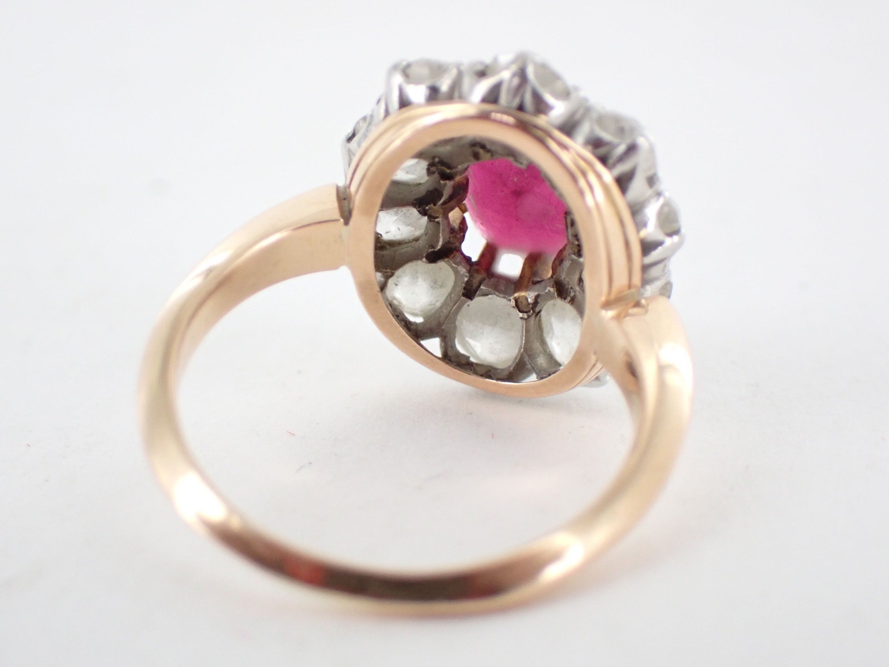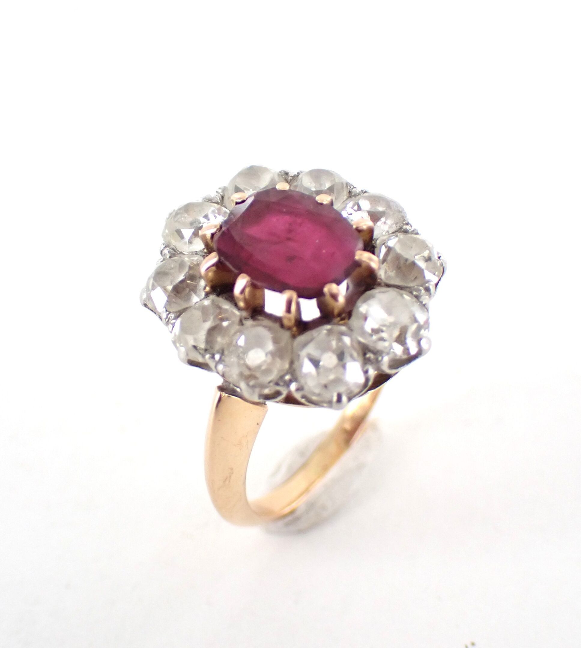 Ring in 750 thousandths gold with a central oval ruby in a setting of ten round old-cut diamonds. TDD: 53.5. Gross weight: 5.8 g. (Chipped and missing)
