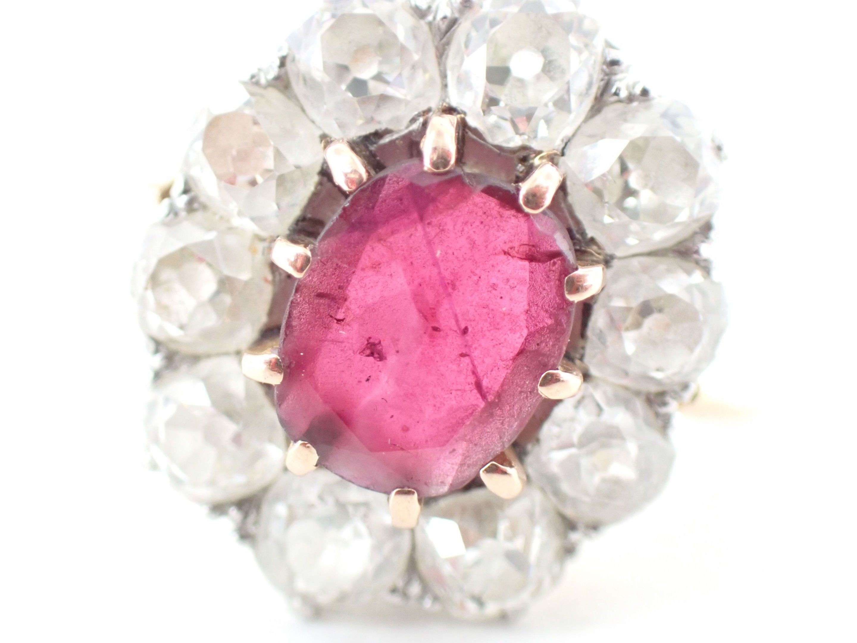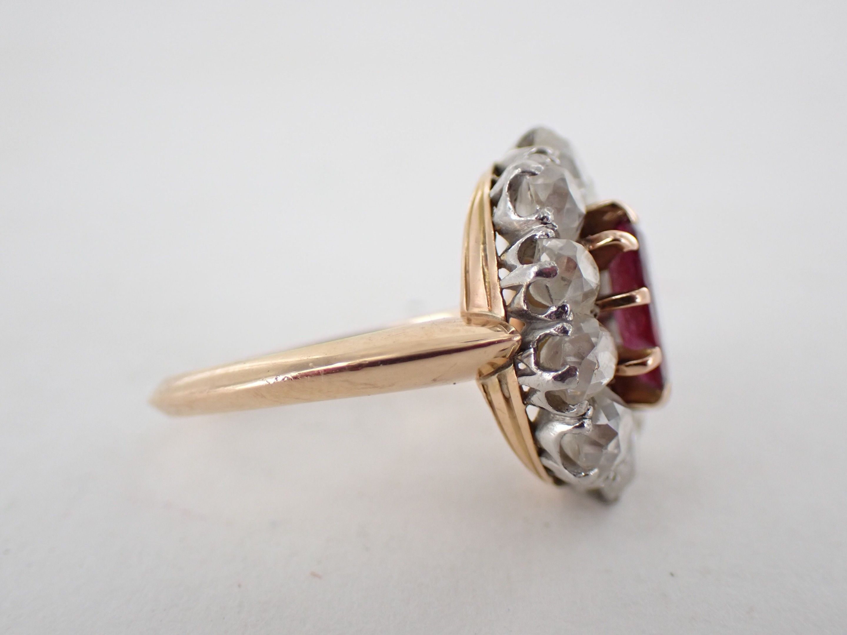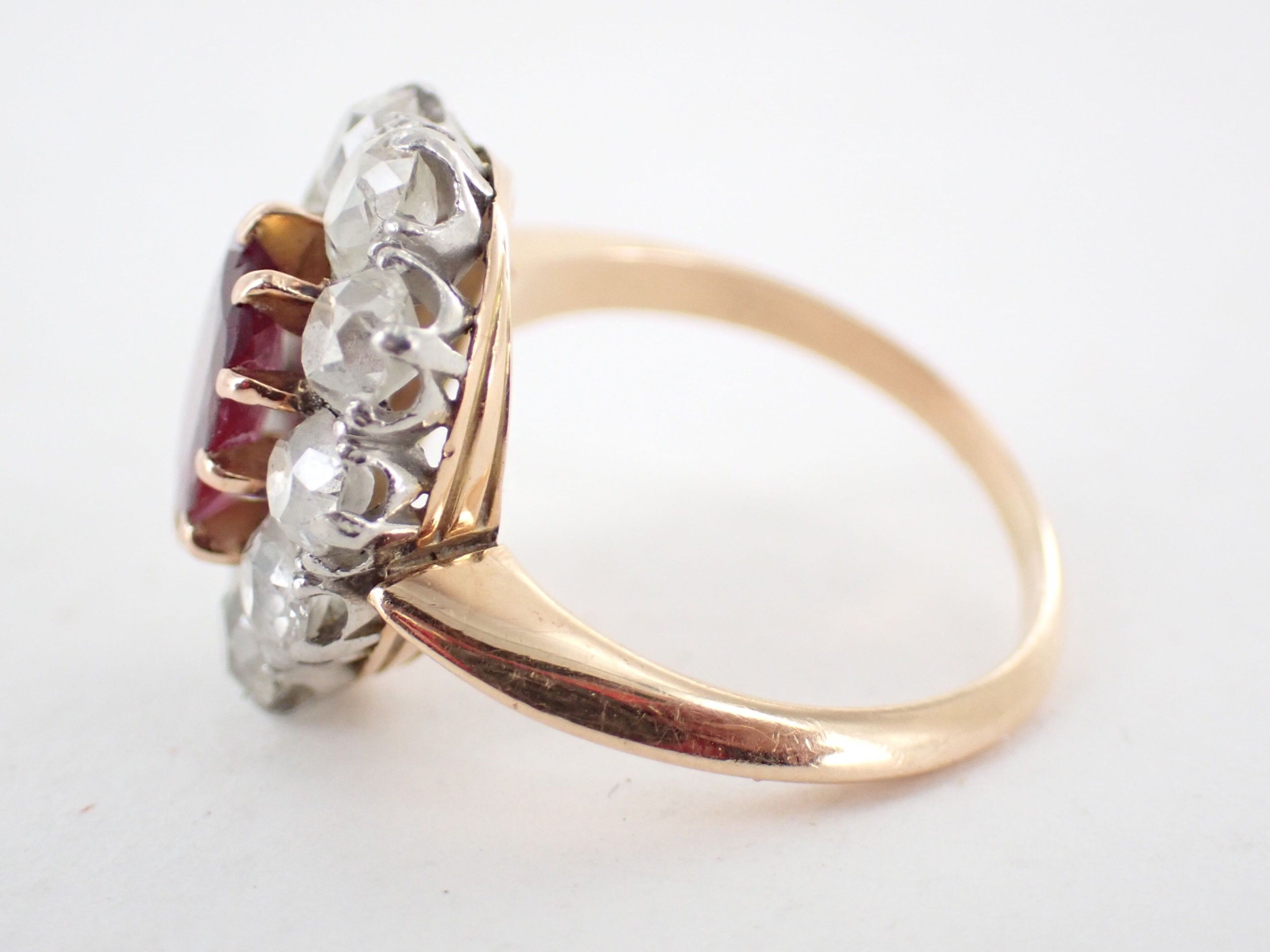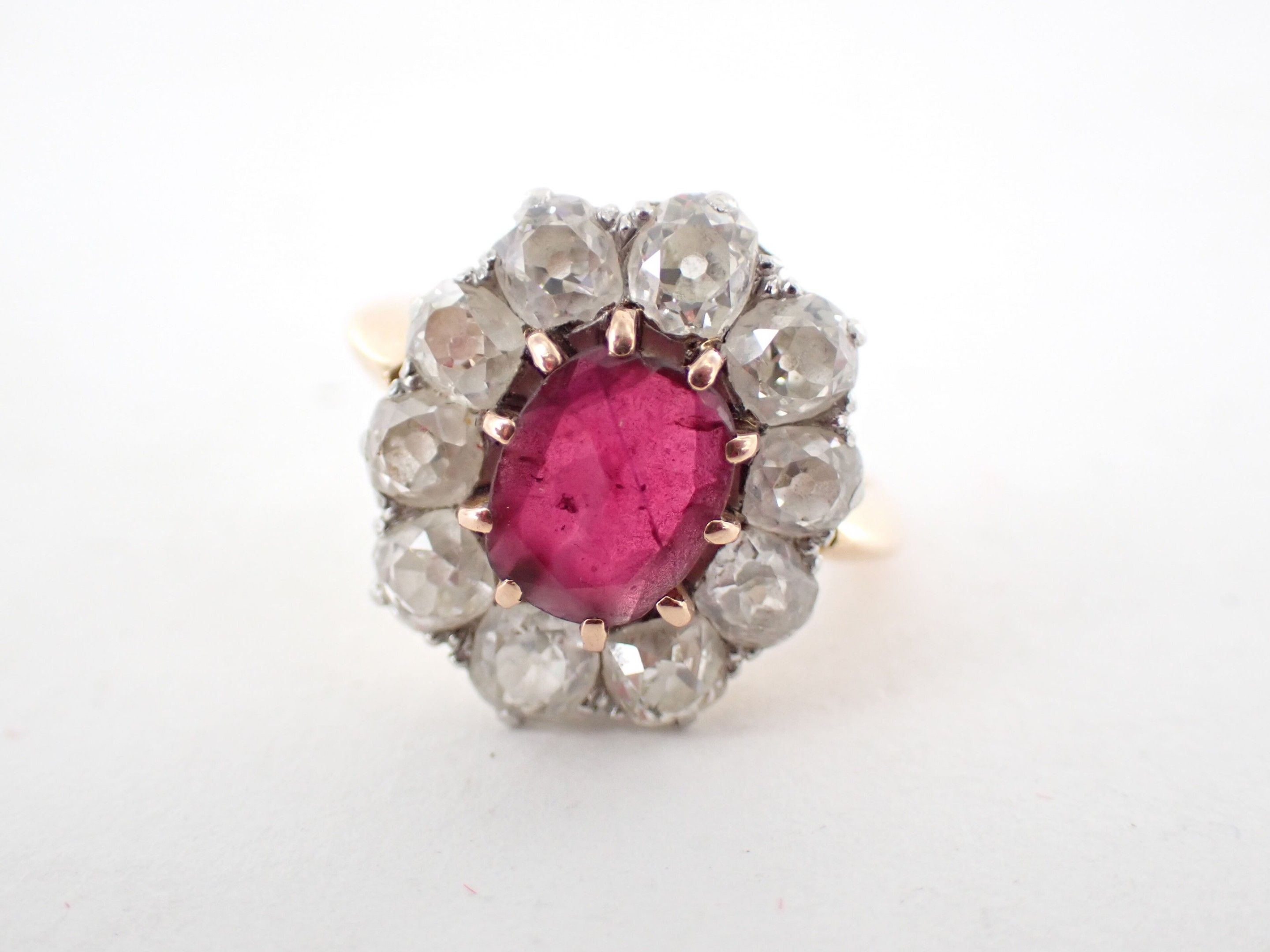 Ring in 750 thousandths gold with a central oval ruby in a setting of ten round old-cut diamonds. TDD: 53.5. Gross weight: 5.8 g. (Chipped and missing)
