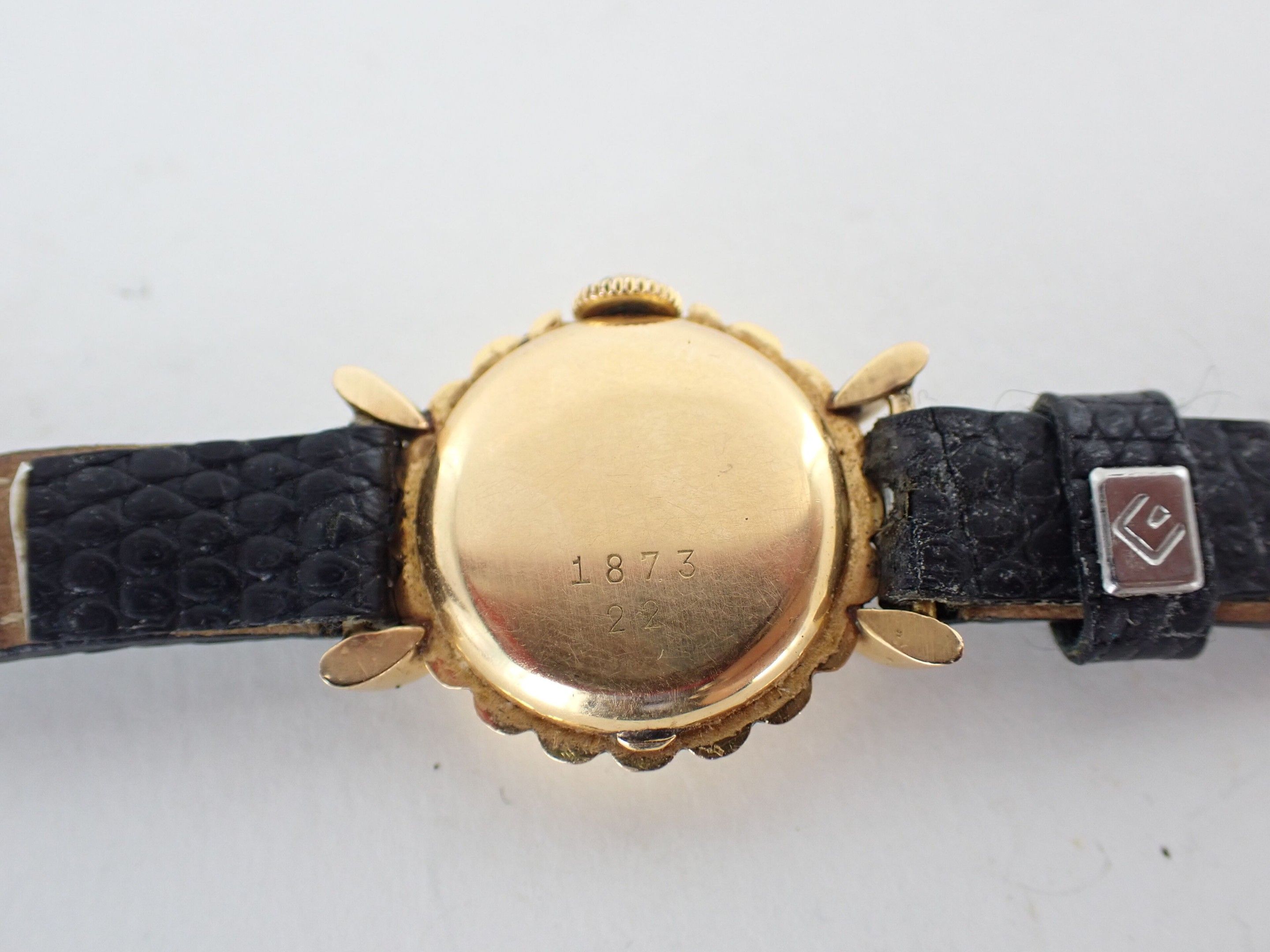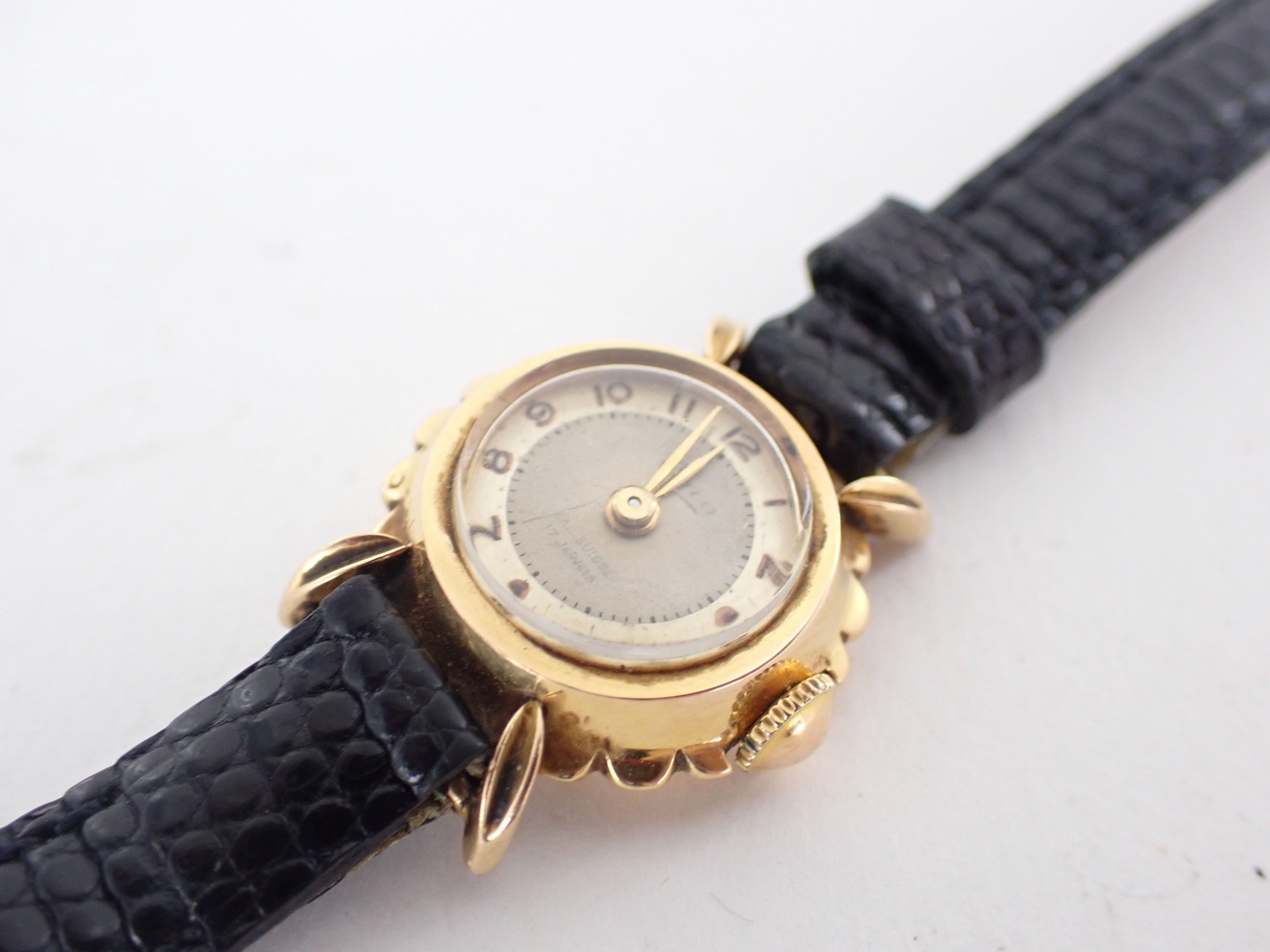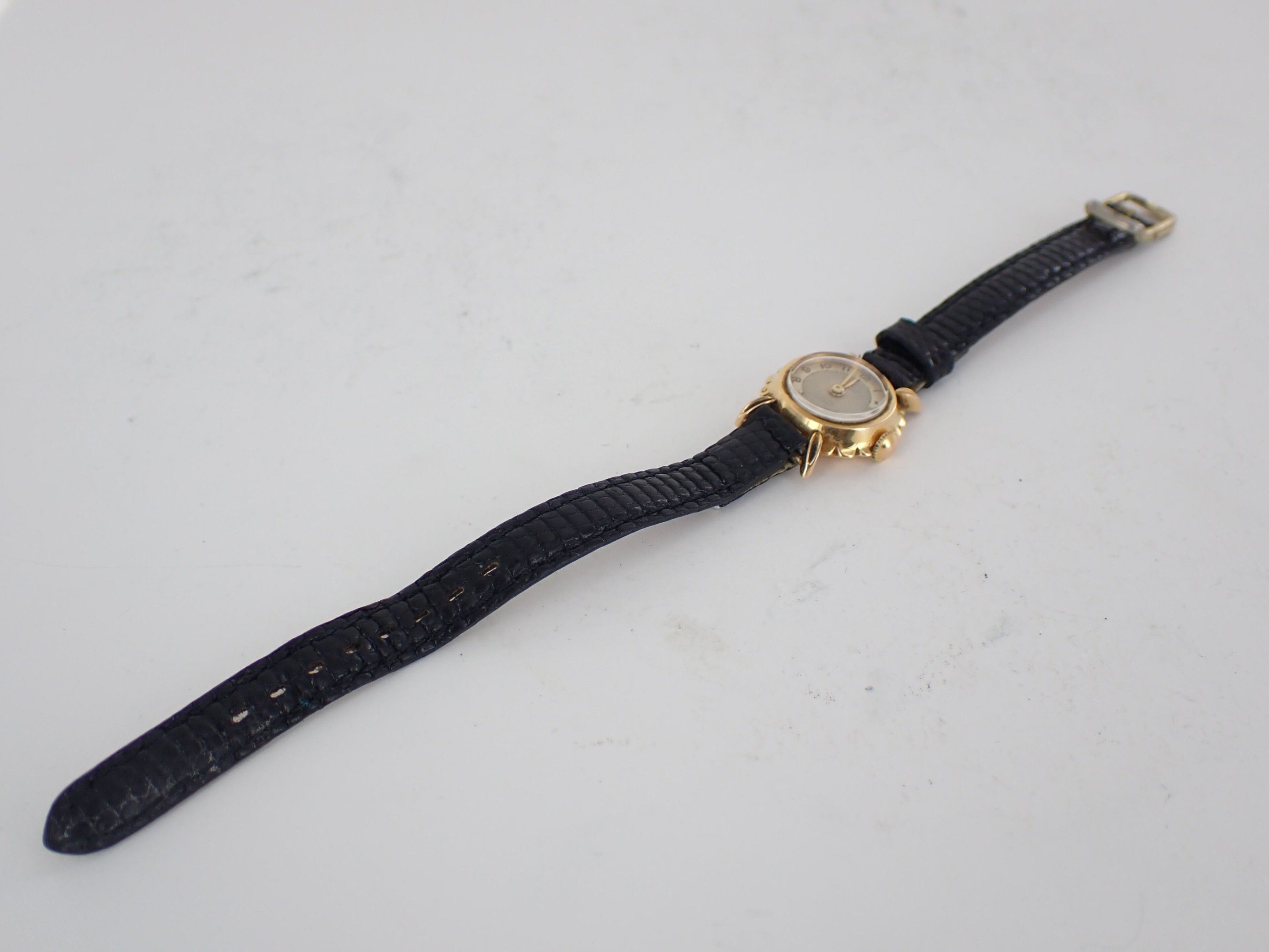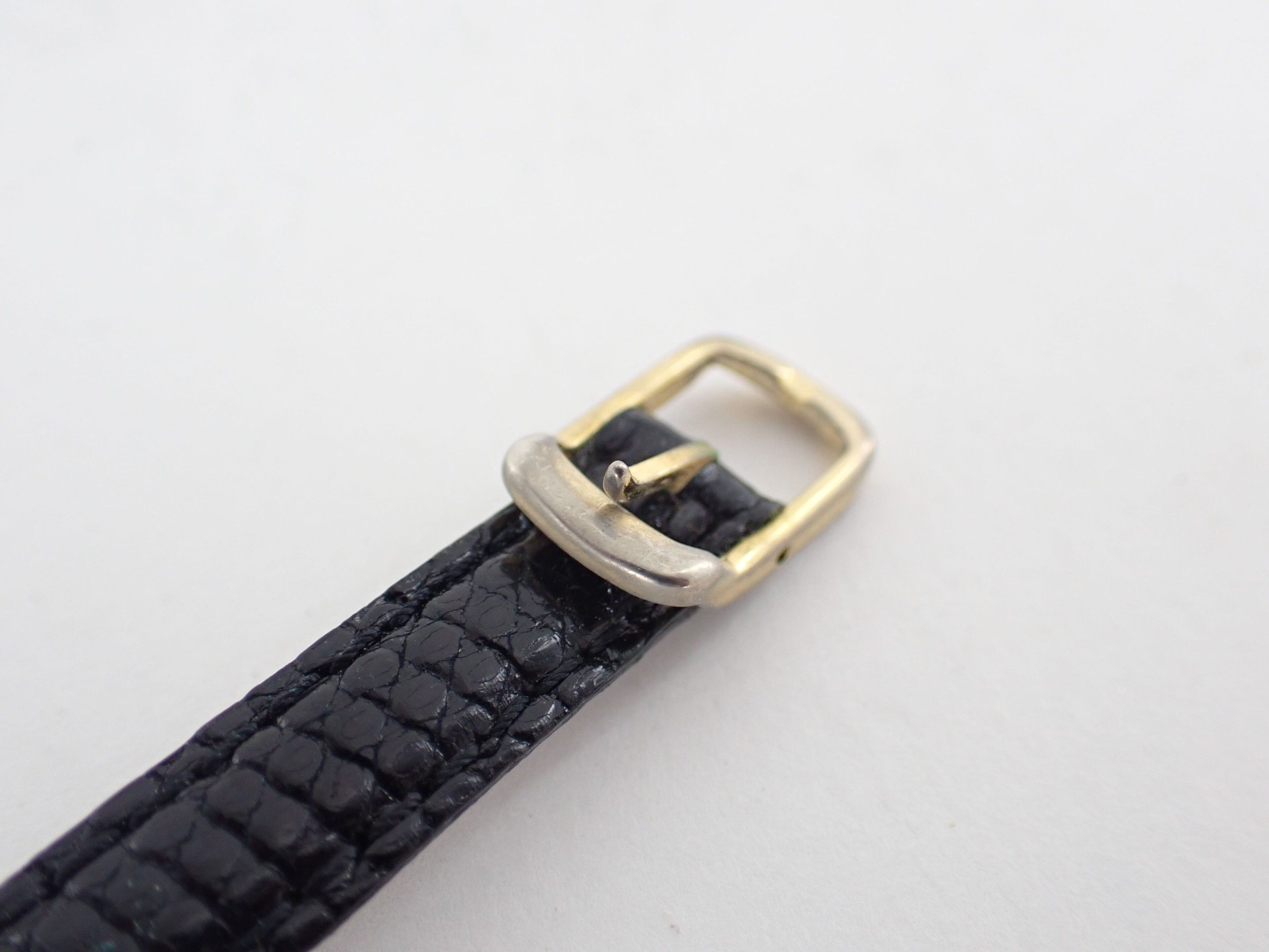 Ladies' watch in 18 carat yellow gold, circa 1950, mechanical movement, dial signed ENO, black leather strap. Gross weight 11.2 g.
