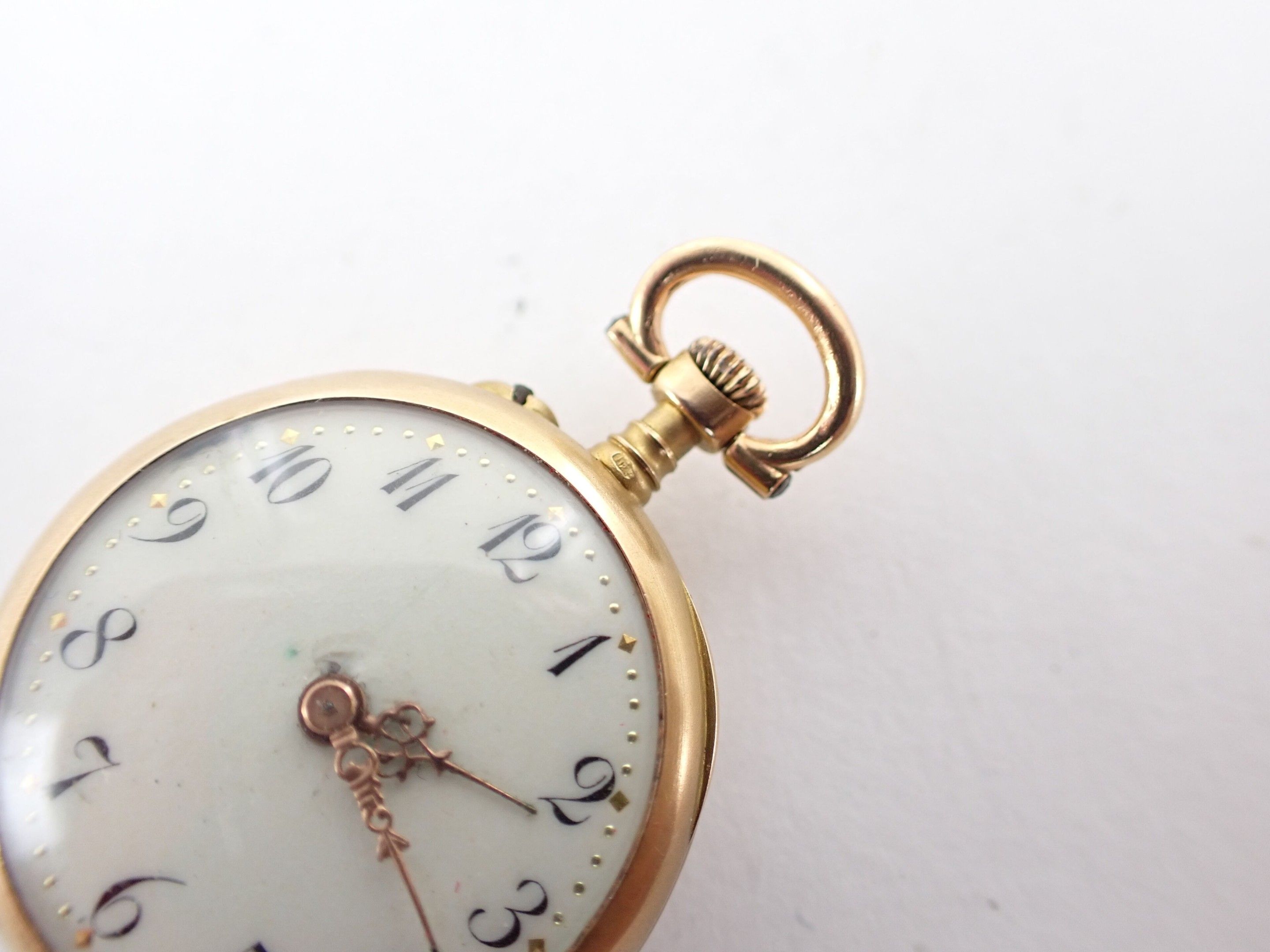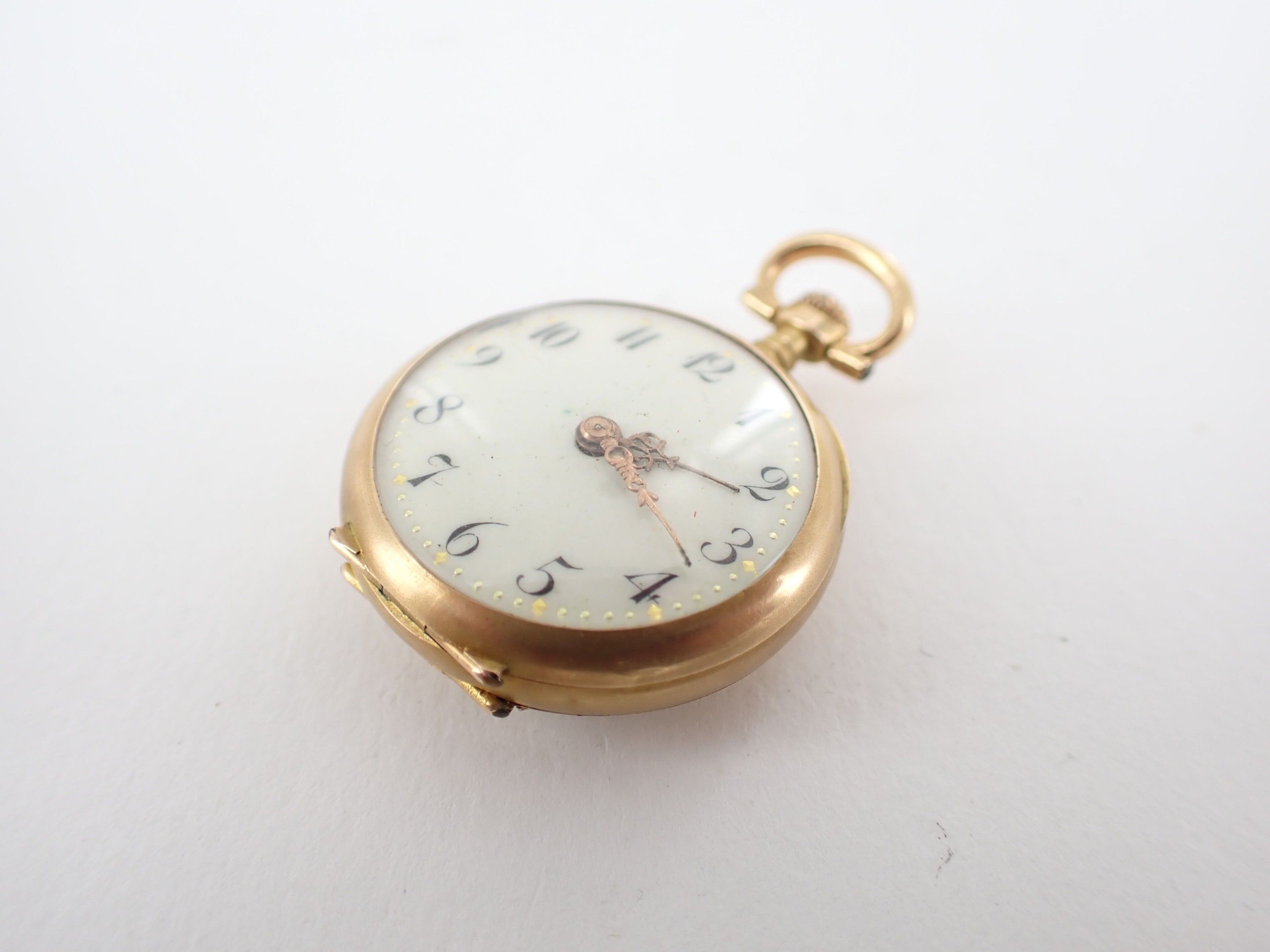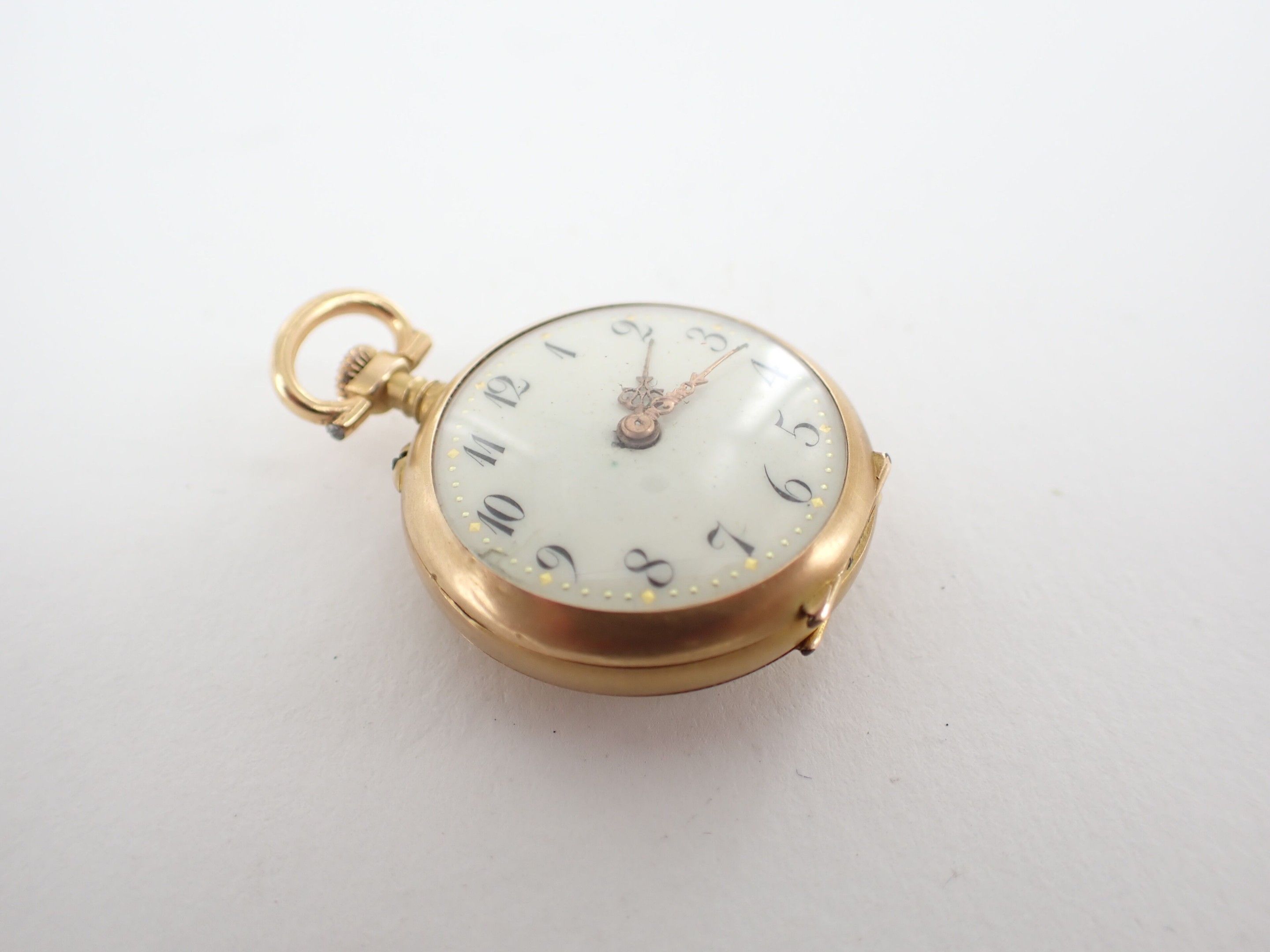 Collar watch in 18 carat yellow gold, circa 1900. White enamelled dial with Arabic numerals. Back decorated in relief with a flower. Wear and tear. Diameter: 25 mm - Gross weight: 15.2 g.