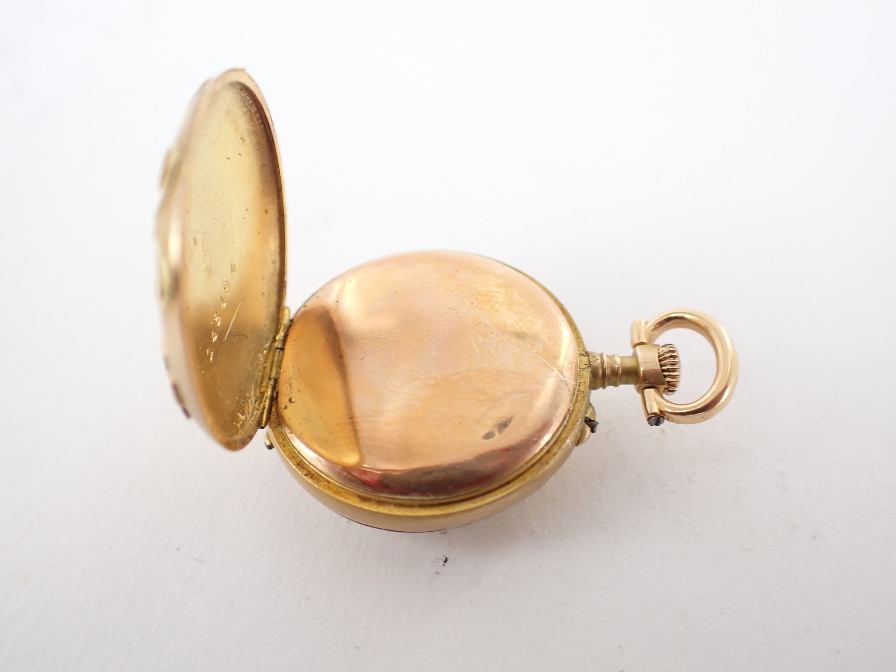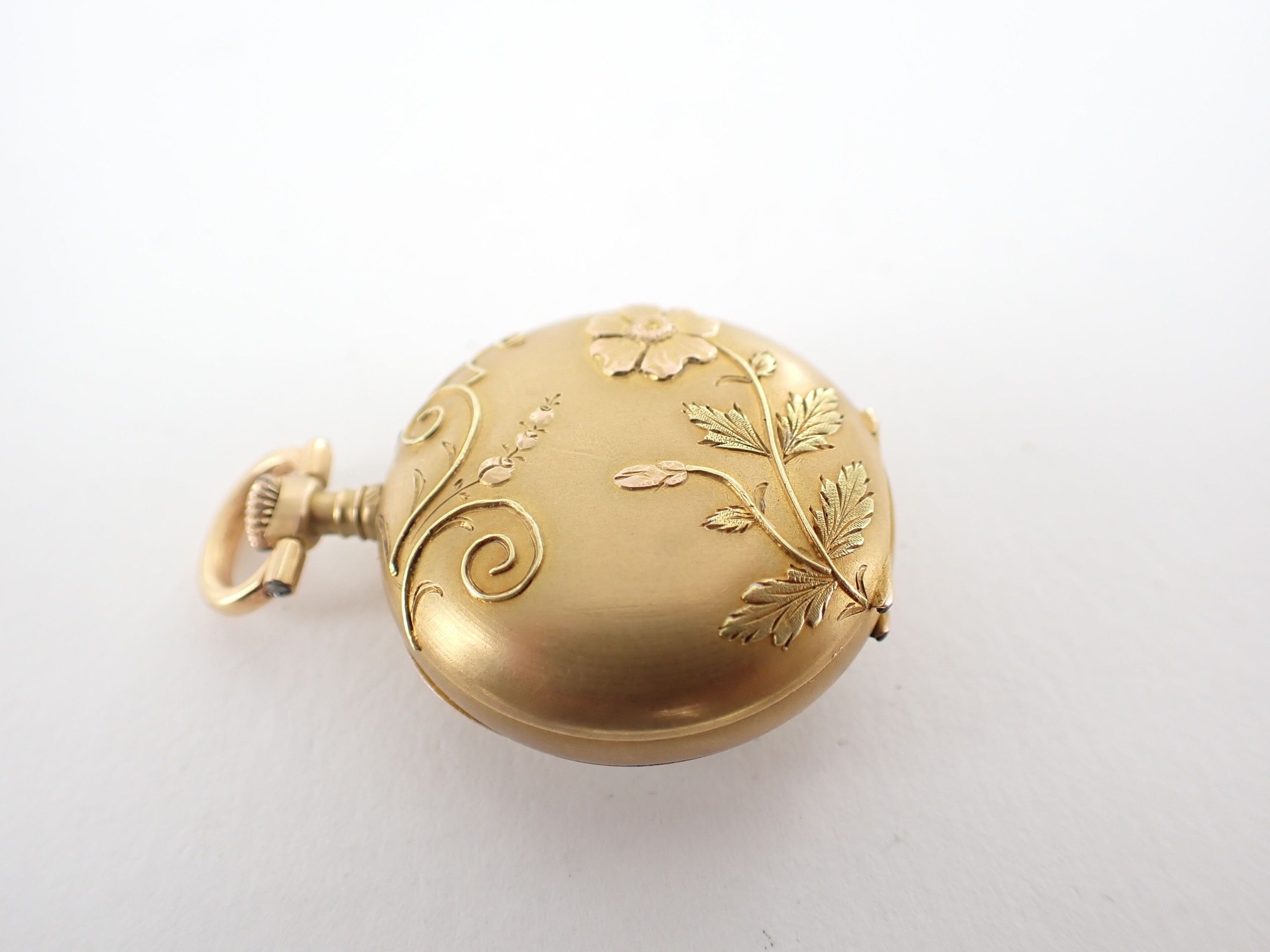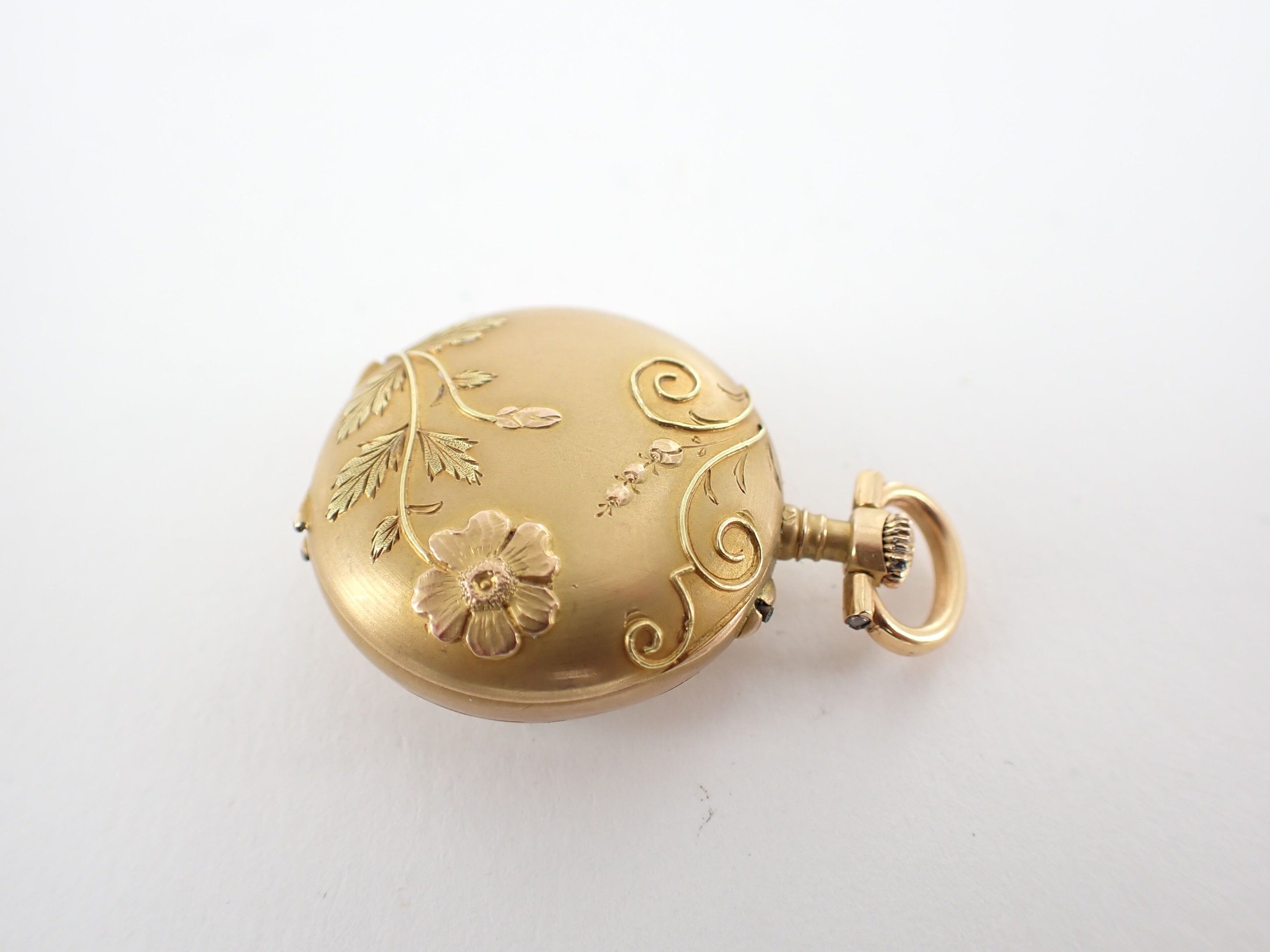Collar watch in 18 carat yellow gold, circa 1900. White enamelled dial with Arabic numerals. Back decorated in relief with a flower. Wear and tear. Diameter: 25 mm - Gross weight: 15.2 g.