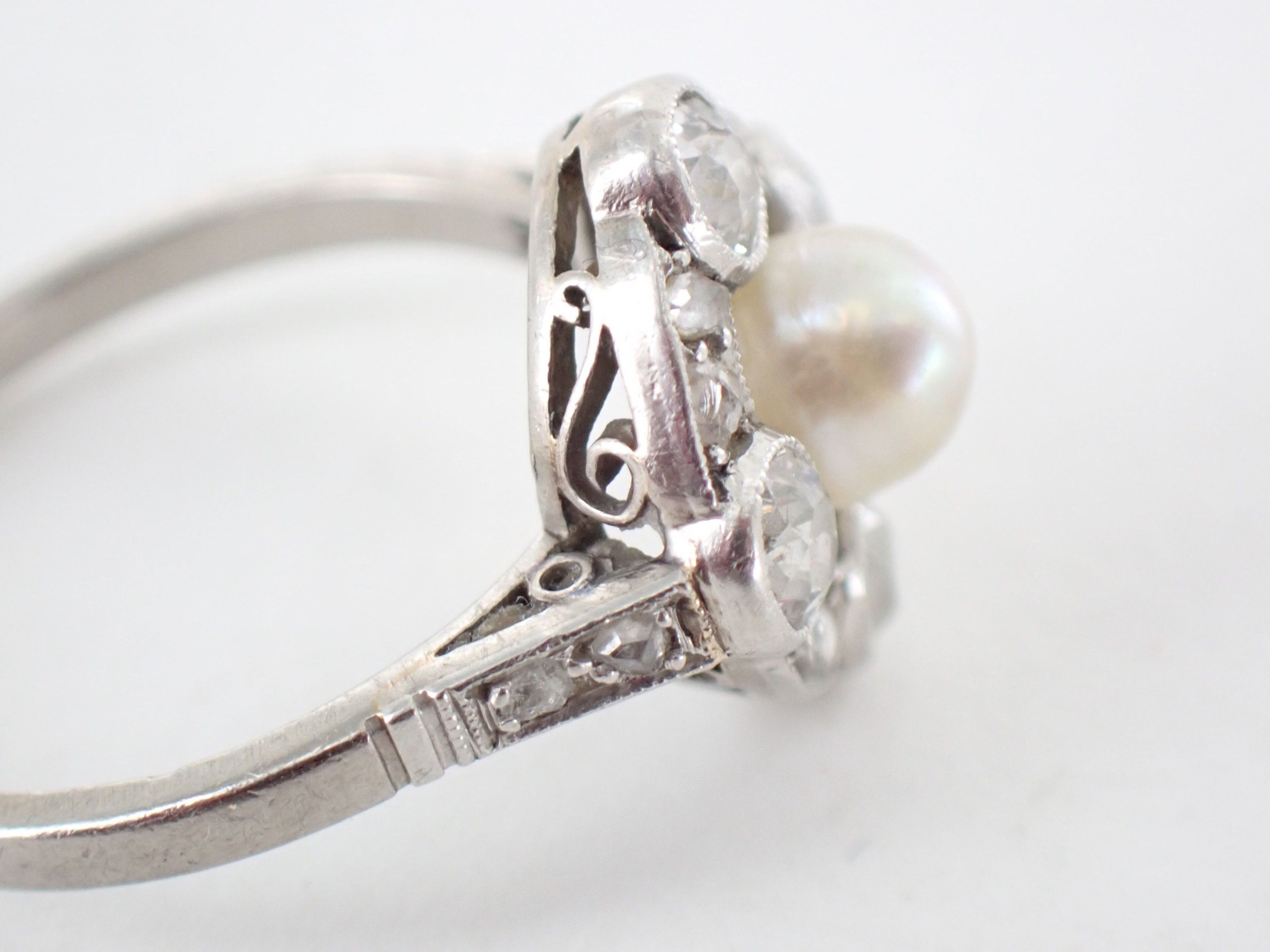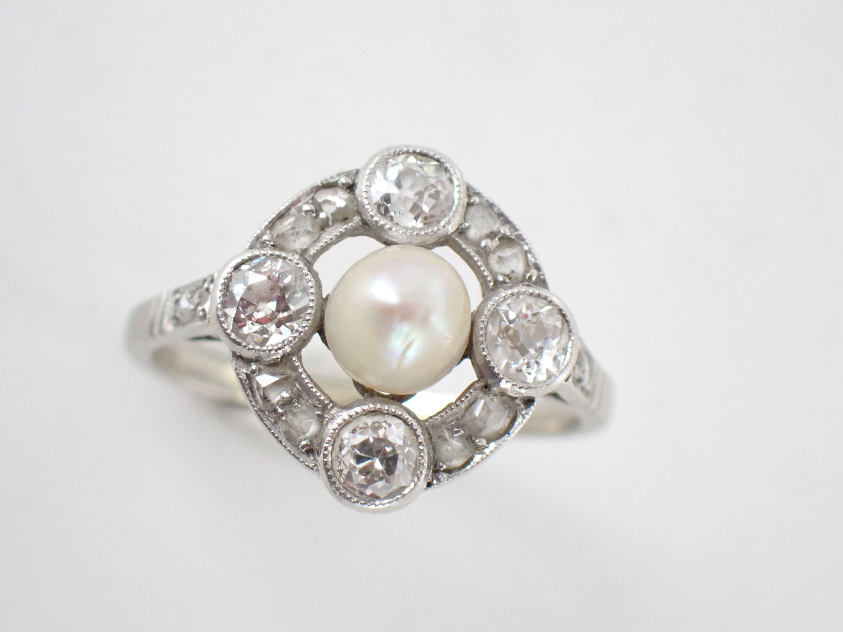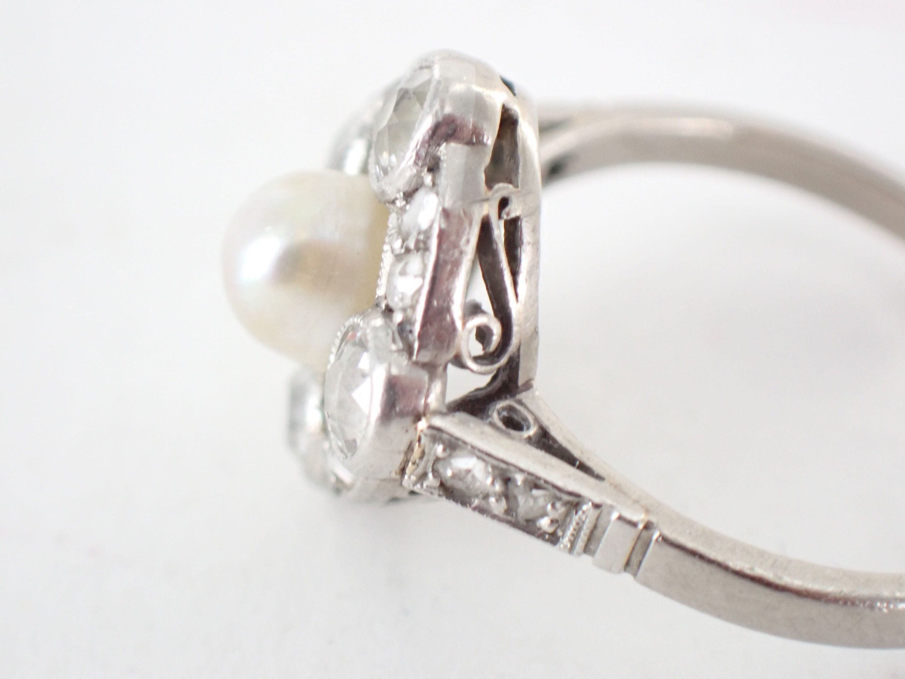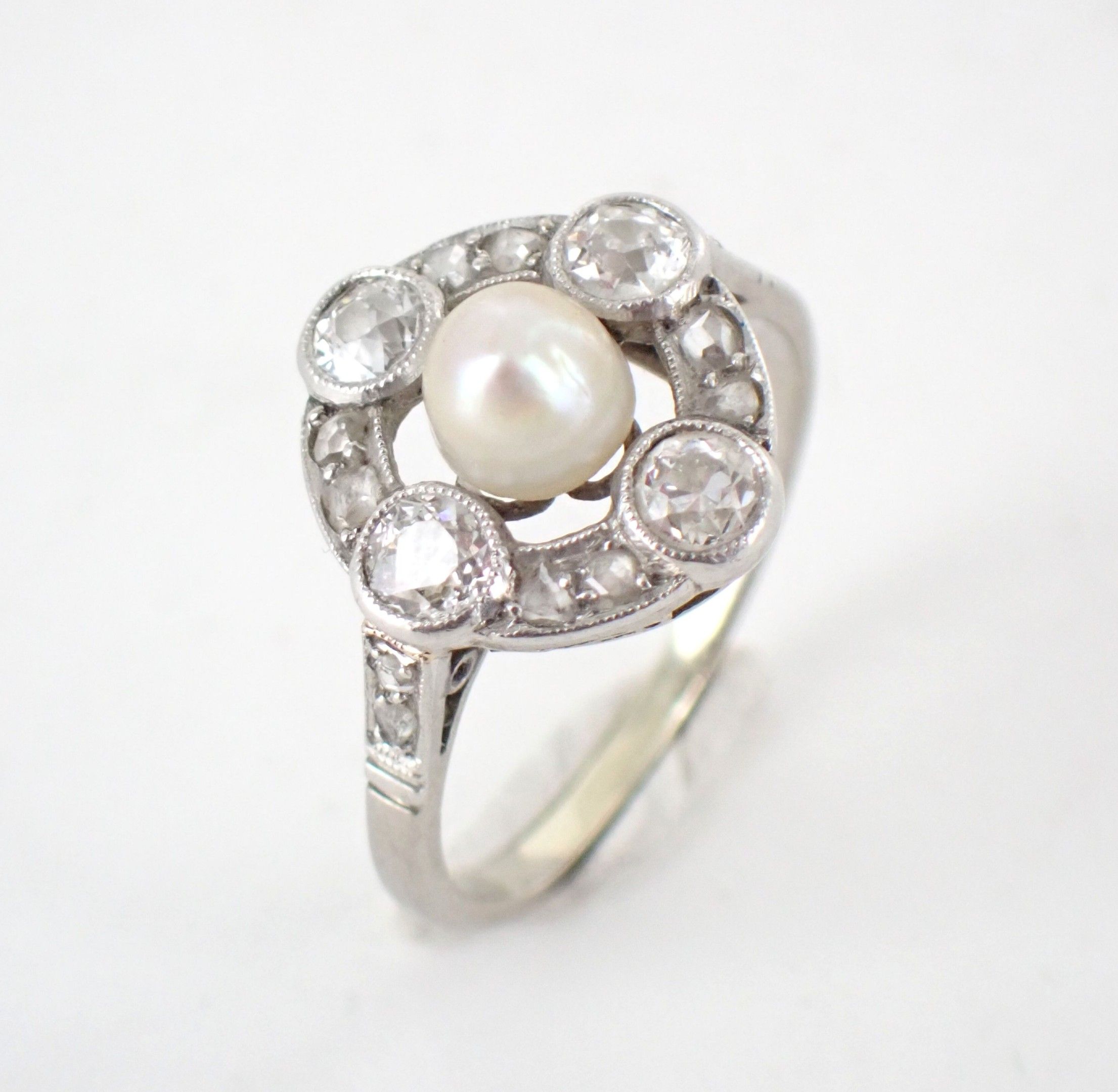 Ring in 750 thousandths white gold with a central fine or cultured pearl set in rose-cut diamonds, four of which are larger, round, old-cut or brilliant-cut. Worked around 1910. Pearl diameter: approx. 5.00/5.50 mm. TDD : 54. Gross weight: 3.9 g (Wear)