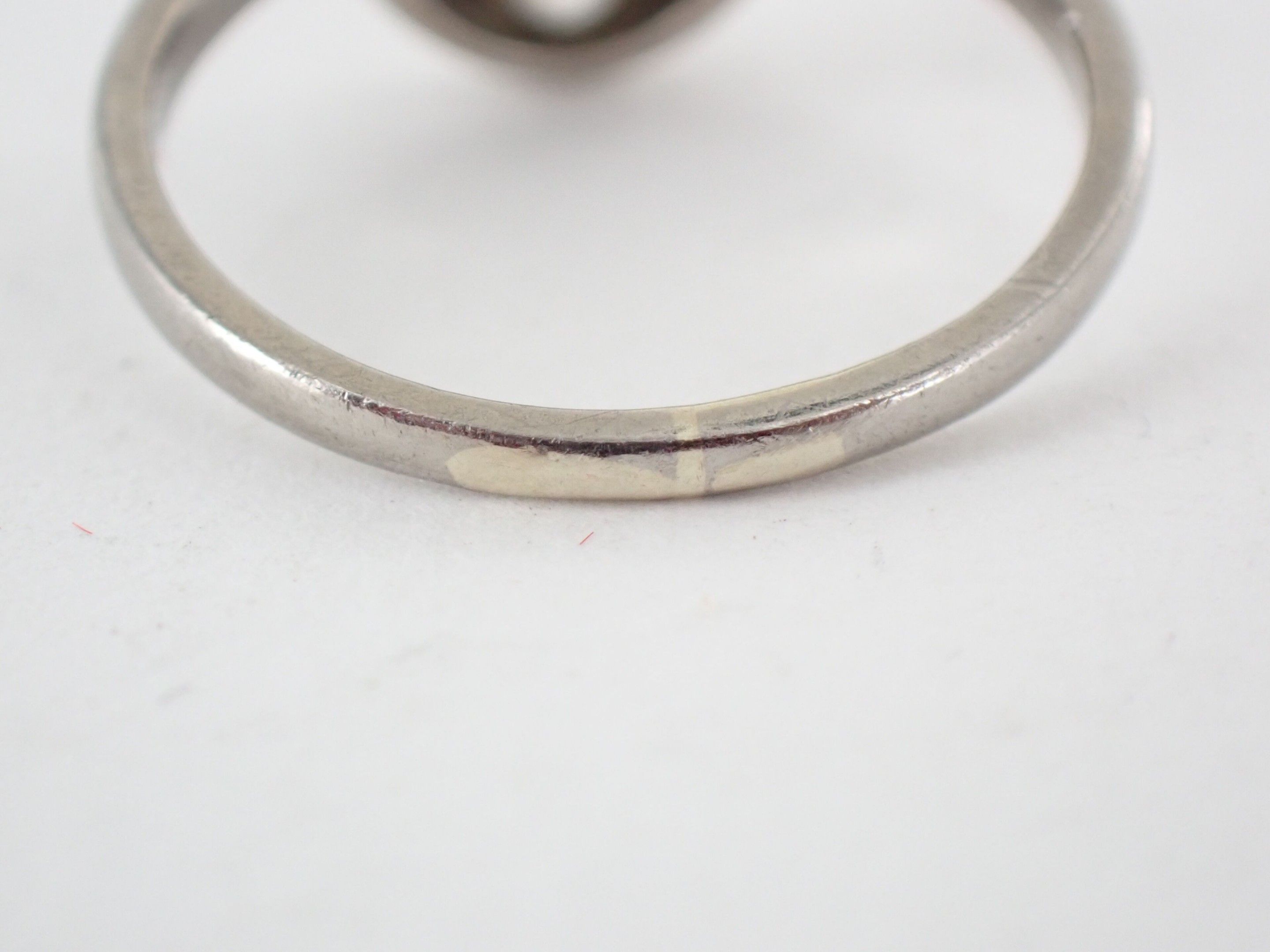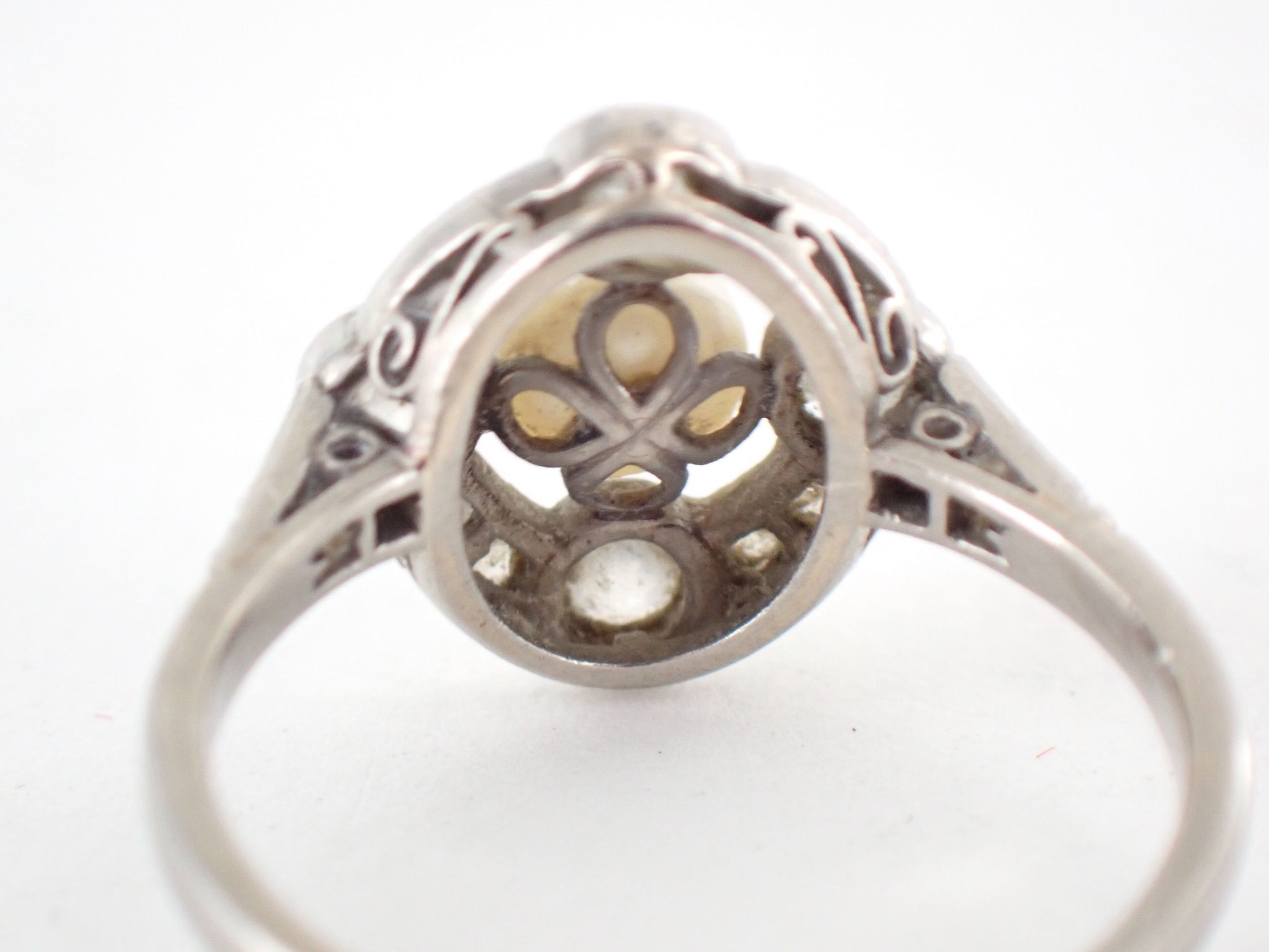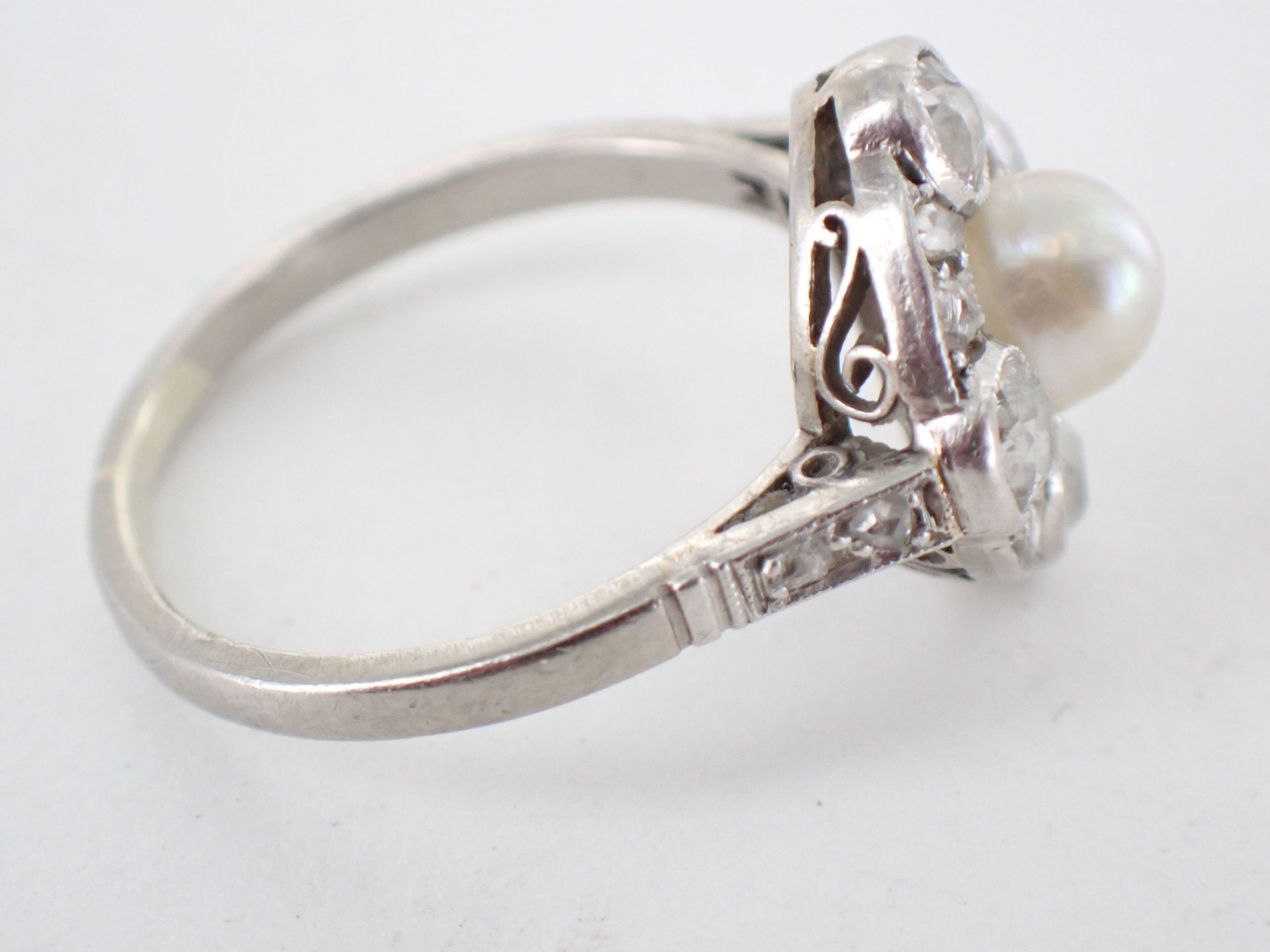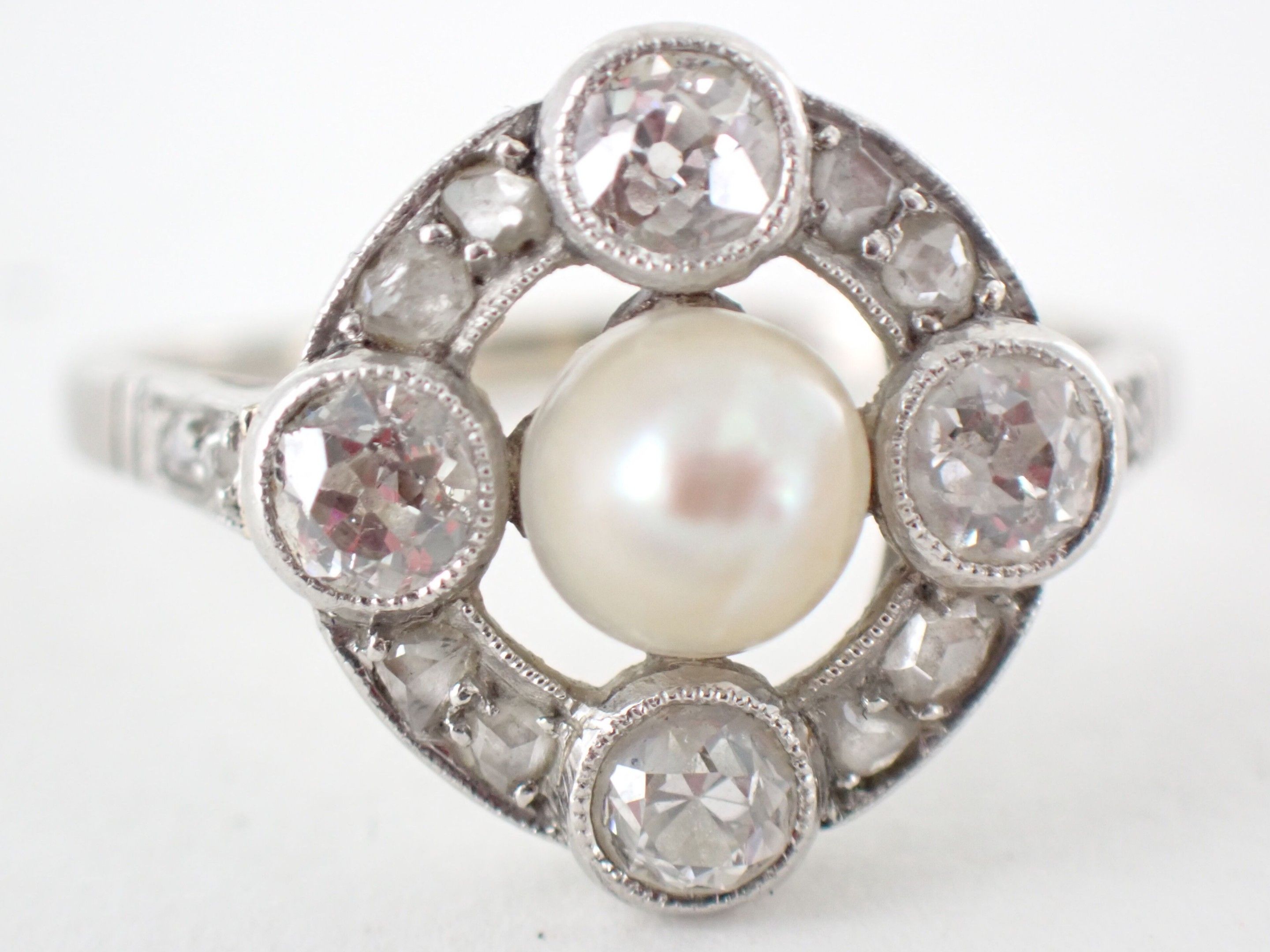Ring in 750 thousandths white gold with a central fine or cultured pearl set in rose-cut diamonds, four of which are larger, round, old-cut or brilliant-cut. Worked around 1910. Pearl diameter: approx. 5.00/5.50 mm. TDD : 54. Gross weight: 3.9 g (Wear)