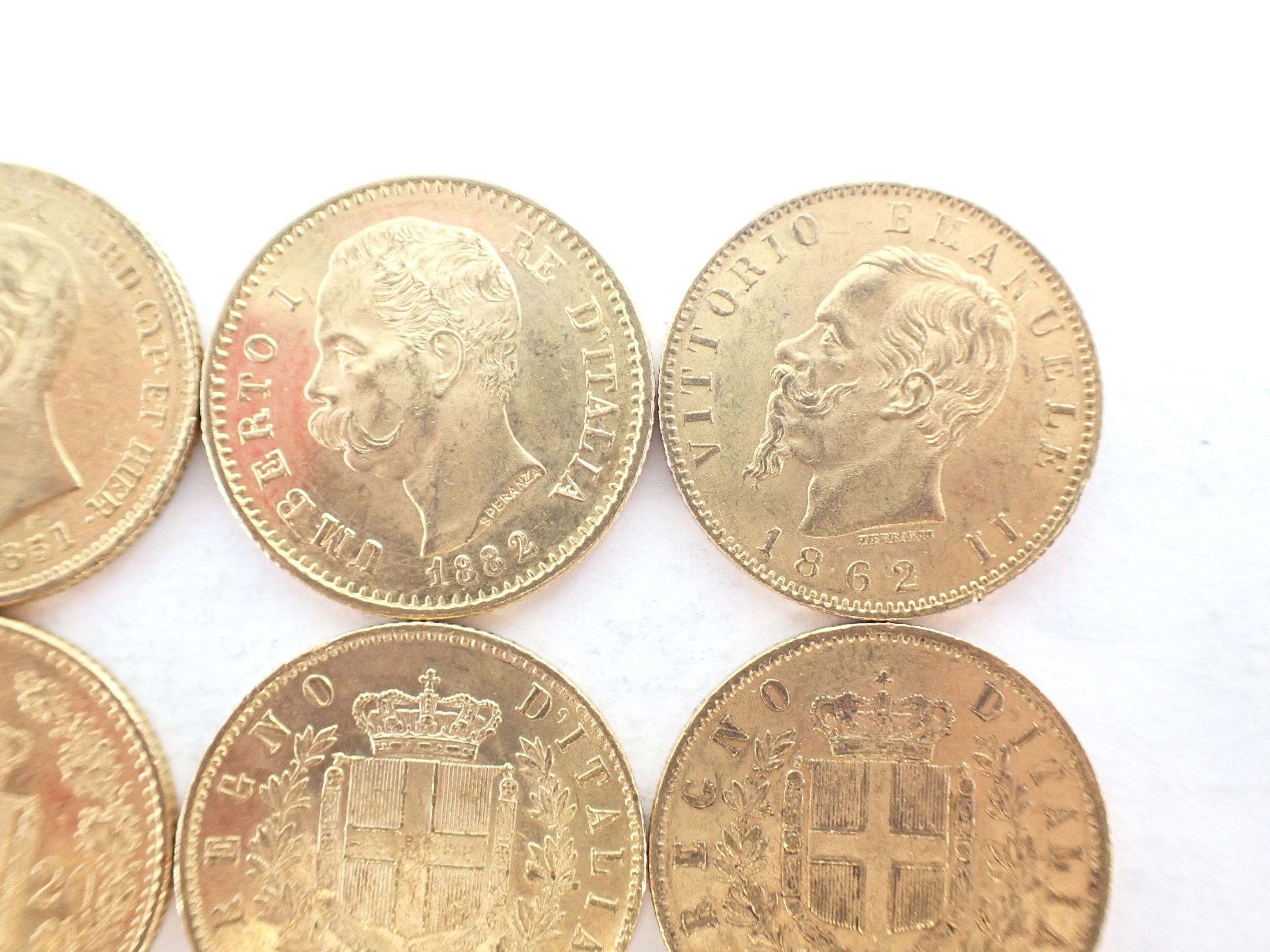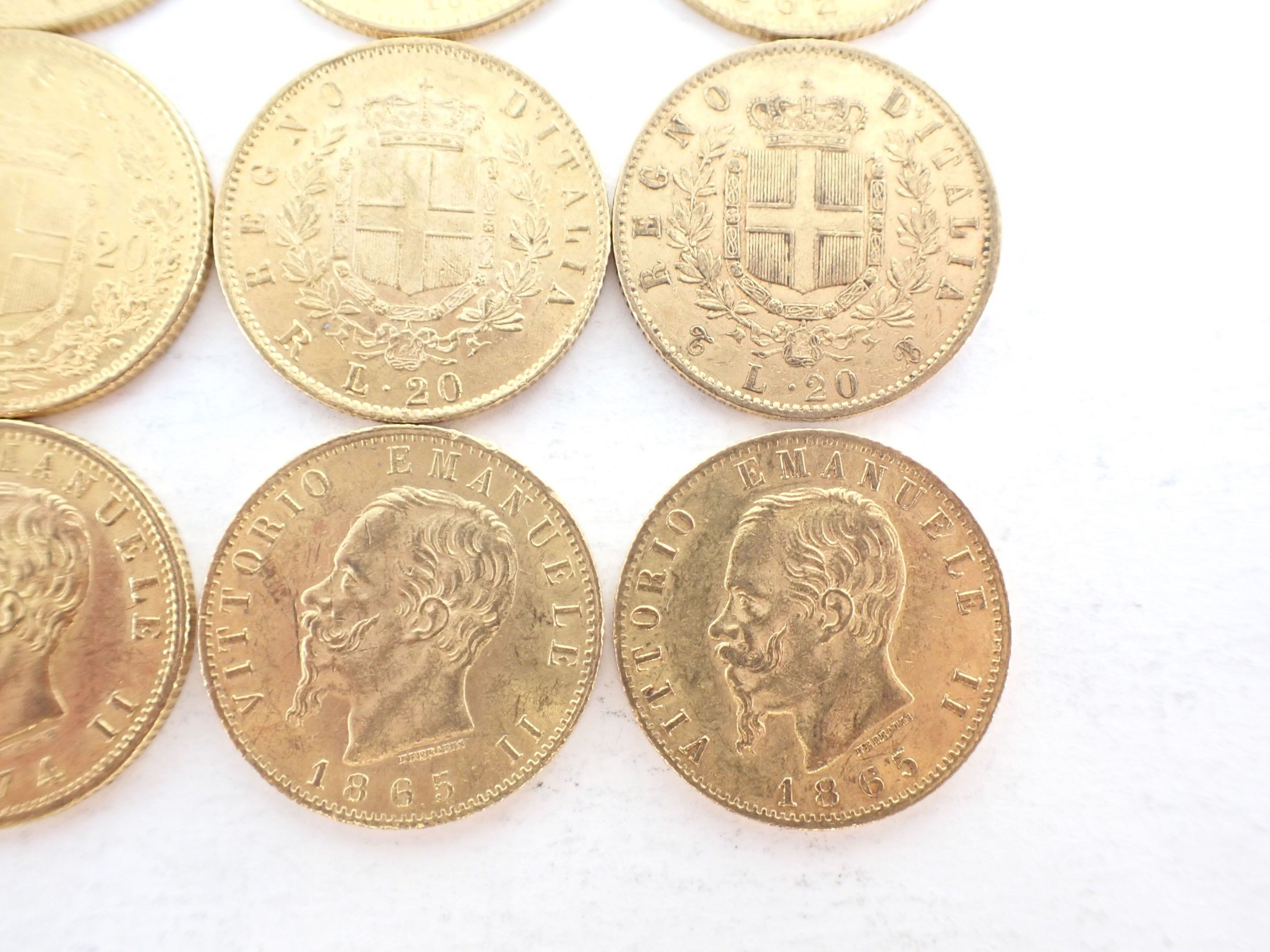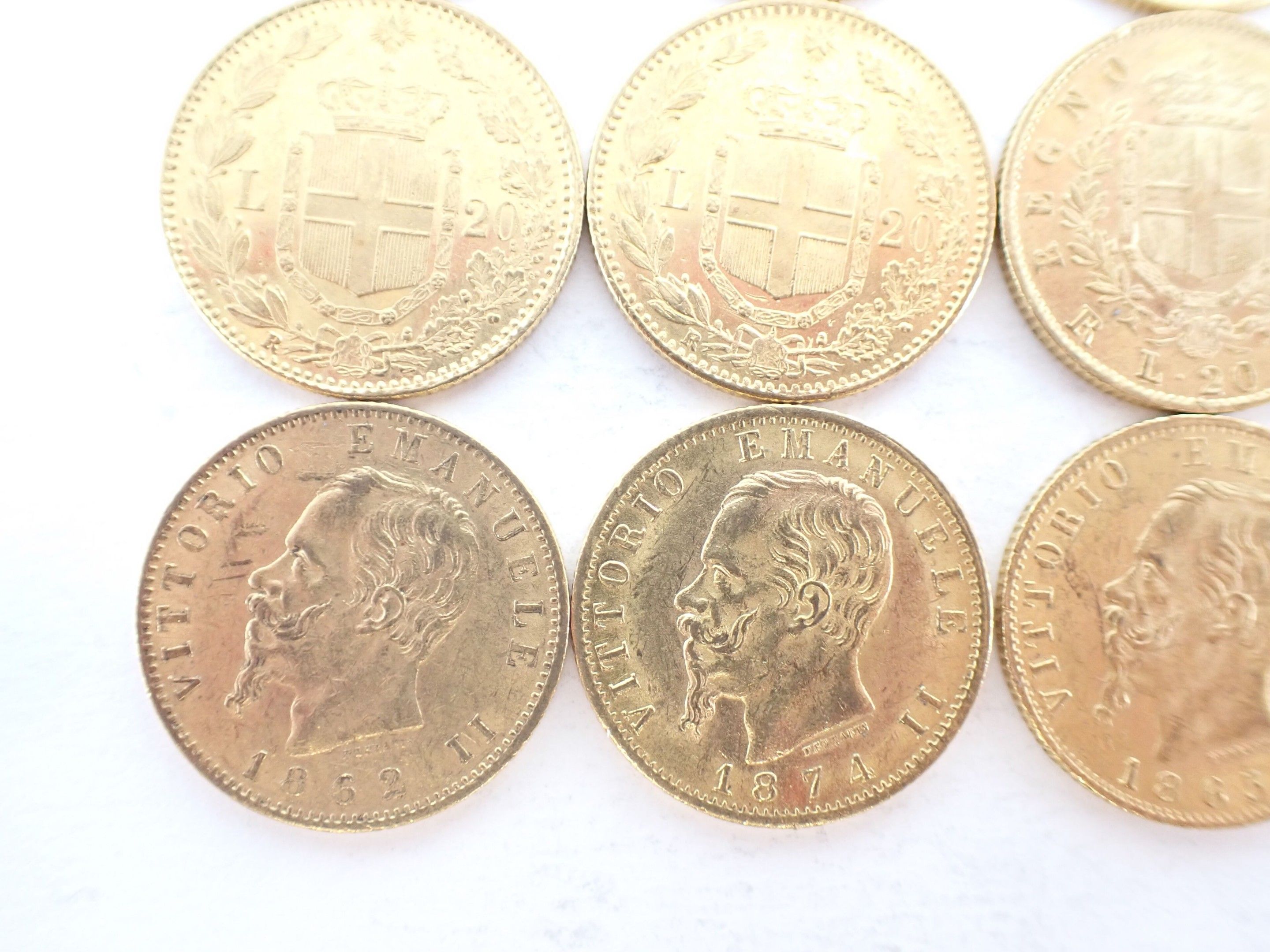 12 gold 20 lira coins comprising: 7 gold 20 lira Vittorio Em…