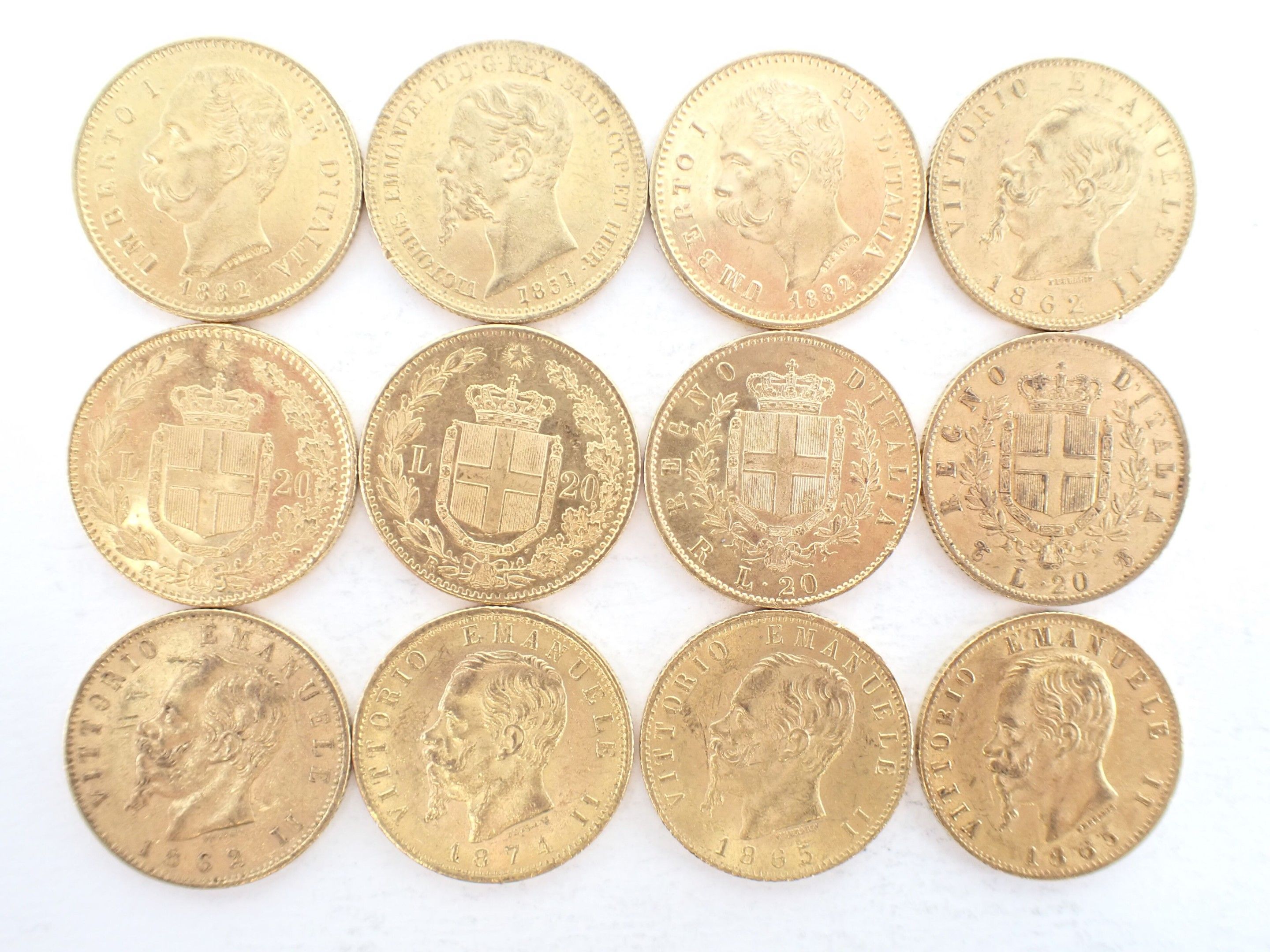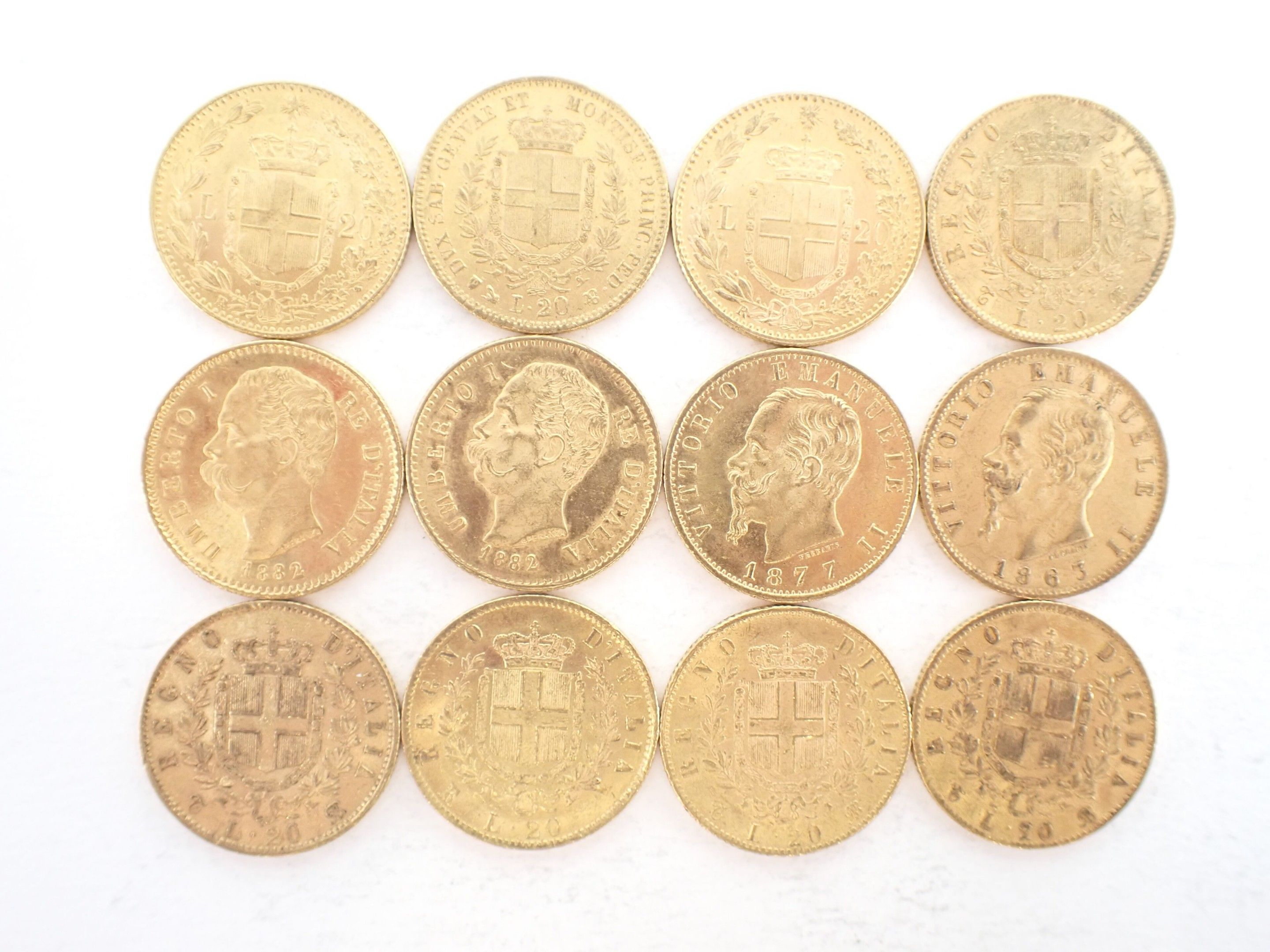 12 gold 20 lira coins comprising: 7 gold 20 lira Vittorio Emmanuele coins + 5 gold 20 lira Umberto I Italy coins - Weight: 77.4 g