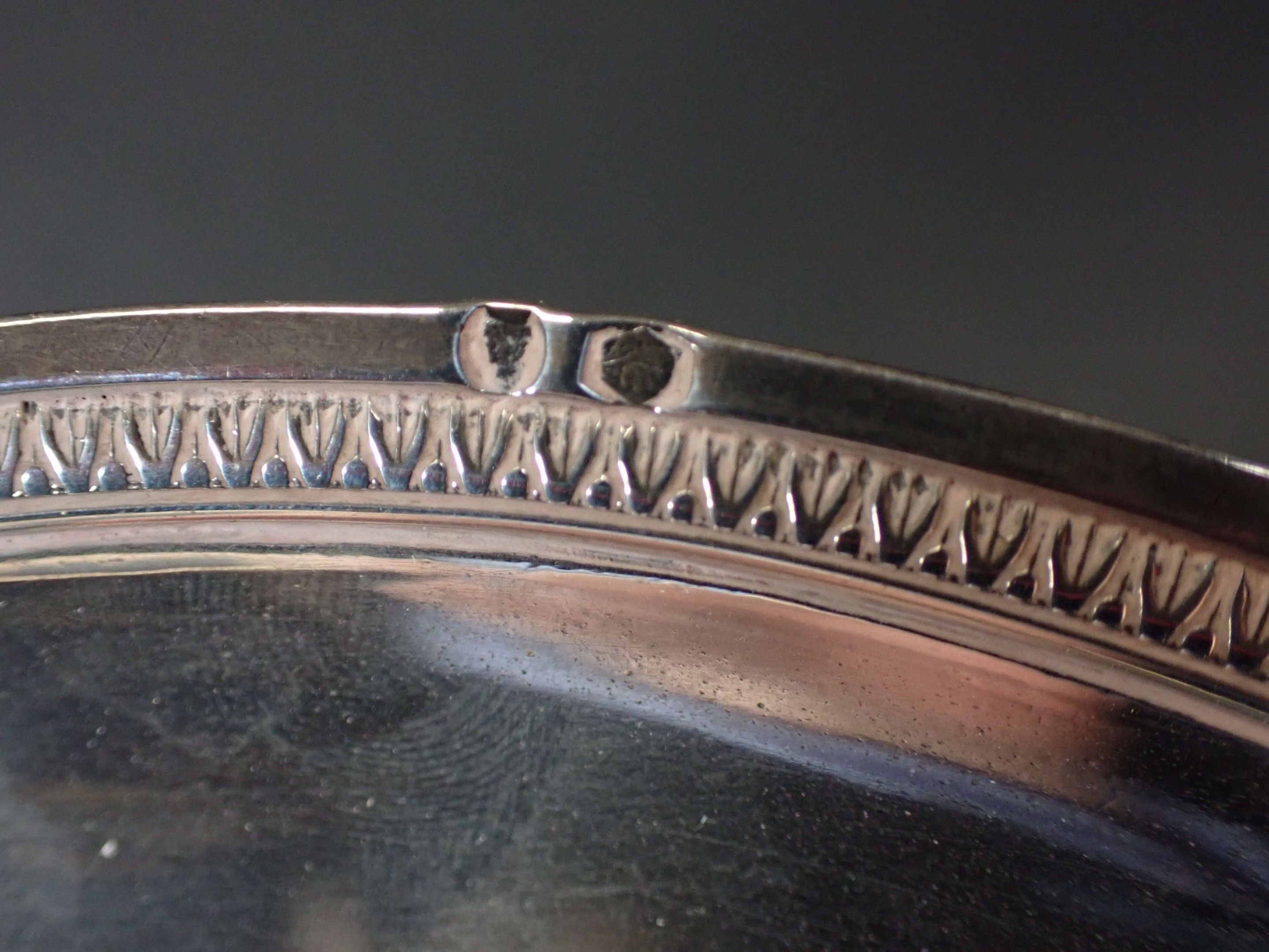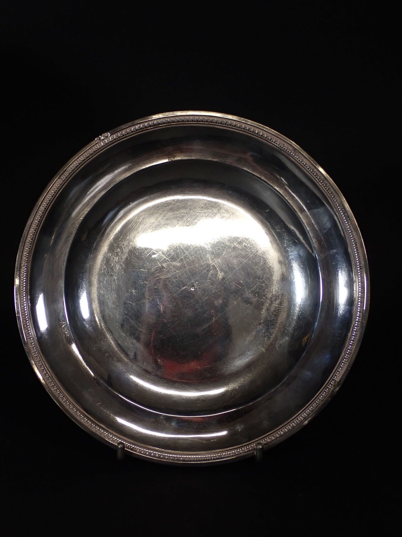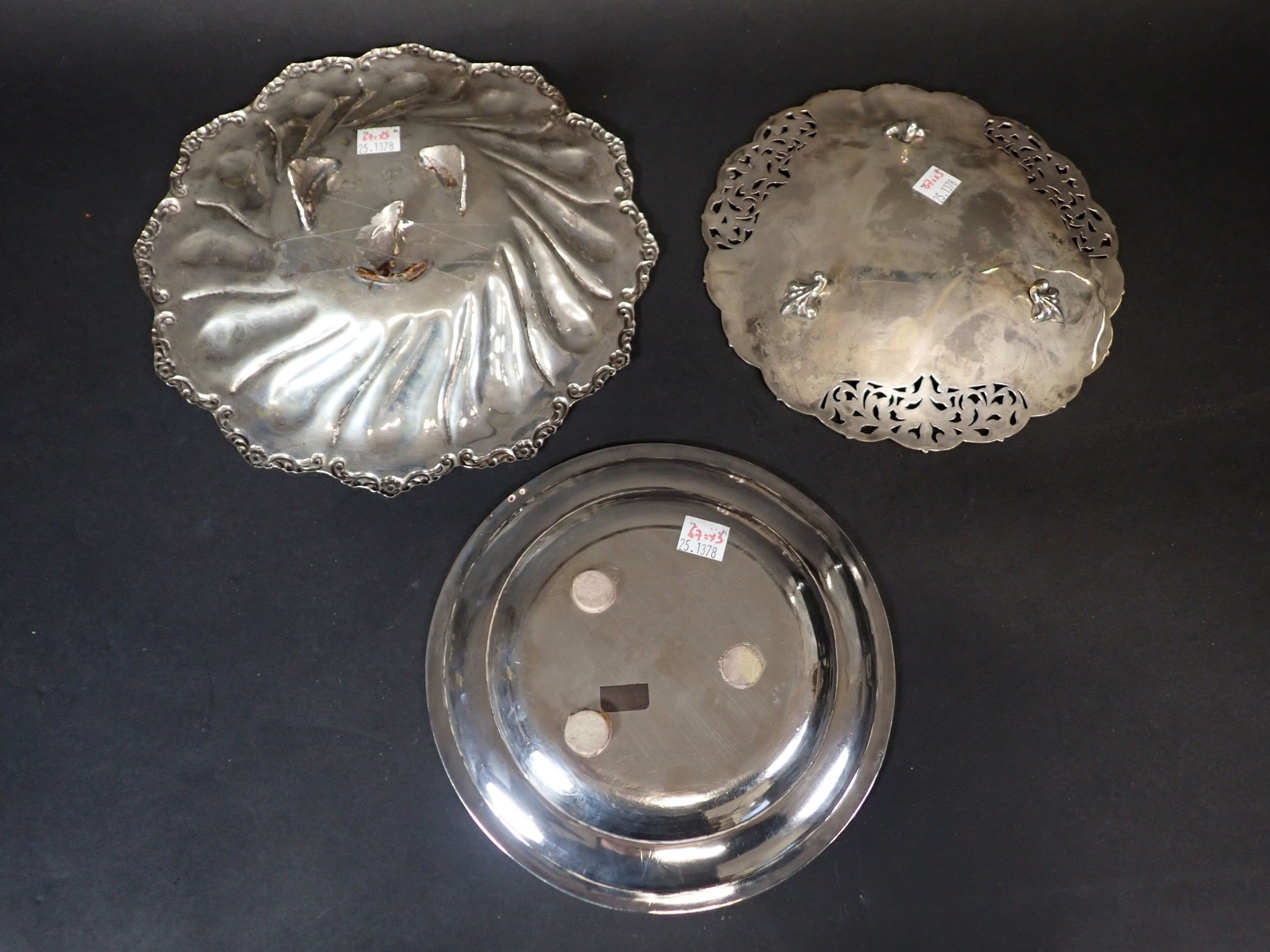 Set of three 800/1000 sterling silver dishes, two rococo in foreign silver and one with a frieze of oves - Diameters: 26 - 21 and 20 cm. Net weight: 700 g