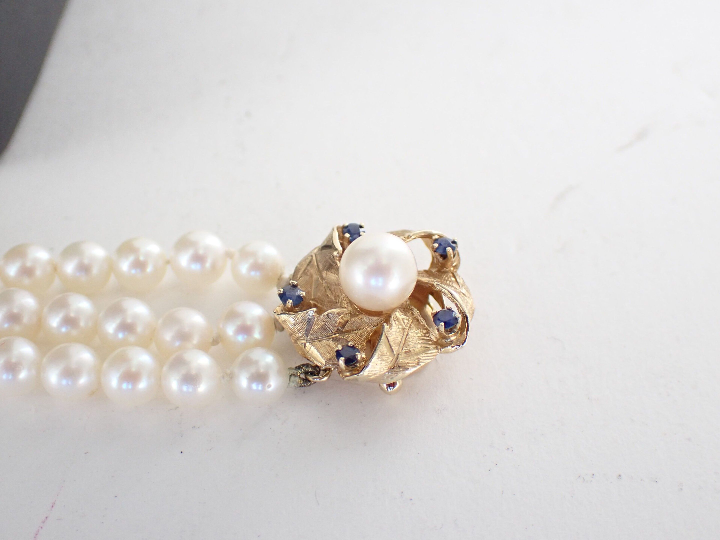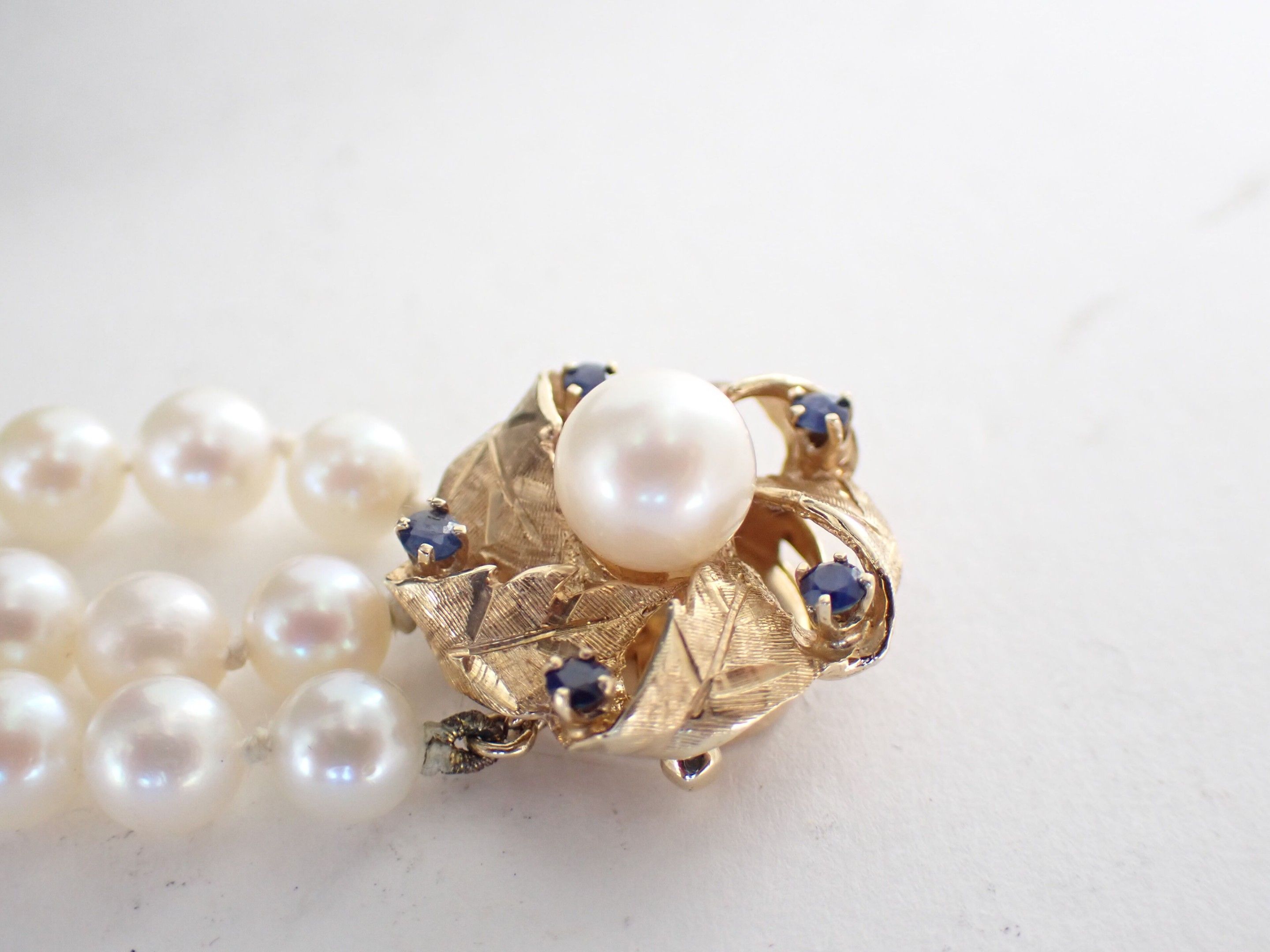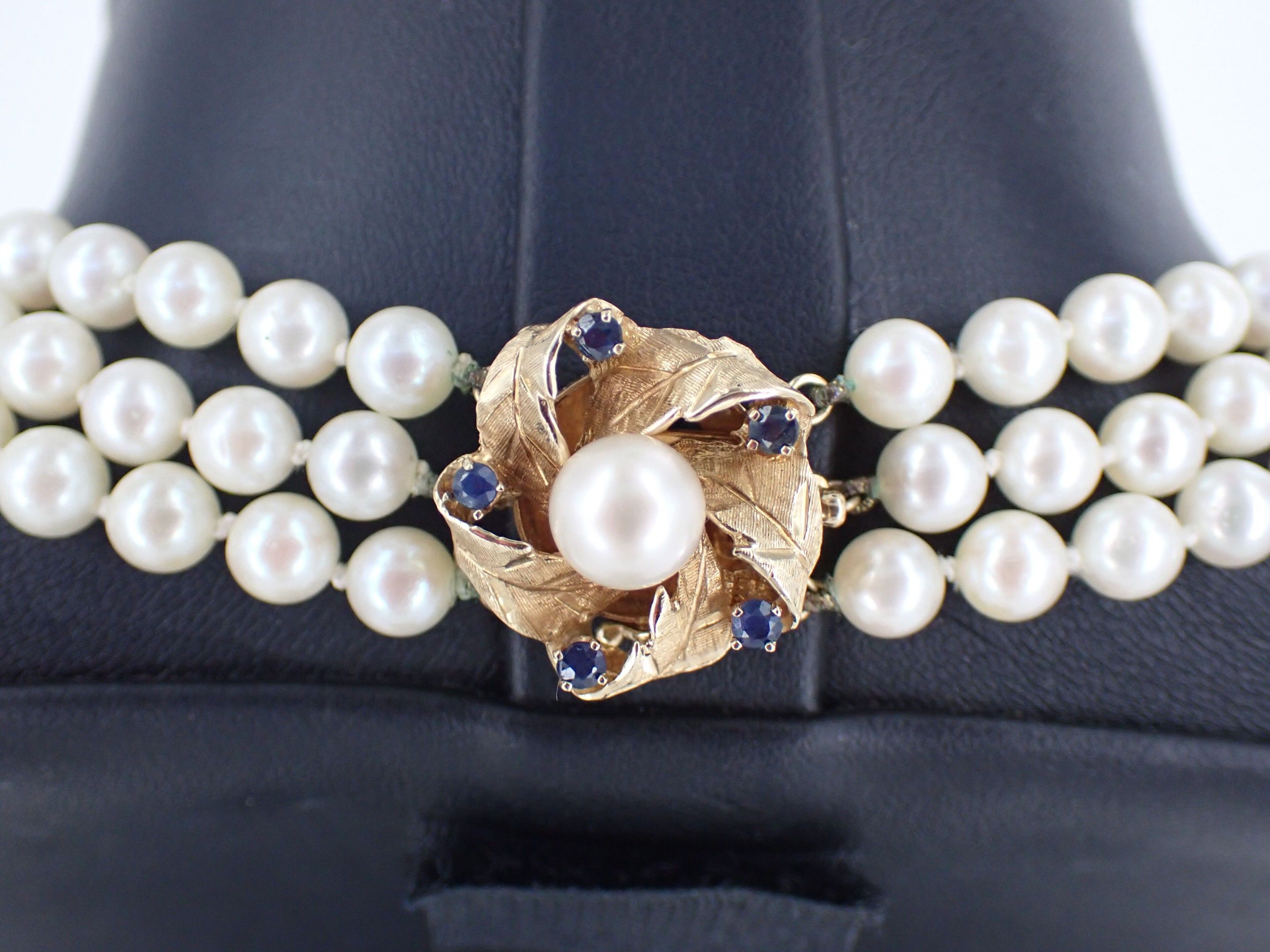 A necklace with three rows of cultured pearls, the circular gold clasp with foliate motifs set with five sapphires and a central pearl and A bracelet of the same design.