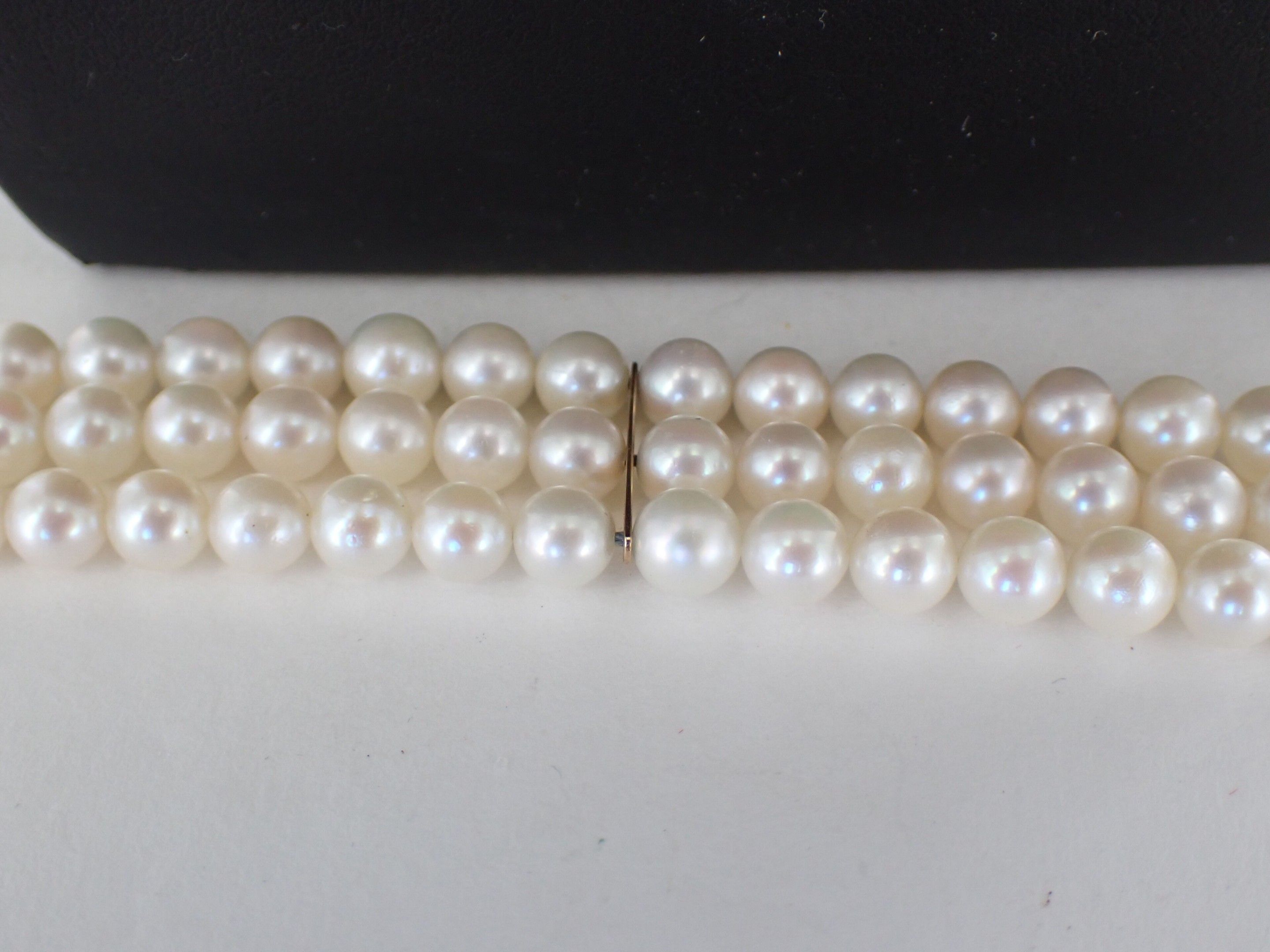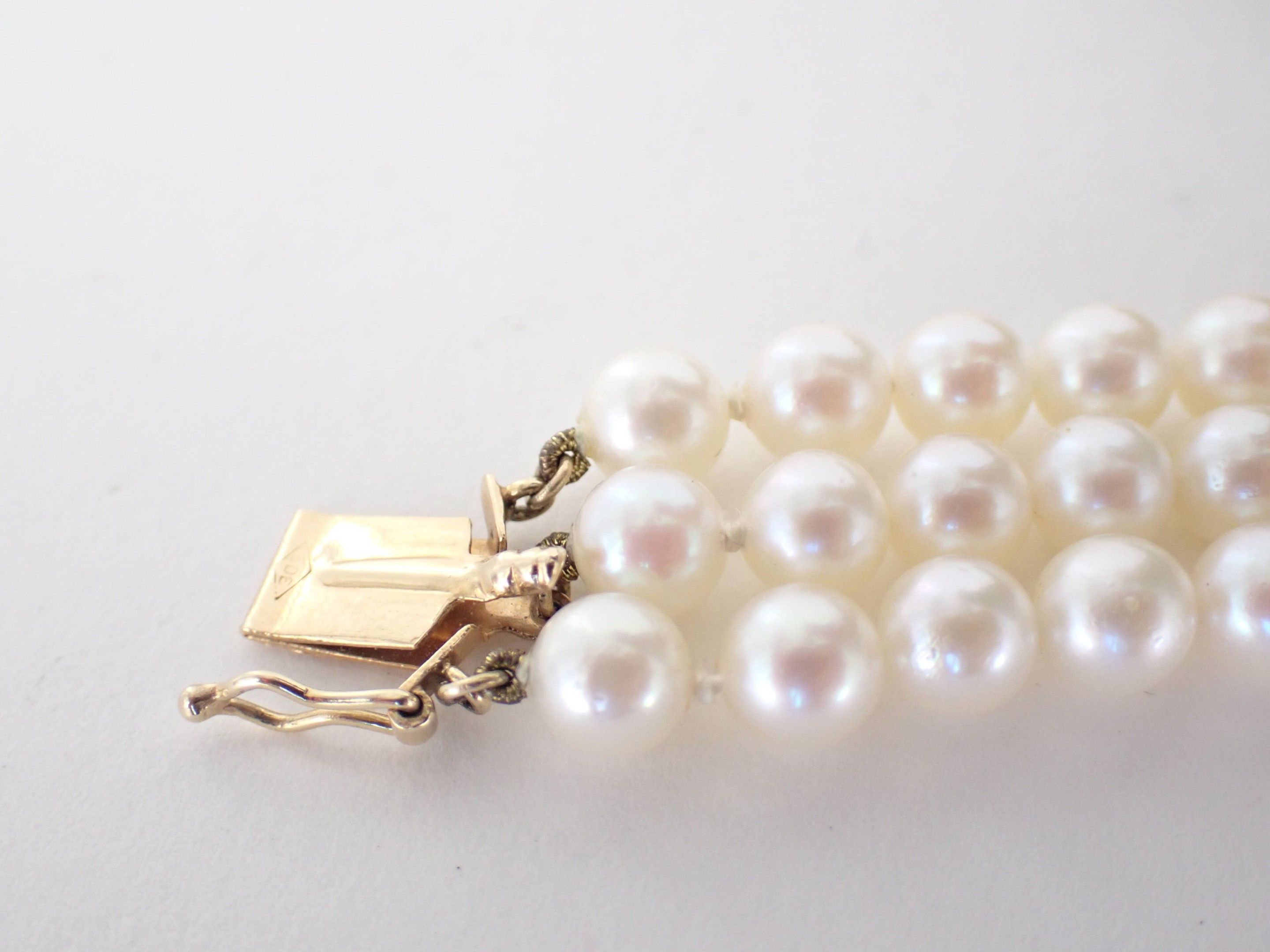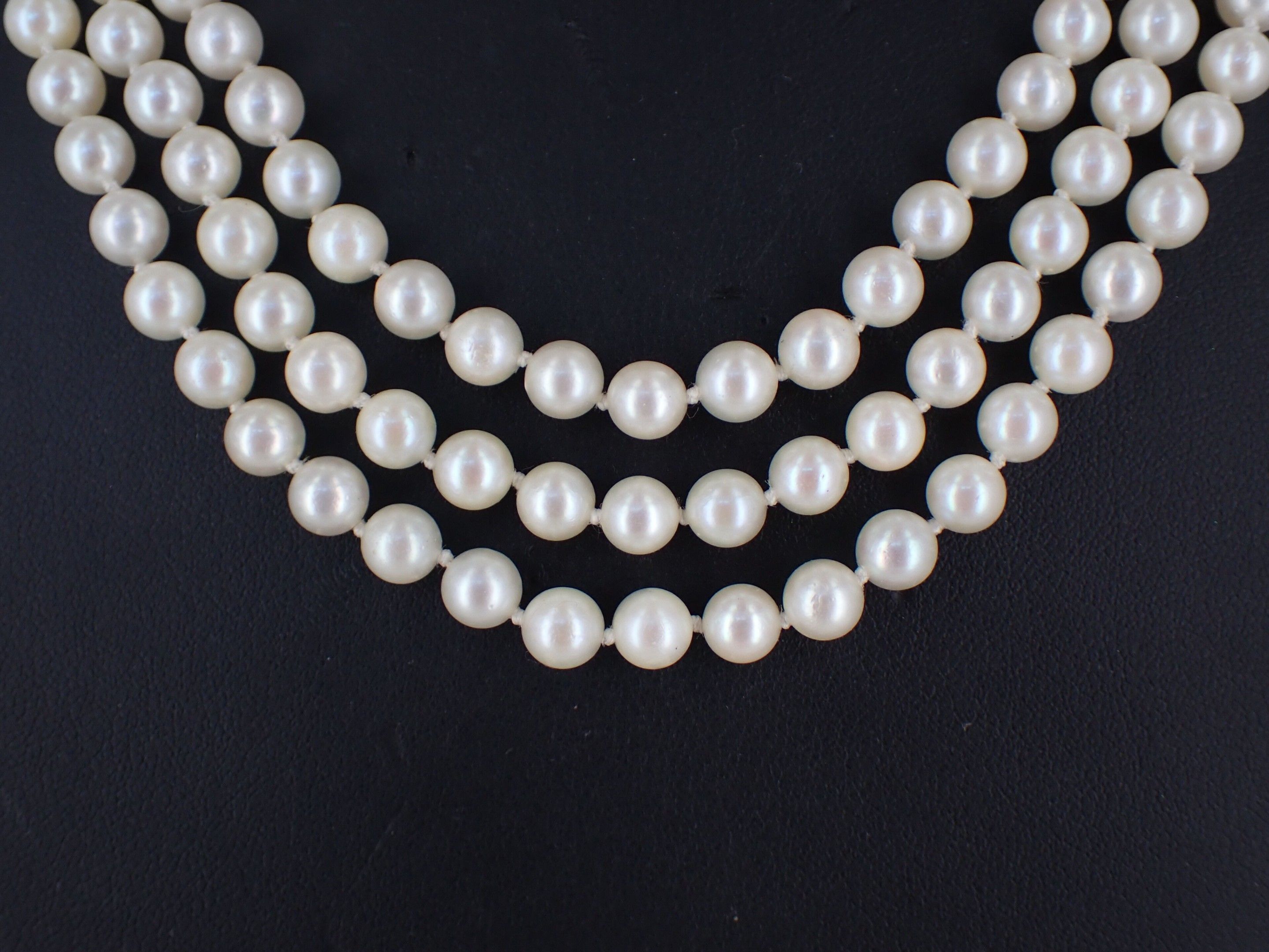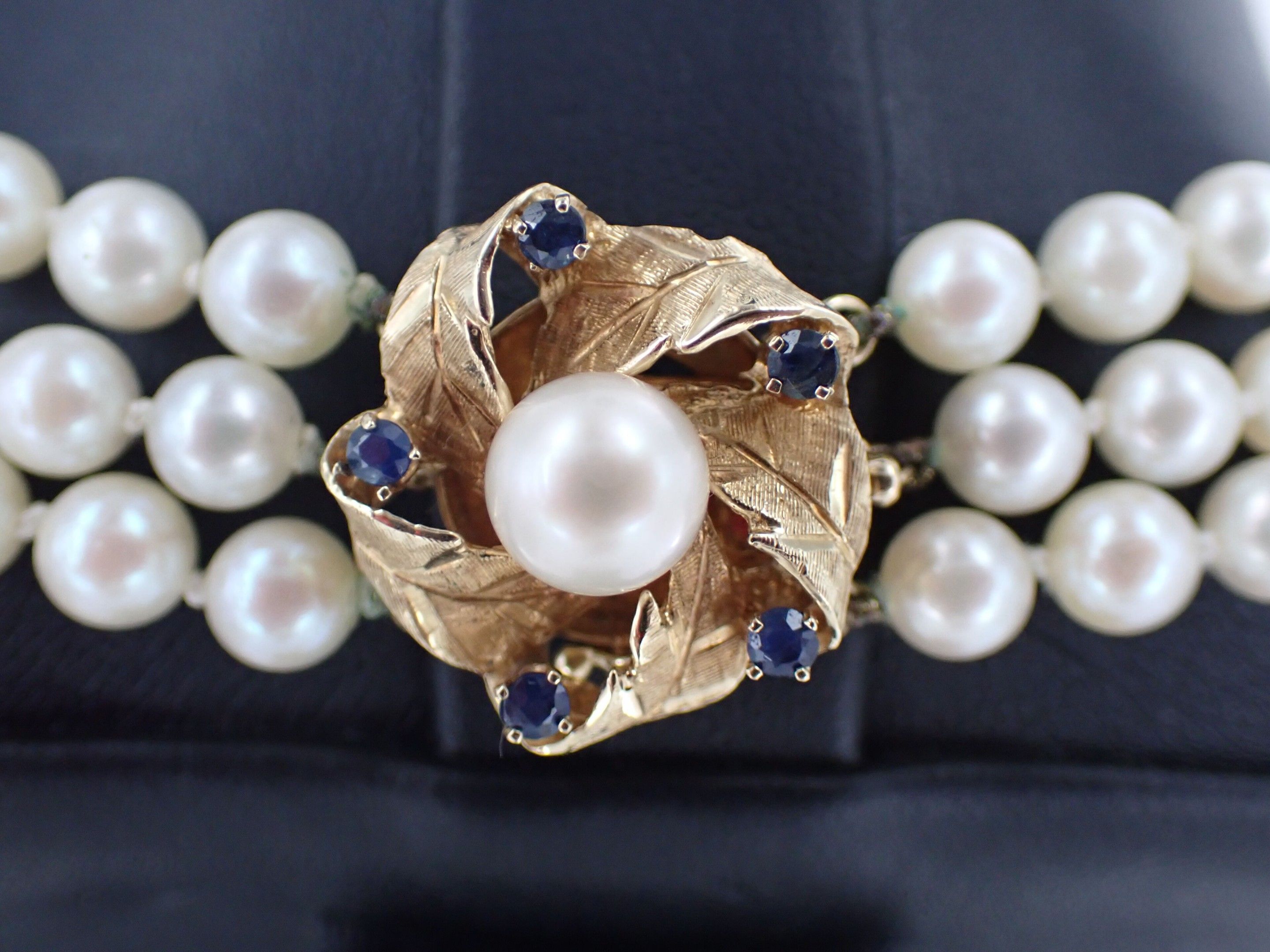 A necklace with three rows of cultured pearls, the circular gold clasp with foliate motifs set with five sapphires and a central pearl and A bracelet of the same design.