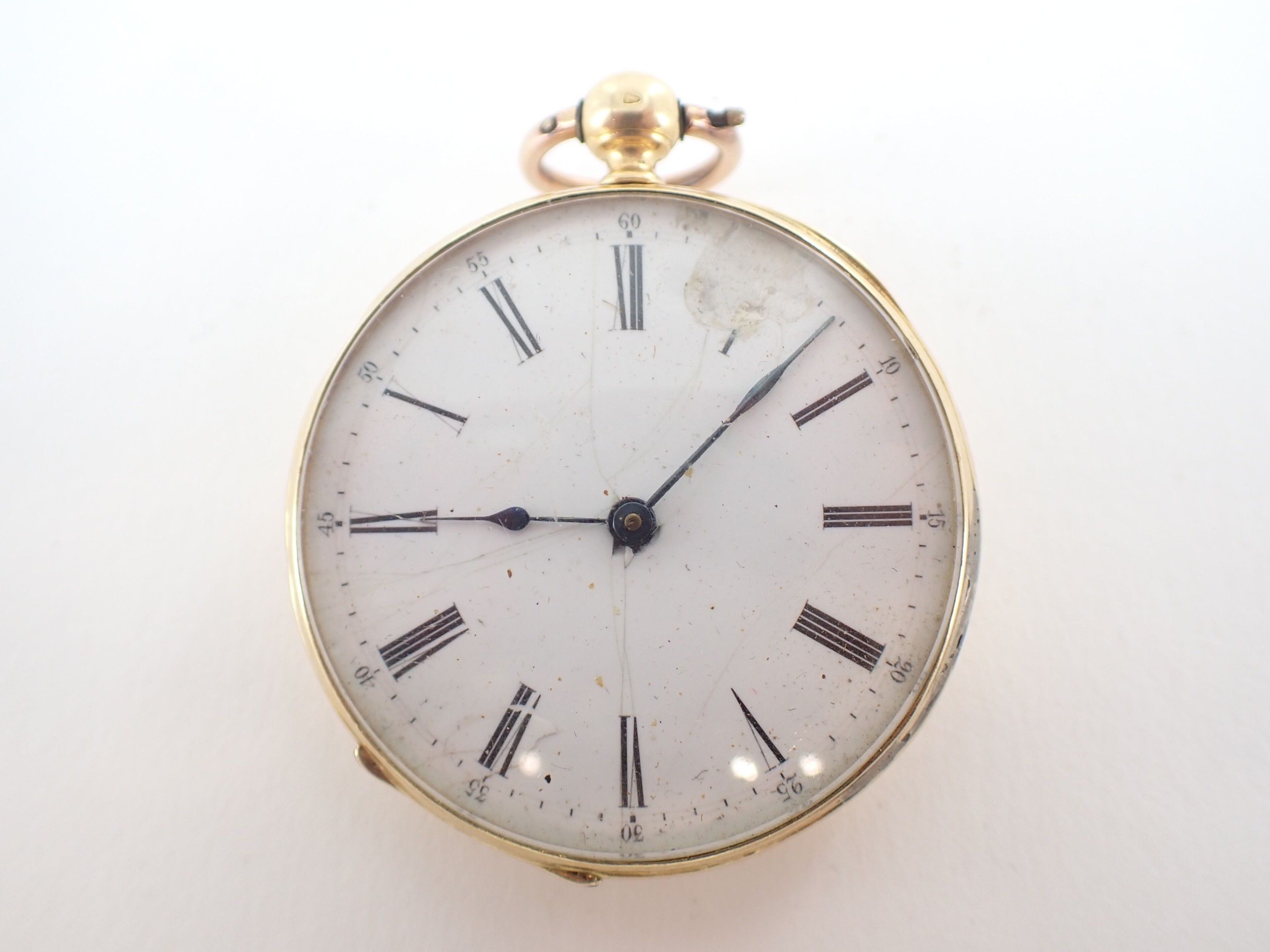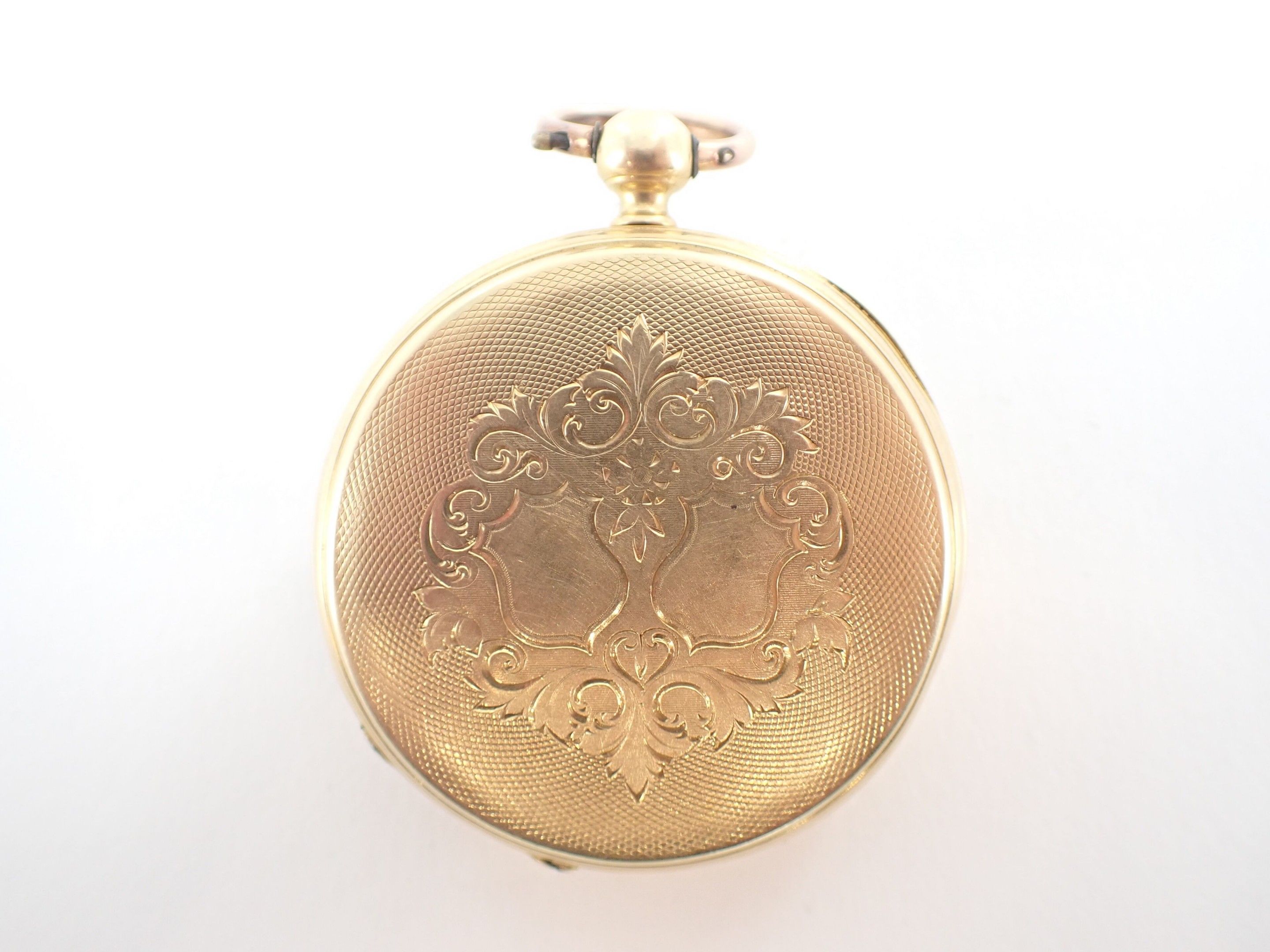 Pocket watch in 750 thousandths yellow gold, the dial with Roman numerals, the minutes in Arabic numerals in black on a white background. Dust cover in 750 thousandths gold. The reverse engraved with a monogrammed cartouche and two empty wedding coats of arms. Marked with a horse's head. Gross weight: approx. 56.3 g. Diameter: 4.5 cm