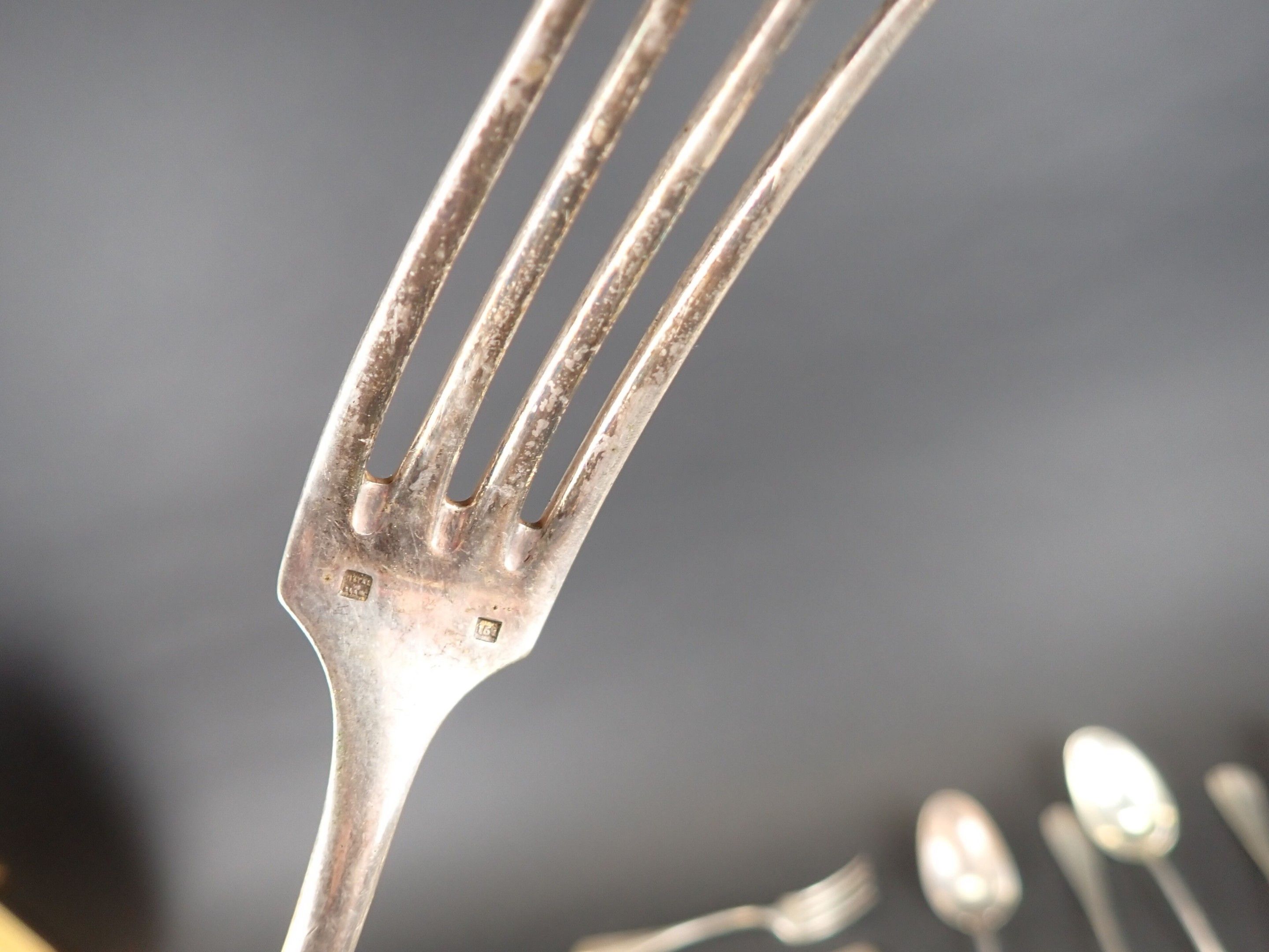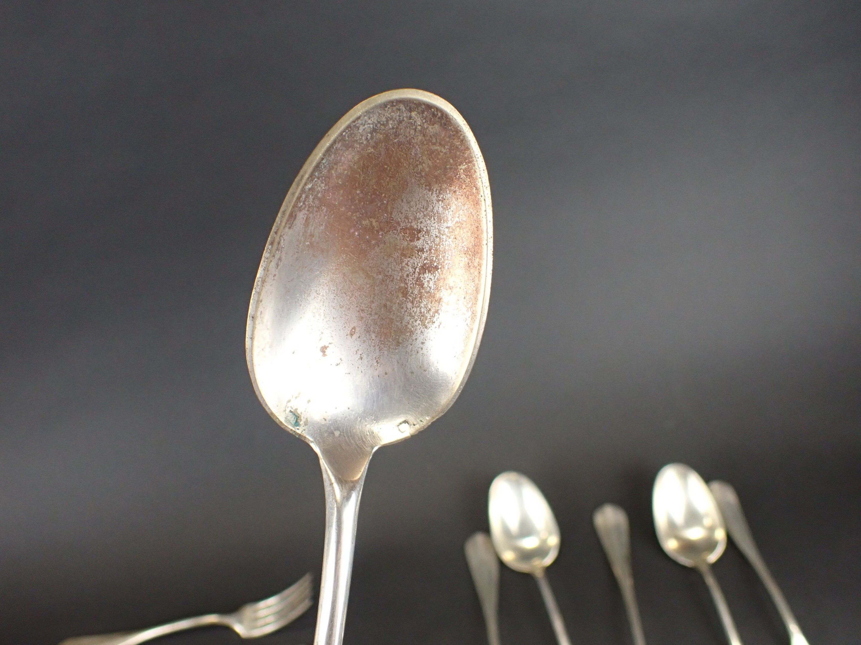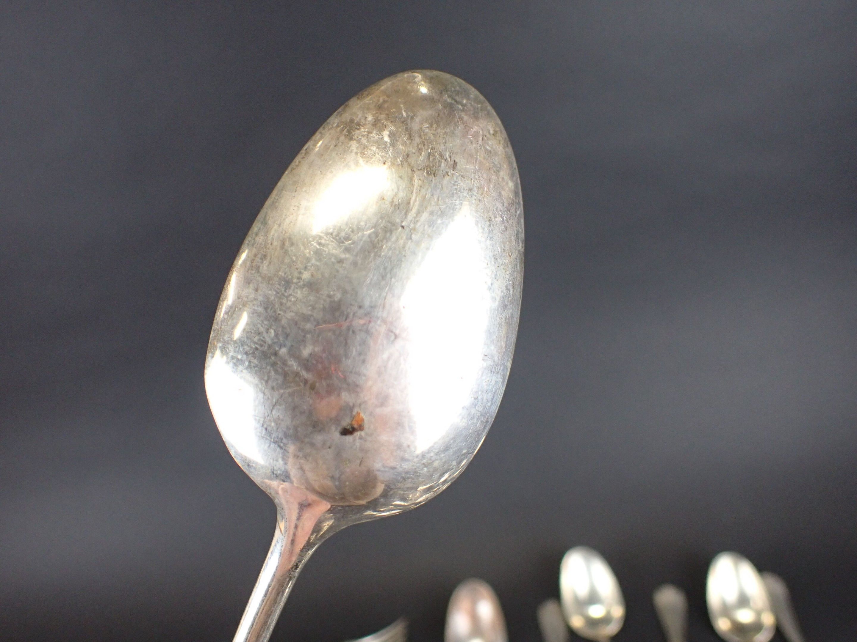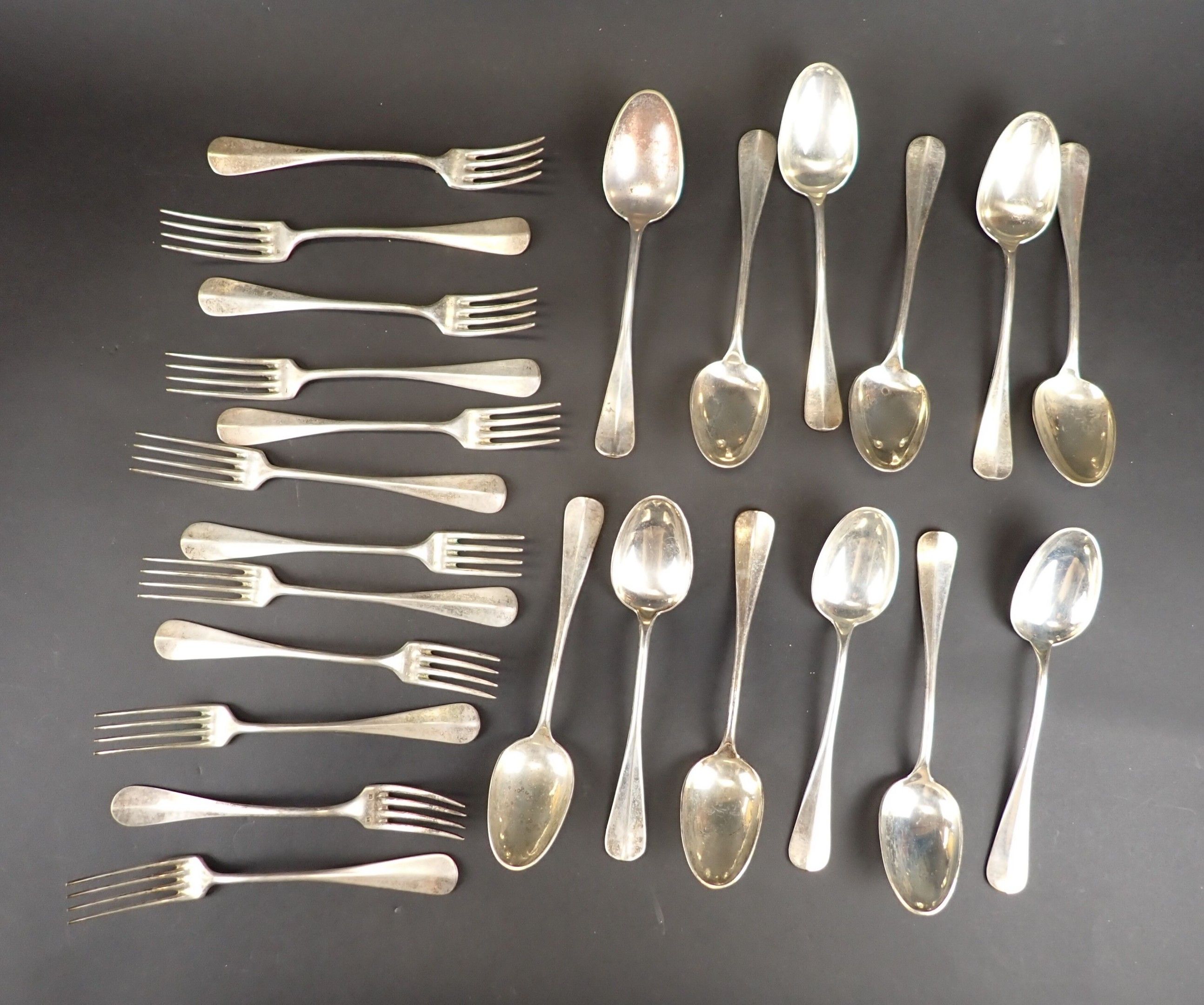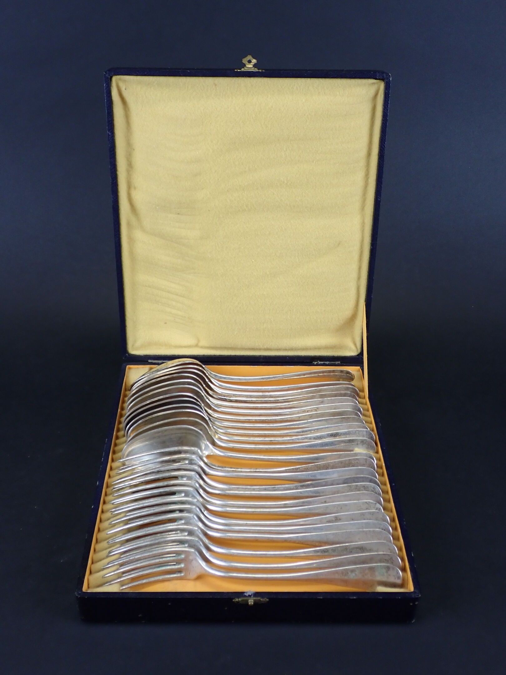 24-piece silver-plated flatware set in a blue case. Wear and tear.