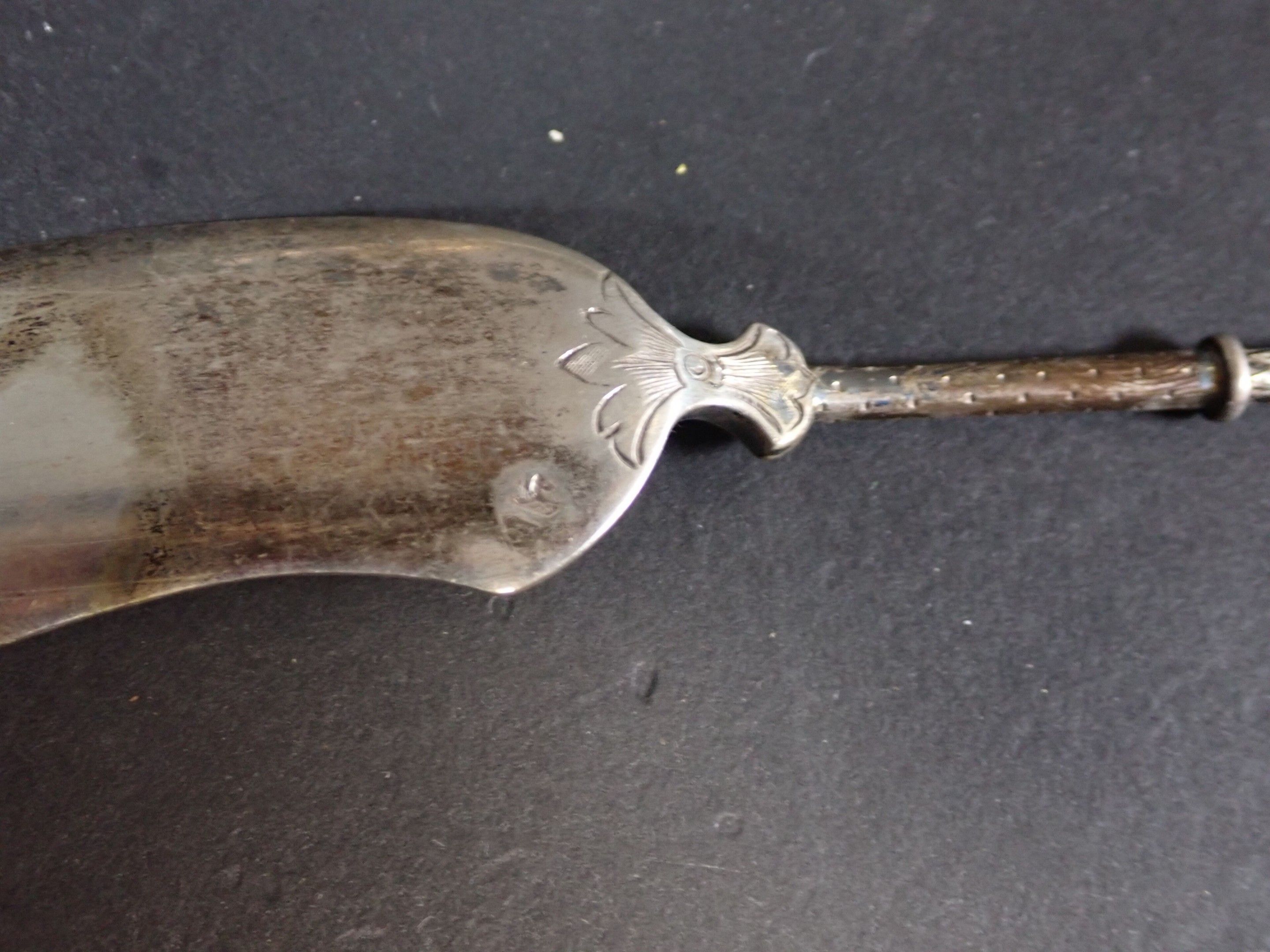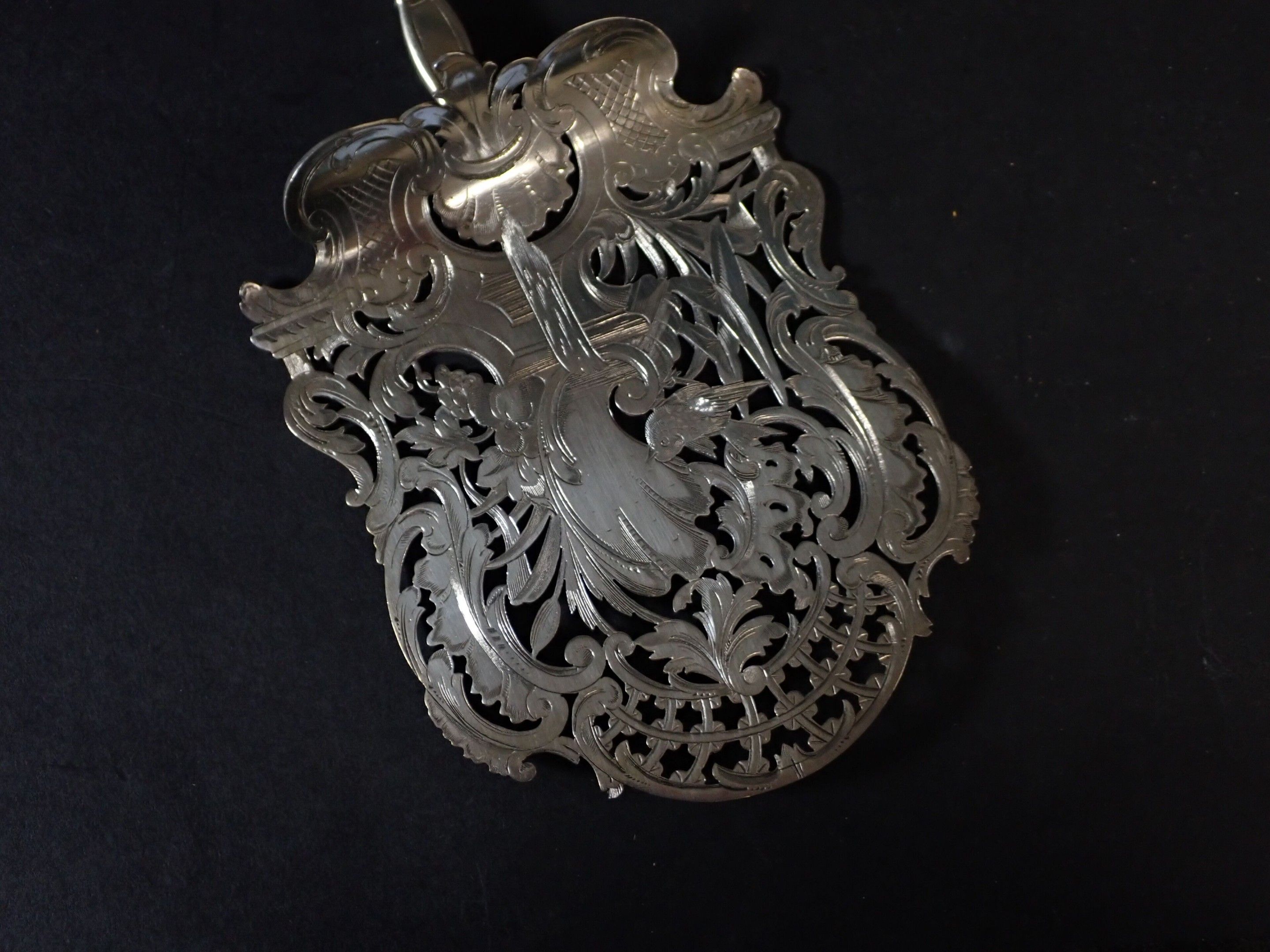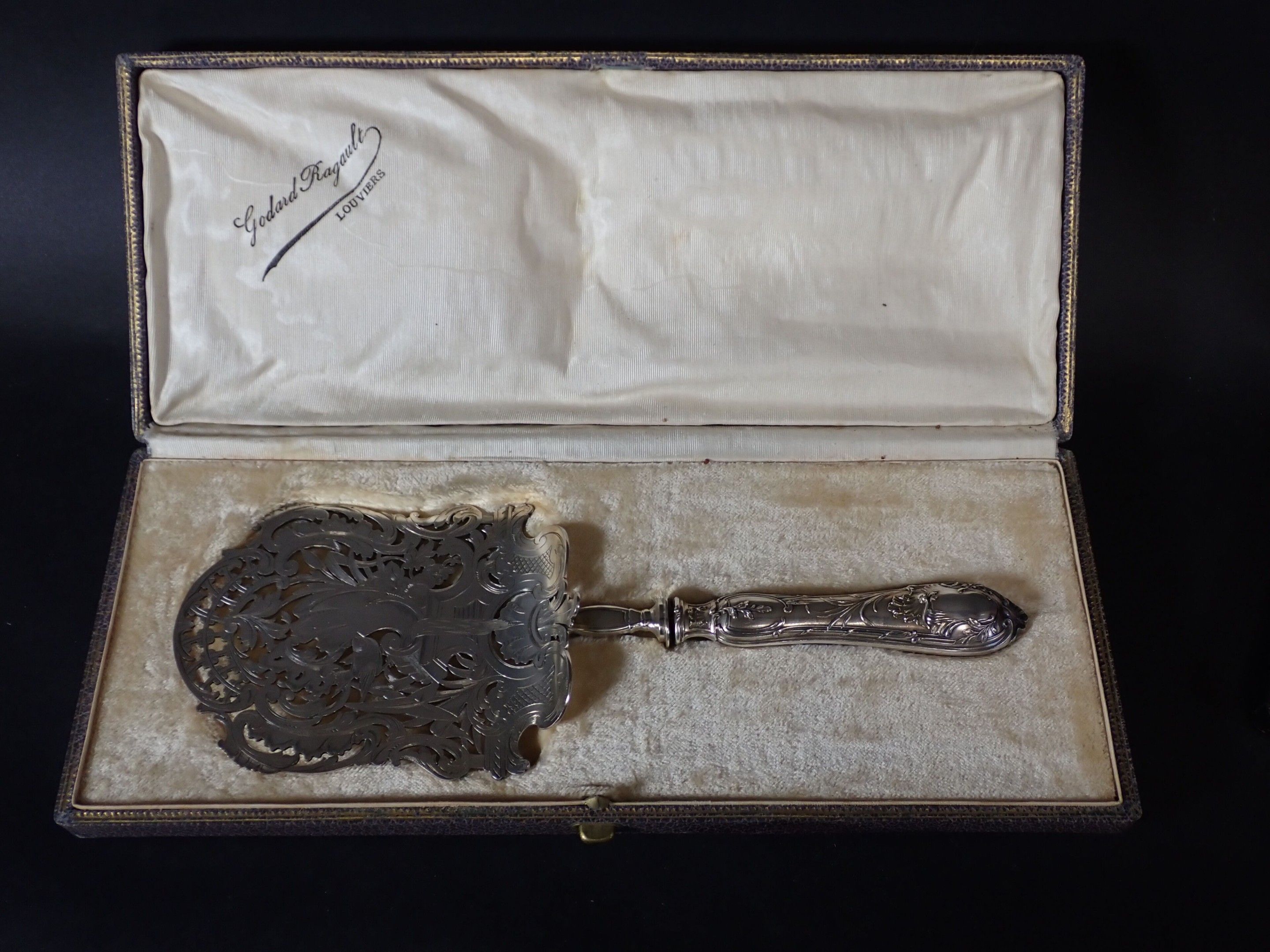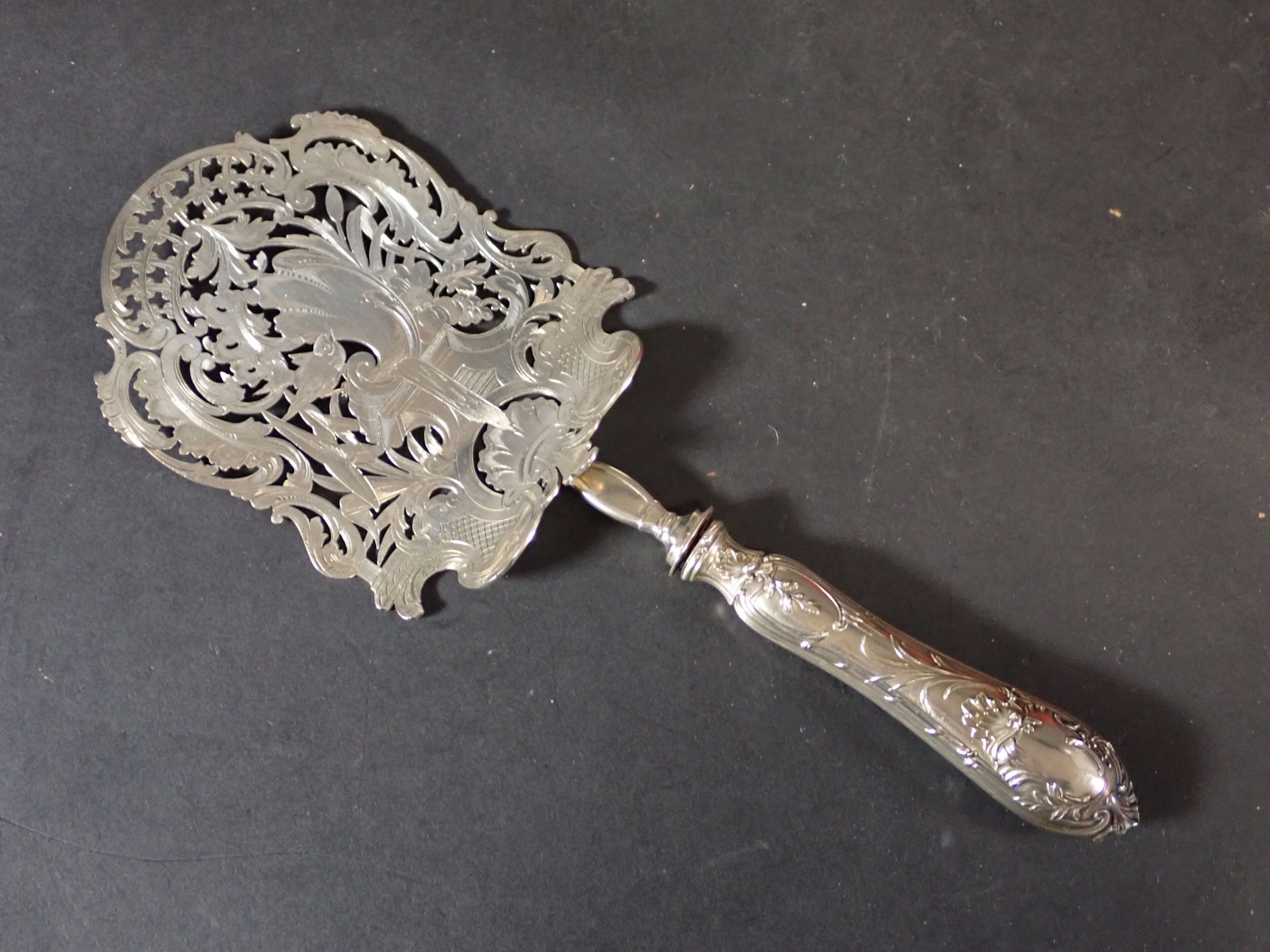 Net weight: 98 g. One cake serving scoop, the handle in solid silver 800/1000 and the spatula in openwork silver plated metal. In cases.