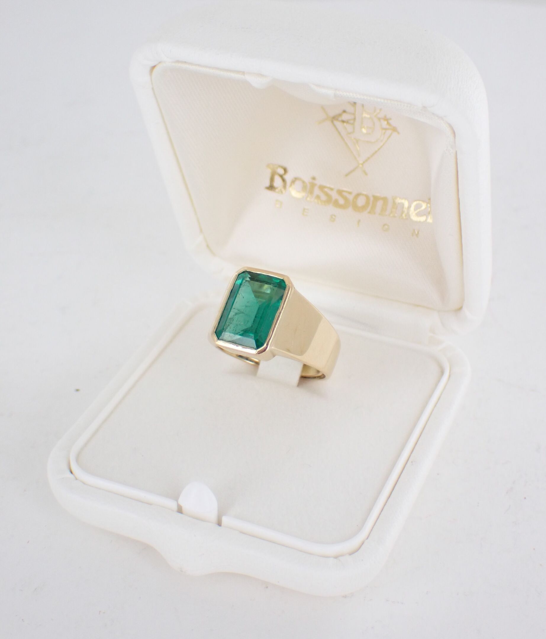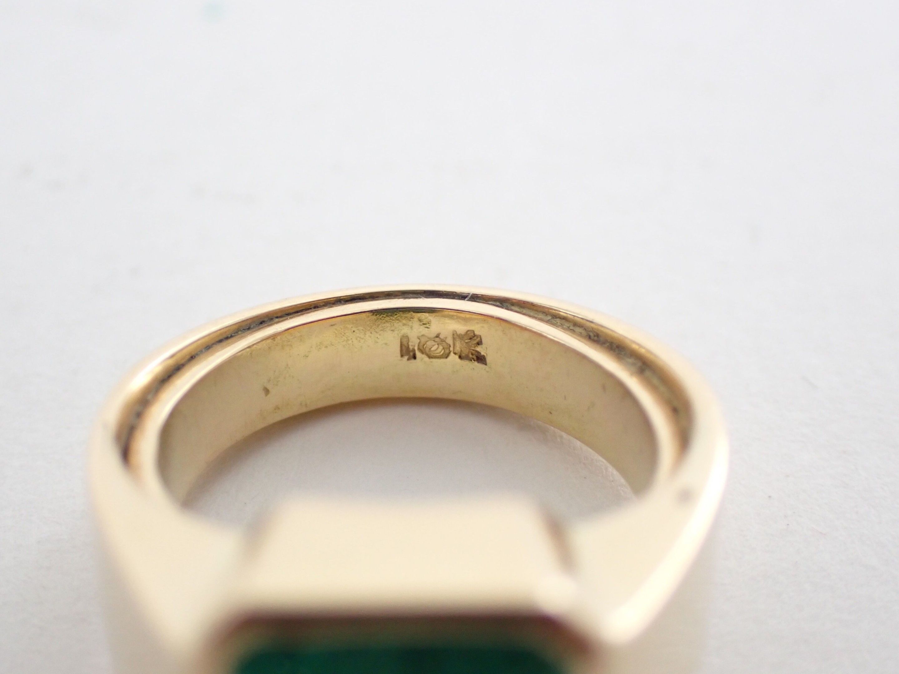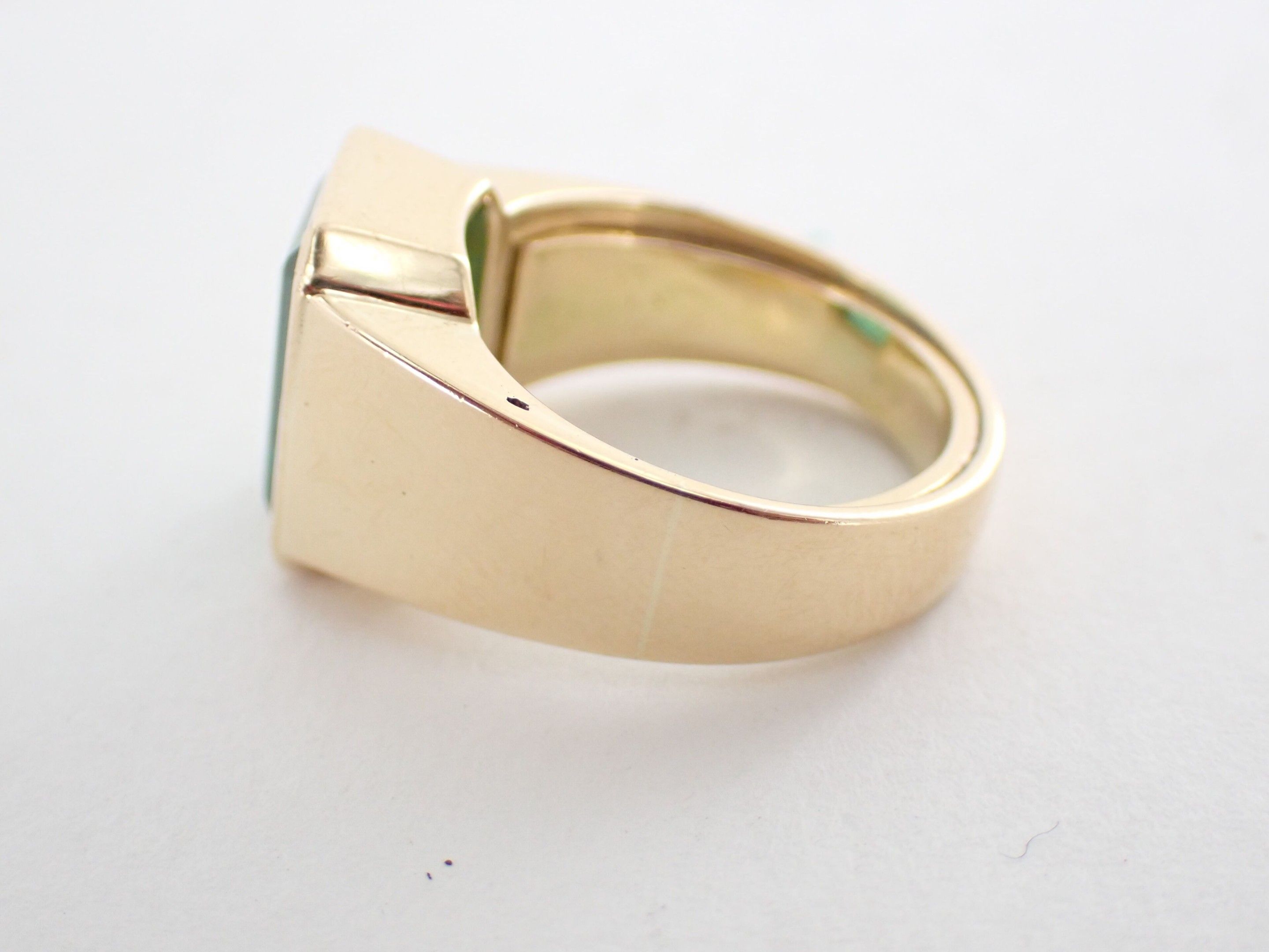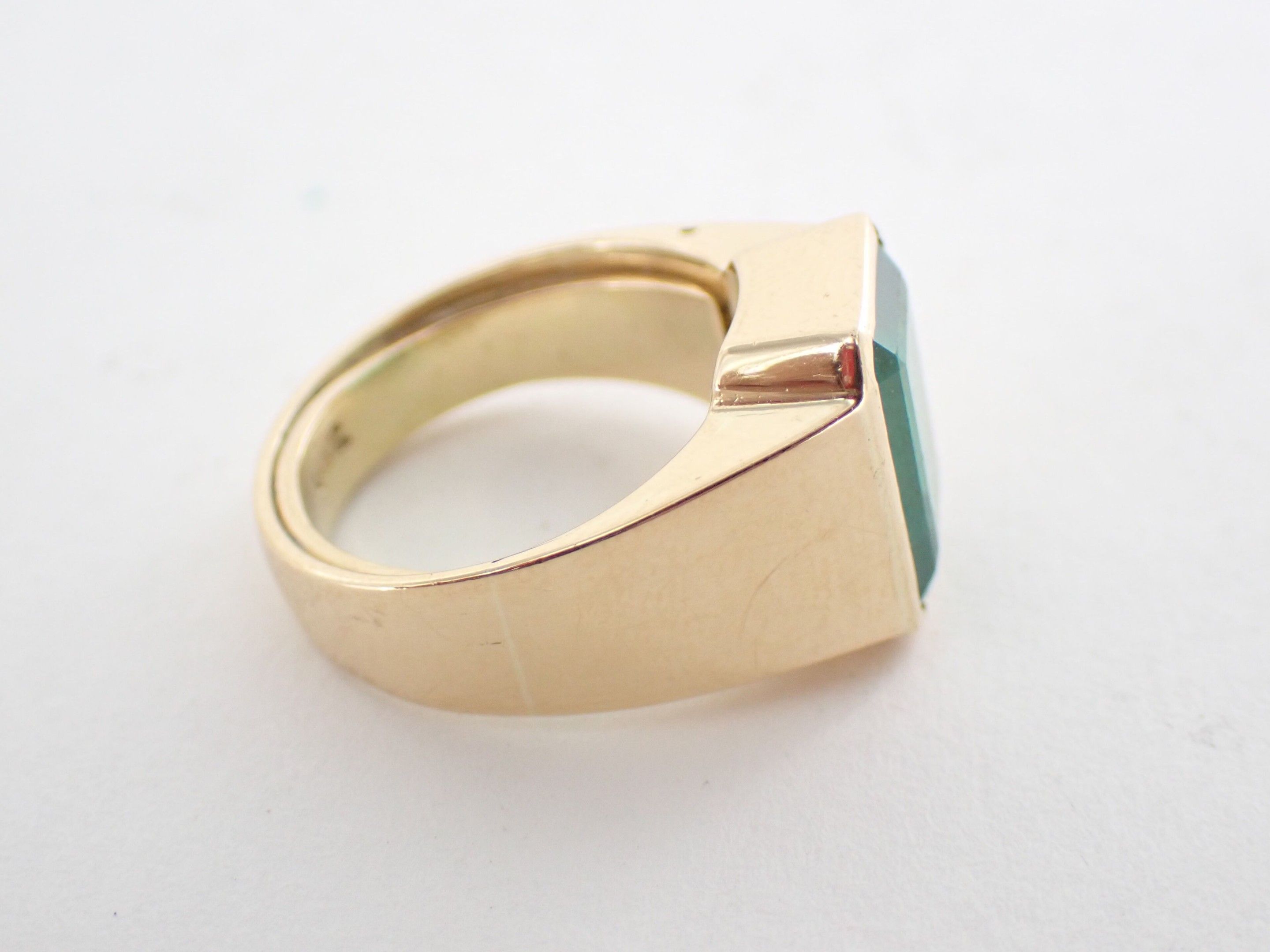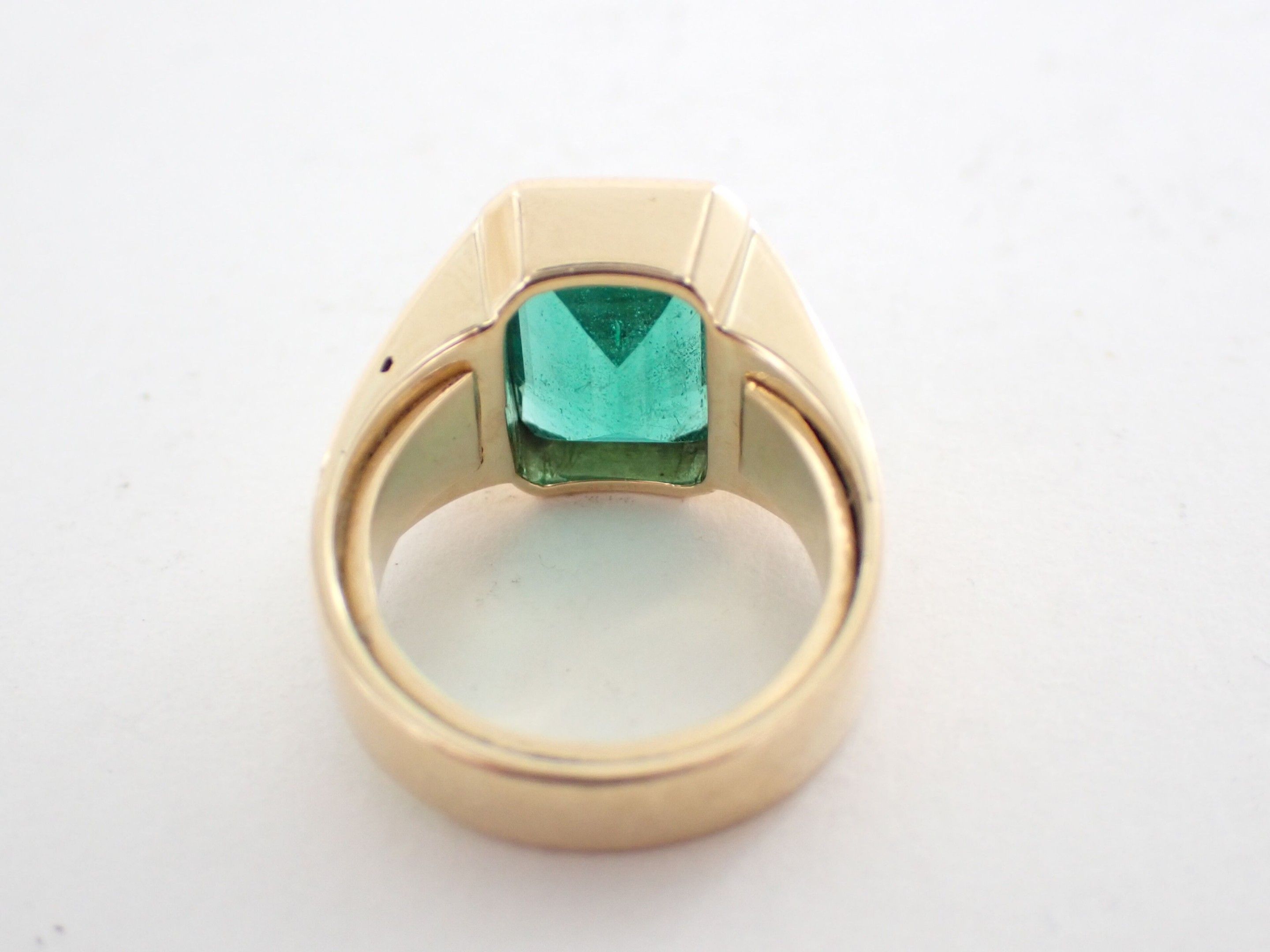 Yellow gold signet ring, 750 thousandths, set in the centre with a rectangular emerald (approx. 11.50 x 8.11 x 5.95 mm) with cut sides, set in a closed setting, approx. 4 carats. TDD : 49 (spring ring). Gross weight: 11.1 g (Scratches)