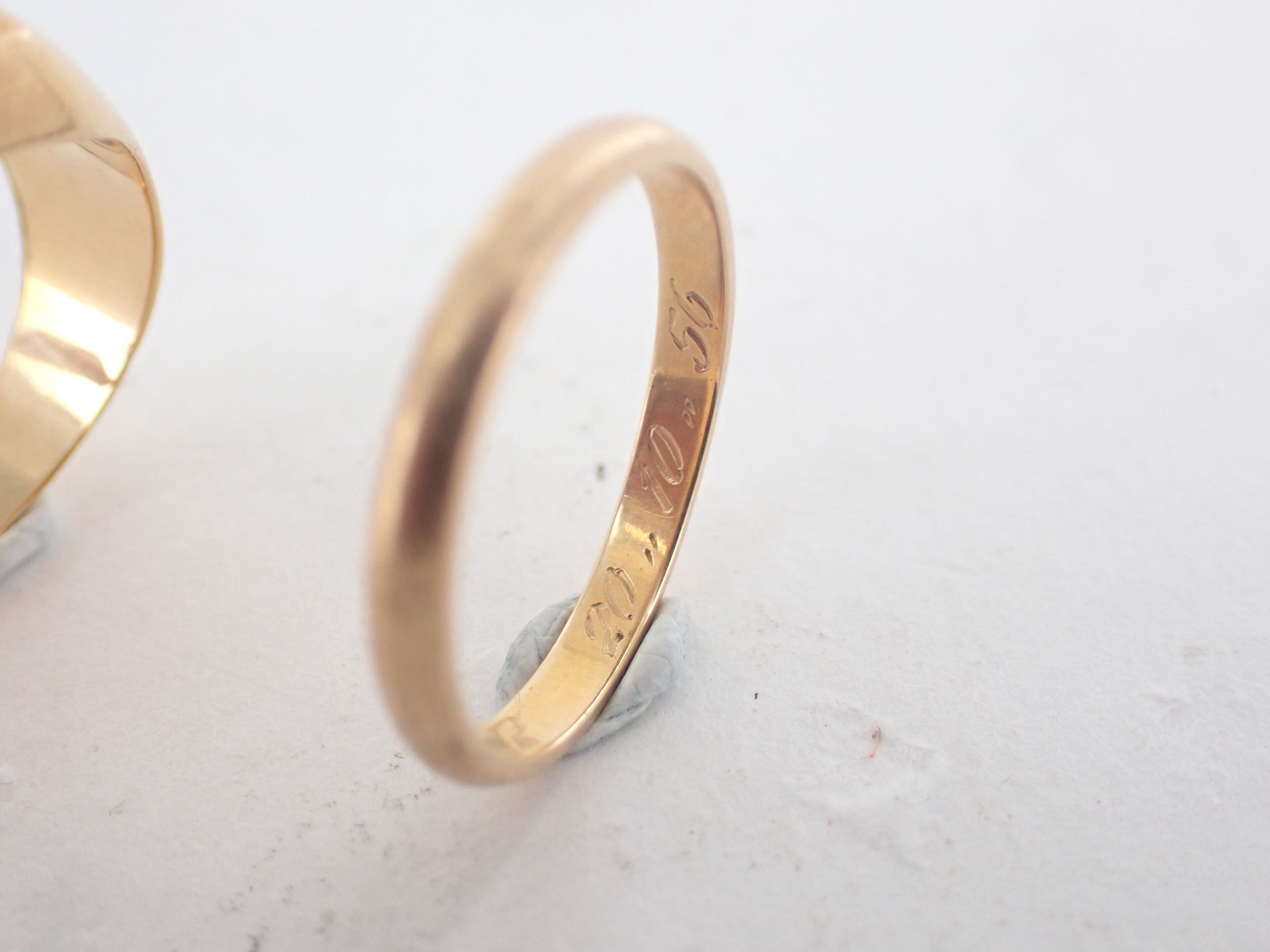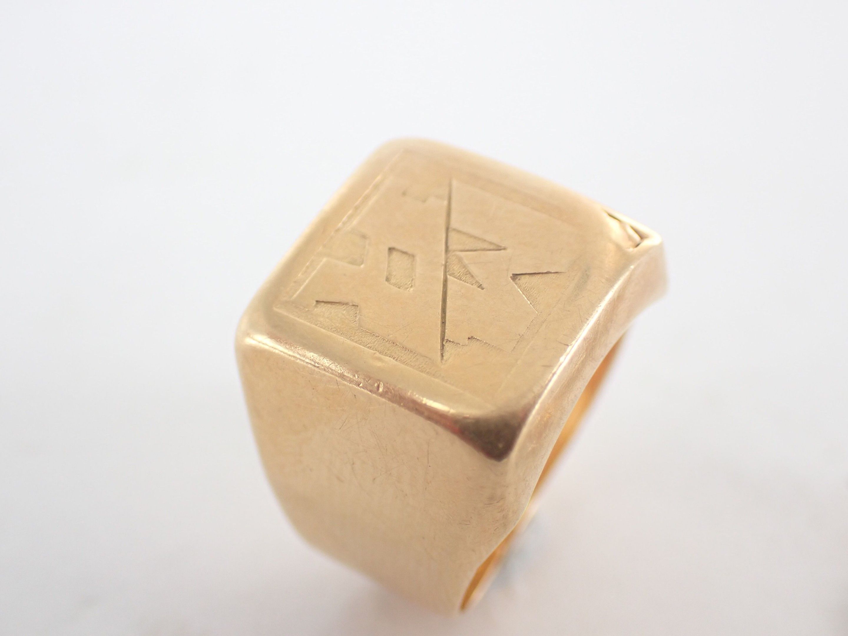 Ring and signet ring in 18 carat yellow gold, the signet ring is set with the initials M.R. on the bezel.