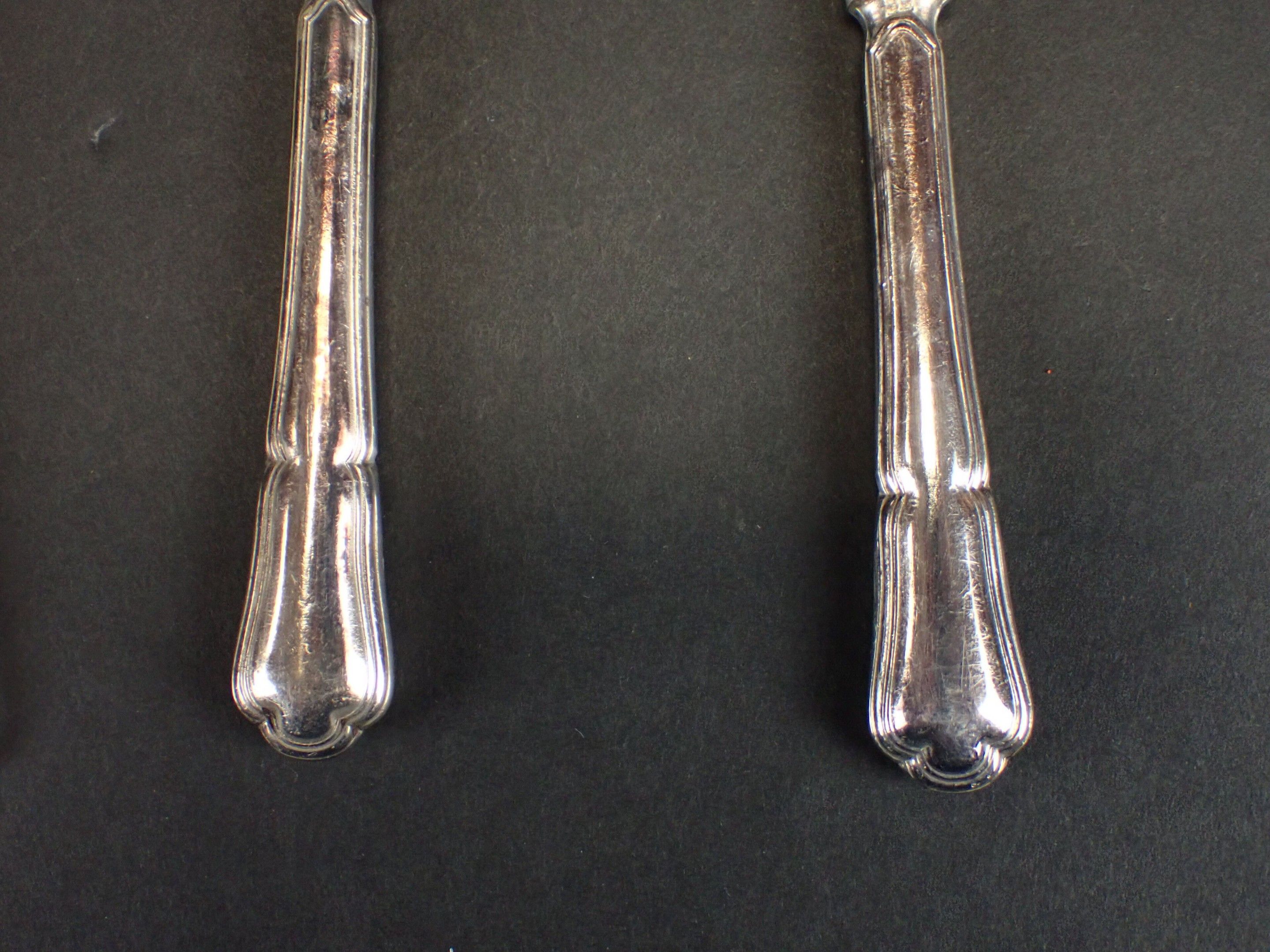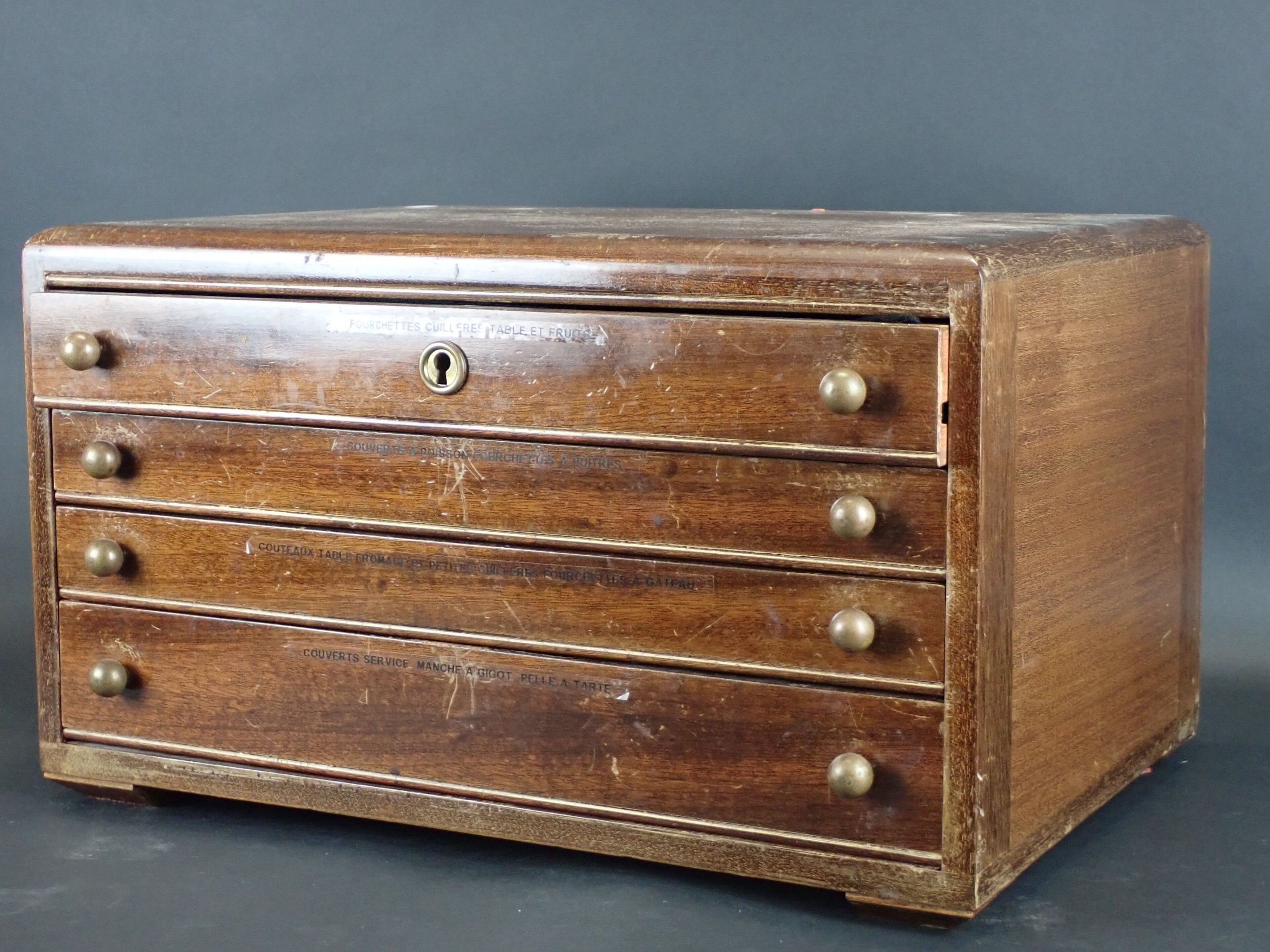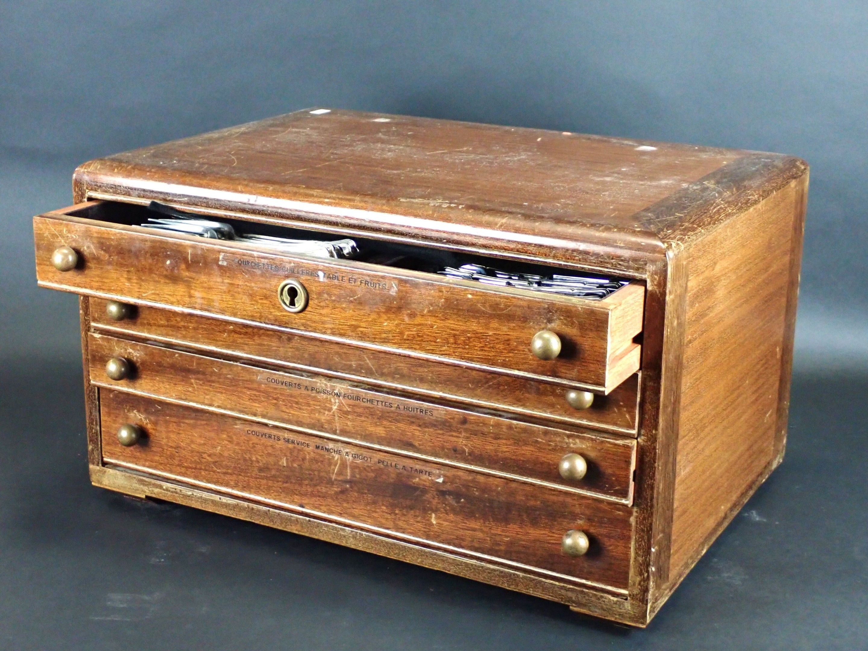 ERCUIS. An important 121-piece silver-plated cutlery menagerie of double contoured filets design, contained in a wooden case with four drawers circa 1940, a brass plaque signed ERCUIS on the top drawer, comprising: