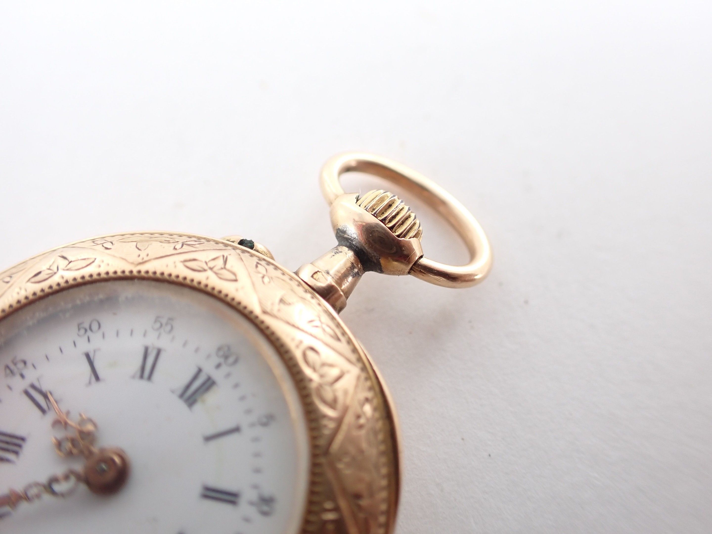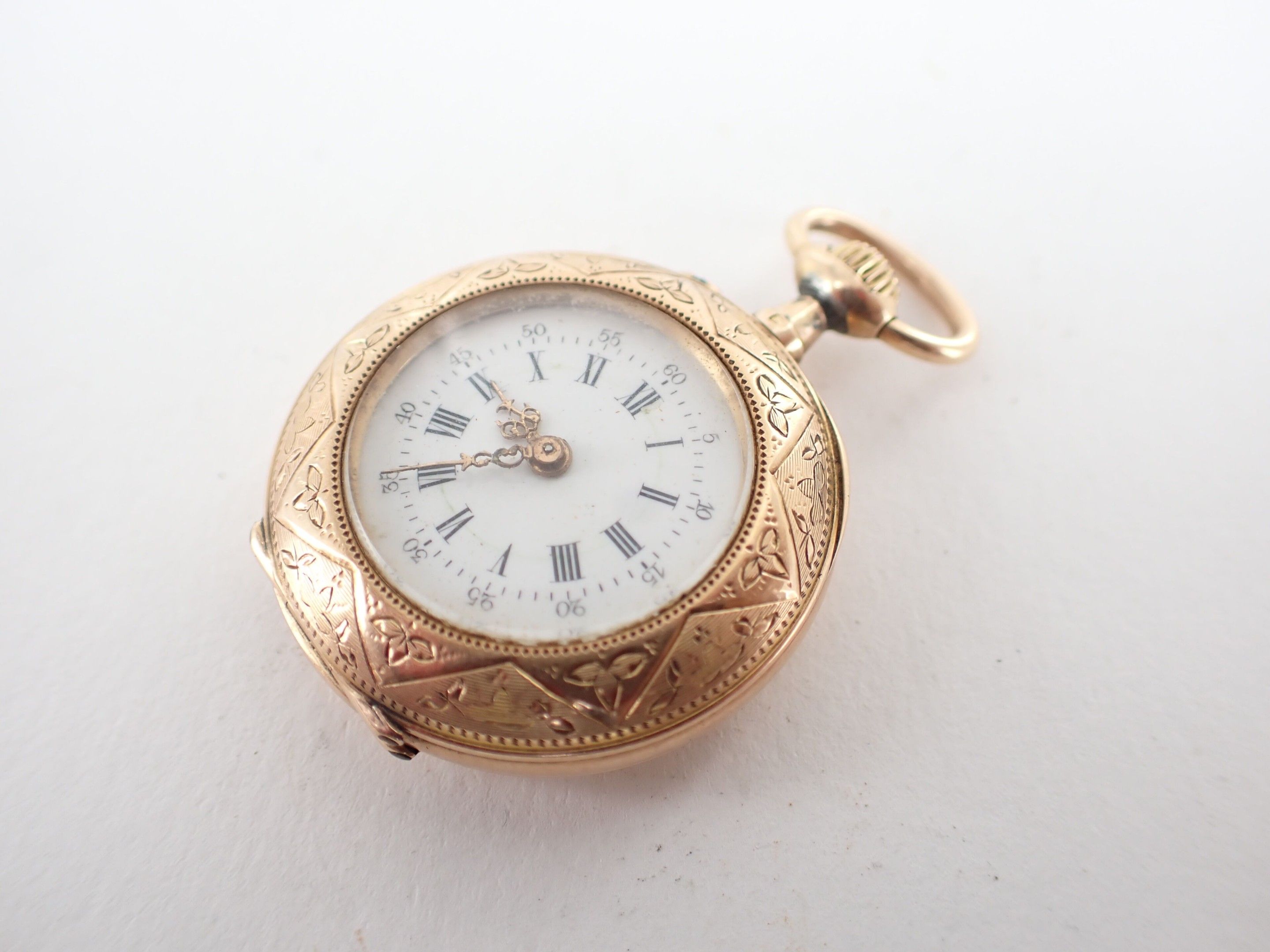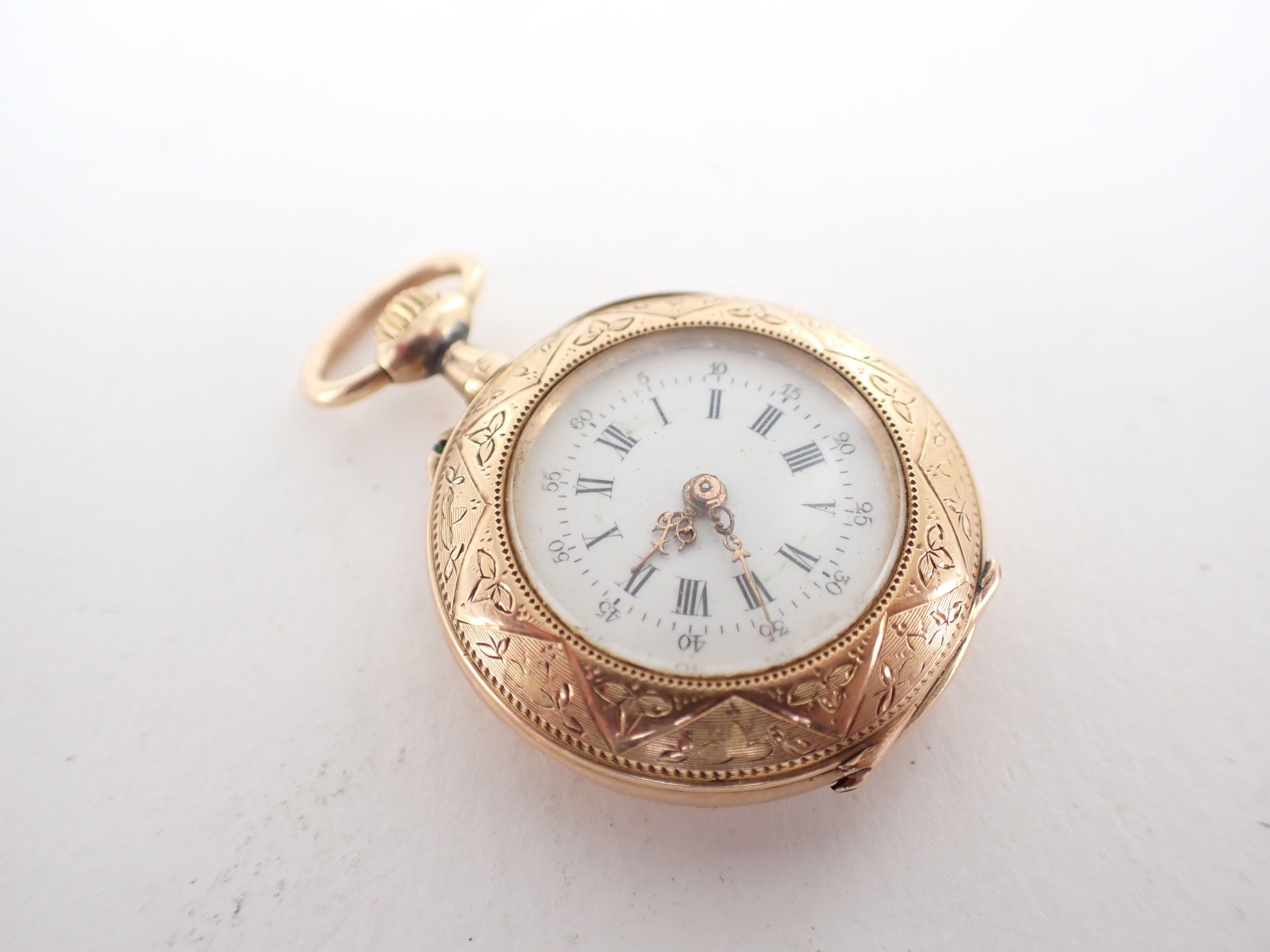 Collar watch in 18 carat yellow gold, circa 1900. White enamelled dial with Arabic and Roman numerals. Engine-turned back decorated with a medallion and crown of flowers. Wear and tear. Diameter: 30 mm - Gross weight: 21.5 g.