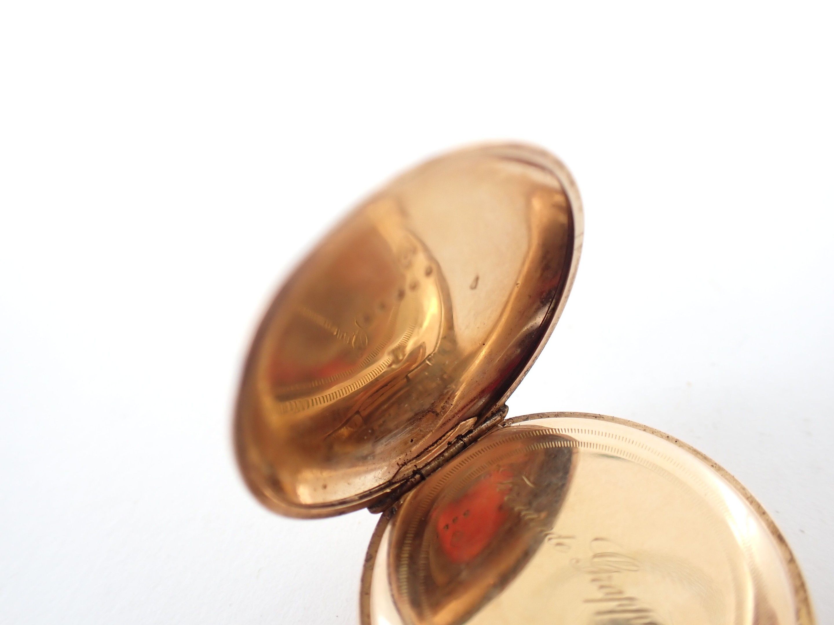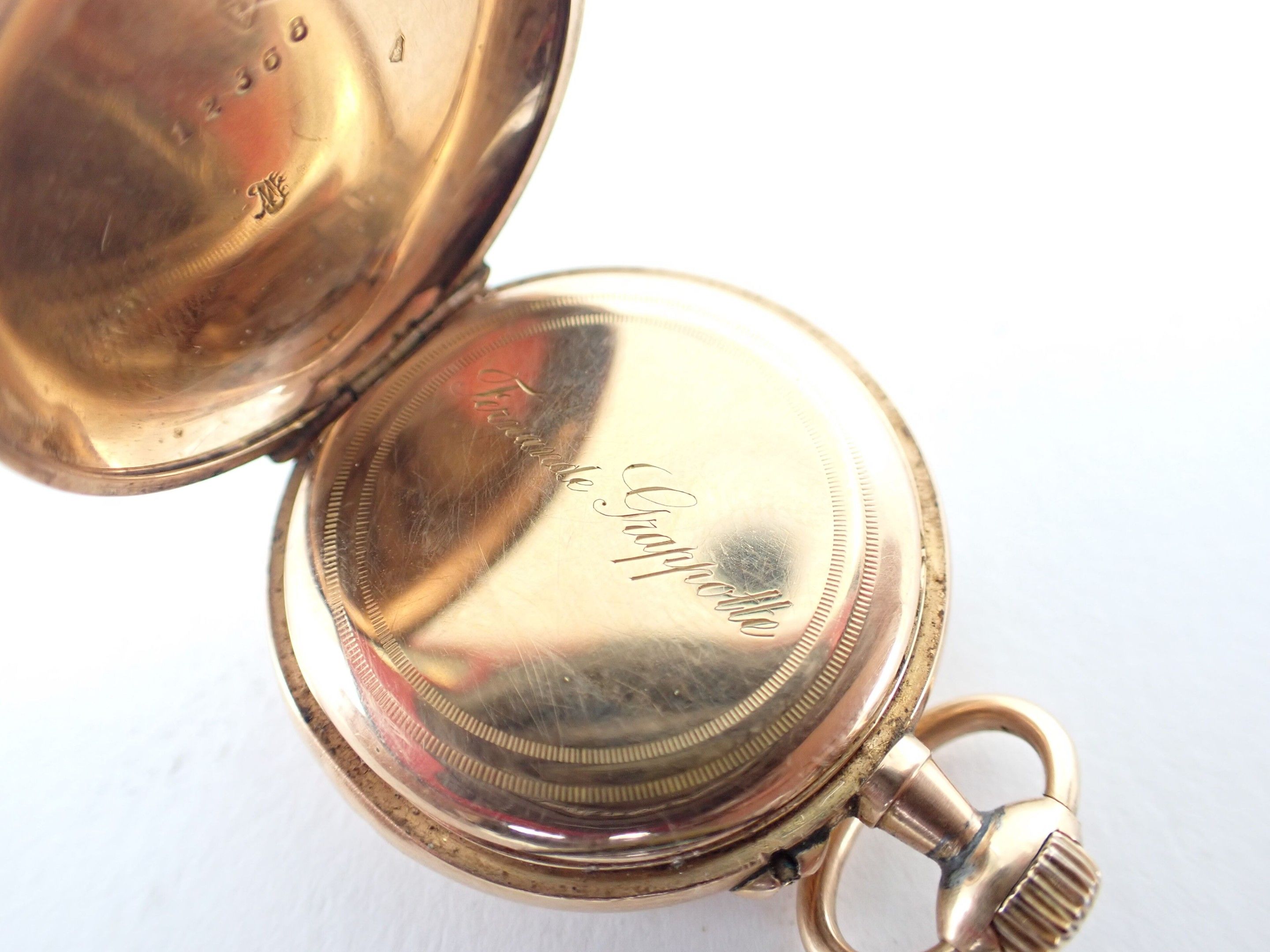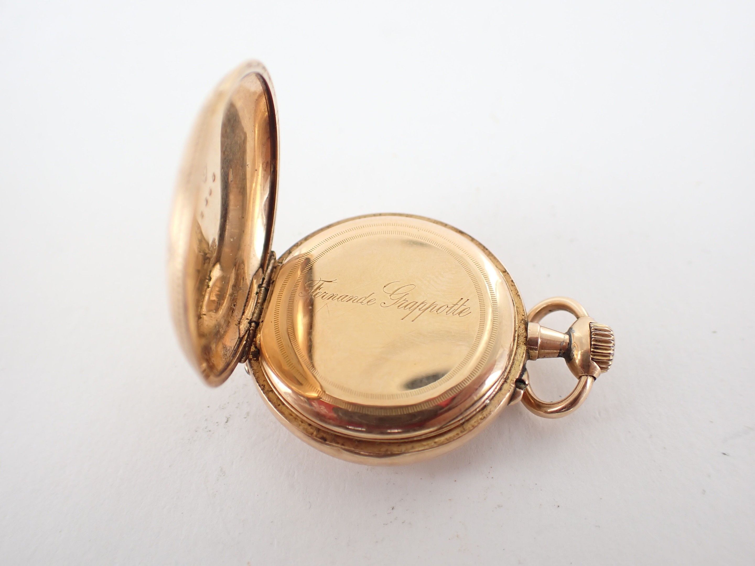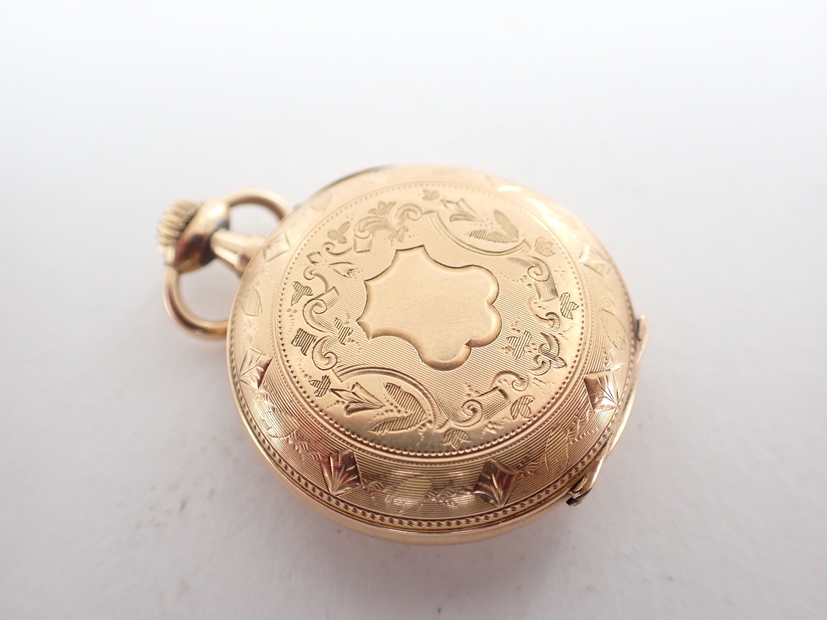 Collar watch in 18 carat yellow gold, circa 1900. White enamelled dial with Arabic and Roman numerals. Engine-turned back decorated with a medallion and crown of flowers. Wear and tear. Diameter: 30 mm - Gross weight: 21.5 g.