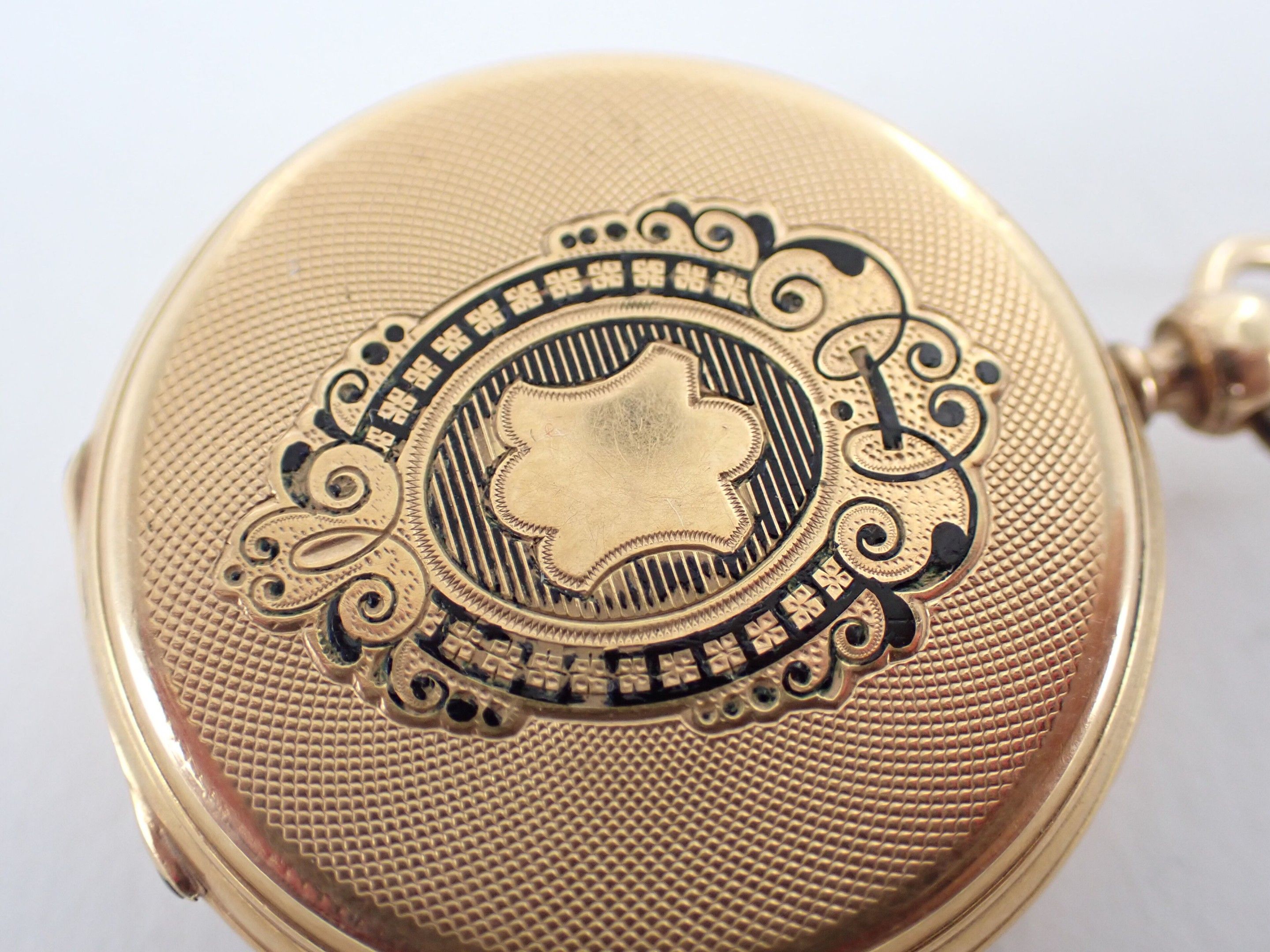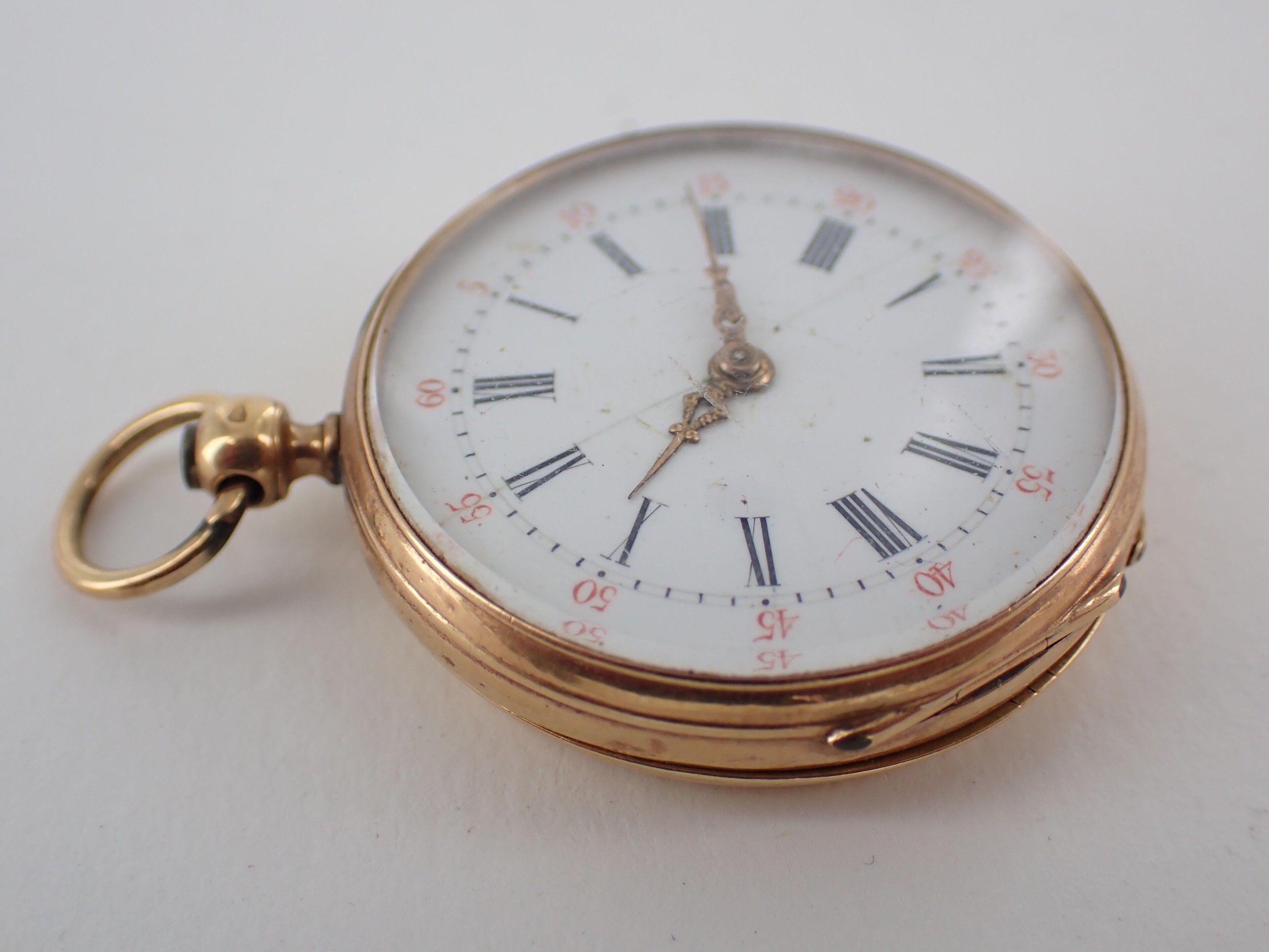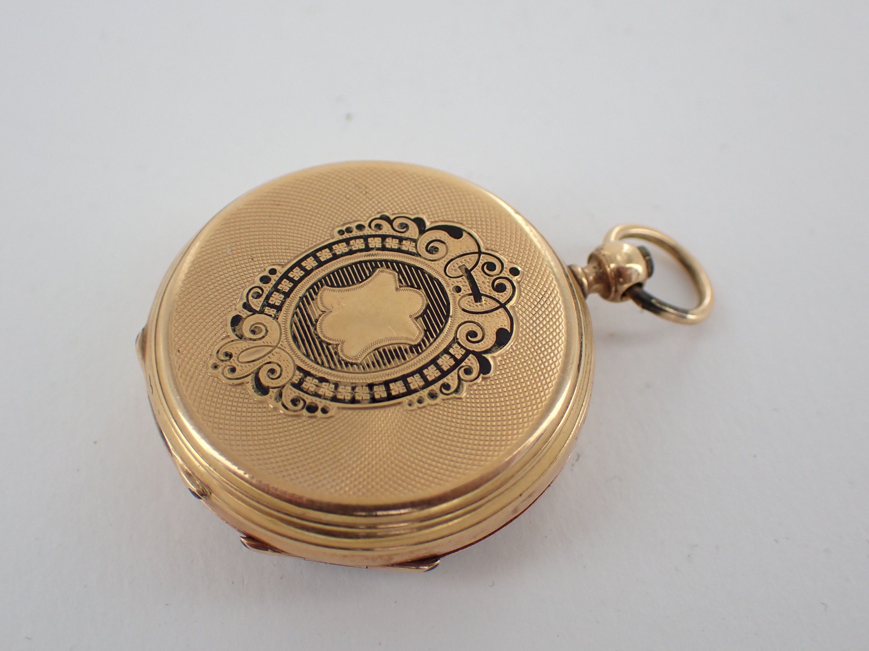 Collar watch in 18 carat yellow gold, circa 1900. White enamelled dial with Arabic and Roman numerals (crack). Engine-turned back decorated with a medallion and flowers with traces of black enamel. Wear and tear. Diameter: 33 mm - Gross weight: 24.1 g.