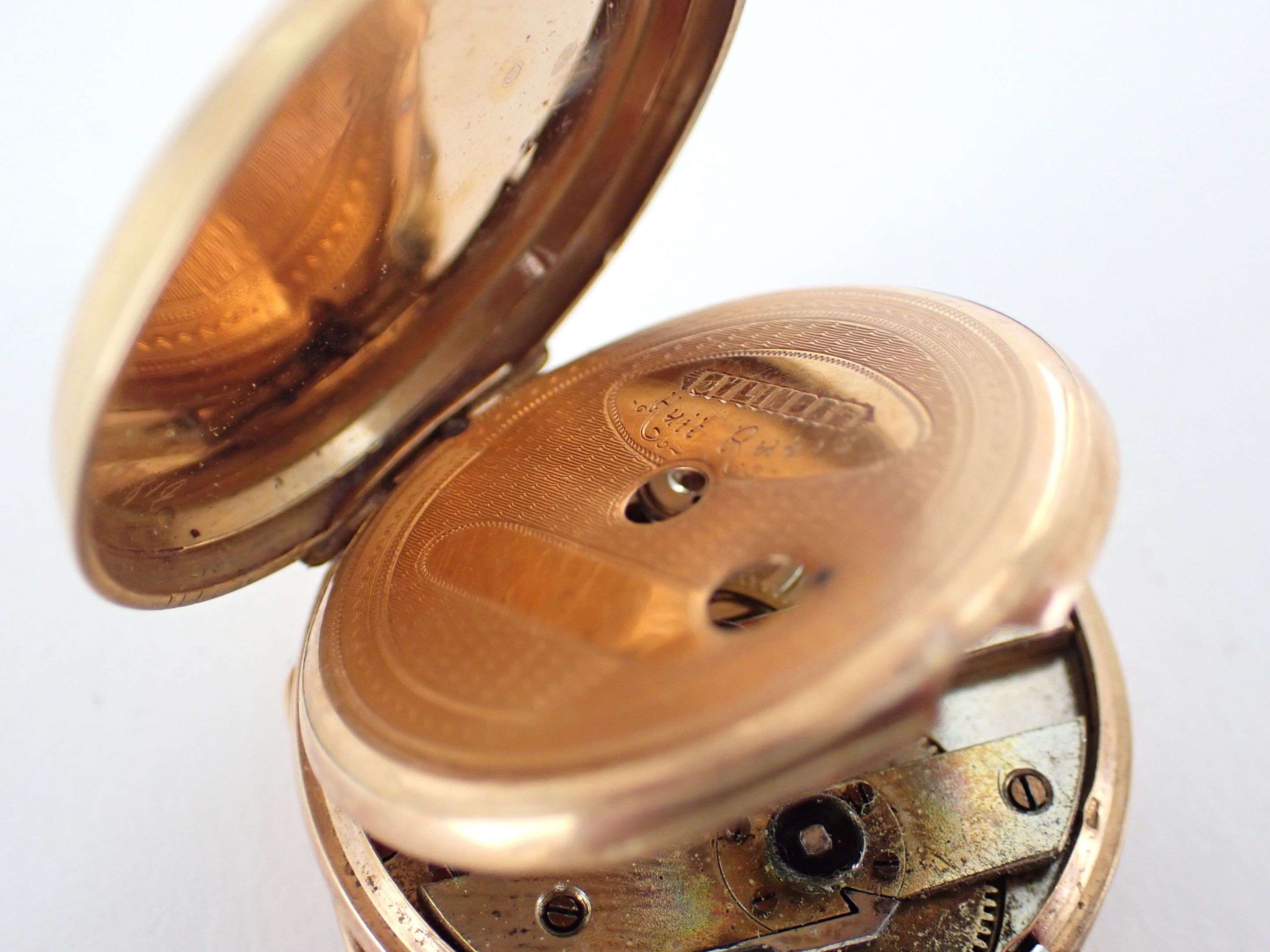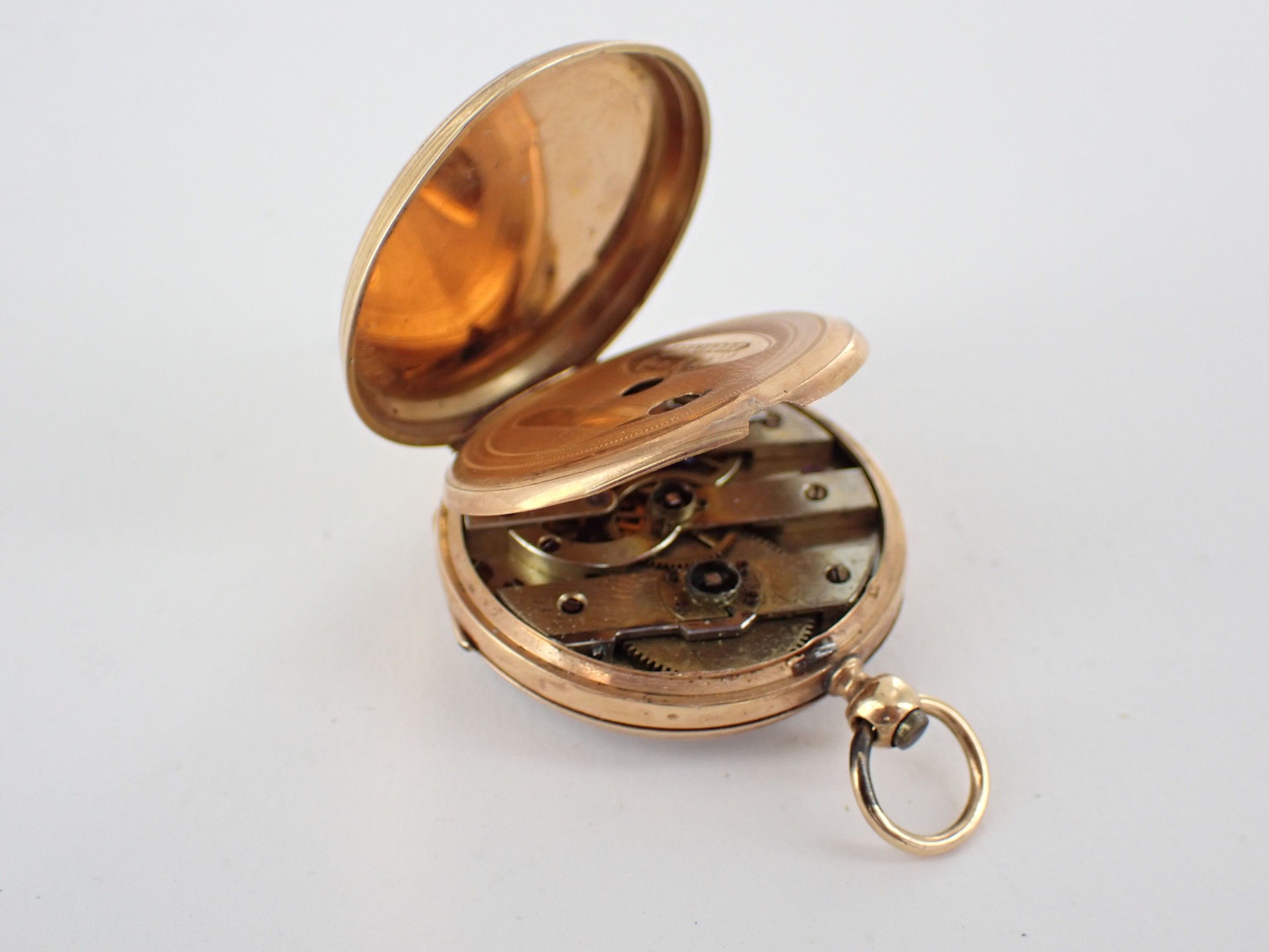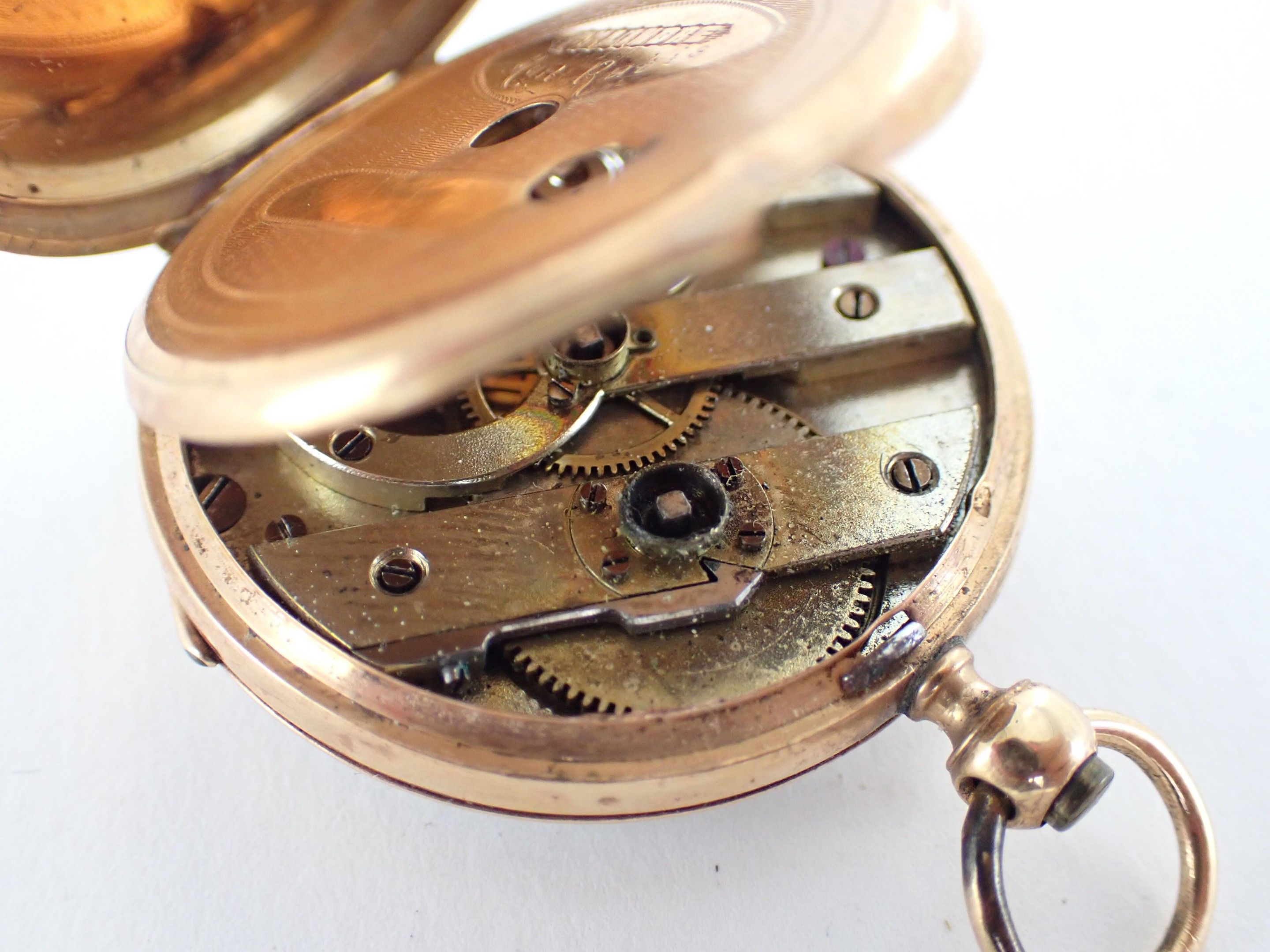Collar watch in 18 carat yellow gold, circa 1900. White enamelled dial with Arabic and Roman numerals (crack). Engine-turned back decorated with a medallion and flowers with traces of black enamel. Wear and tear. Diameter: 33 mm - Gross weight: 24.1 g.