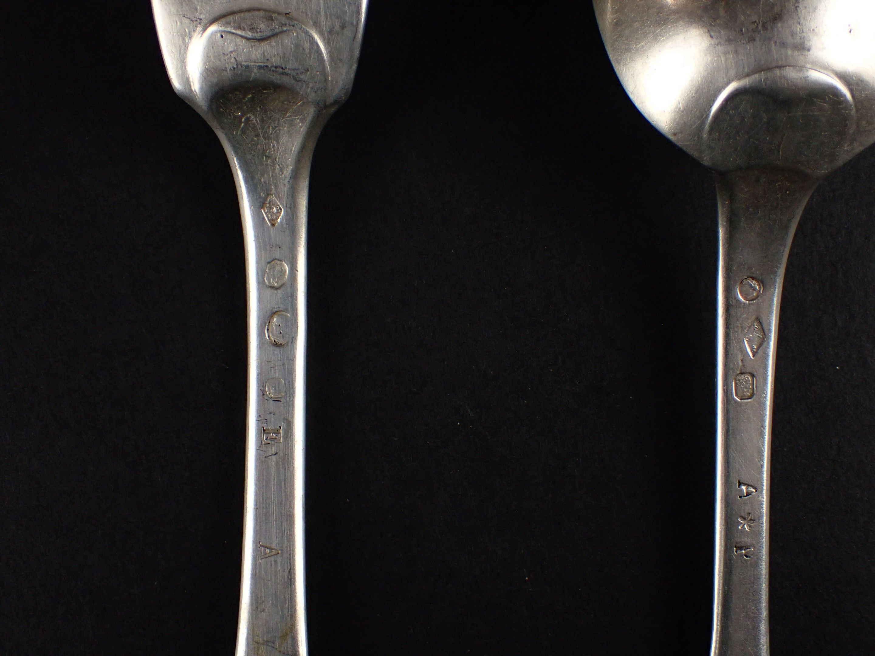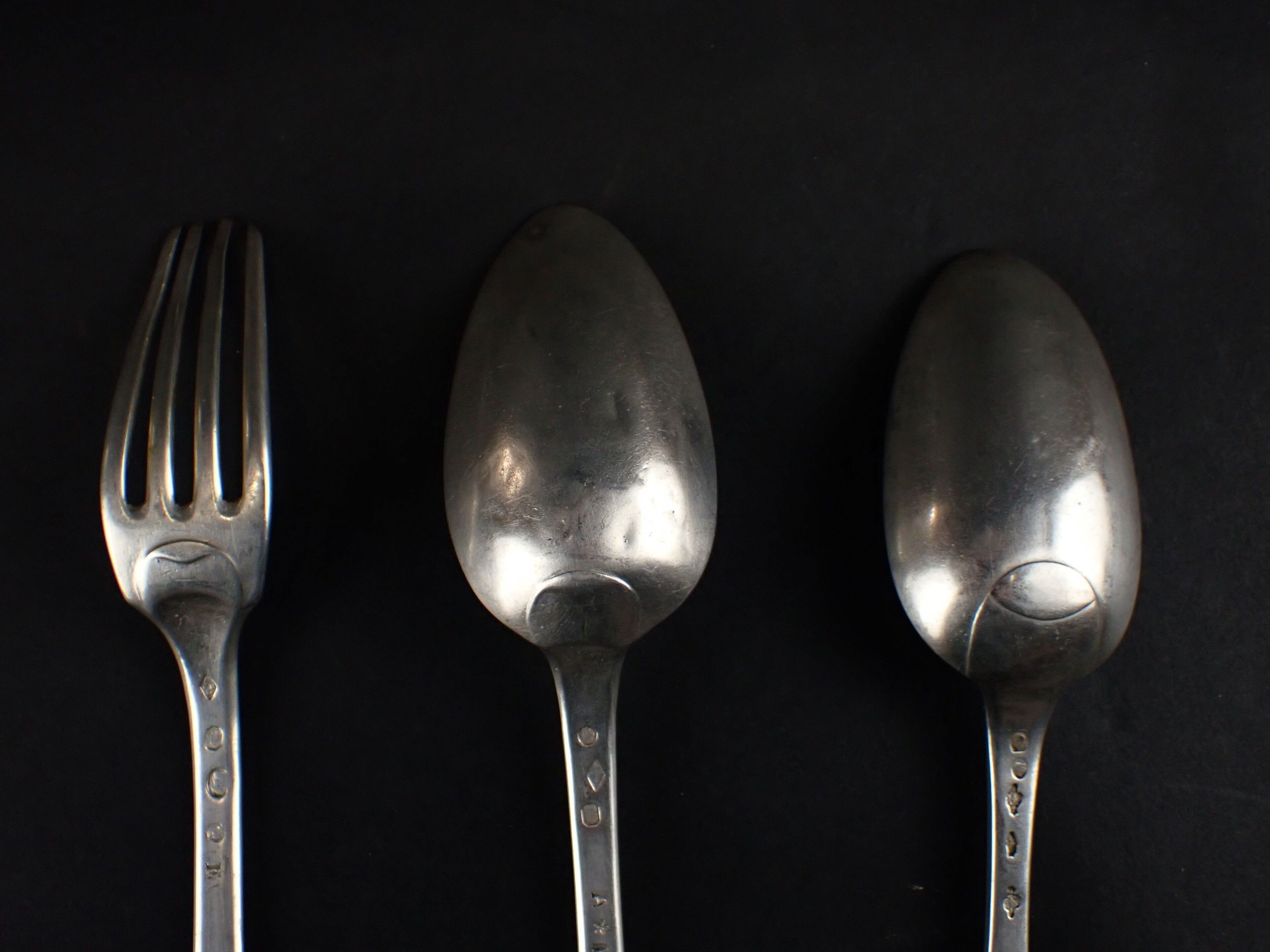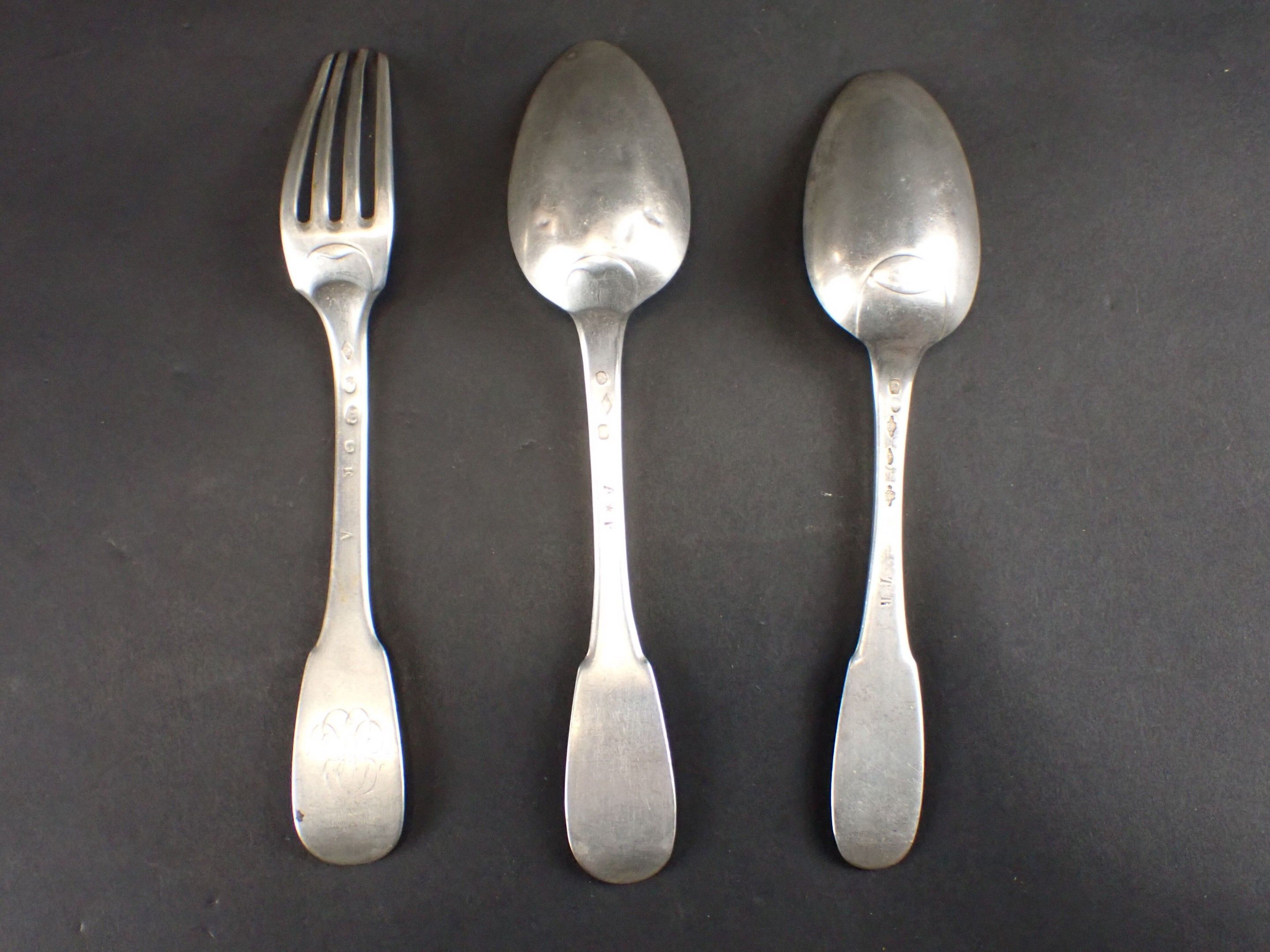 Two silver spoons and a fork.