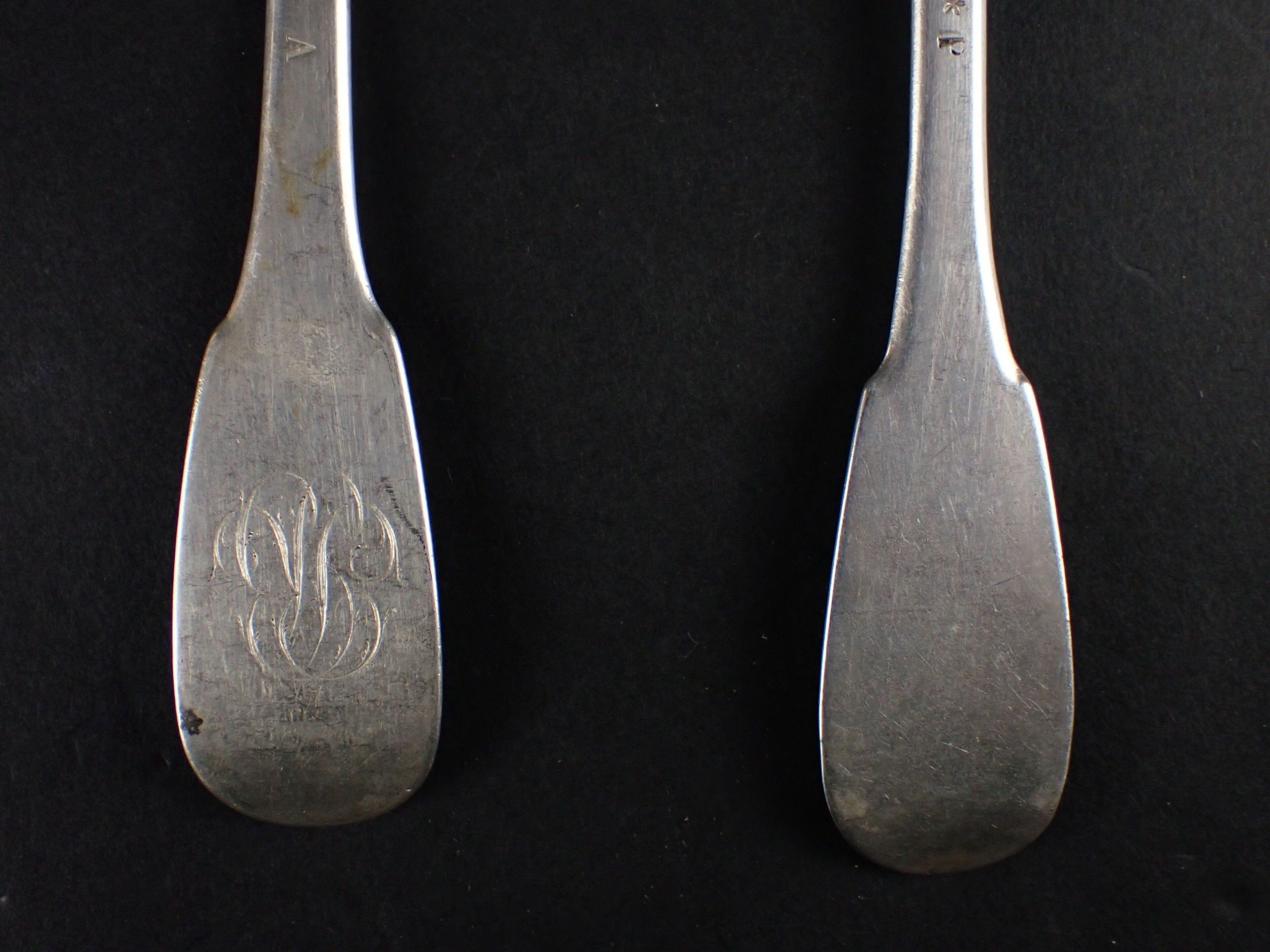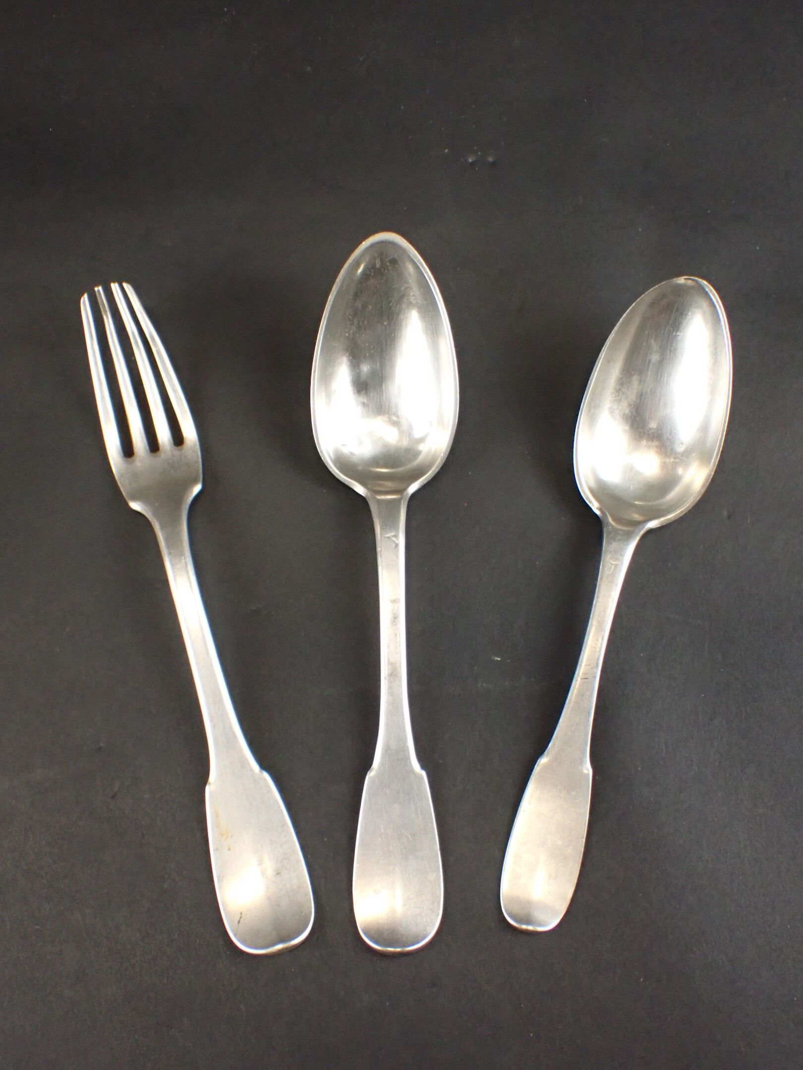 Two silver spoons and a fork. Work of the 19th century.