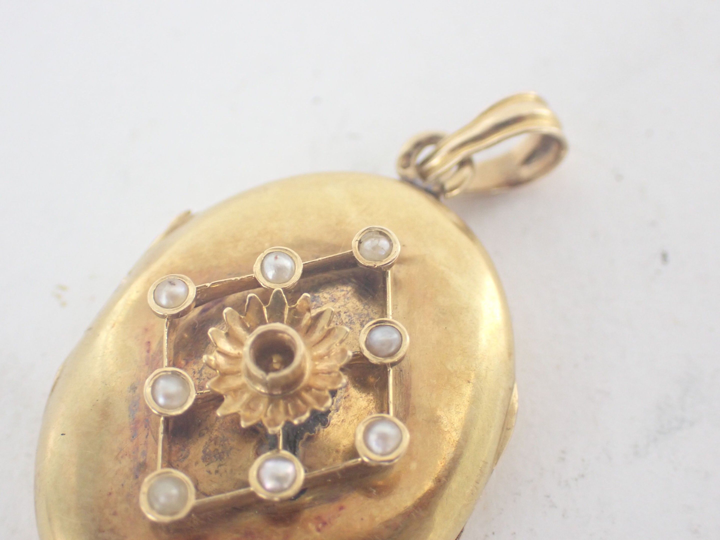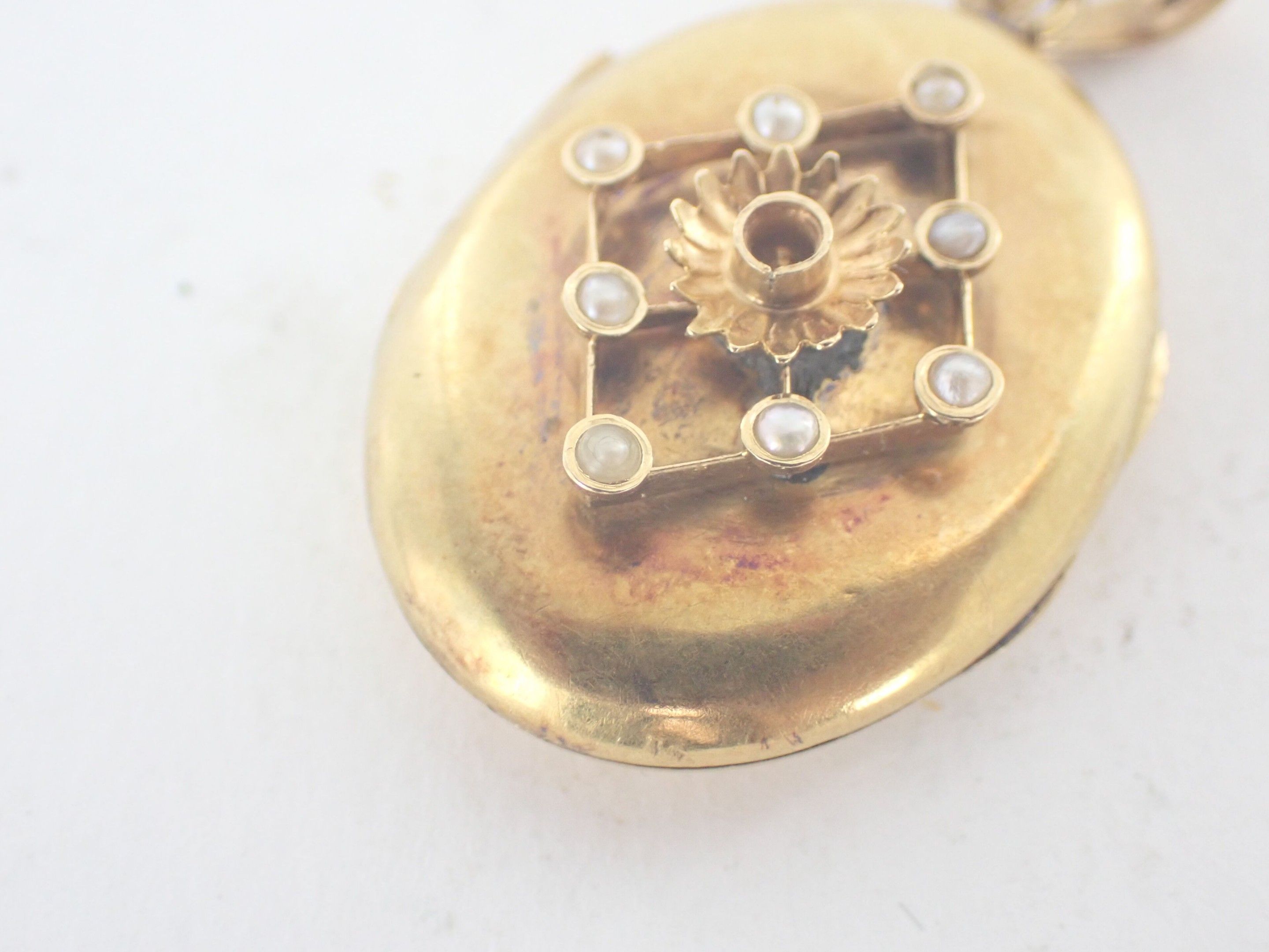 18 carat yellow gold oval photo pendant-medallion, circa 1900, decorated in relief with a lozenge formed of eight cultured half-pearls, one missing from the centre. Interior with glass. Gross weight: 8.6 g.