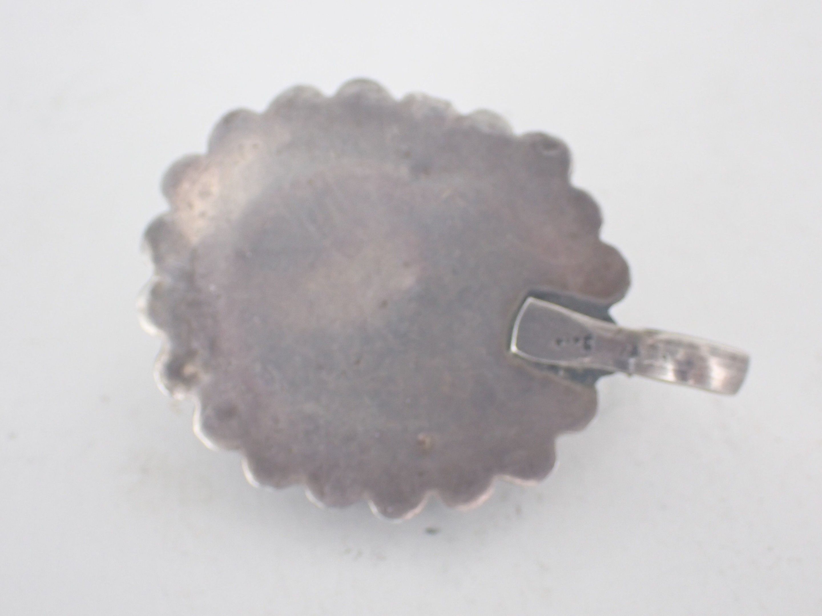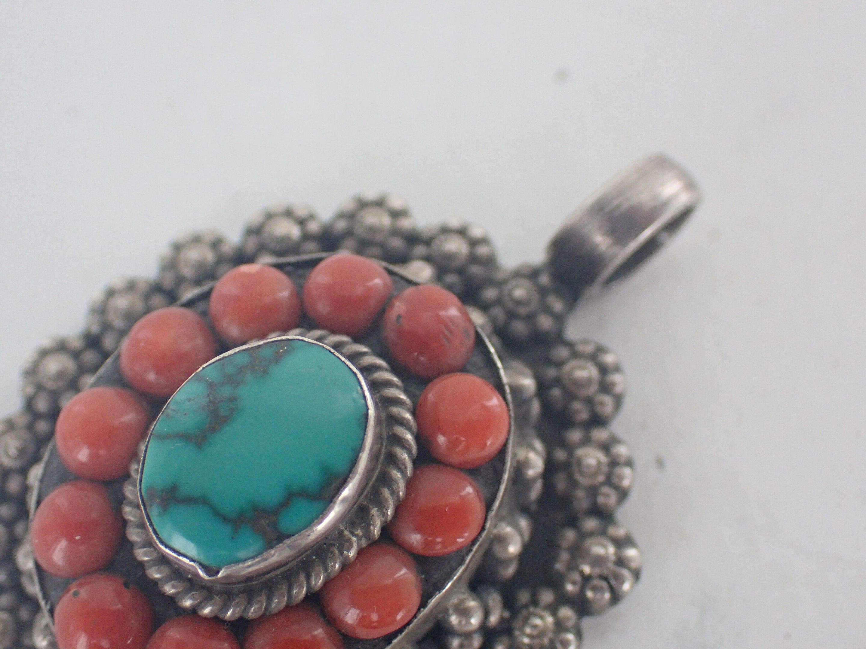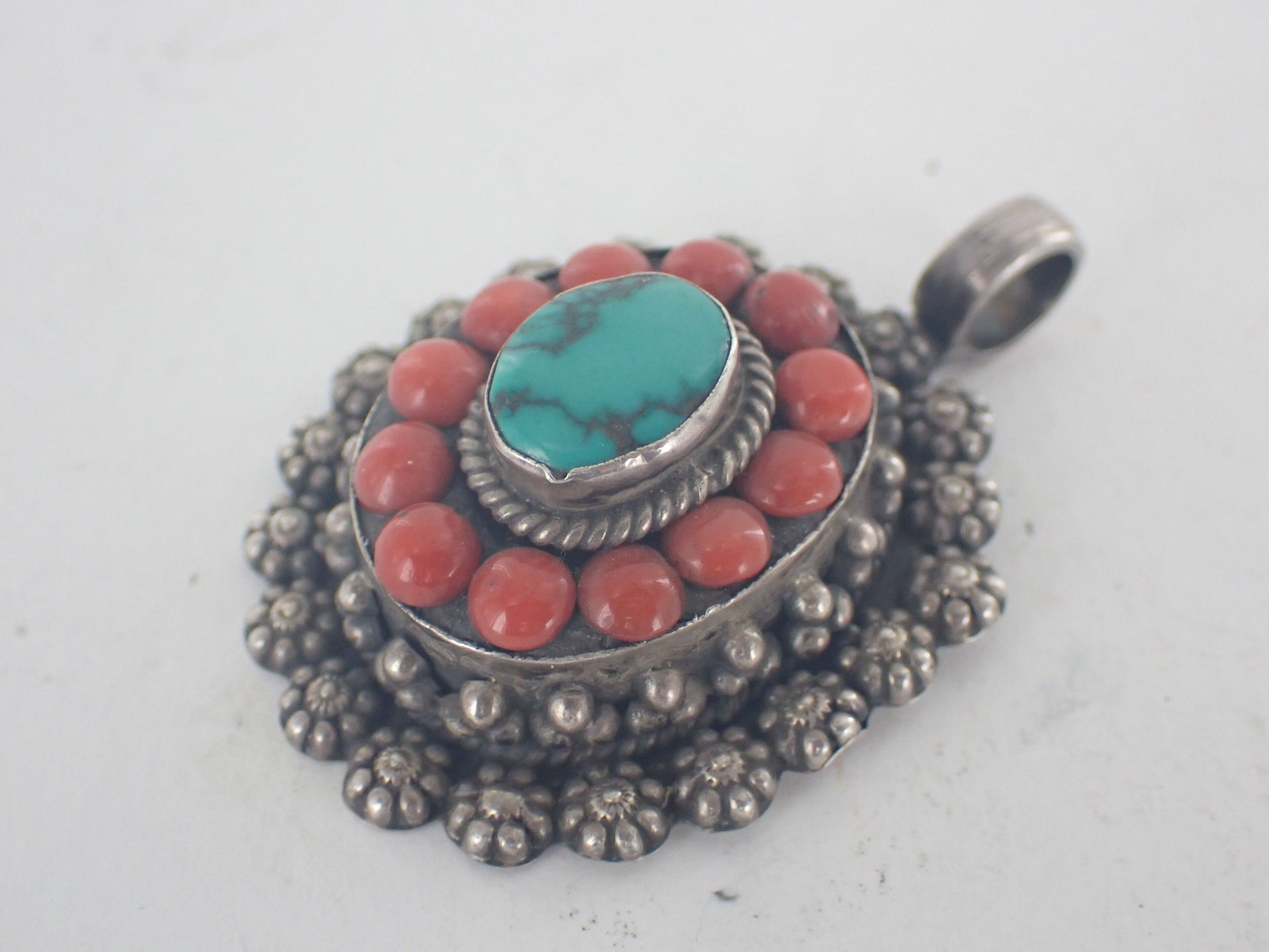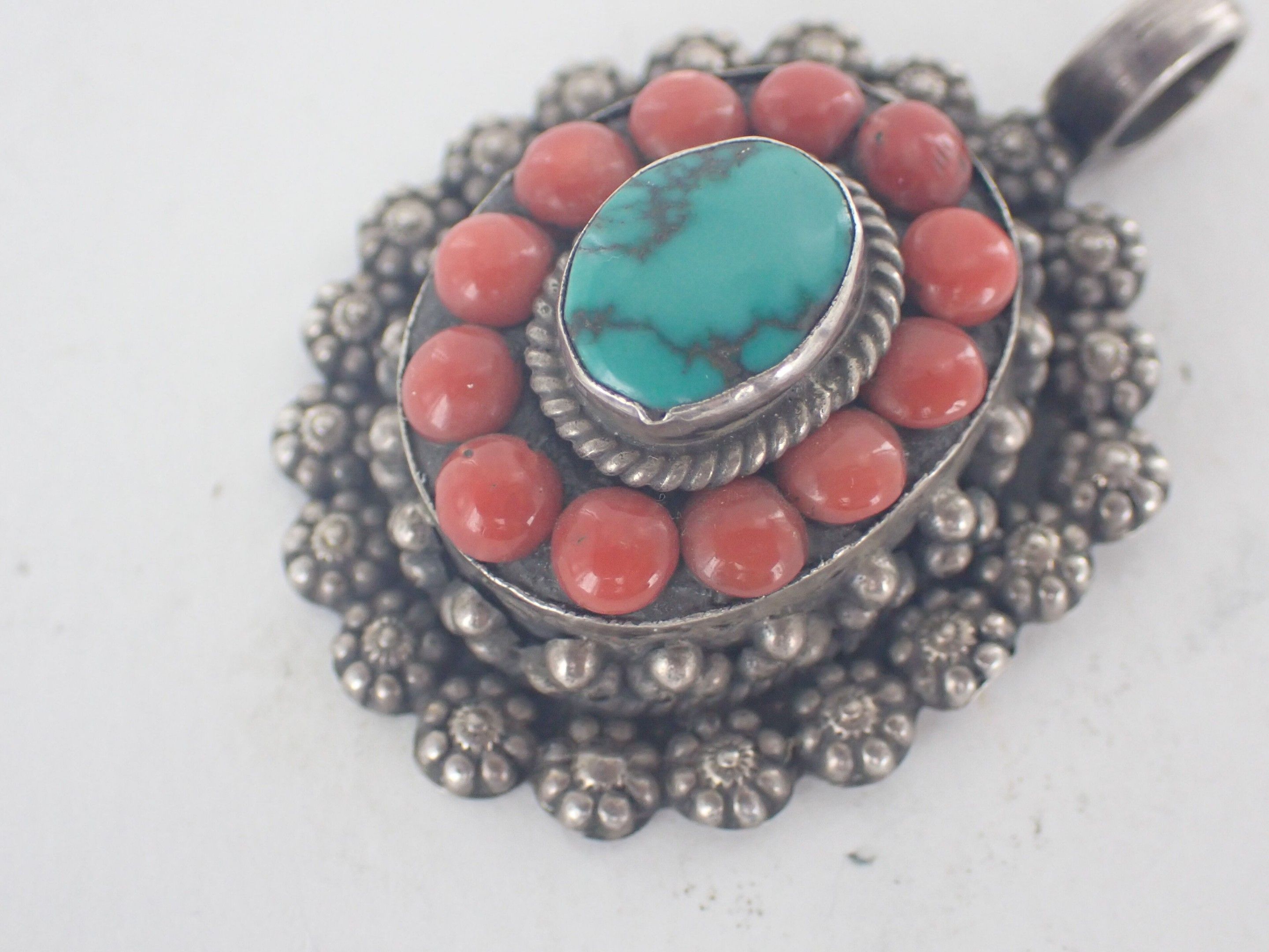 925 thousandths silver pendant decorated with half-pearl coral flowers topped with a turquoise cabochon.