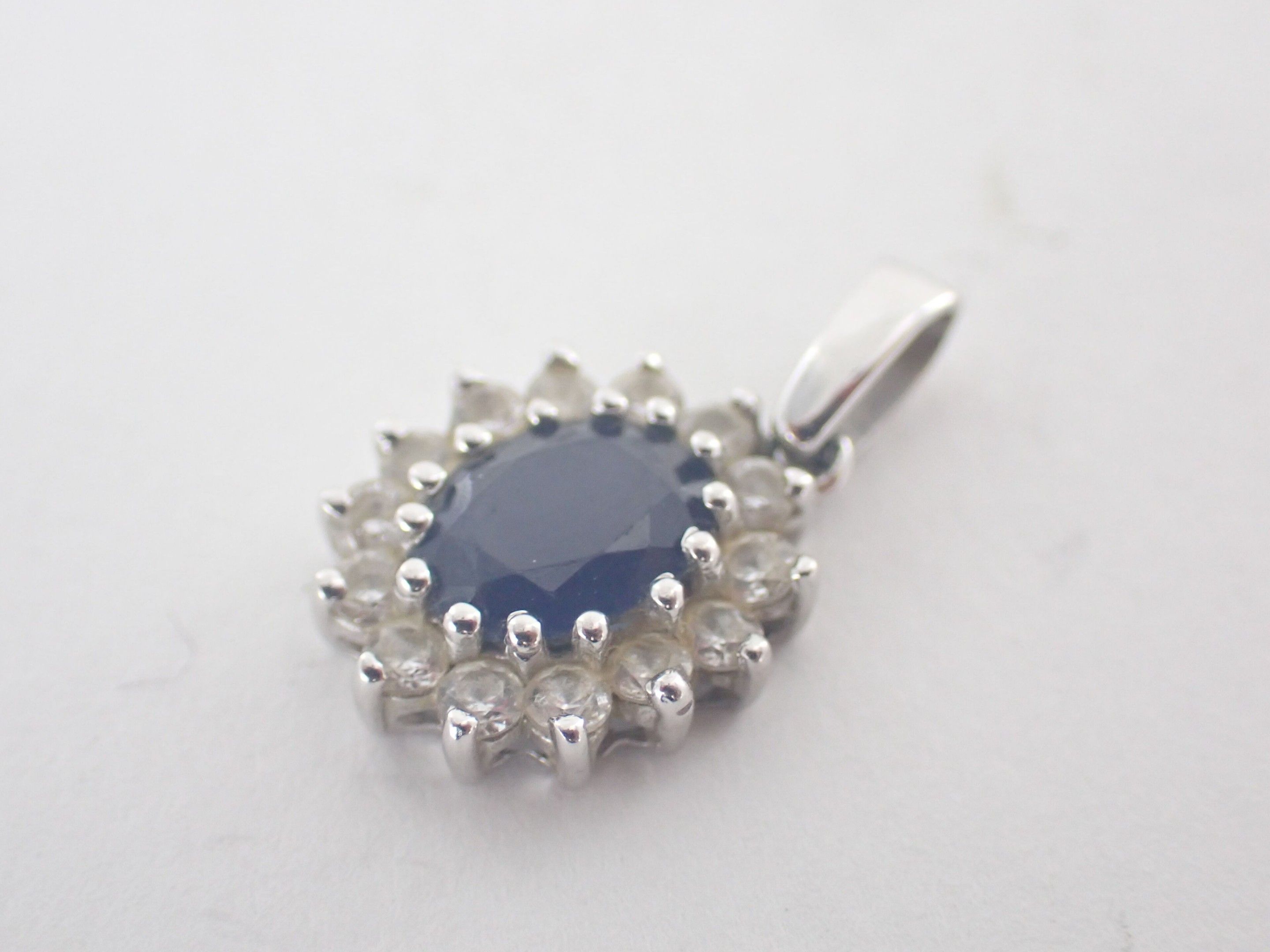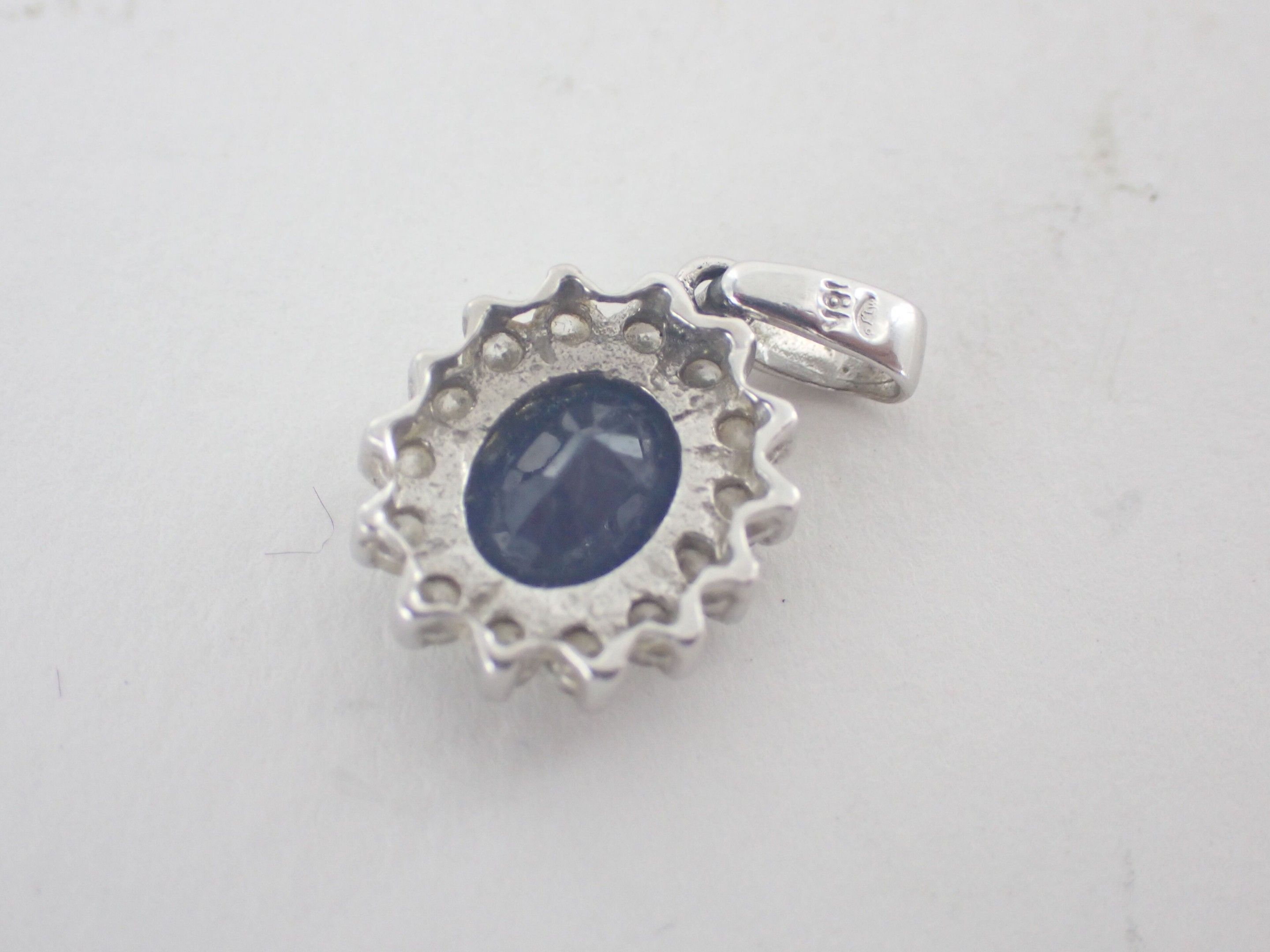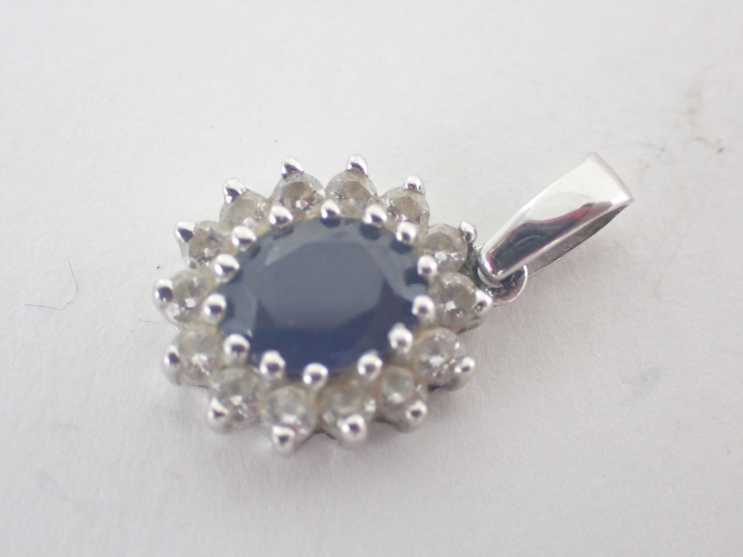 Pompadour-shaped pendant in 750 thousandths white gold centred on an oval cut sapphire in a surround of white stones.