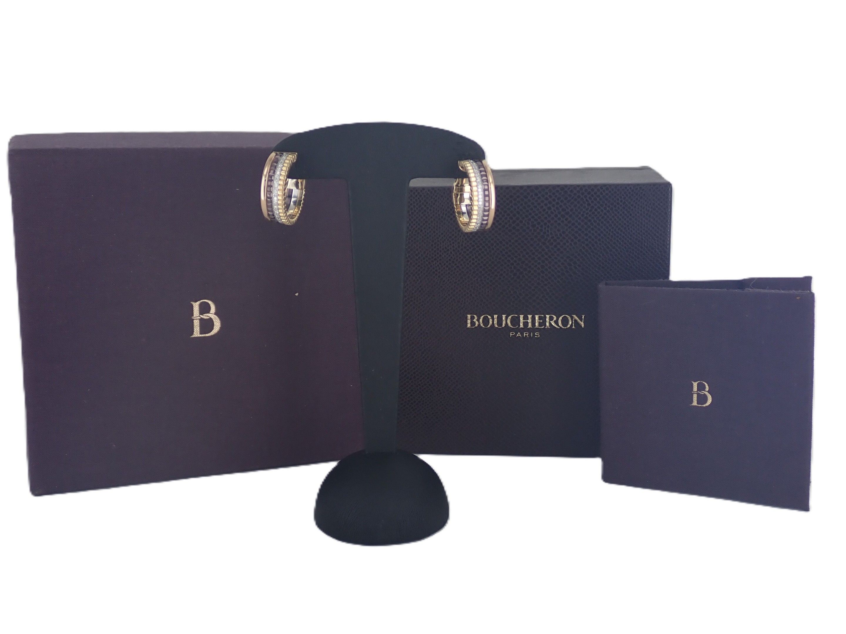 BOUCHERON: Pair of 750 thousandth "4 gold" hoop earrings set with 50 diamonds approx. 0.36 carats, signed, in original box, with certificate. Net weight: 16.48 g