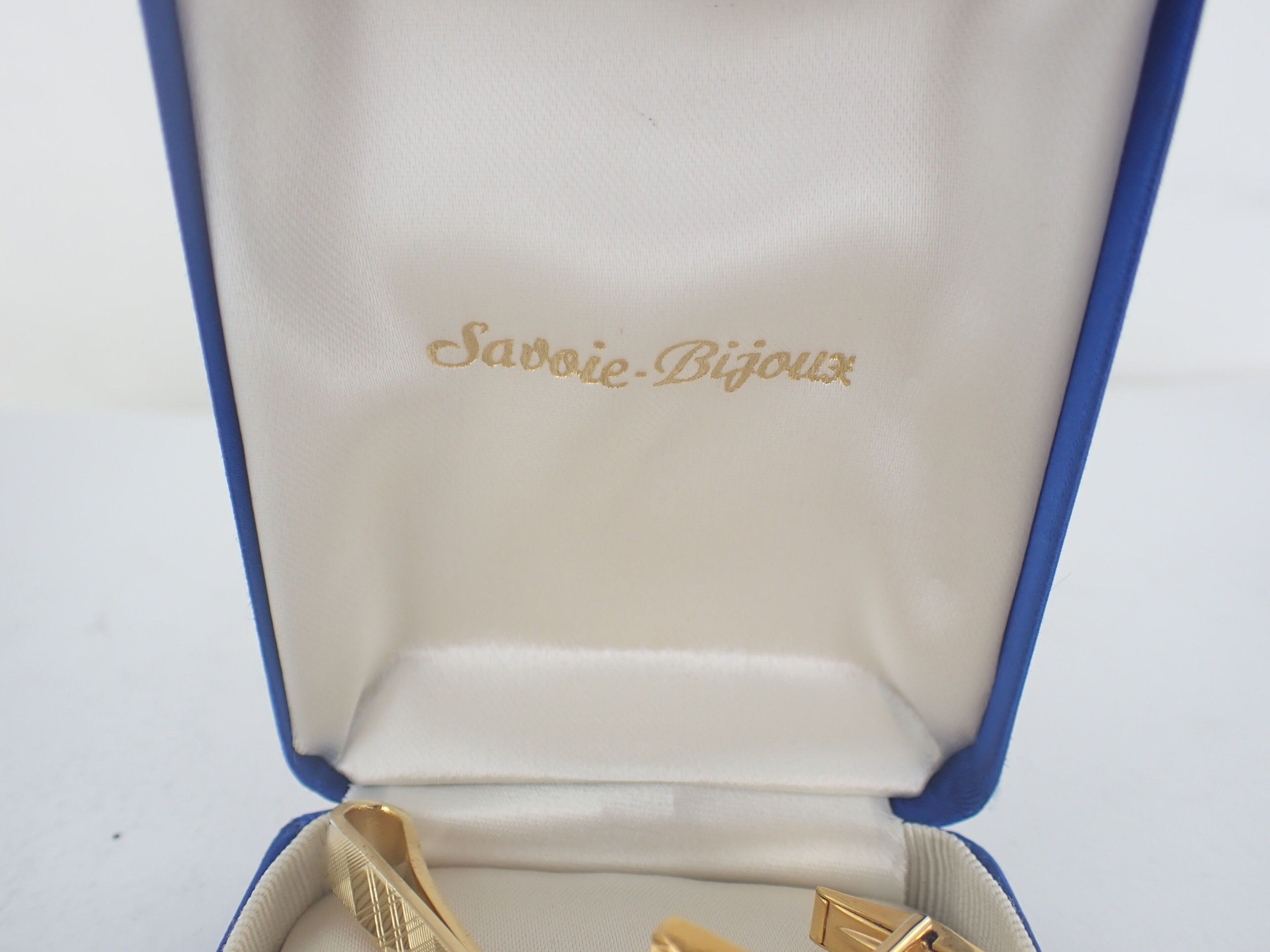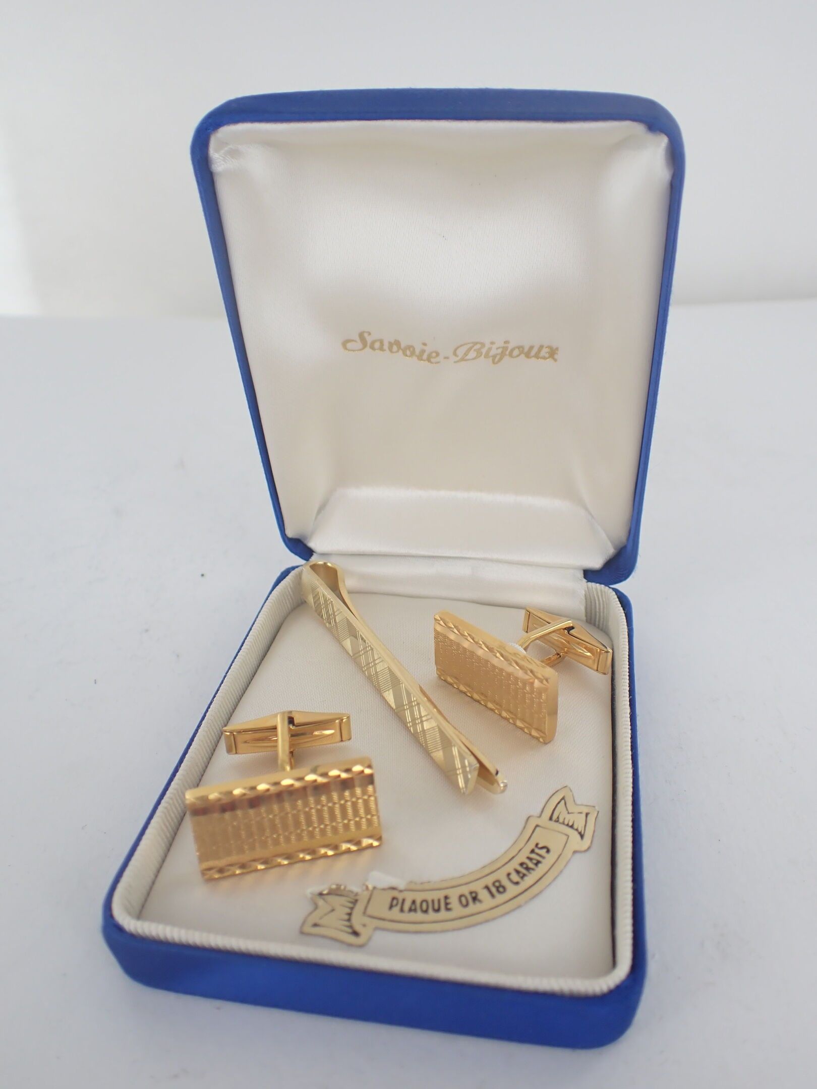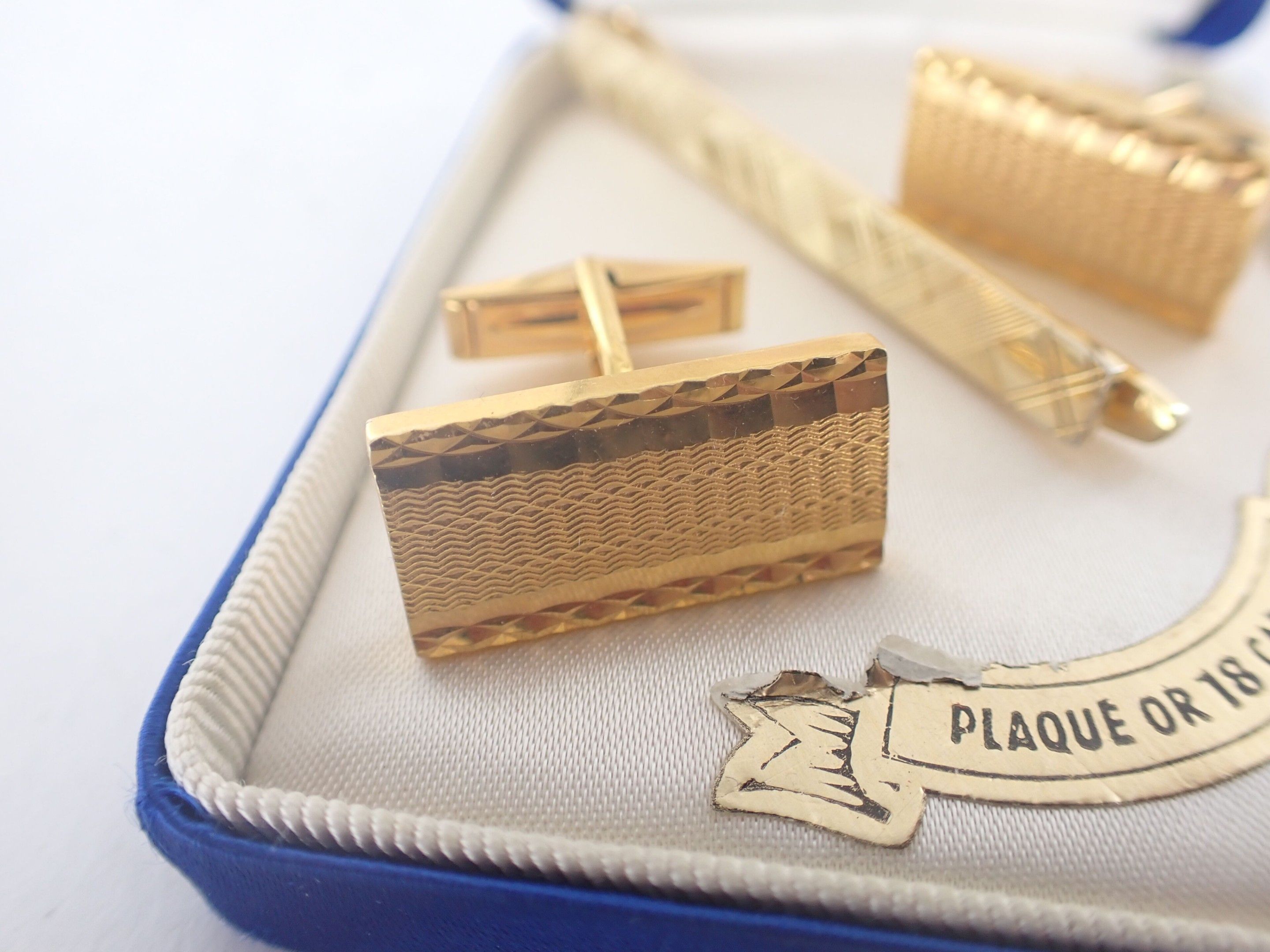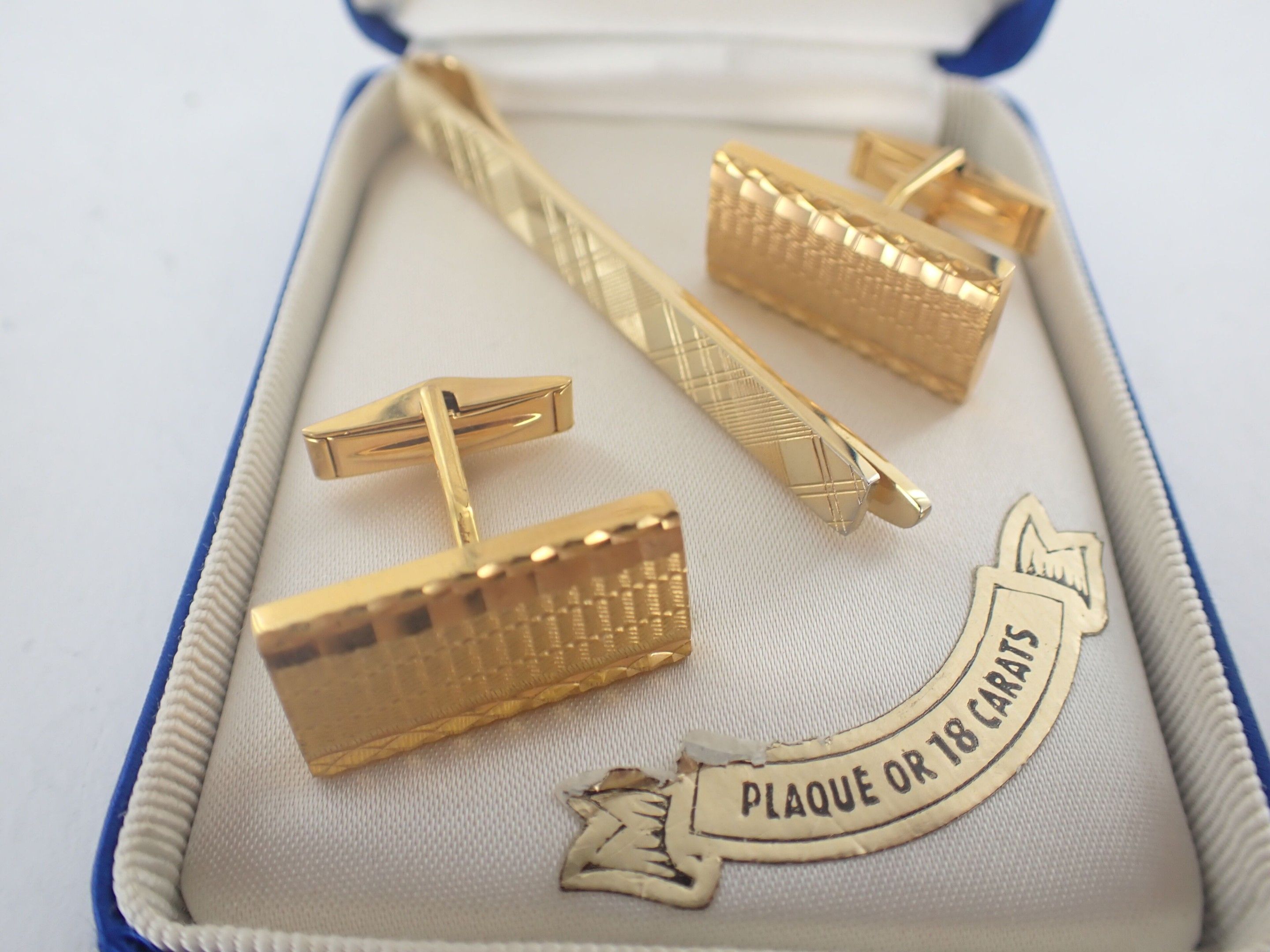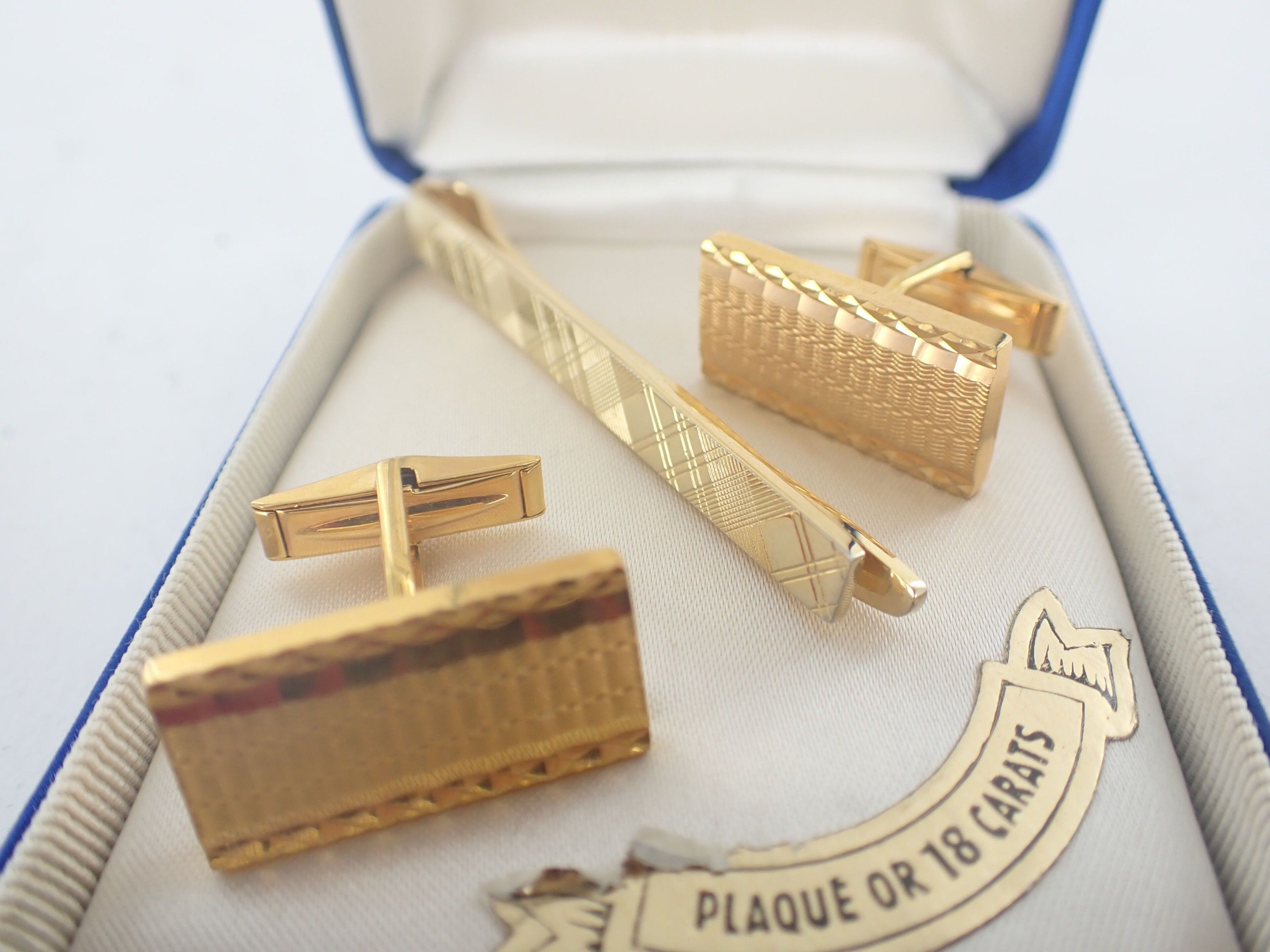 Pair of gold-plated cufflinks and tie clips, in a case