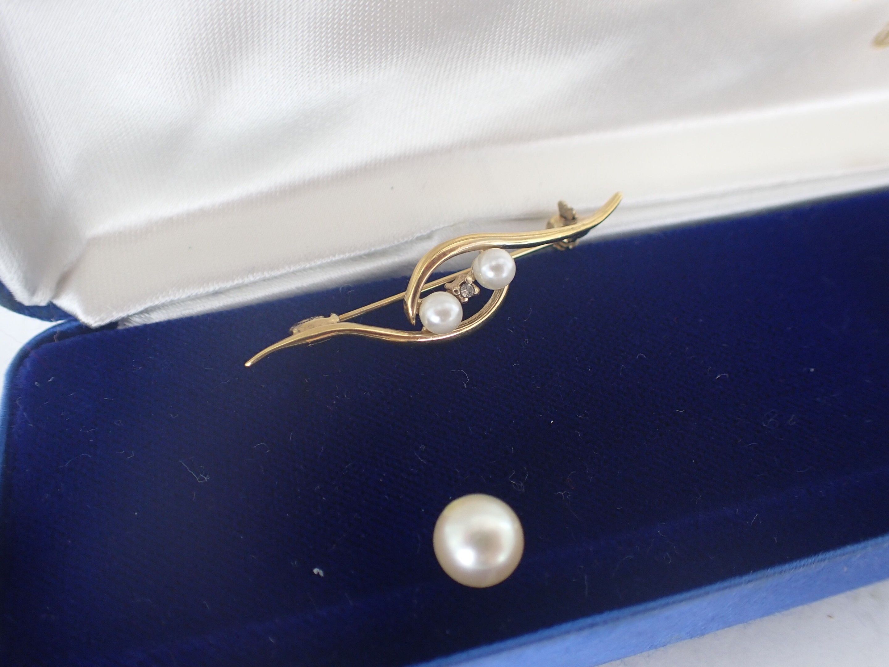 A gold-plated metal brooch with two cultured pearls is attached.