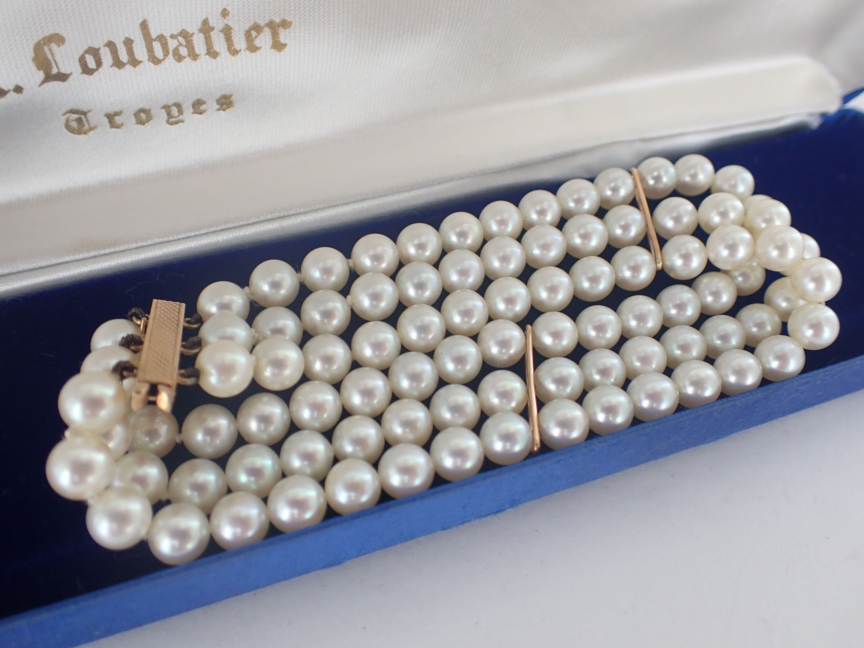 The bracelet has three rows of cultured pearls interspersed with gold-plated metal rods,