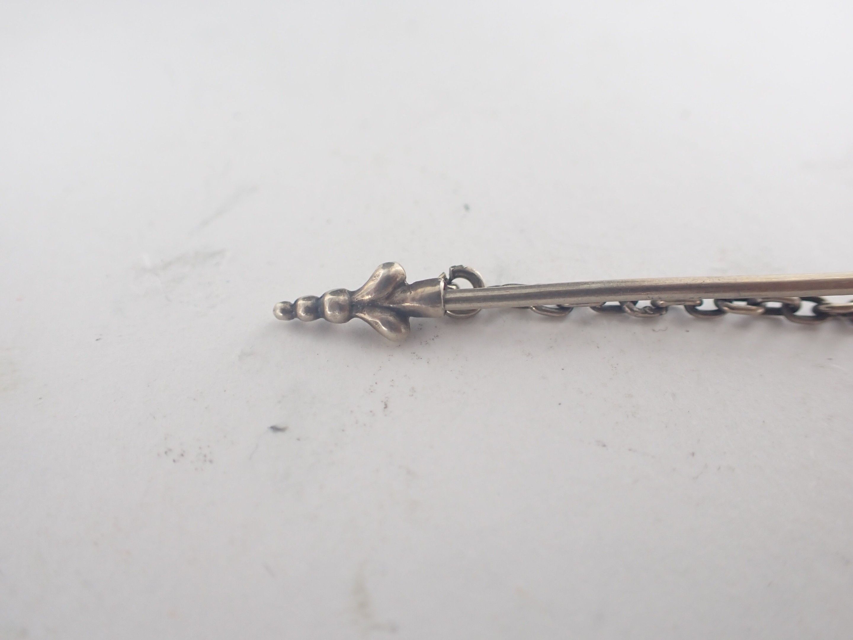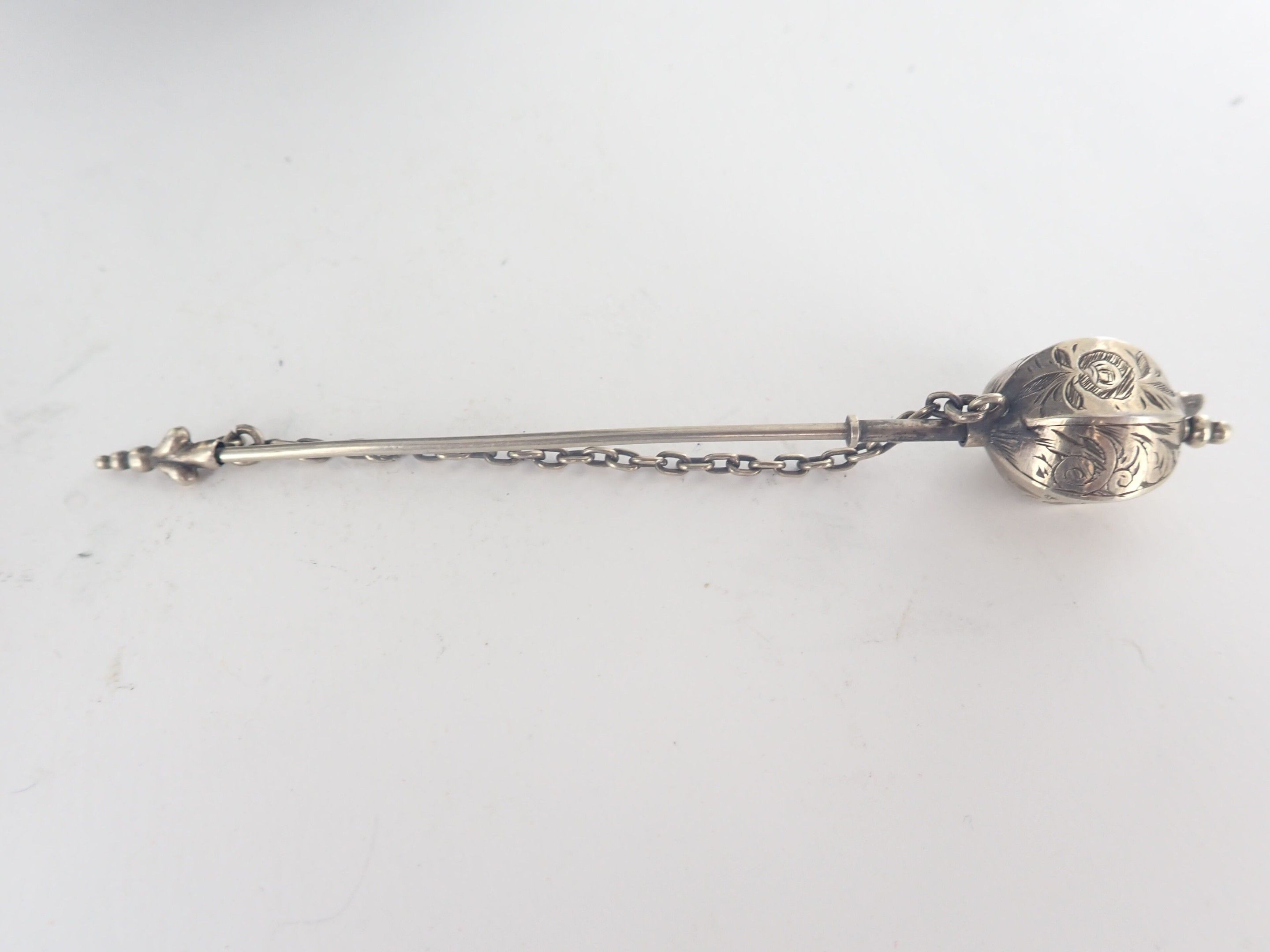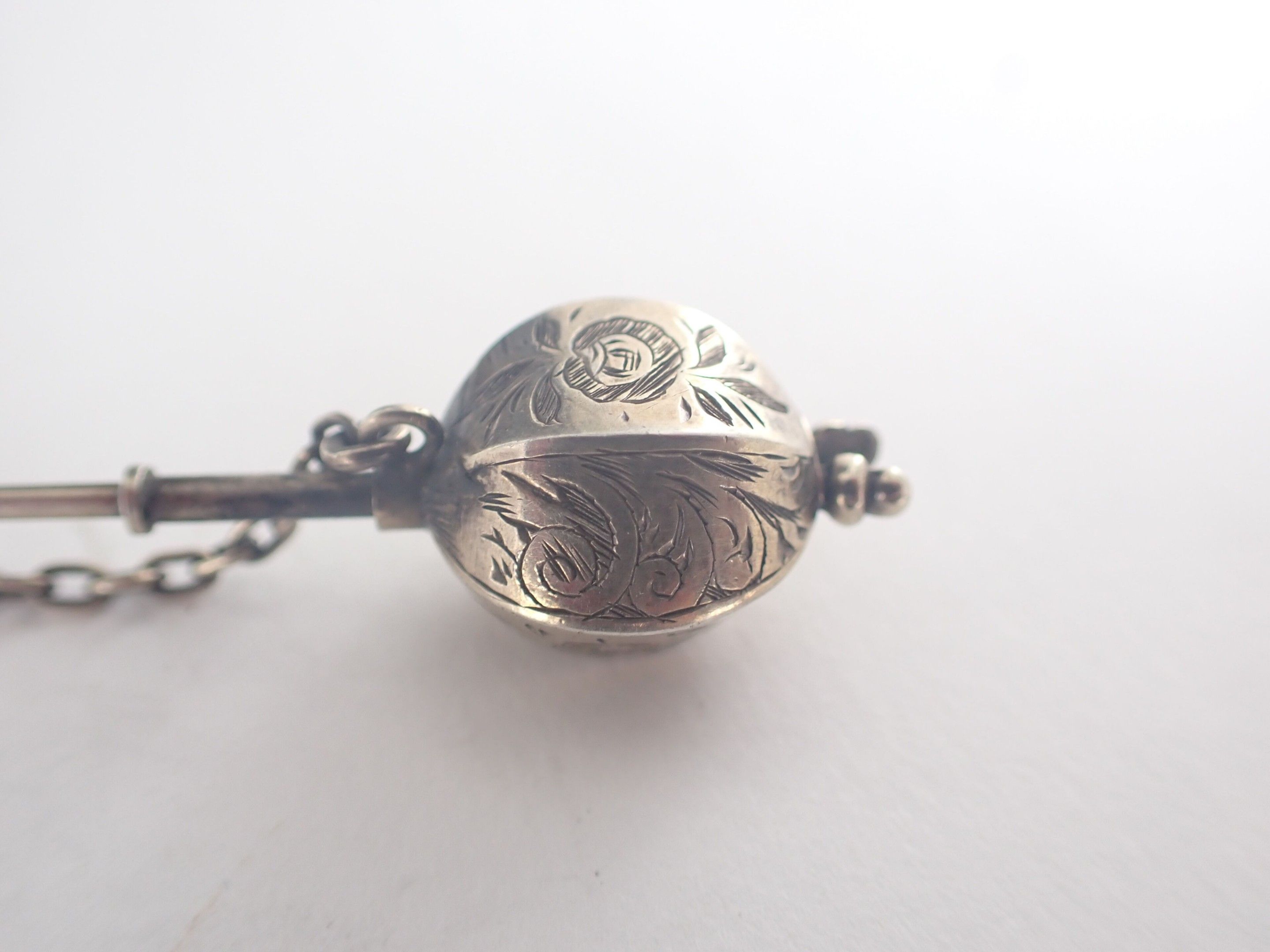 Elegant round cutaway silver hatpin with engraved flowers and chain.