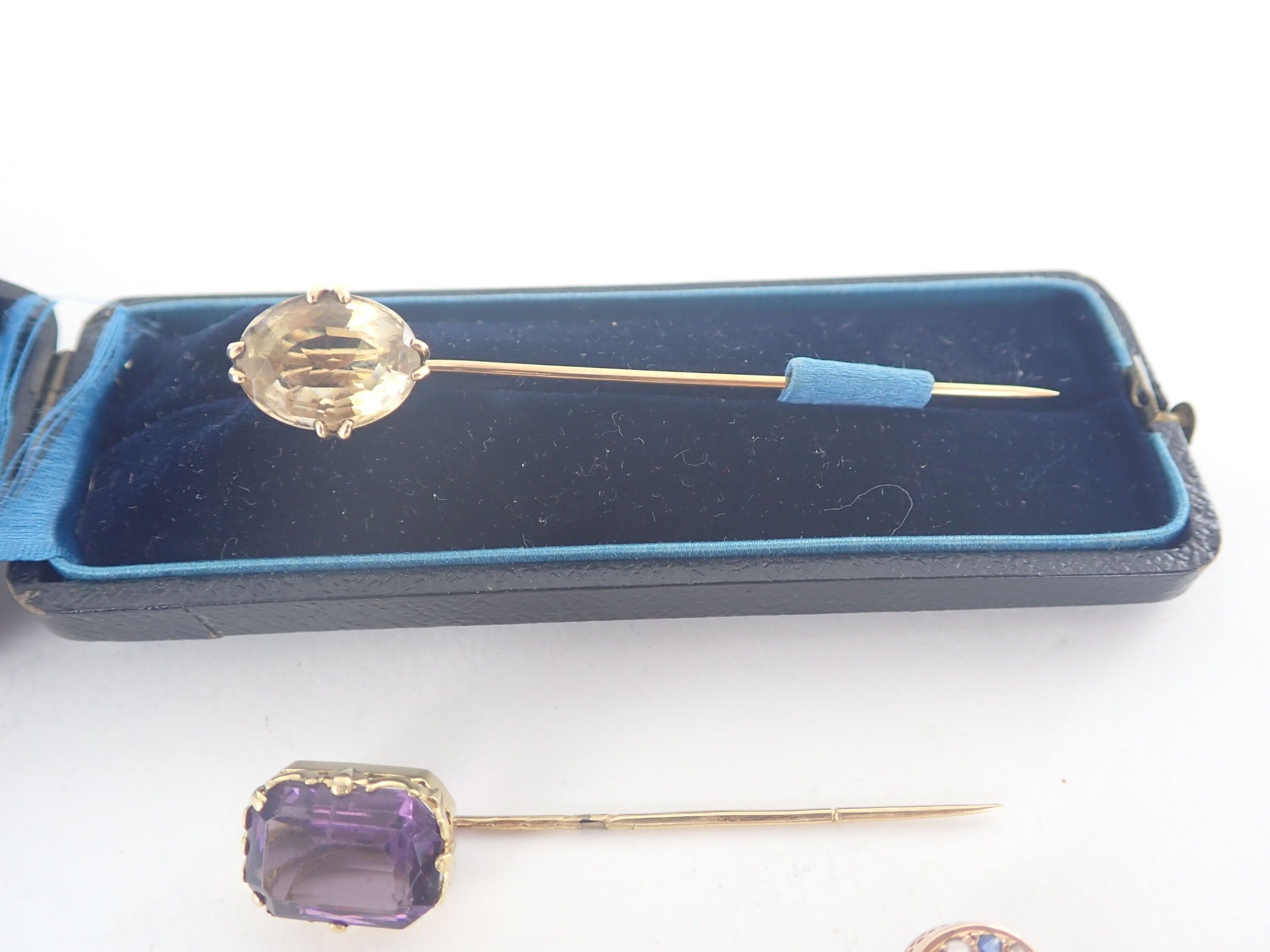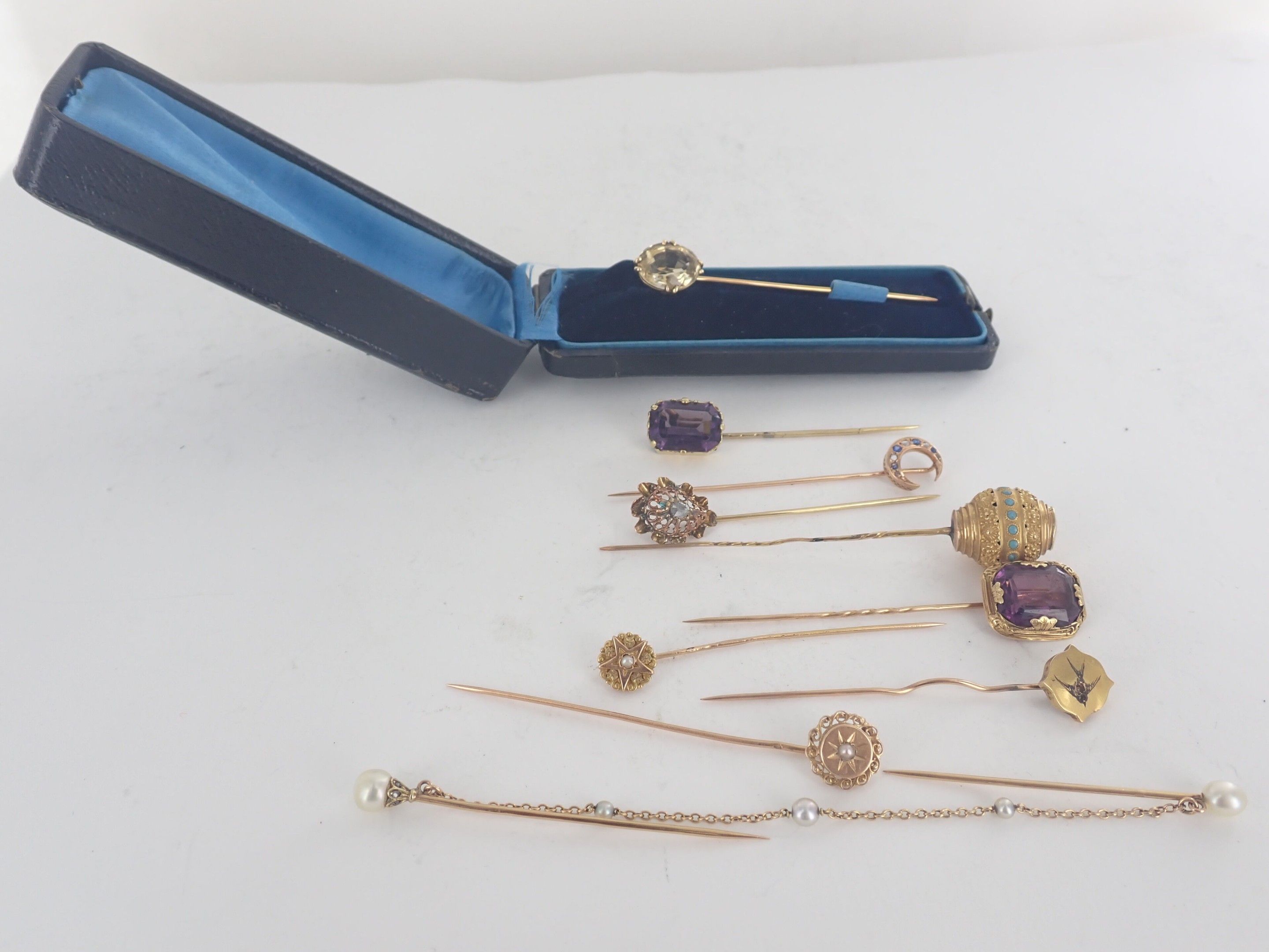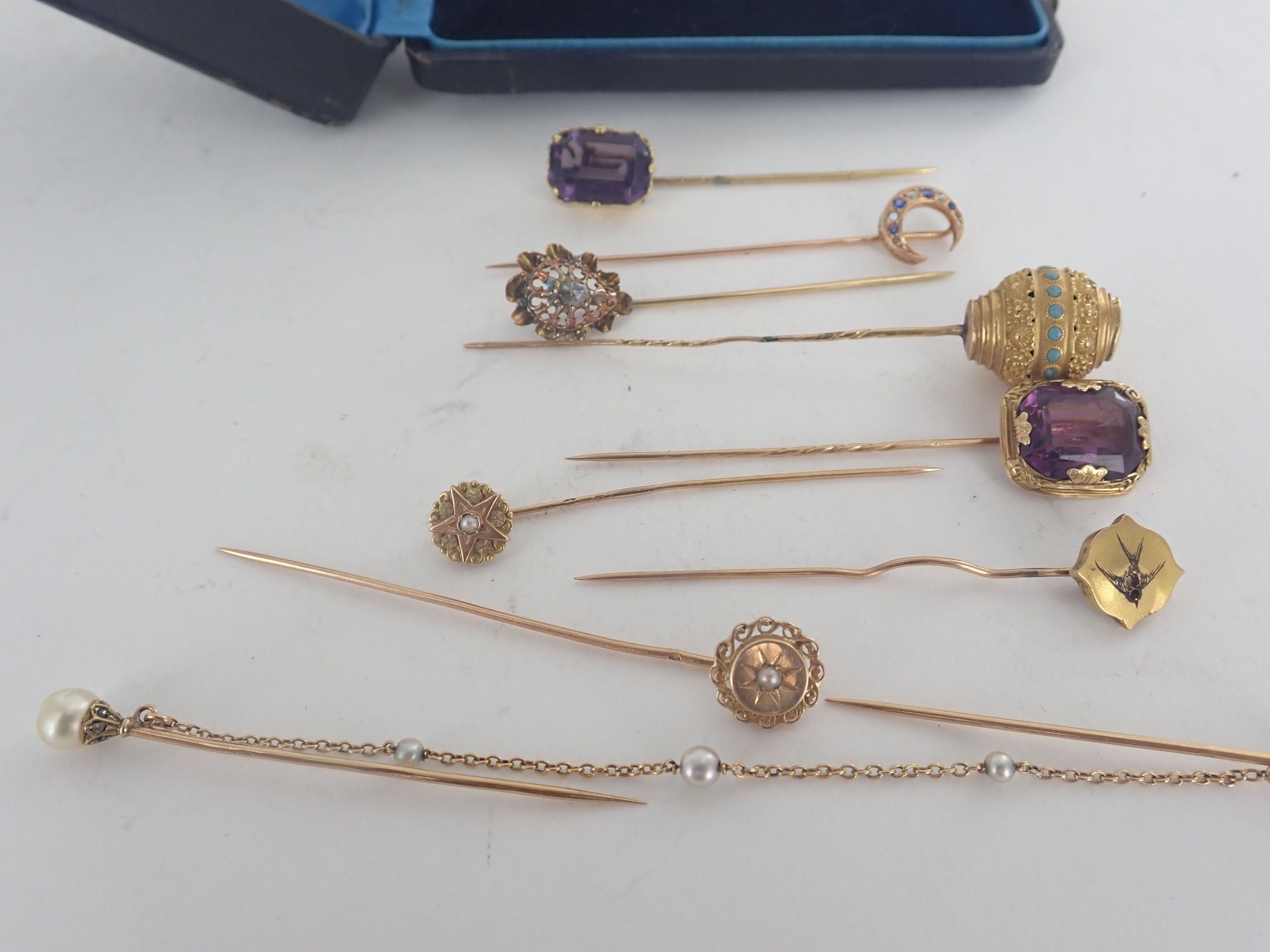 Nine Napoleon III-period 18 carat yellow gold hatpins set with amethysts, citrines or pearls.