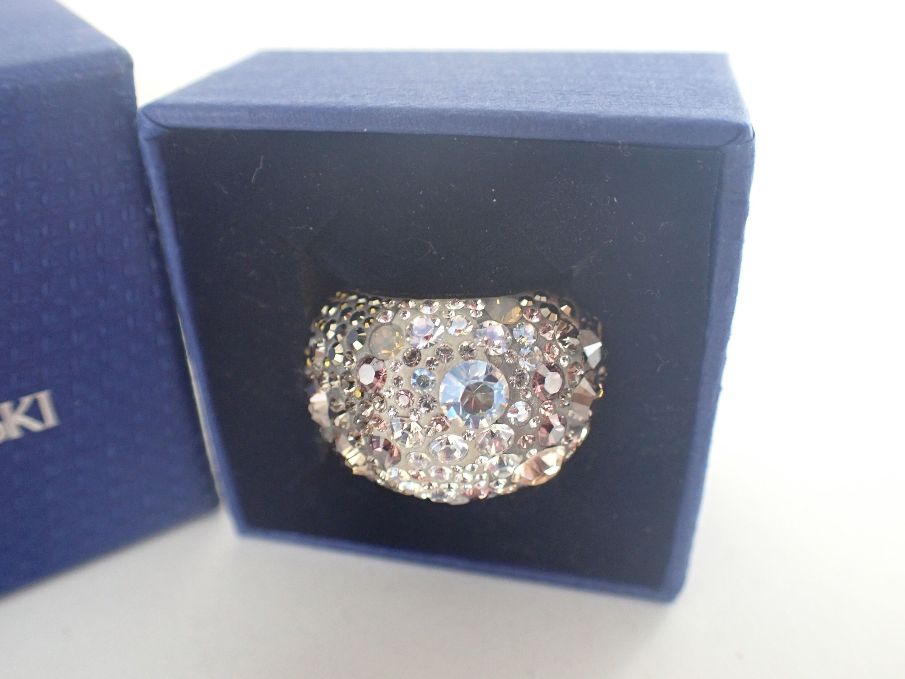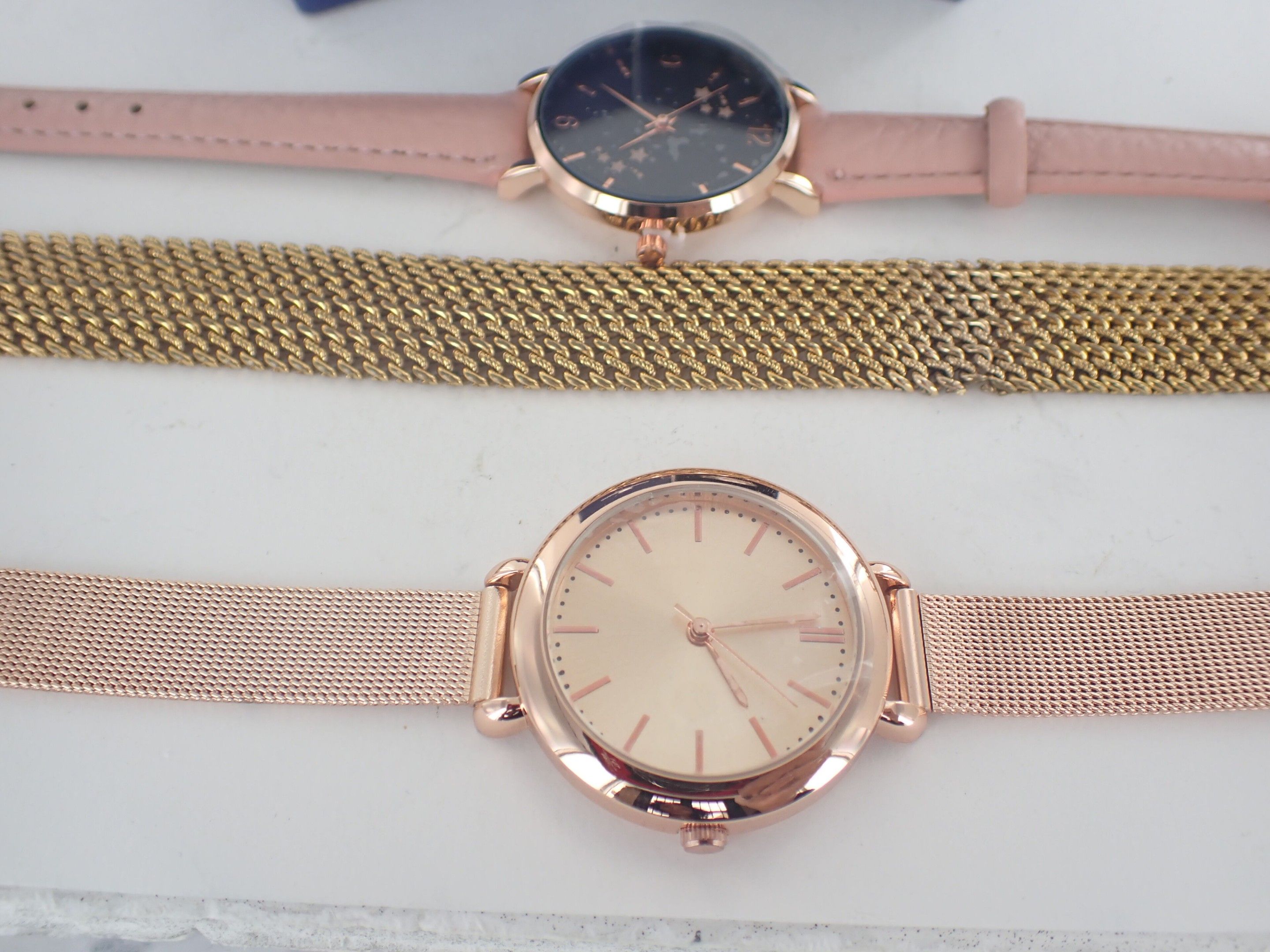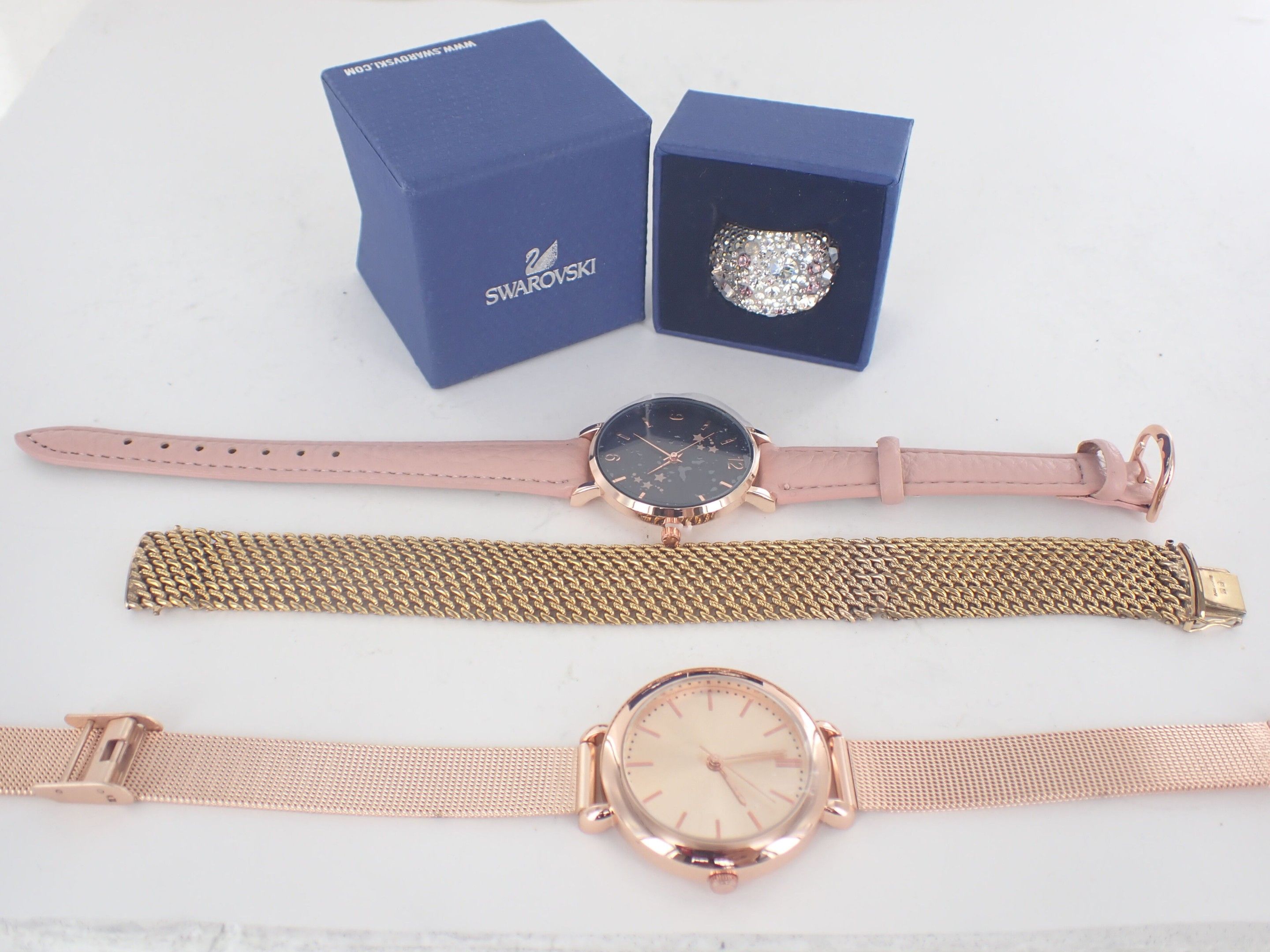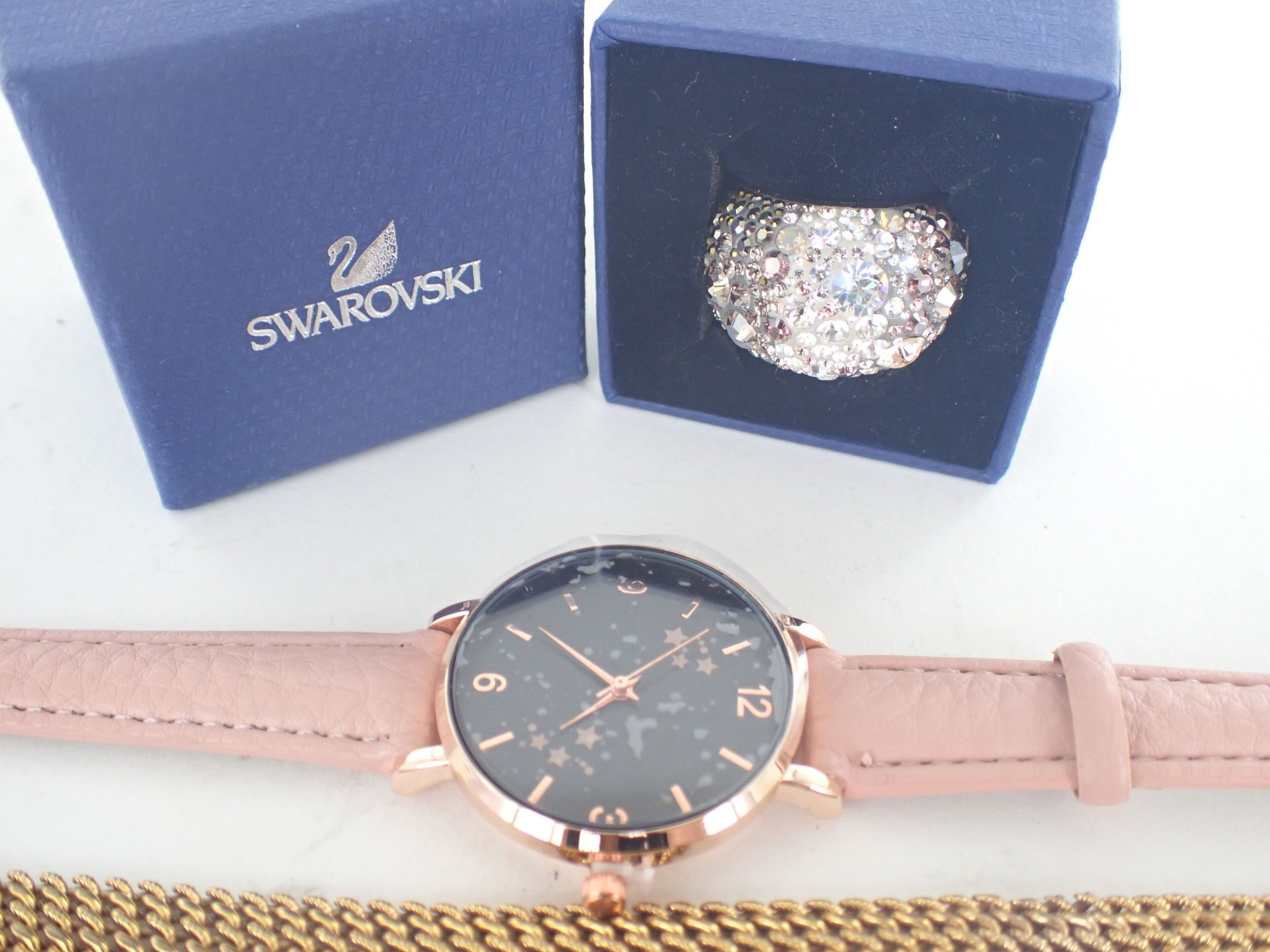 comprising a large gold-plated ring set with numerous Swarovski crystals, in a case; two gold-plated ladies' watches, one of which is Vendome Signature; a gold-plated Milanese link bracelet.